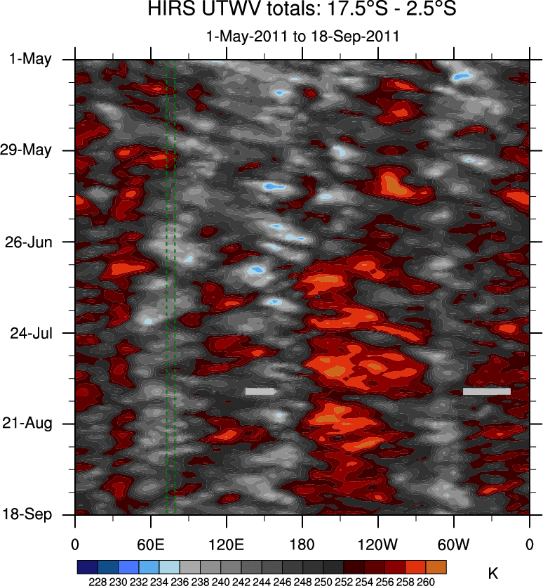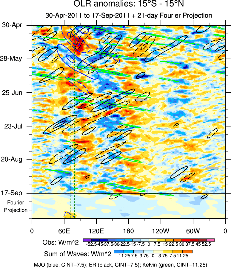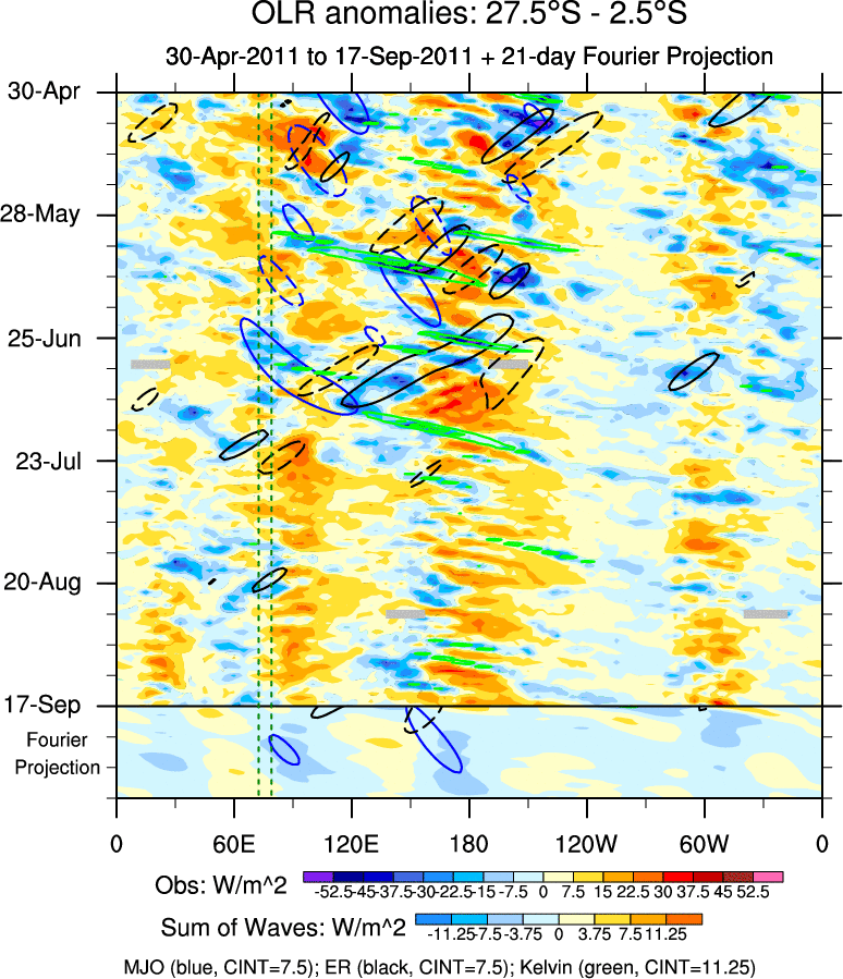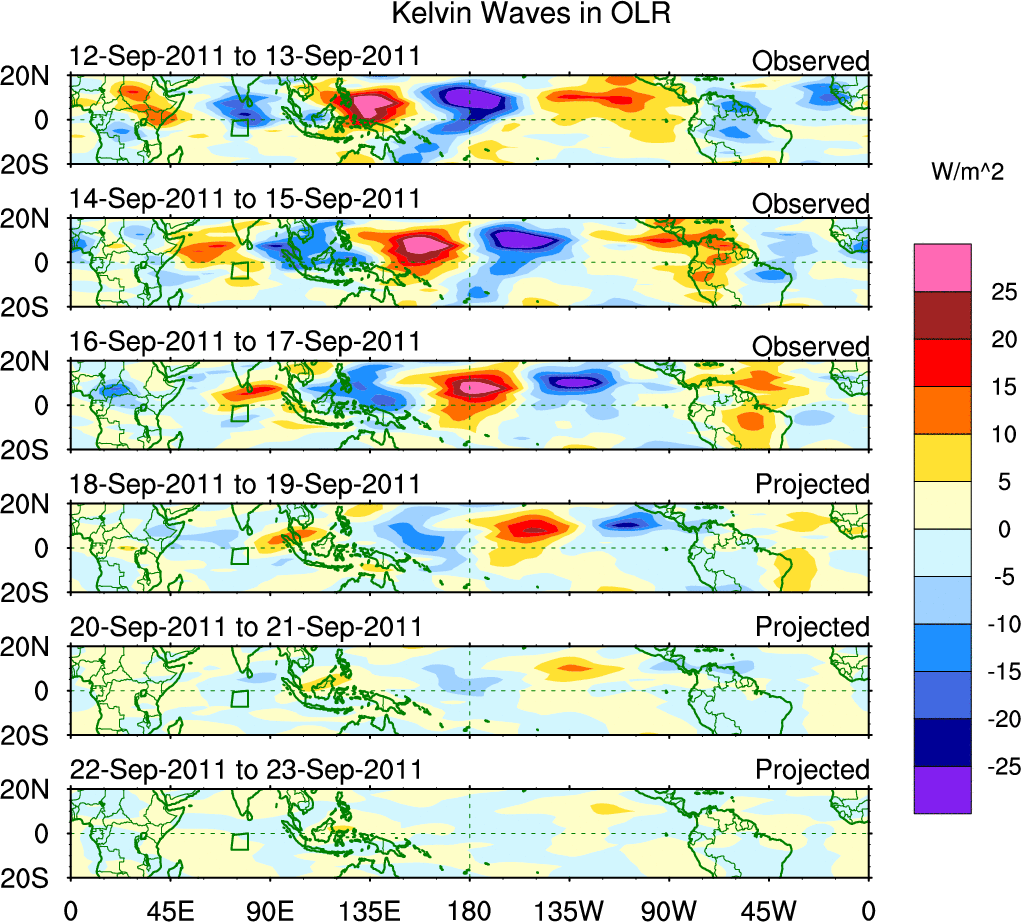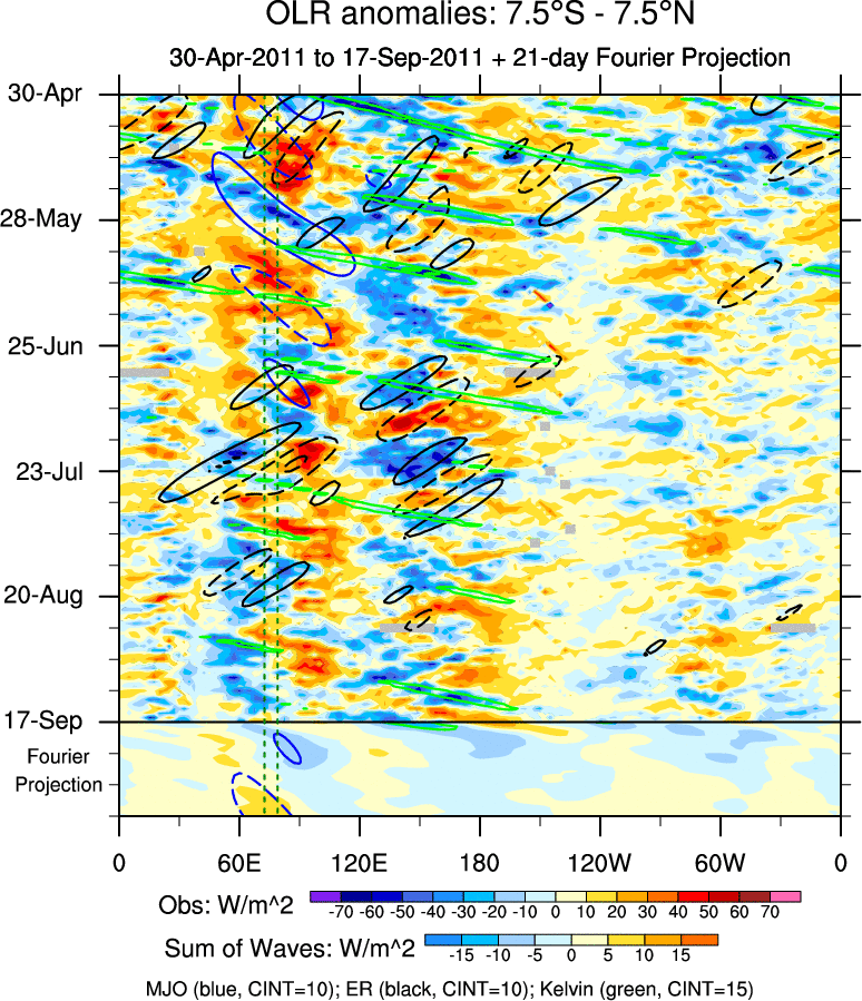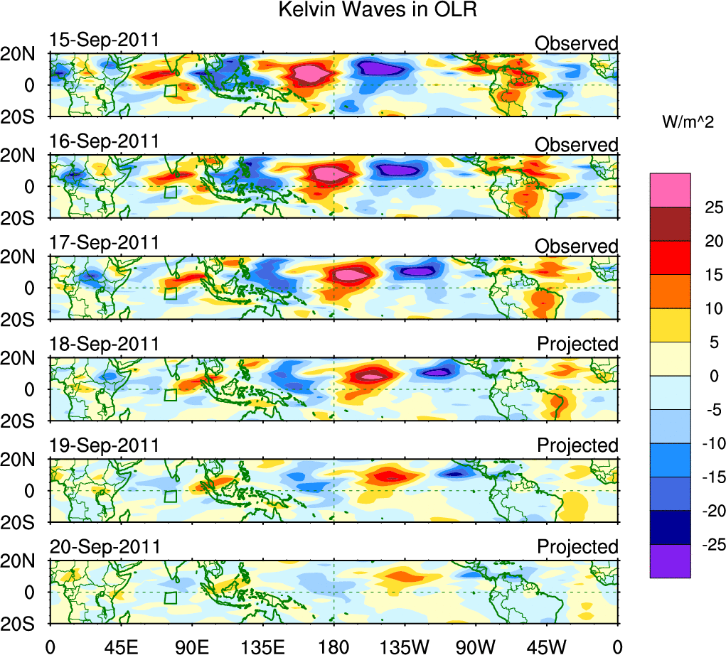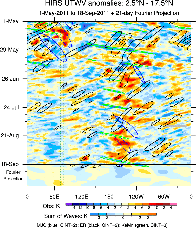To identify tropical waves in near real-time, the OLR and UTWV data are filtered following Wheeler & Weickmann (2001 MWR). The daily anomalies are calculated using the first 3 harmonics of the seasonal cycle for 1979–2009. Missing values are then filled using linear interpolation in space and time. The most recent 365 days of anomalies are padded with 659 days of zeroes, and the result is filtered for each wave type.