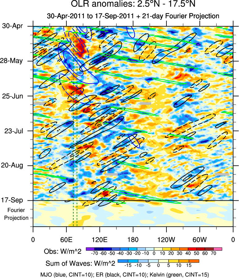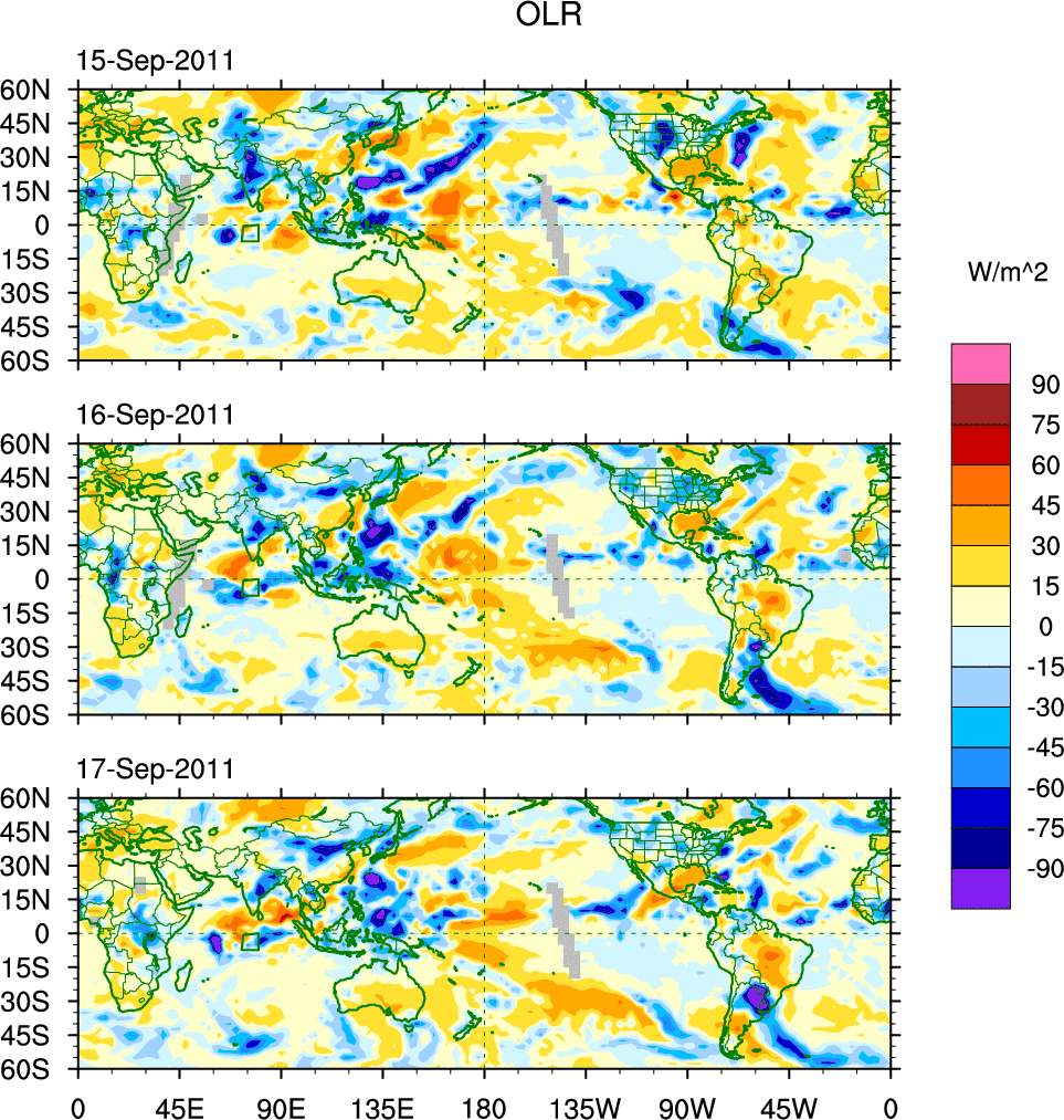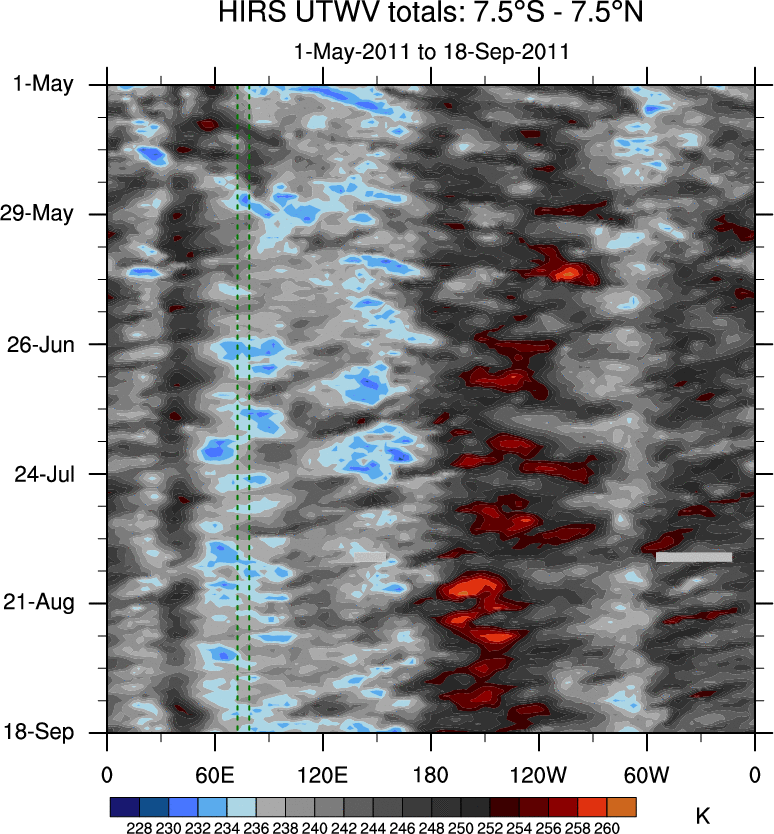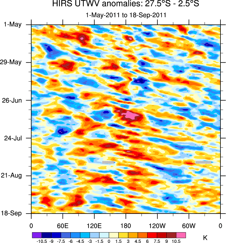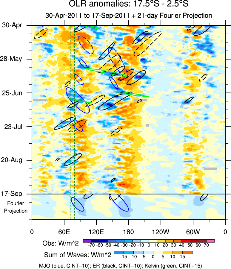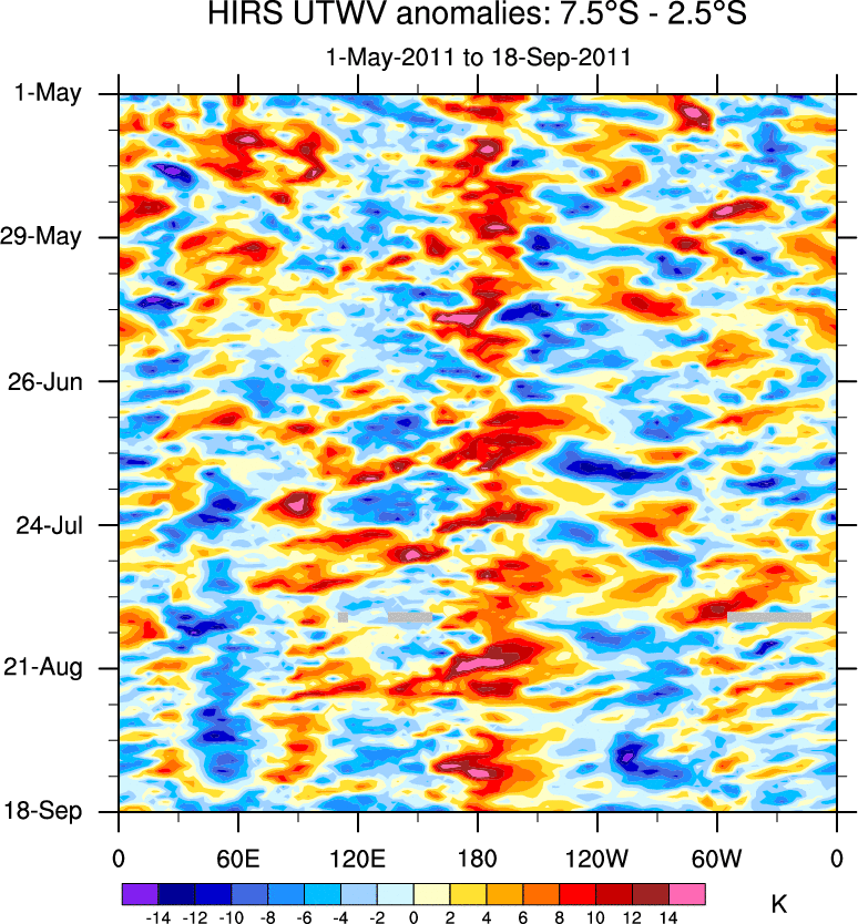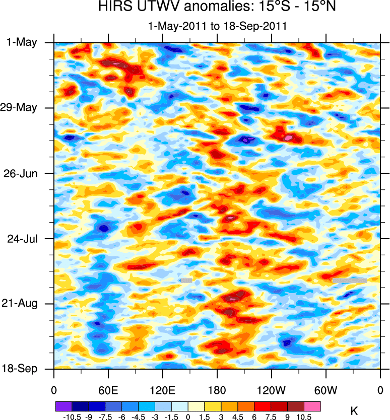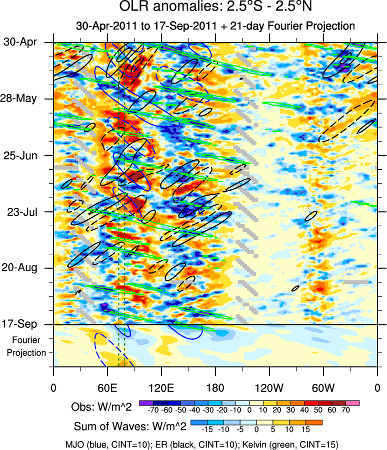 To identify tropical waves in near real-time, the OLR and UTWV data are filtered following Wheeler & Weickmann (2001 MWR). The daily anomalies are calculated using the first 3 harmonics of the seasonal cycle for 1979–2009. Missing values are then filled using linear interpolation in space and time. The most recent 365 days of anomalies are padded with 659 days of zeroes, and the result is filtered for each wave type.