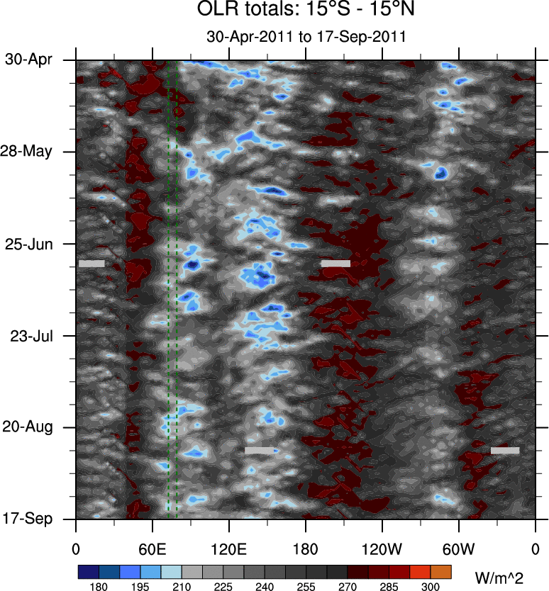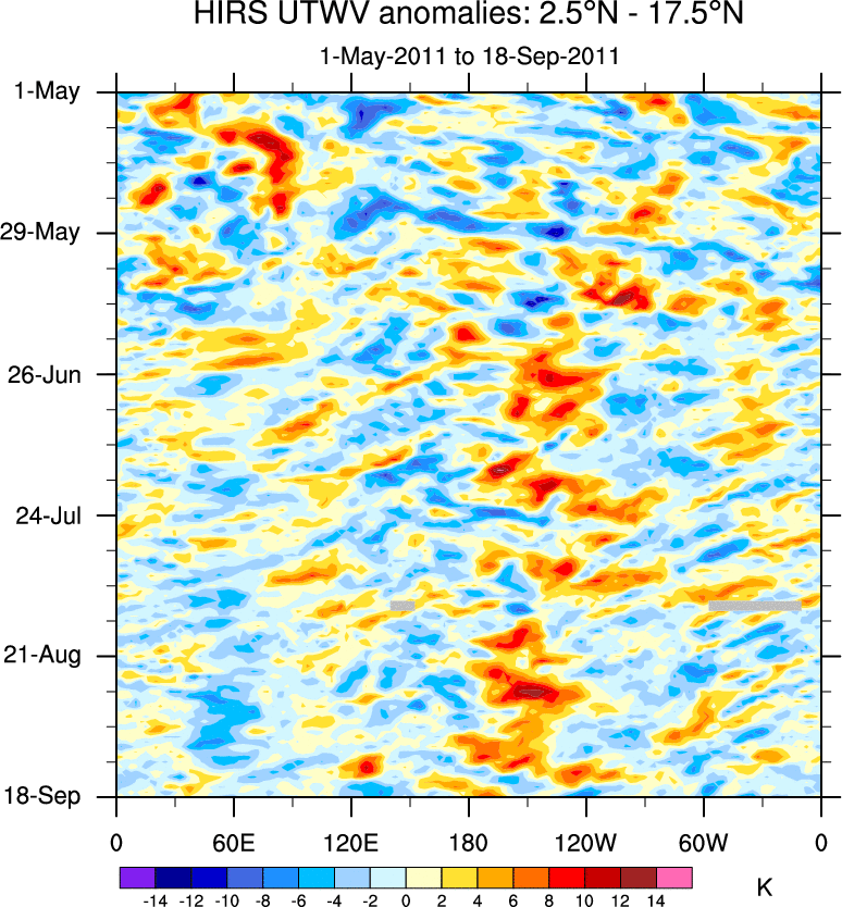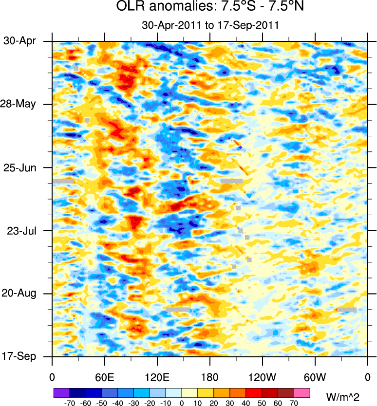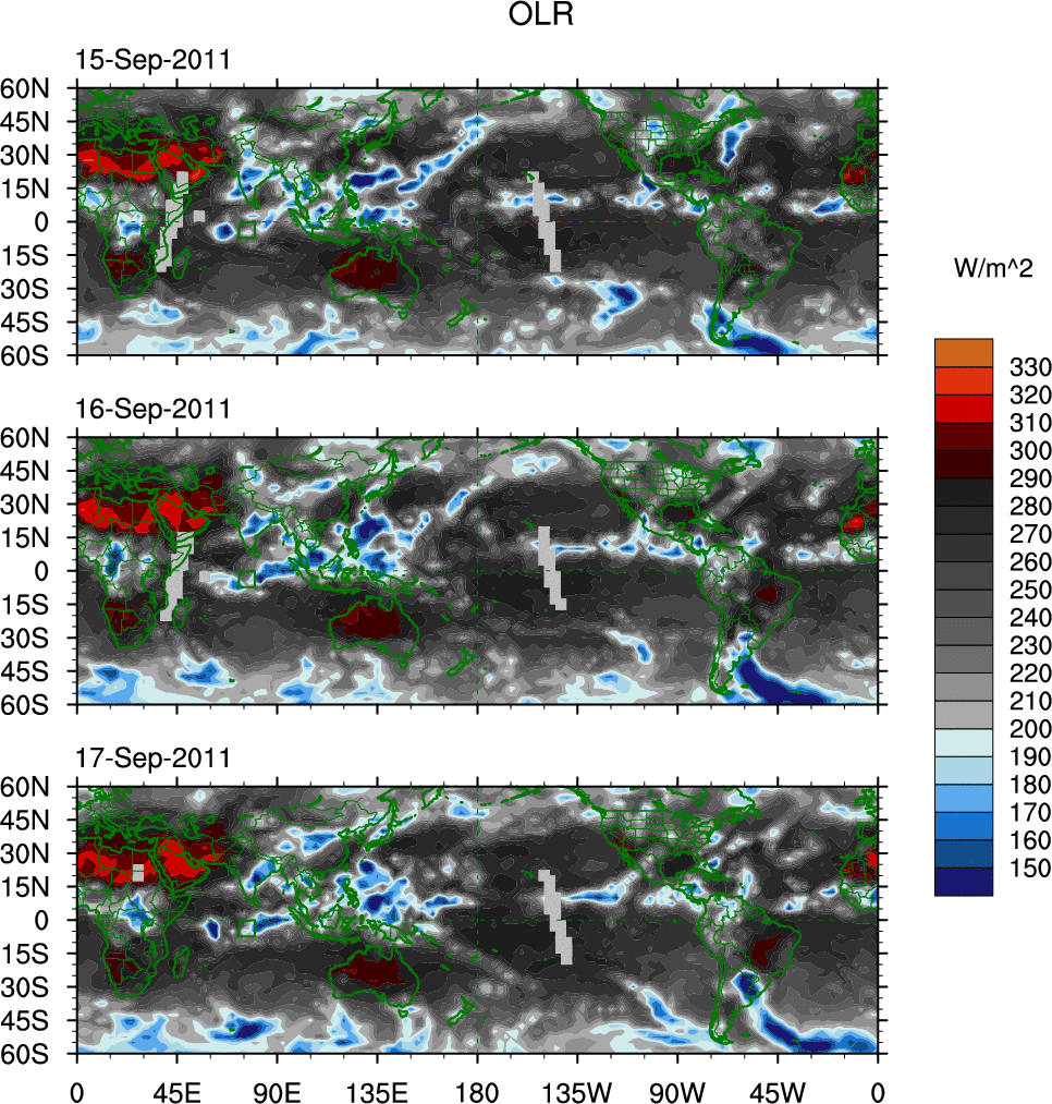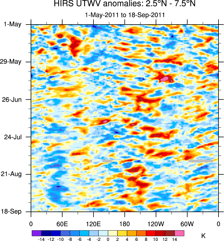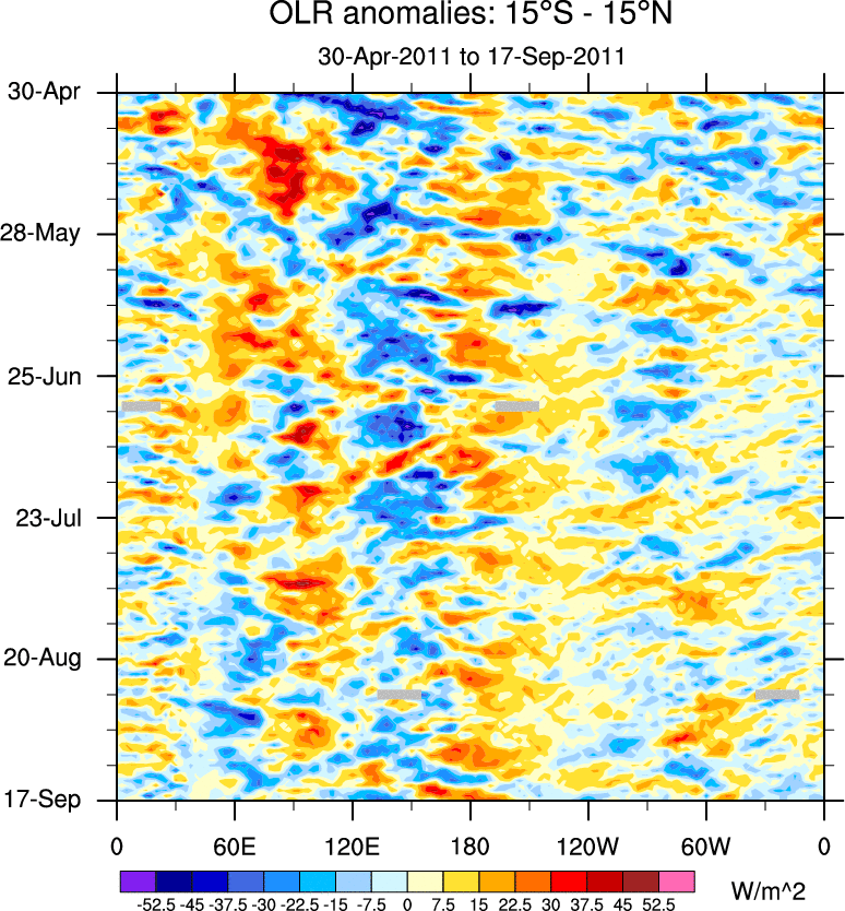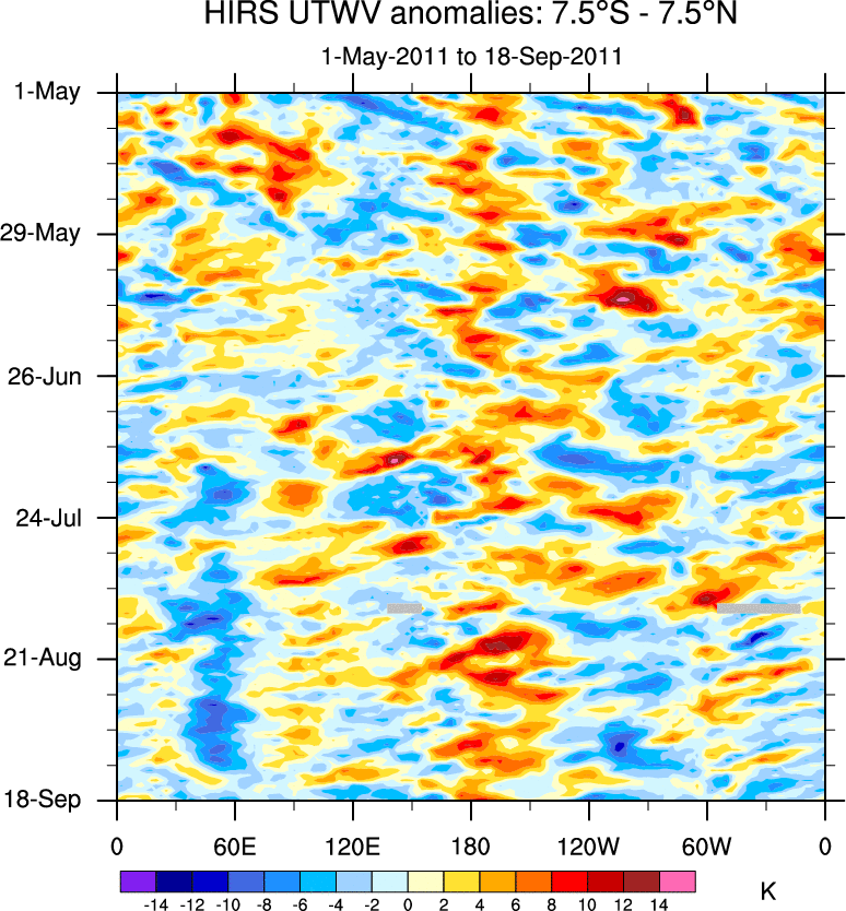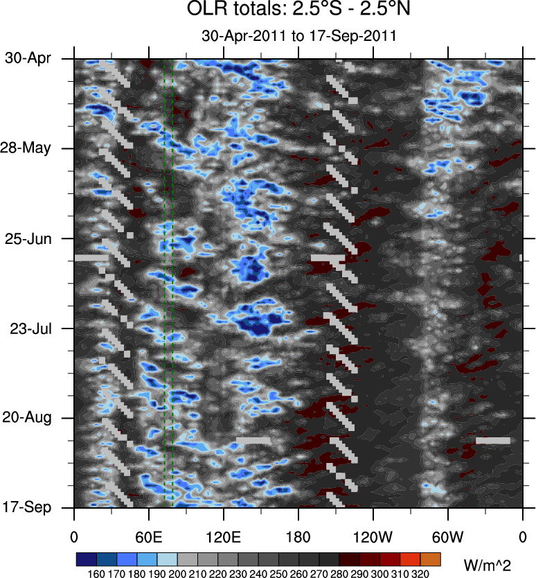 To identify tropical waves in near real-time, the OLR and UTWV data are filtered following Wheeler & Weickmann (2001 MWR). The daily anomalies are calculated using the first 3 harmonics of the seasonal cycle for 1979–2009. Missing values are then filled using linear interpolation in space and time. The most recent 365 days of anomalies are padded with 659 days of zeroes, and the result is filtered for each wave type.