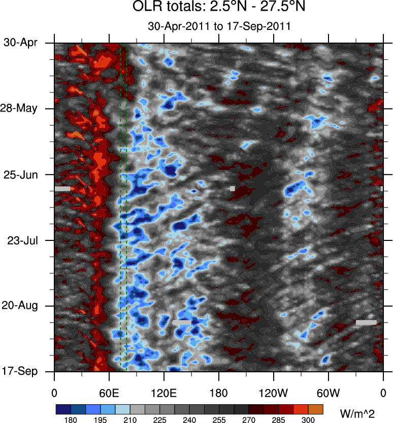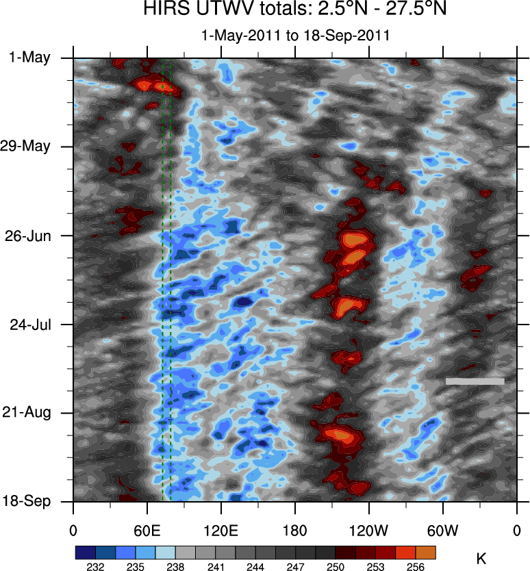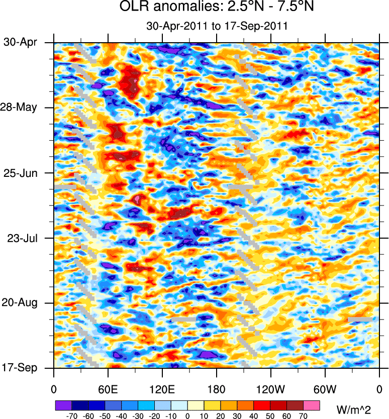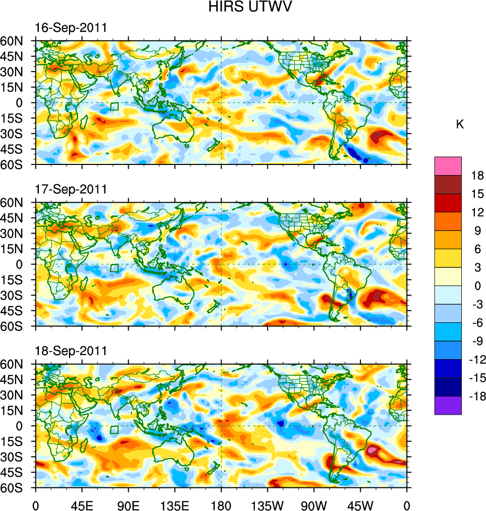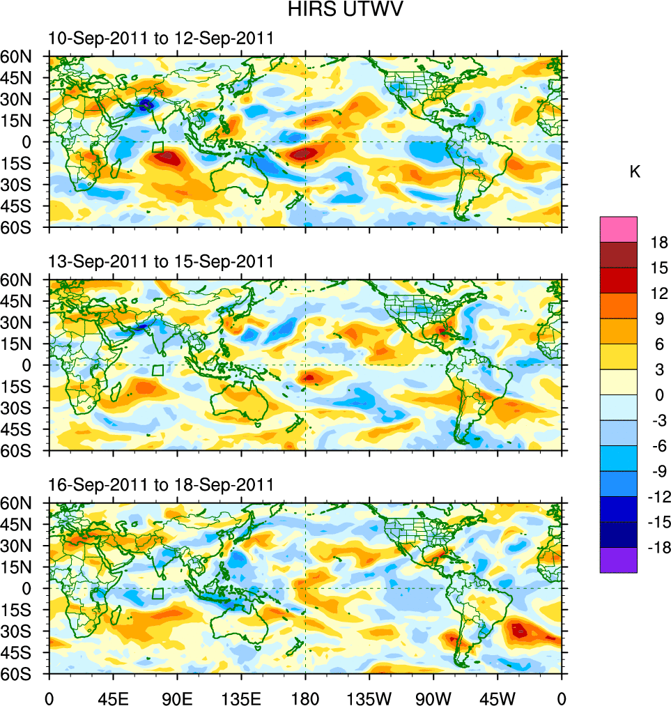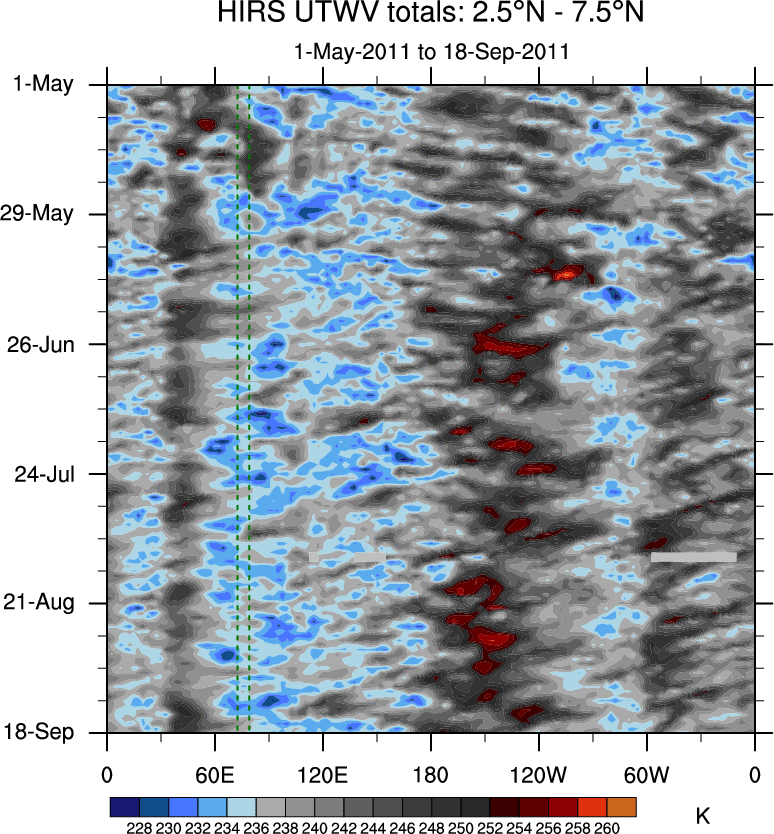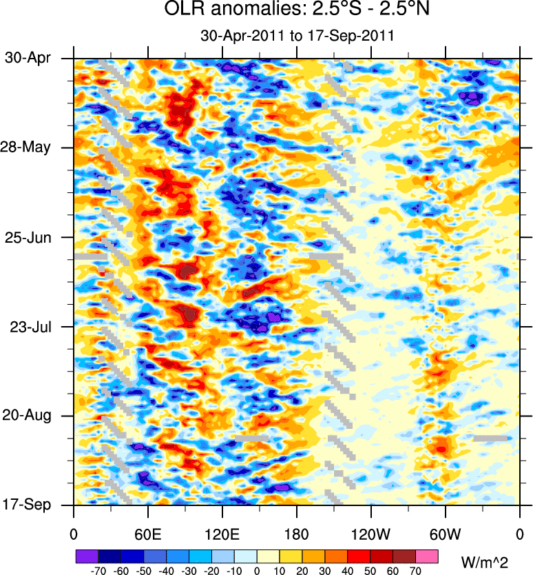 To identify tropical waves in near real-time, the OLR and UTWV data are filtered following Wheeler & Weickmann (2001 MWR). The daily anomalies are calculated using the first 3 harmonics of the seasonal cycle for 1979–2009. Missing values are then filled using linear interpolation in space and time. The most recent 365 days of anomalies are padded with 659 days of zeroes, and the result is filtered for each wave type.