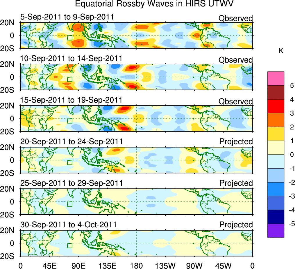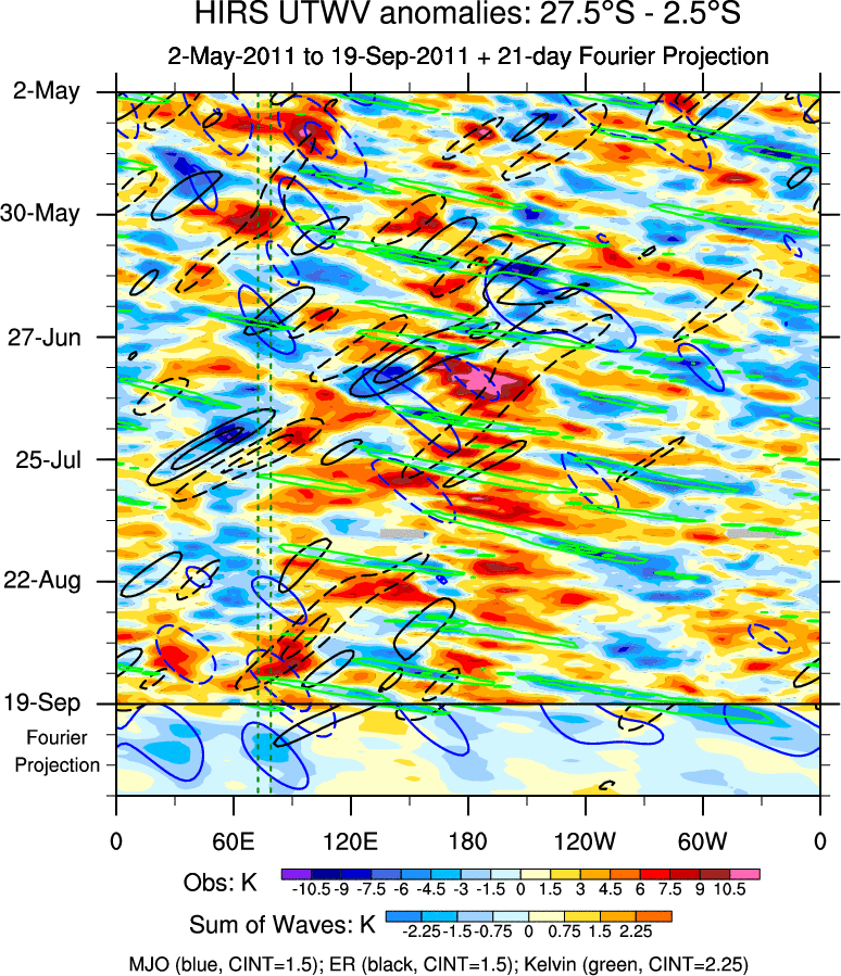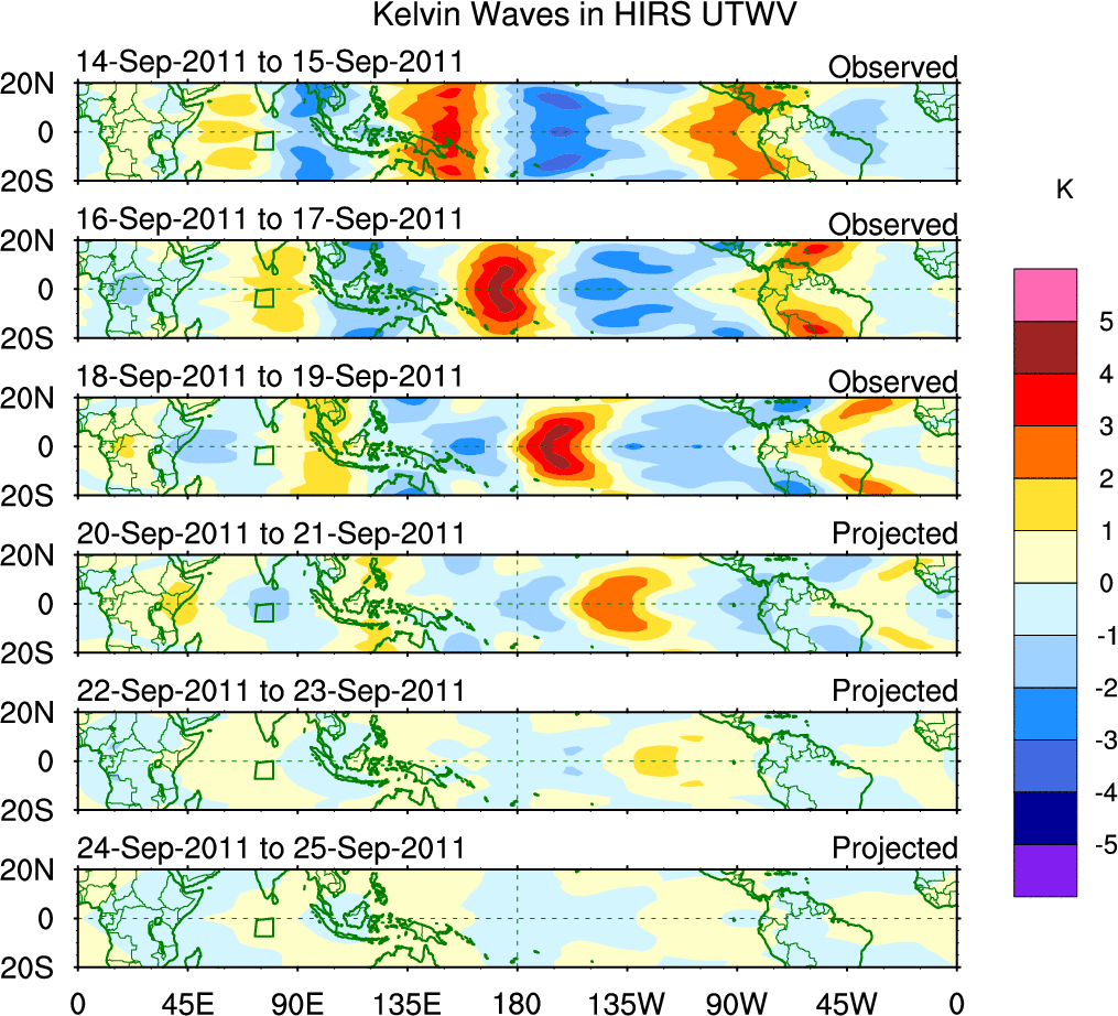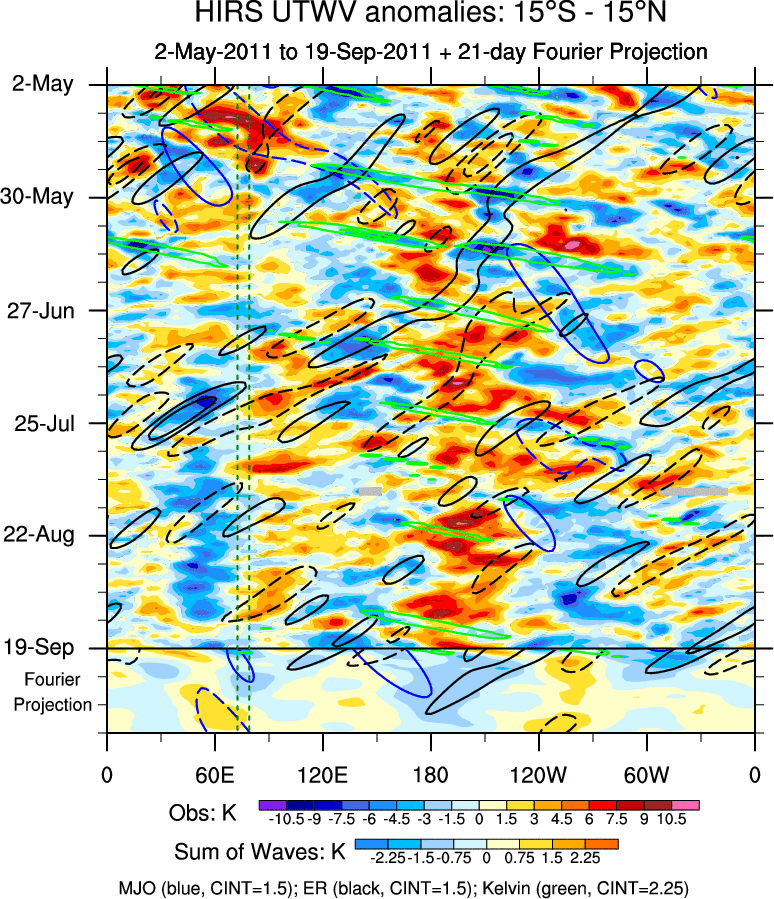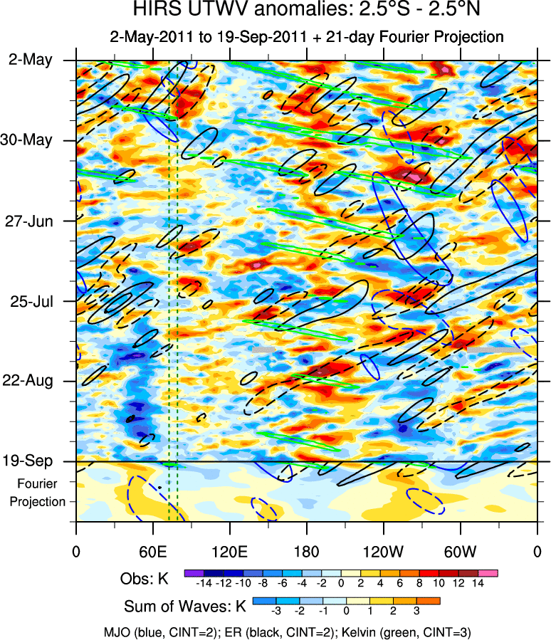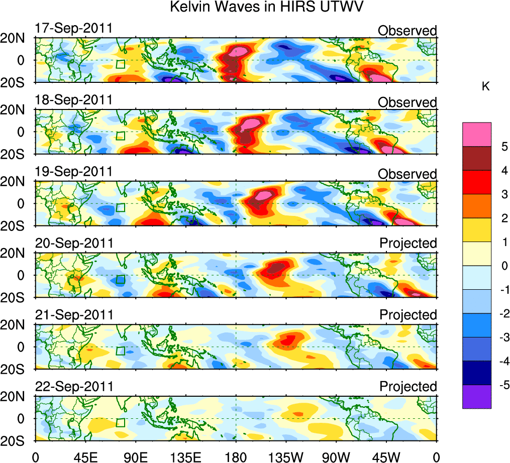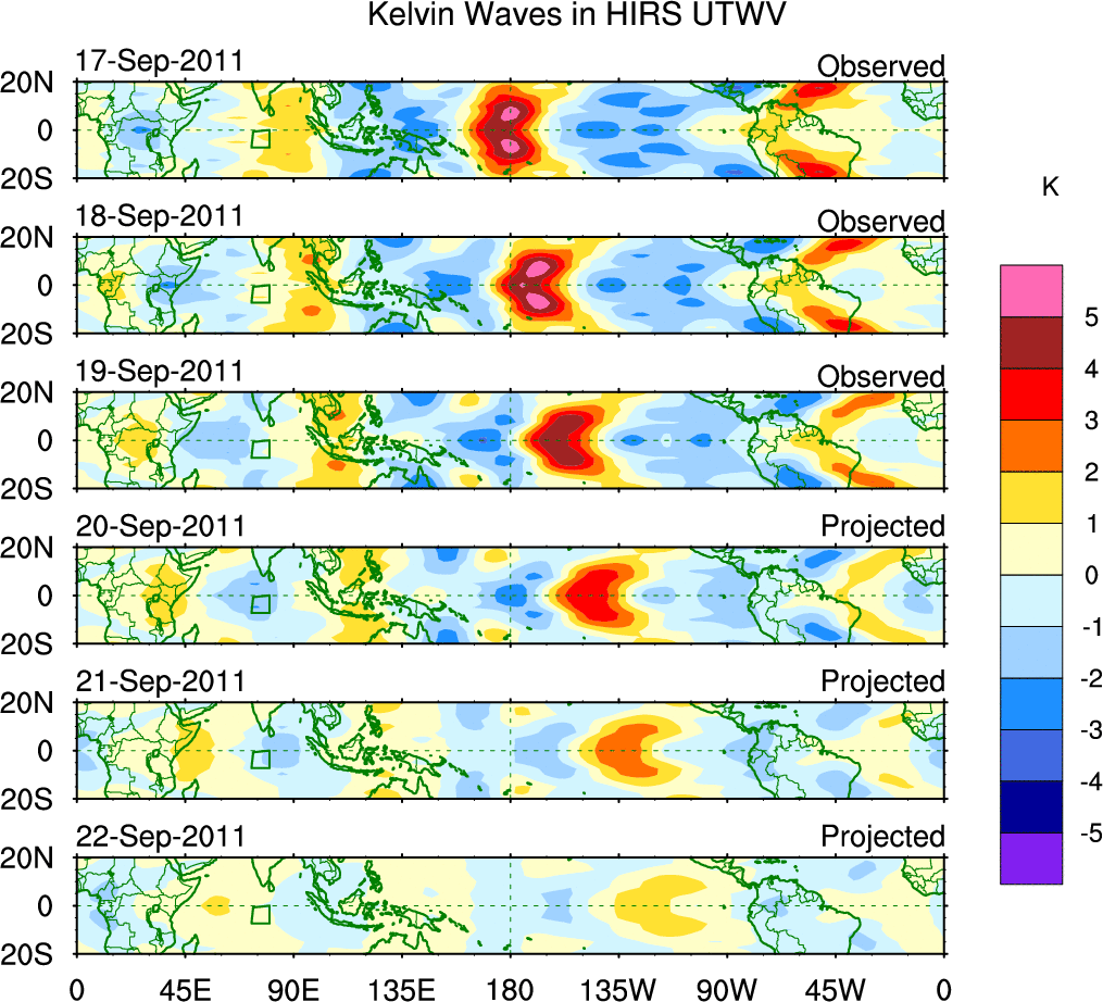 To identify tropical waves in near real-time, the OLR and UTWV data are filtered following Wheeler & Weickmann (2001 MWR). The daily anomalies are calculated using the first 3 harmonics of the seasonal cycle for 1979–2009. Missing values are then filled using linear interpolation in space and time. The most recent 365 days of anomalies are padded with 659 days of zeroes, and the result is filtered for each wave type.