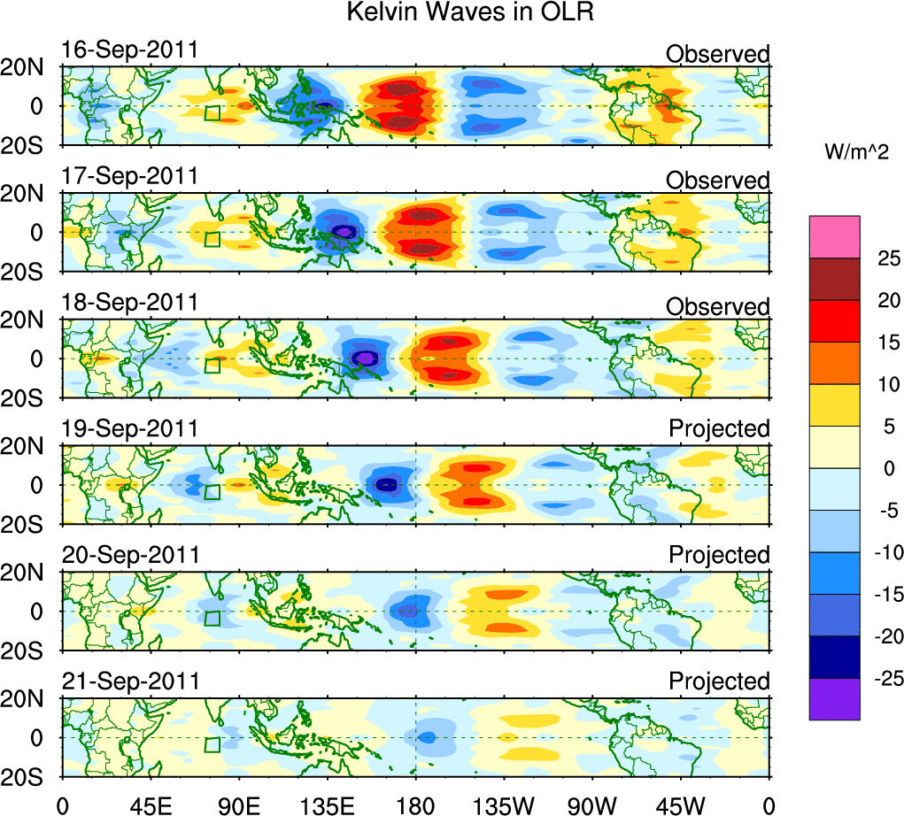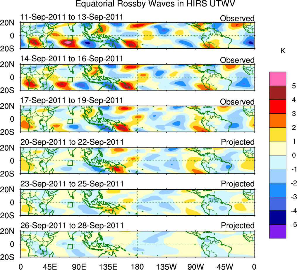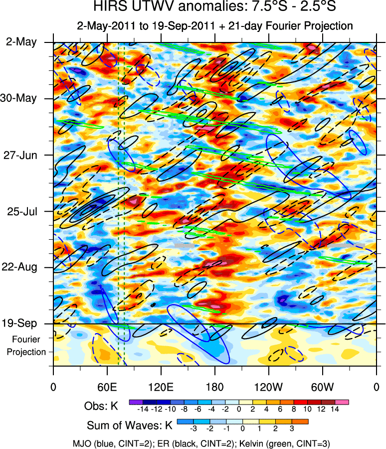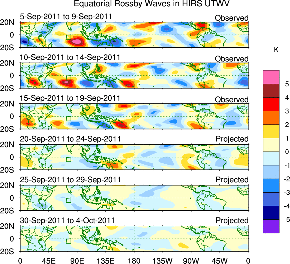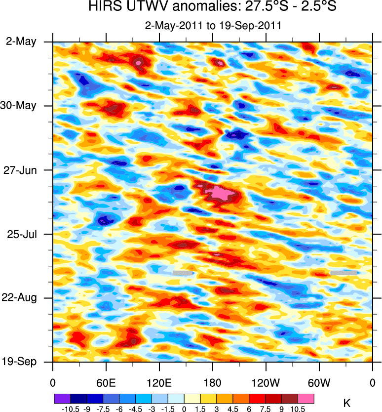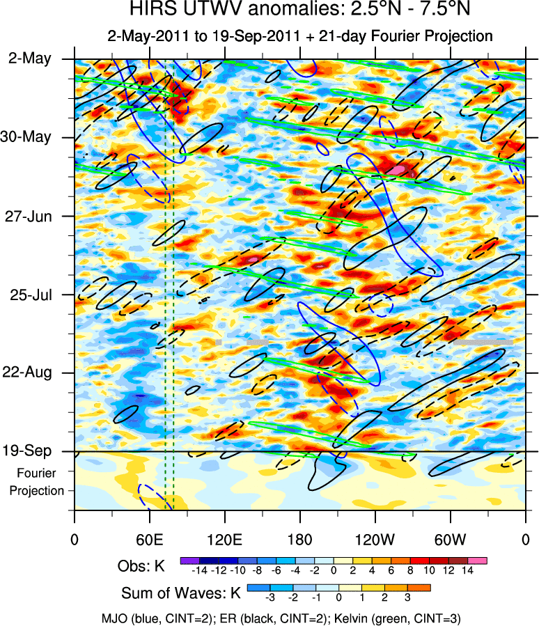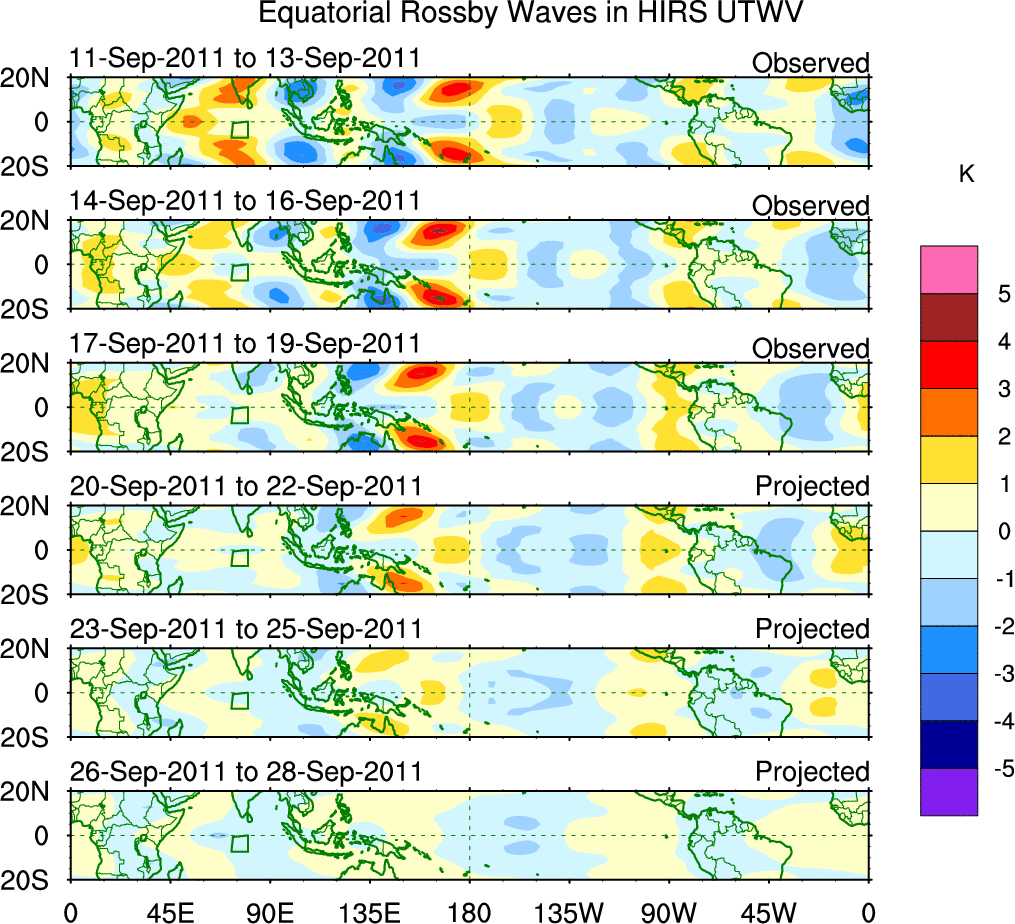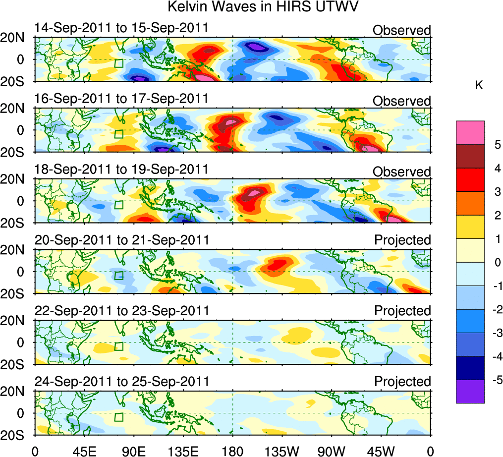 To identify tropical waves in near real-time, the OLR and UTWV data are filtered following Wheeler & Weickmann (2001 MWR). The daily anomalies are calculated using the first 3 harmonics of the seasonal cycle for 1979–2009. Missing values are then filled using linear interpolation in space and time. The most recent 365 days of anomalies are padded with 659 days of zeroes, and the result is filtered for each wave type.
