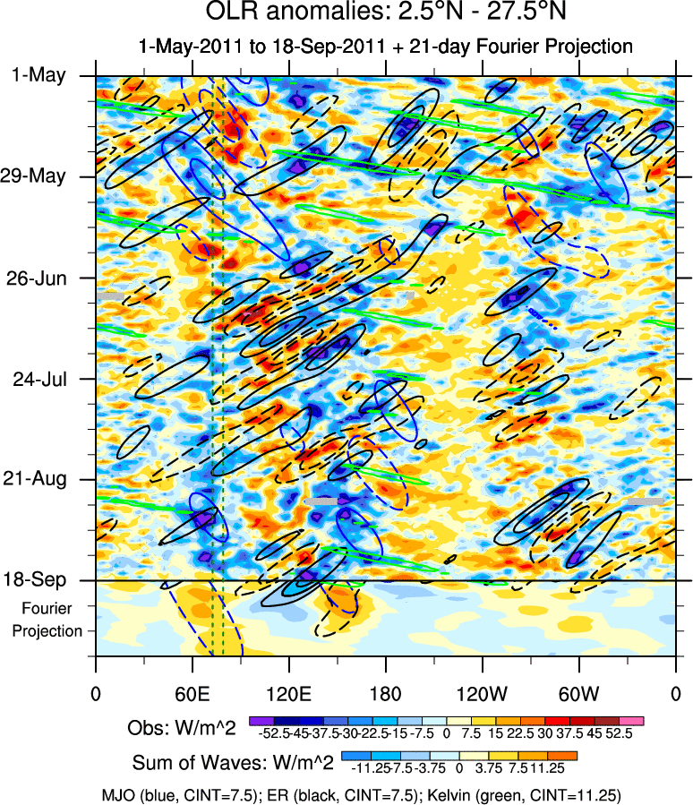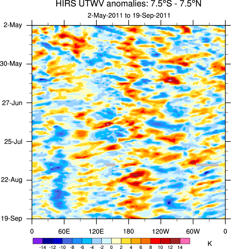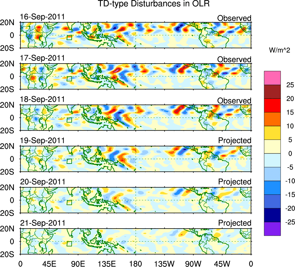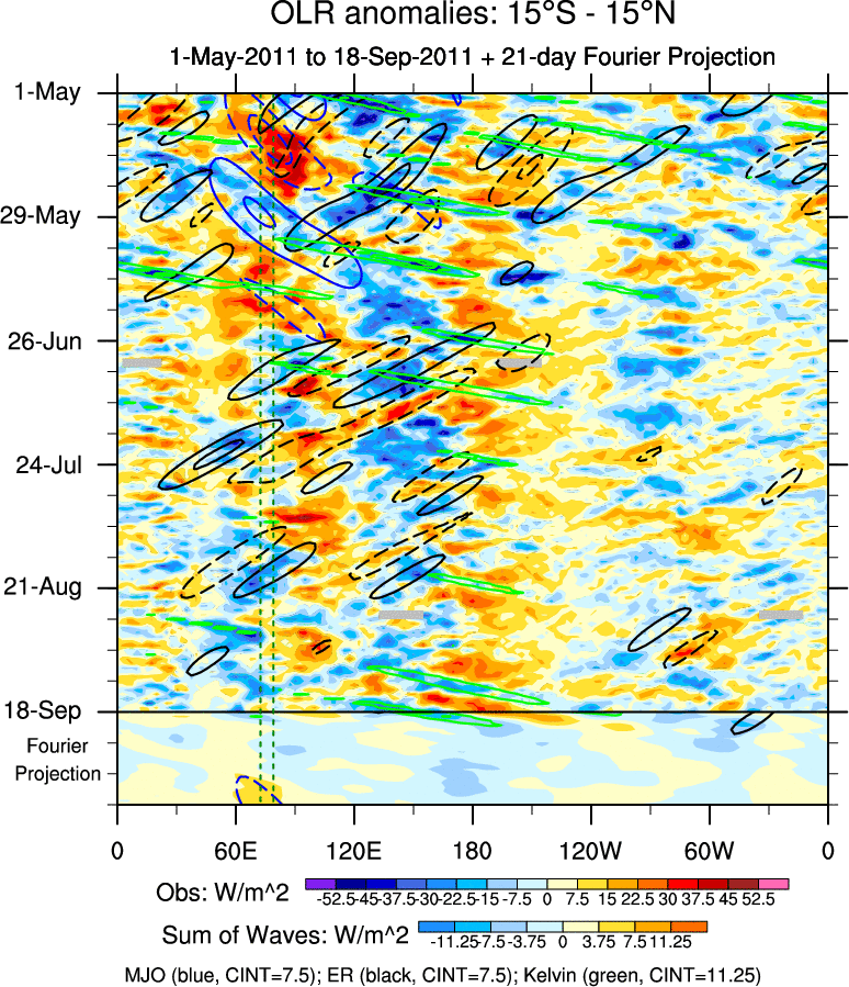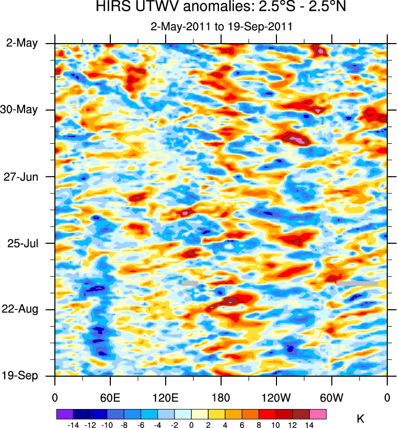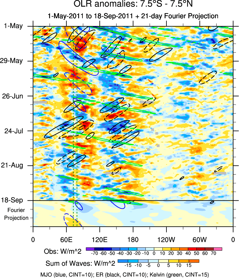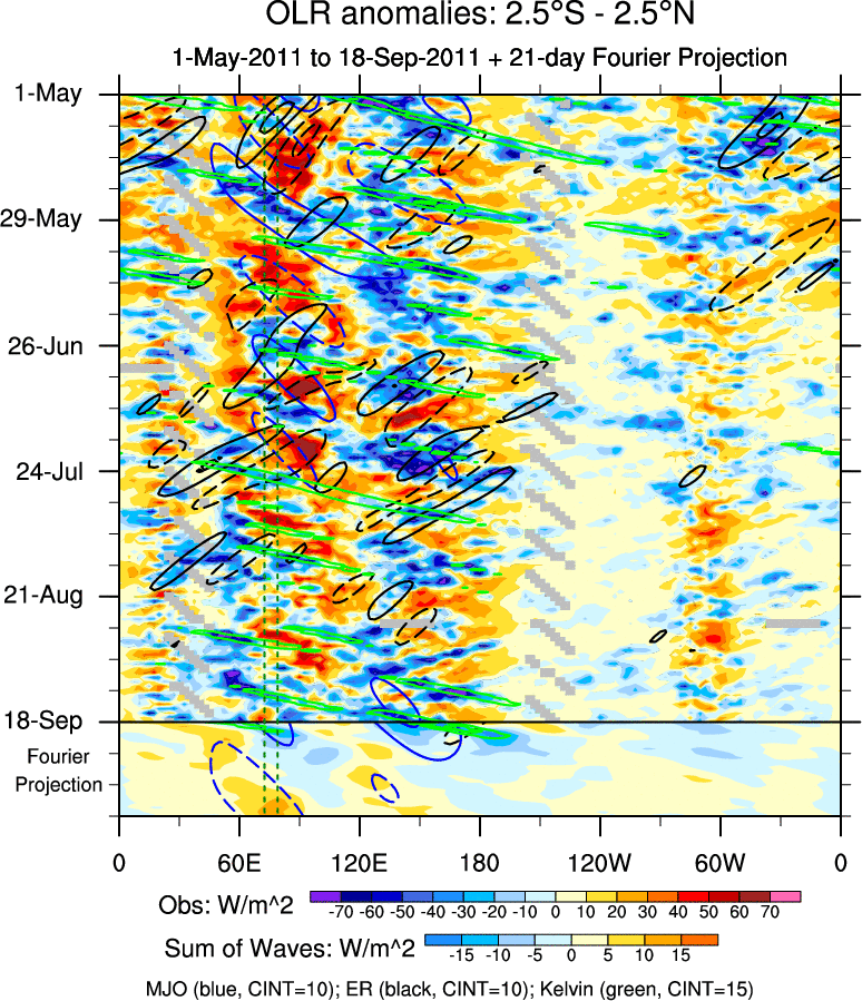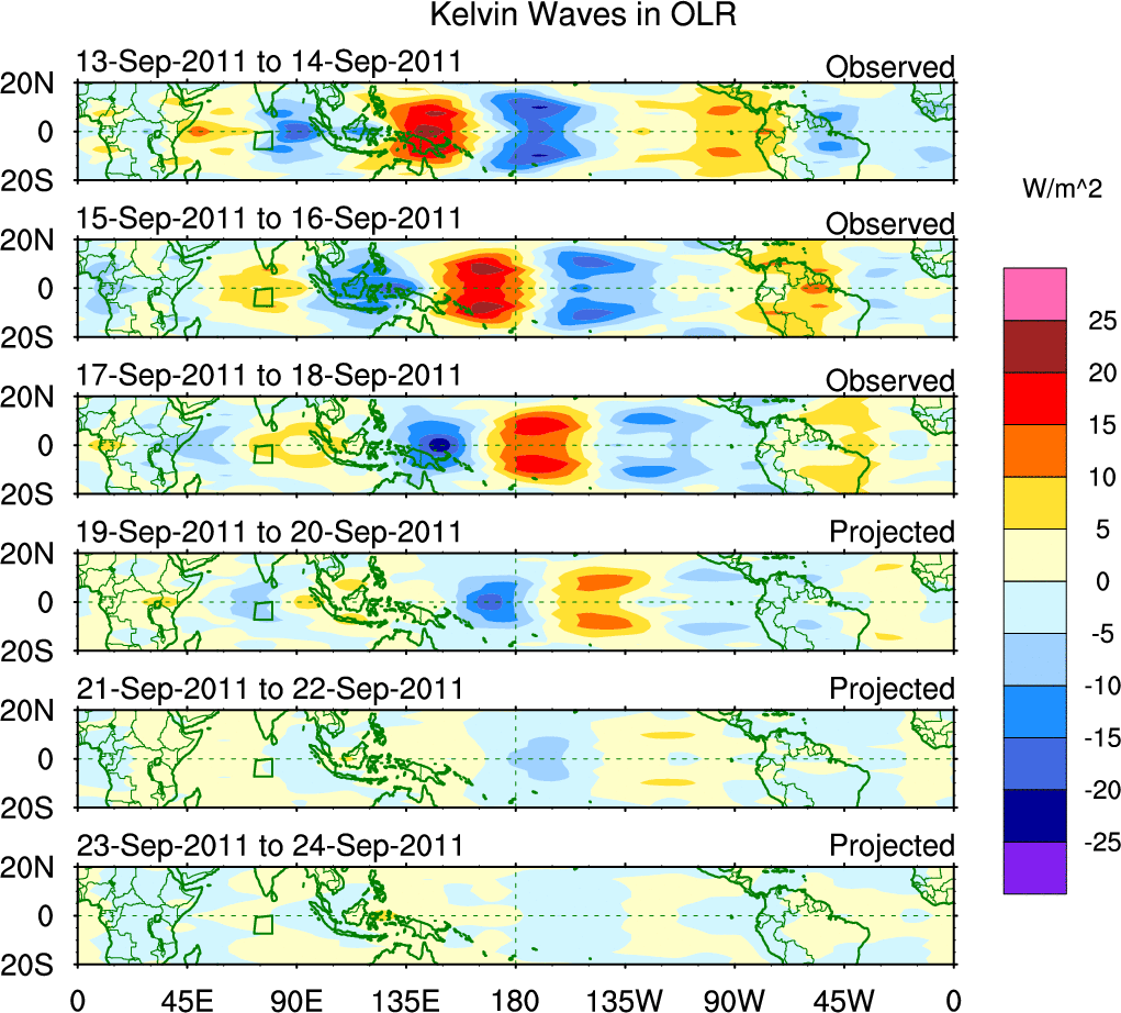 To identify tropical waves in near real-time, the OLR and UTWV data are filtered following Wheeler & Weickmann (2001 MWR). The daily anomalies are calculated using the first 3 harmonics of the seasonal cycle for 1979–2009. Missing values are then filled using linear interpolation in space and time. The most recent 365 days of anomalies are padded with 659 days of zeroes, and the result is filtered for each wave type.