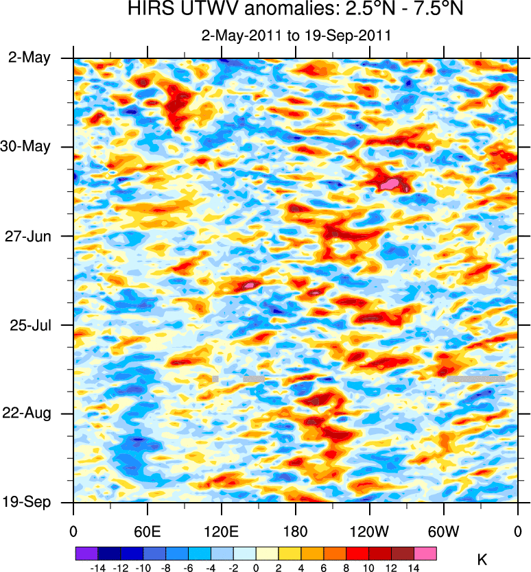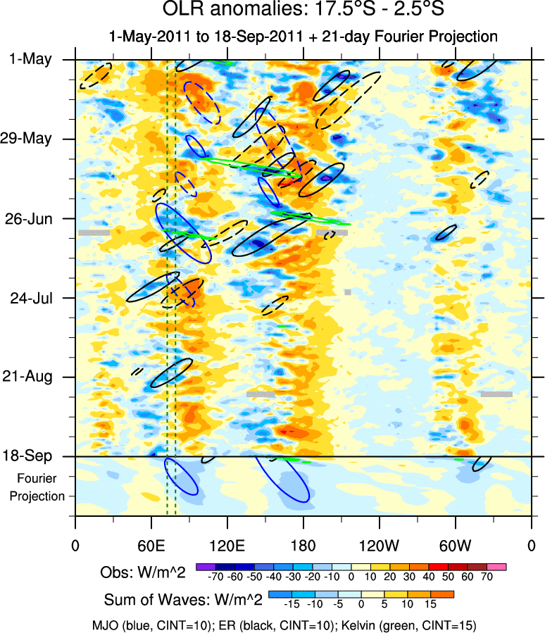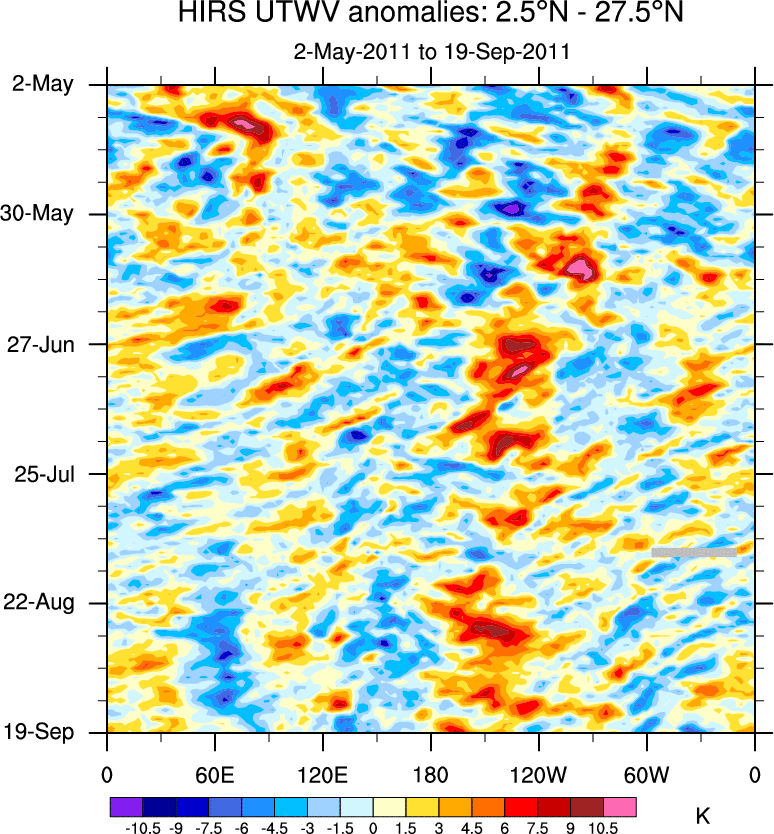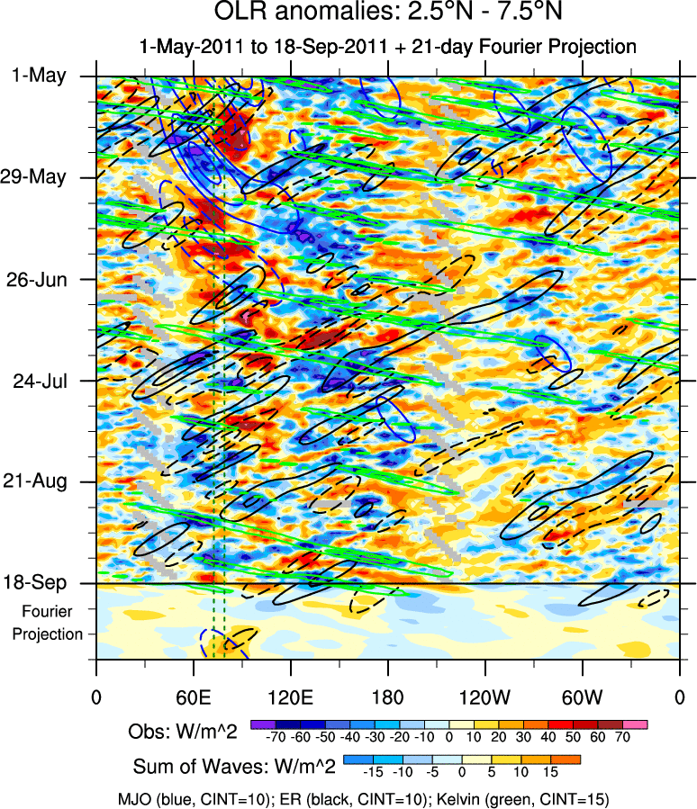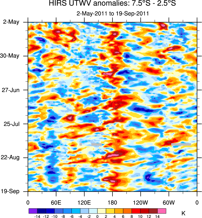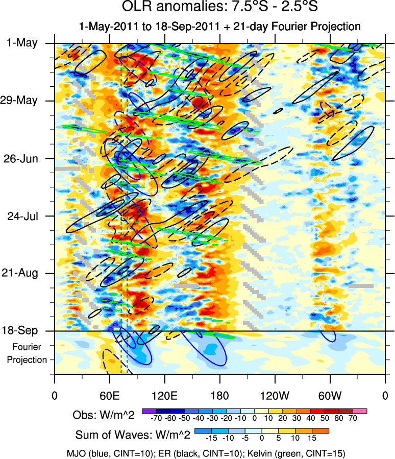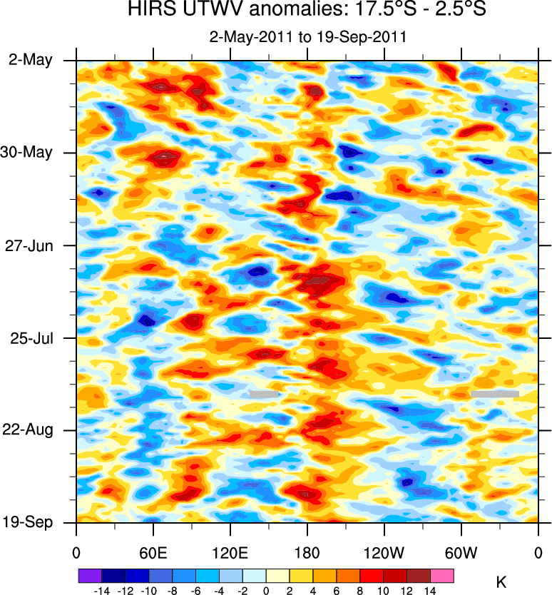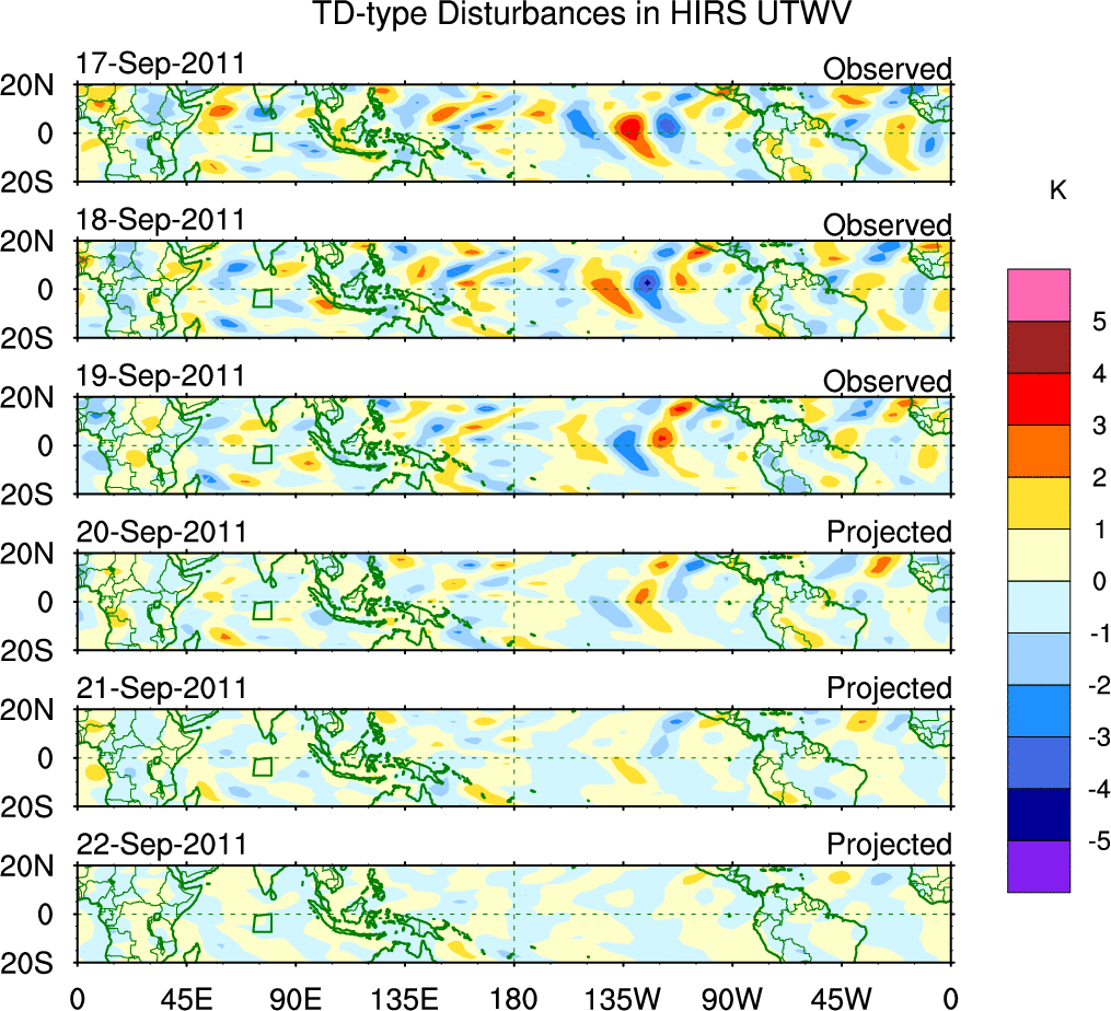 To identify tropical waves in near real-time, the OLR and UTWV data are filtered following Wheeler & Weickmann (2001 MWR). The daily anomalies are calculated using the first 3 harmonics of the seasonal cycle for 1979–2009. Missing values are then filled using linear interpolation in space and time. The most recent 365 days of anomalies are padded with 659 days of zeroes, and the result is filtered for each wave type.