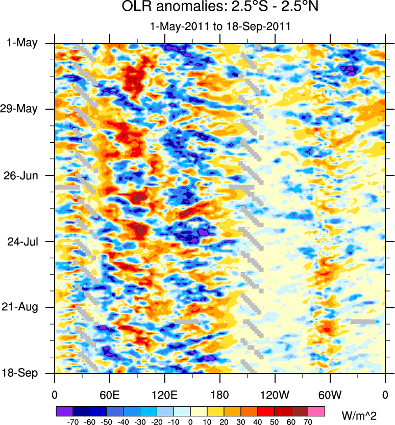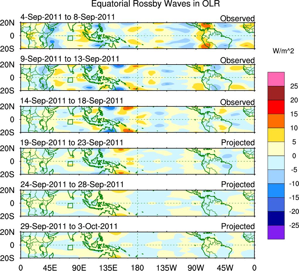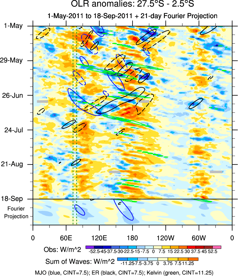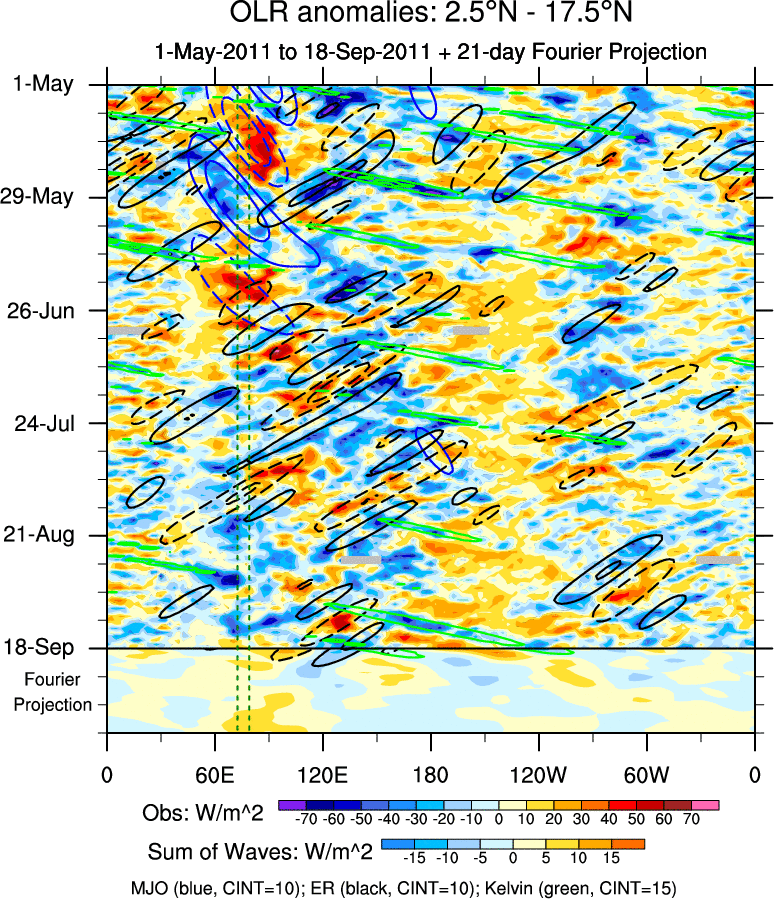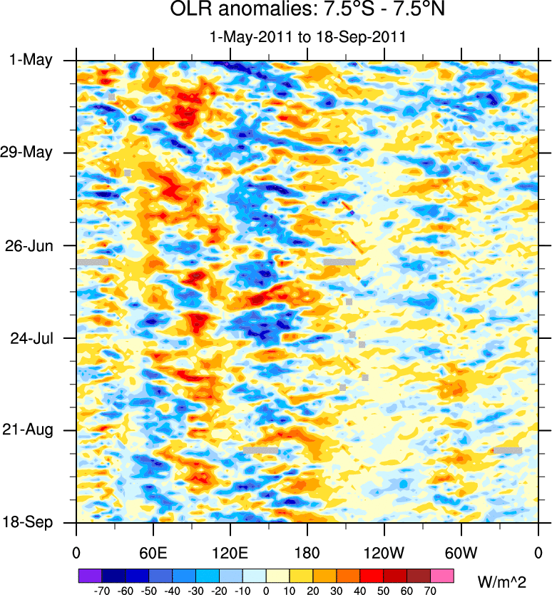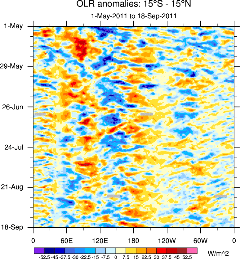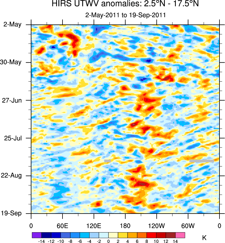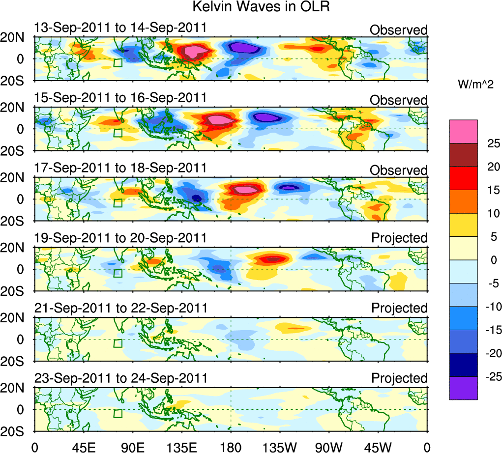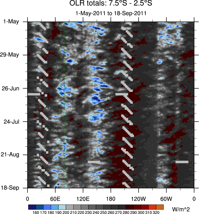 To identify tropical waves in near real-time, the OLR and UTWV data are filtered following Wheeler & Weickmann (2001 MWR). The daily anomalies are calculated using the first 3 harmonics of the seasonal cycle for 1979–2009. Missing values are then filled using linear interpolation in space and time. The most recent 365 days of anomalies are padded with 659 days of zeroes, and the result is filtered for each wave type.