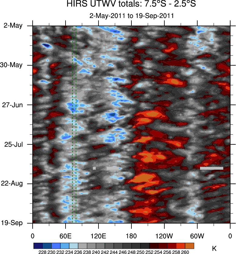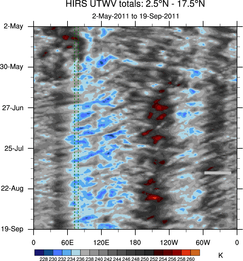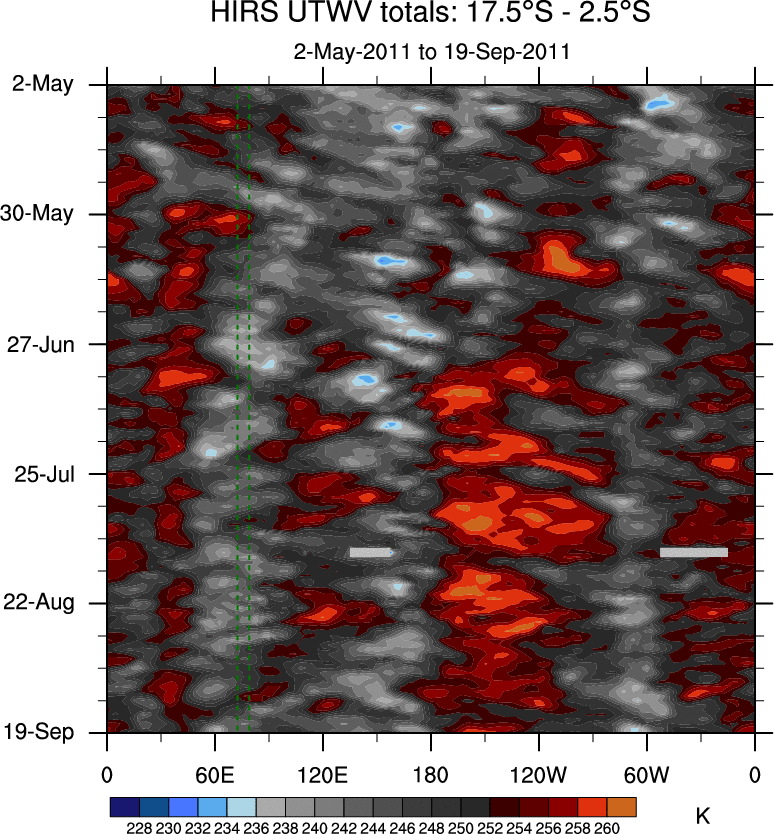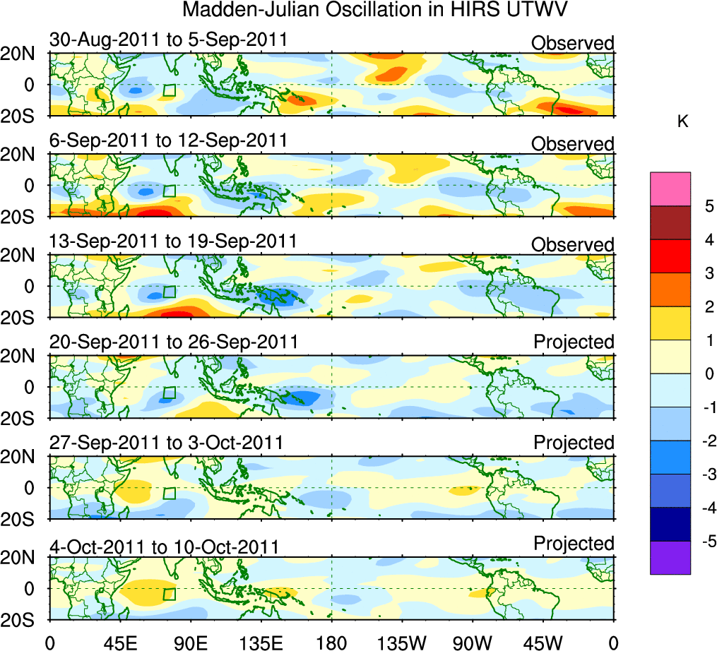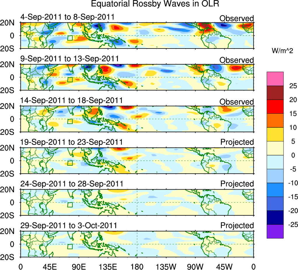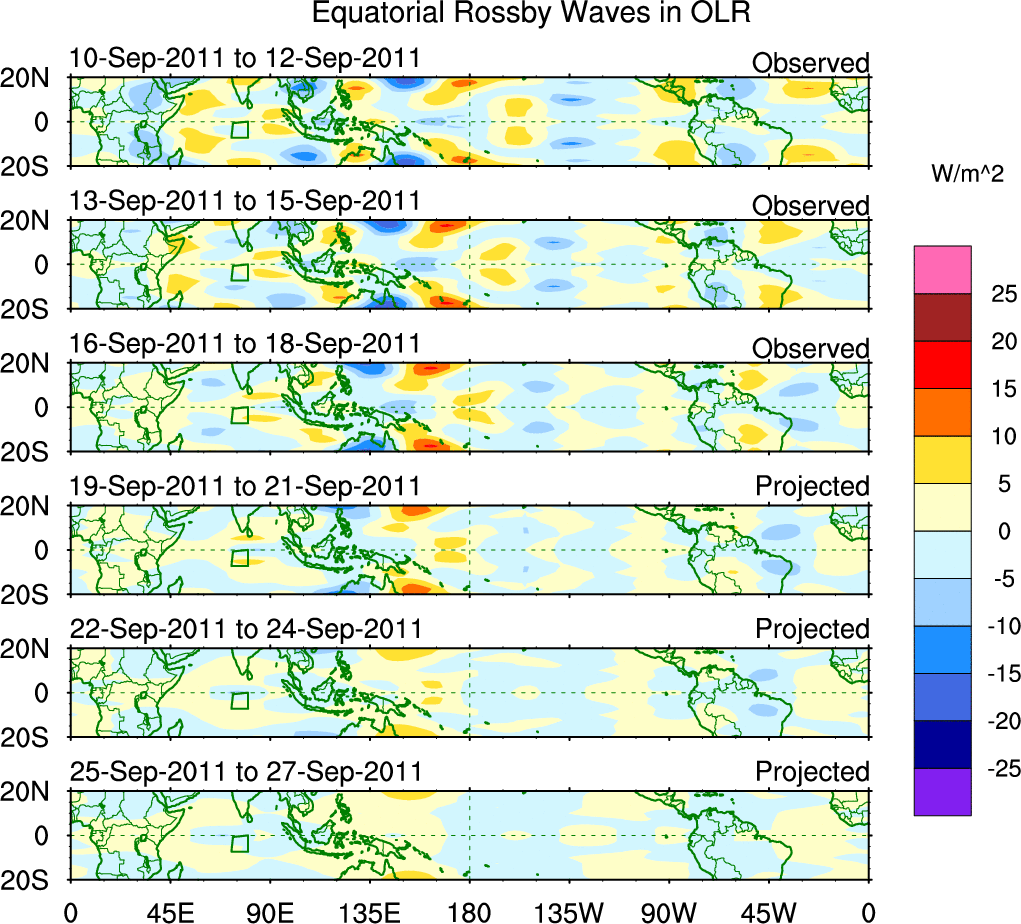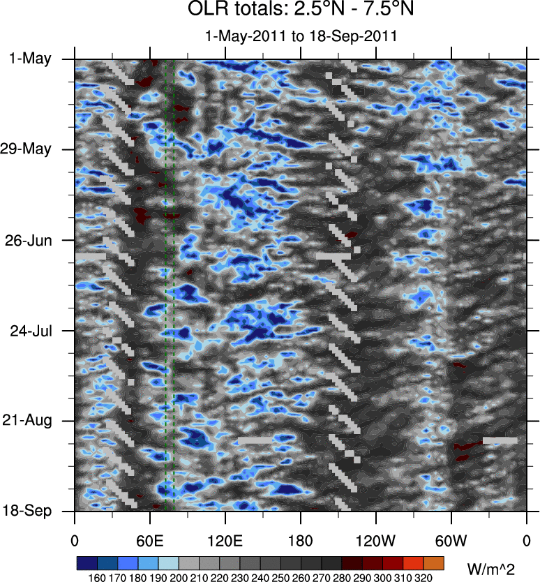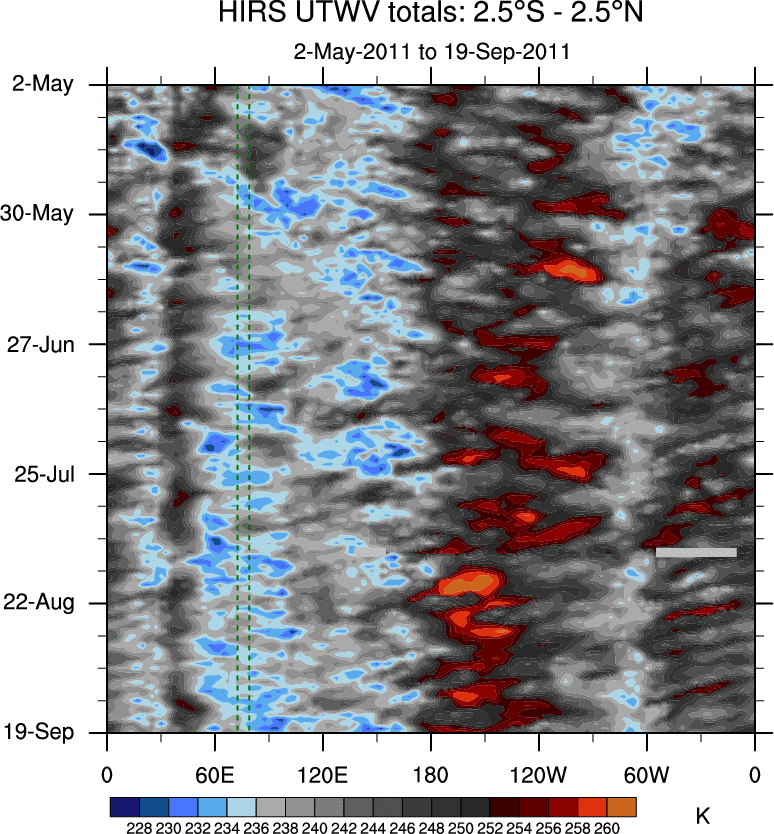 To identify tropical waves in near real-time, the OLR and UTWV data are filtered following Wheeler & Weickmann (2001 MWR). The daily anomalies are calculated using the first 3 harmonics of the seasonal cycle for 1979–2009. Missing values are then filled using linear interpolation in space and time. The most recent 365 days of anomalies are padded with 659 days of zeroes, and the result is filtered for each wave type.