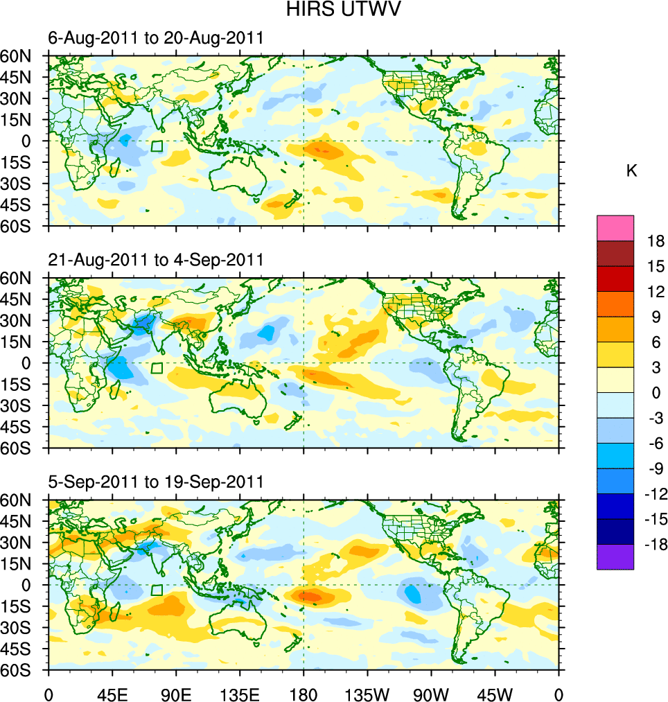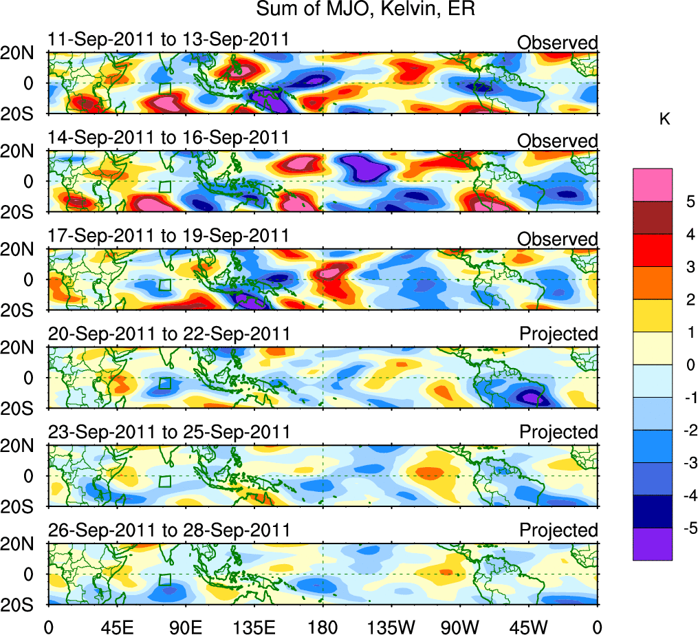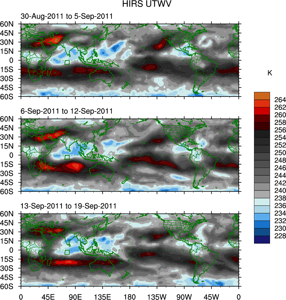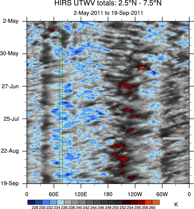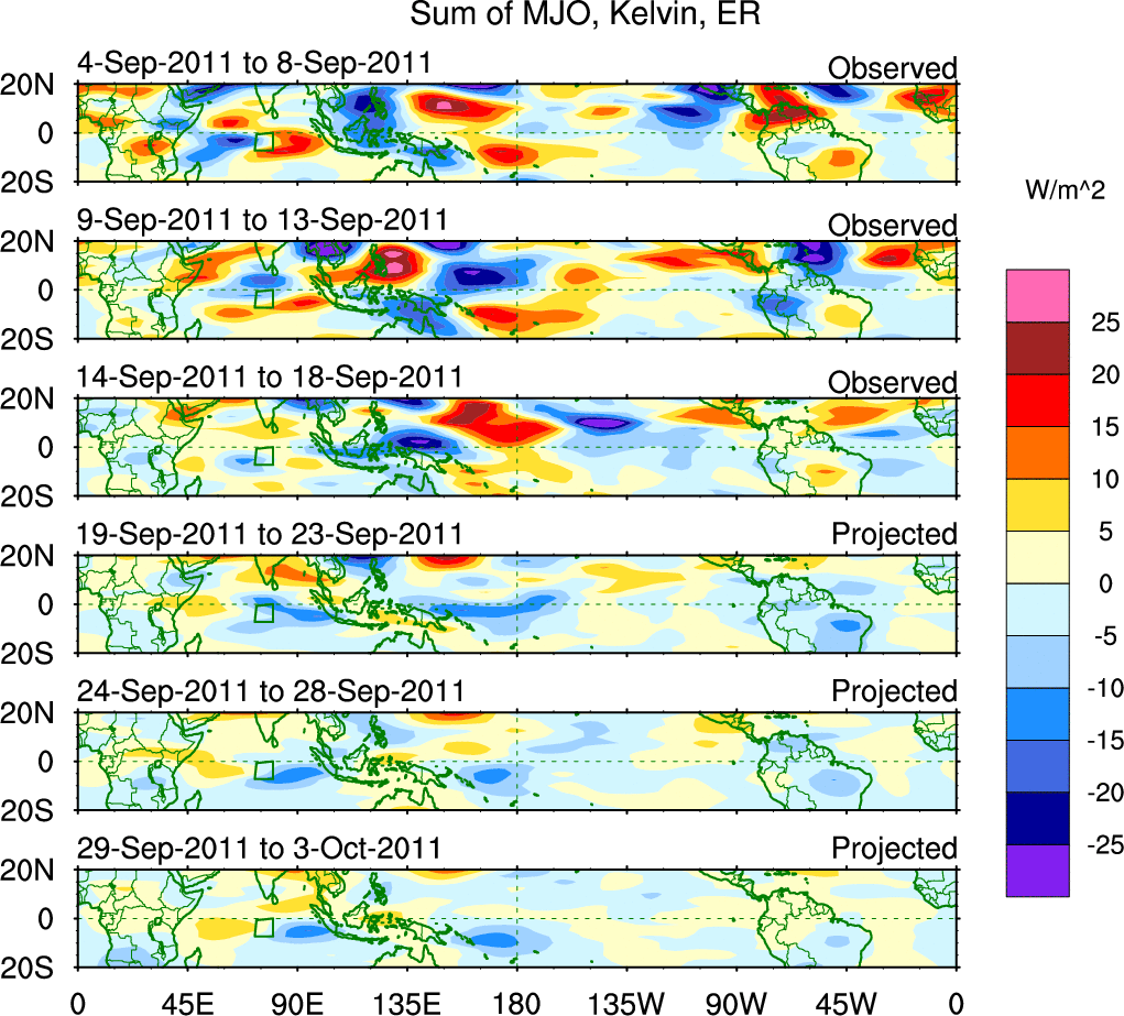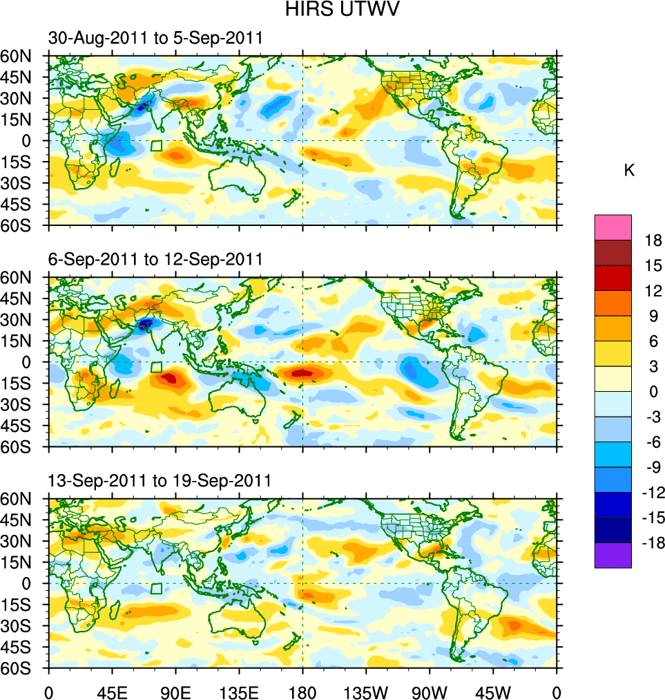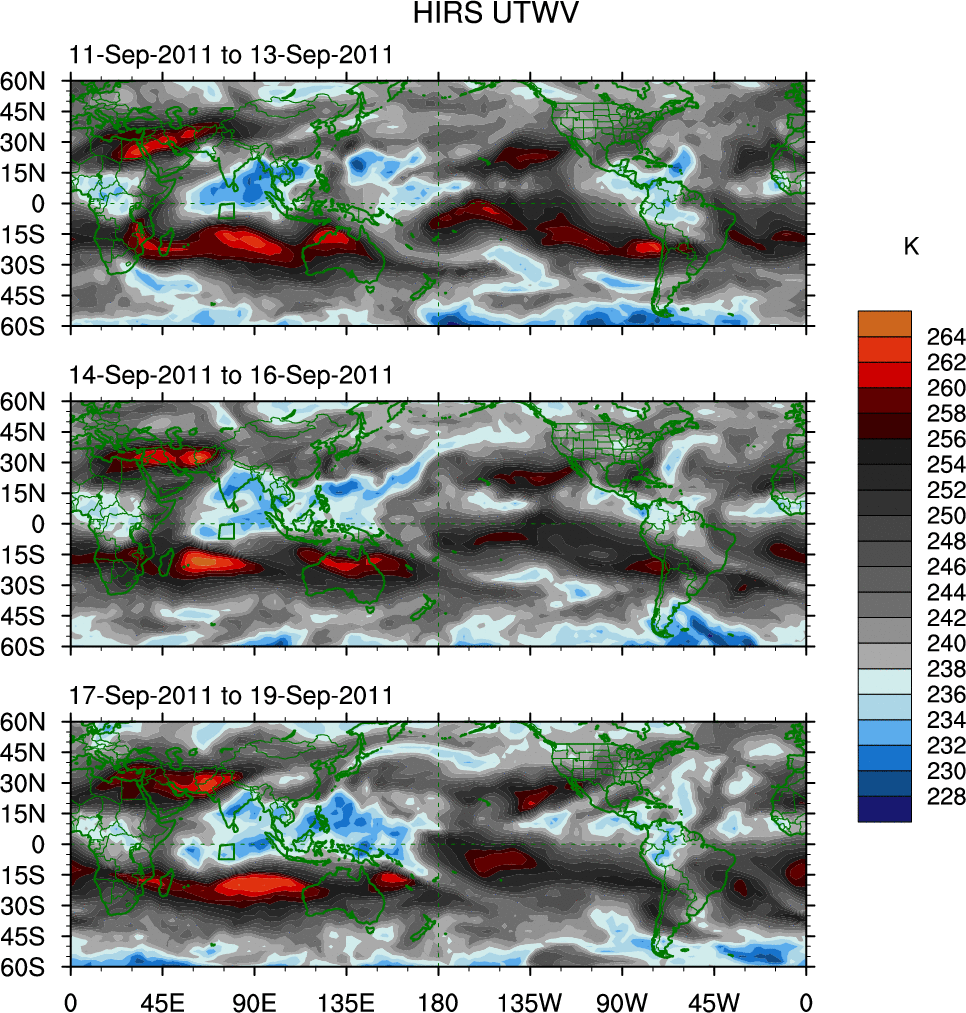 To identify tropical waves in near real-time, the OLR and UTWV data are filtered following Wheeler & Weickmann (2001 MWR). The daily anomalies are calculated using the first 3 harmonics of the seasonal cycle for 1979–2009. Missing values are then filled using linear interpolation in space and time. The most recent 365 days of anomalies are padded with 659 days of zeroes, and the result is filtered for each wave type.
