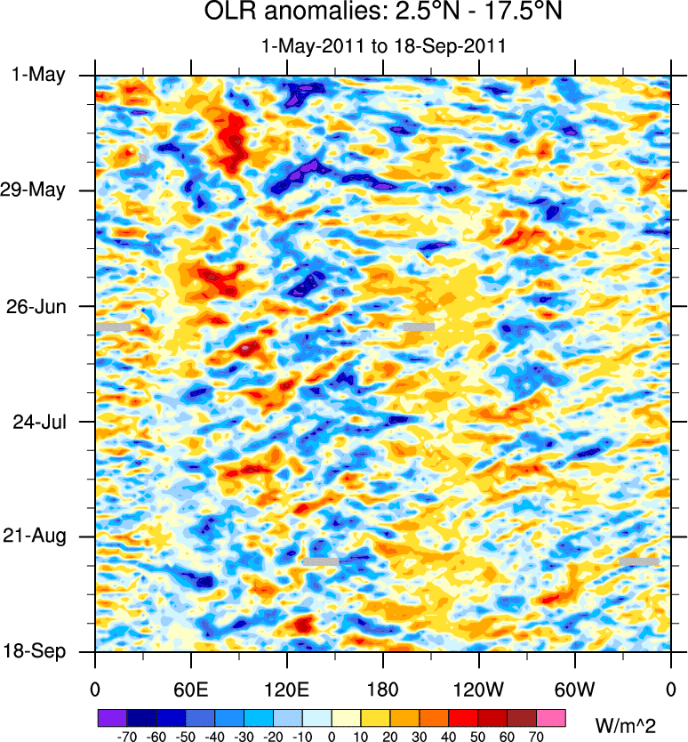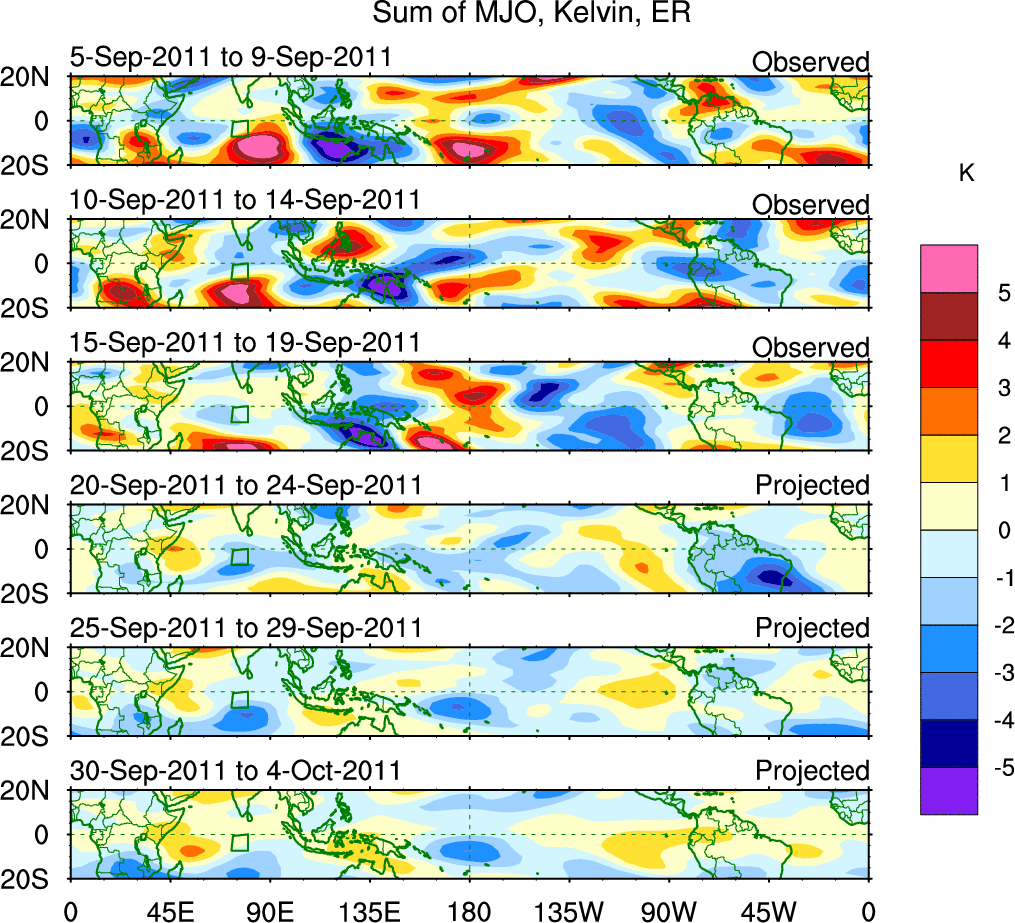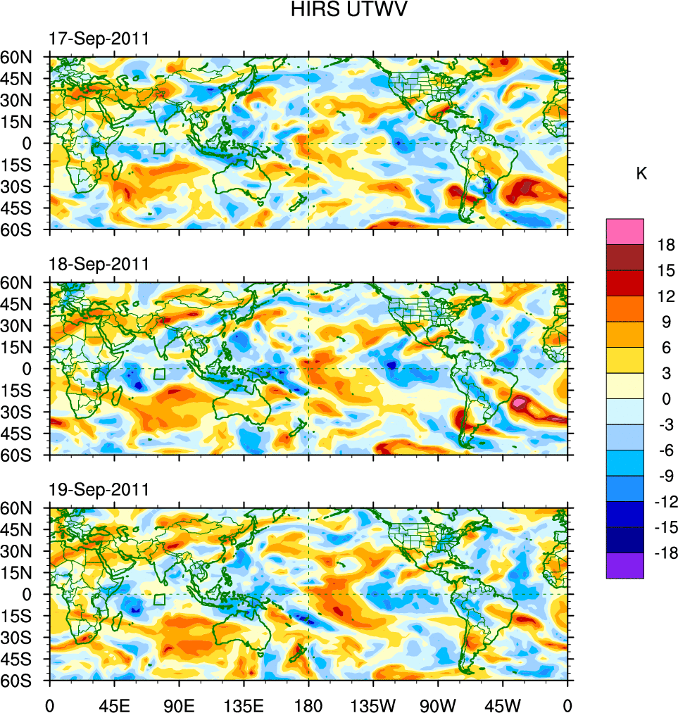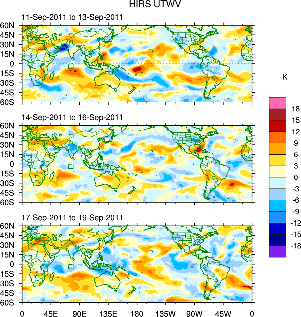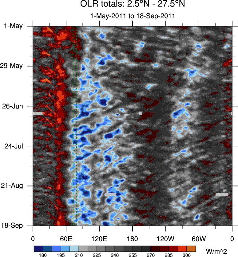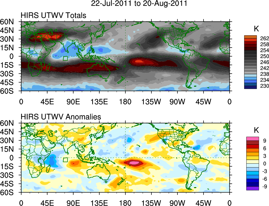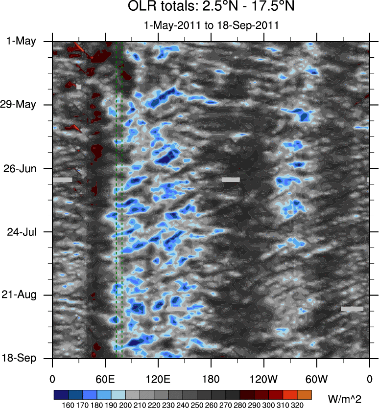 To identify tropical waves in near real-time, the OLR and UTWV data are filtered following Wheeler & Weickmann (2001 MWR). The daily anomalies are calculated using the first 3 harmonics of the seasonal cycle for 1979–2009. Missing values are then filled using linear interpolation in space and time. The most recent 365 days of anomalies are padded with 659 days of zeroes, and the result is filtered for each wave type.