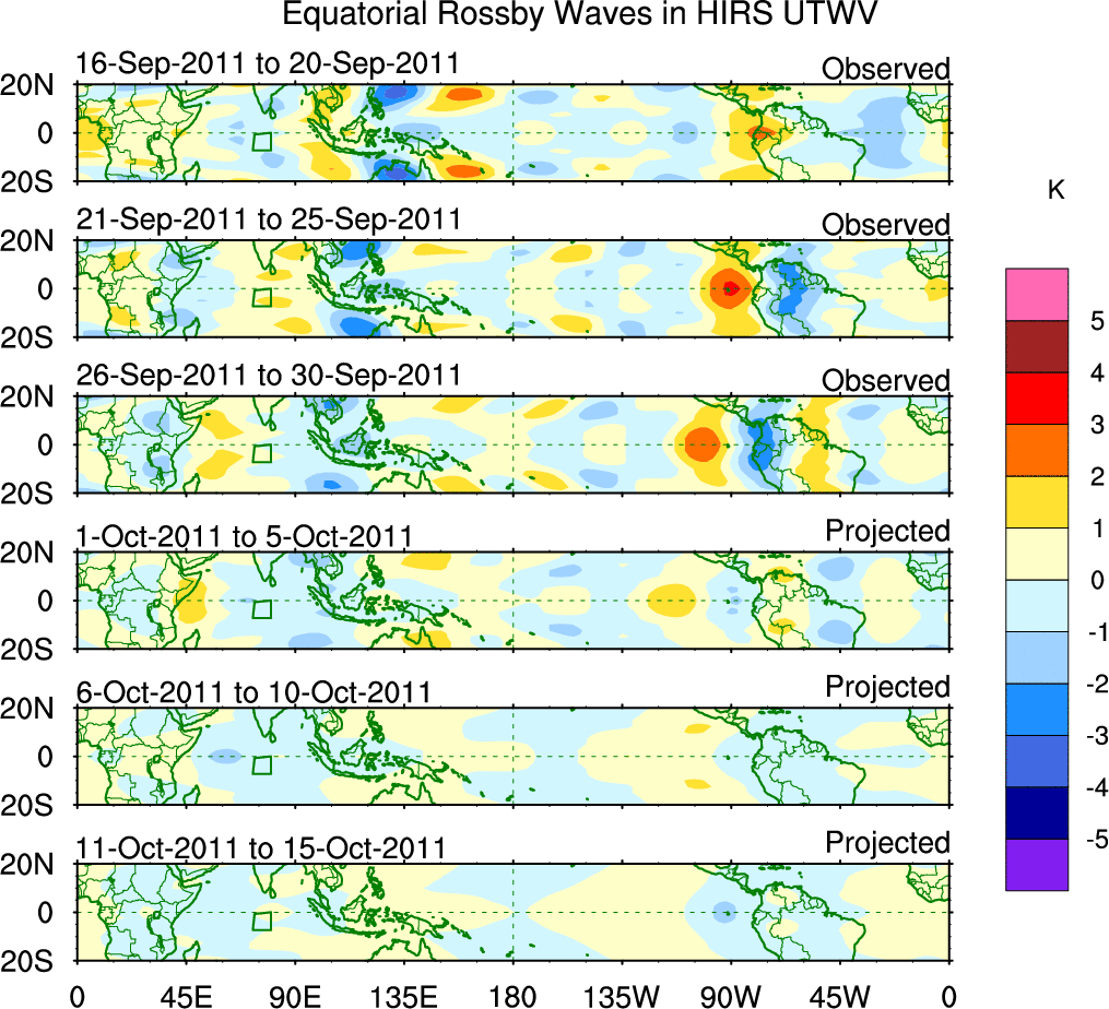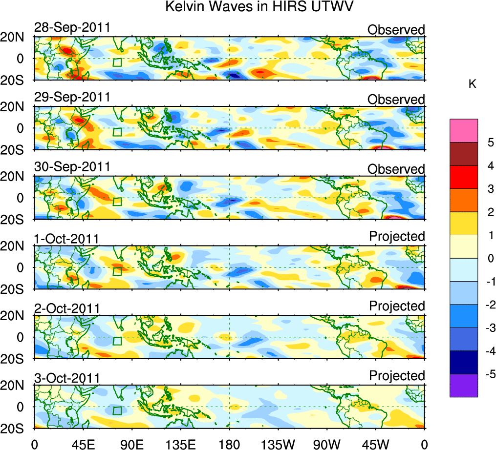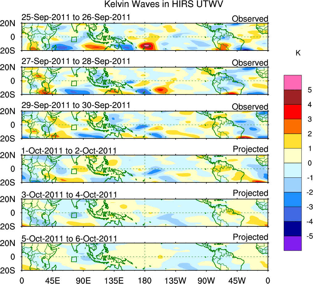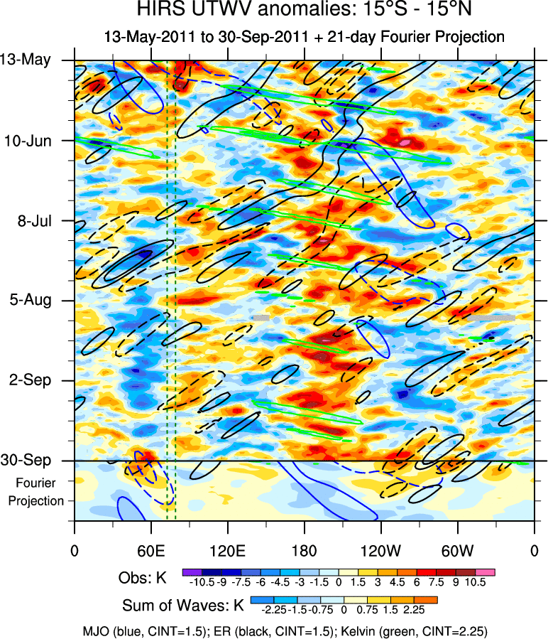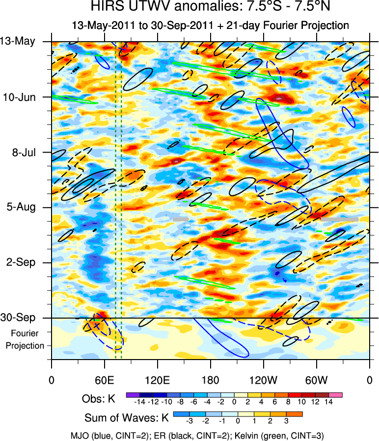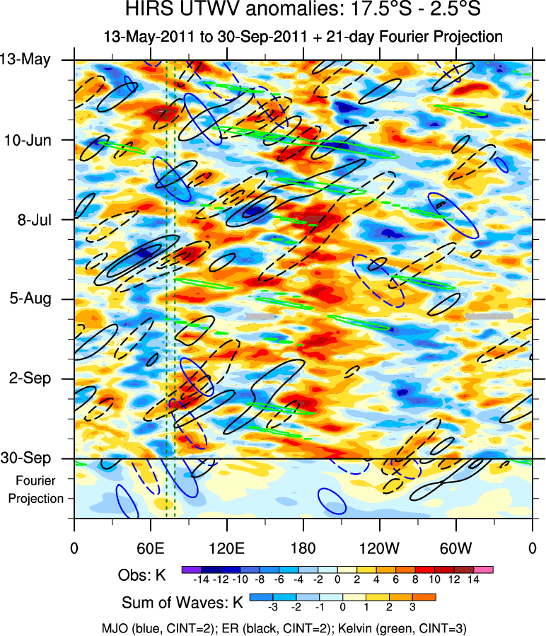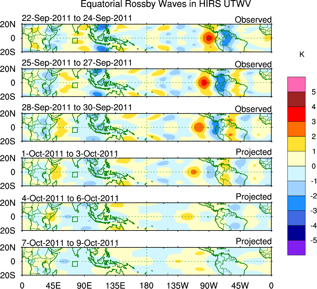 To identify tropical waves in near real-time, the OLR and UTWV data are filtered following Wheeler & Weickmann (2001 MWR). The daily anomalies are calculated using the first 3 harmonics of the seasonal cycle for 1979–2009. Missing values are then filled using linear interpolation in space and time. The most recent 365 days of anomalies are padded with 659 days of zeroes, and the result is filtered for each wave type.