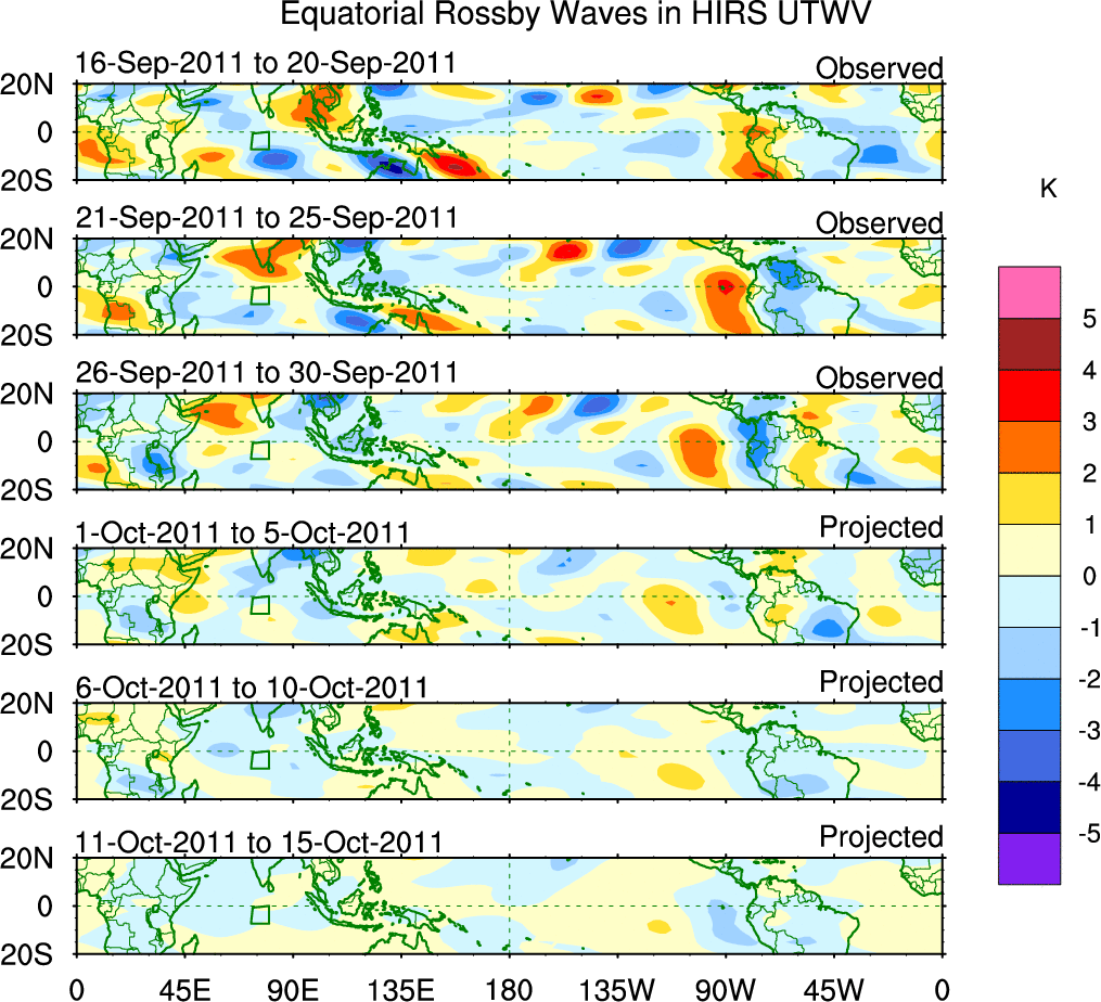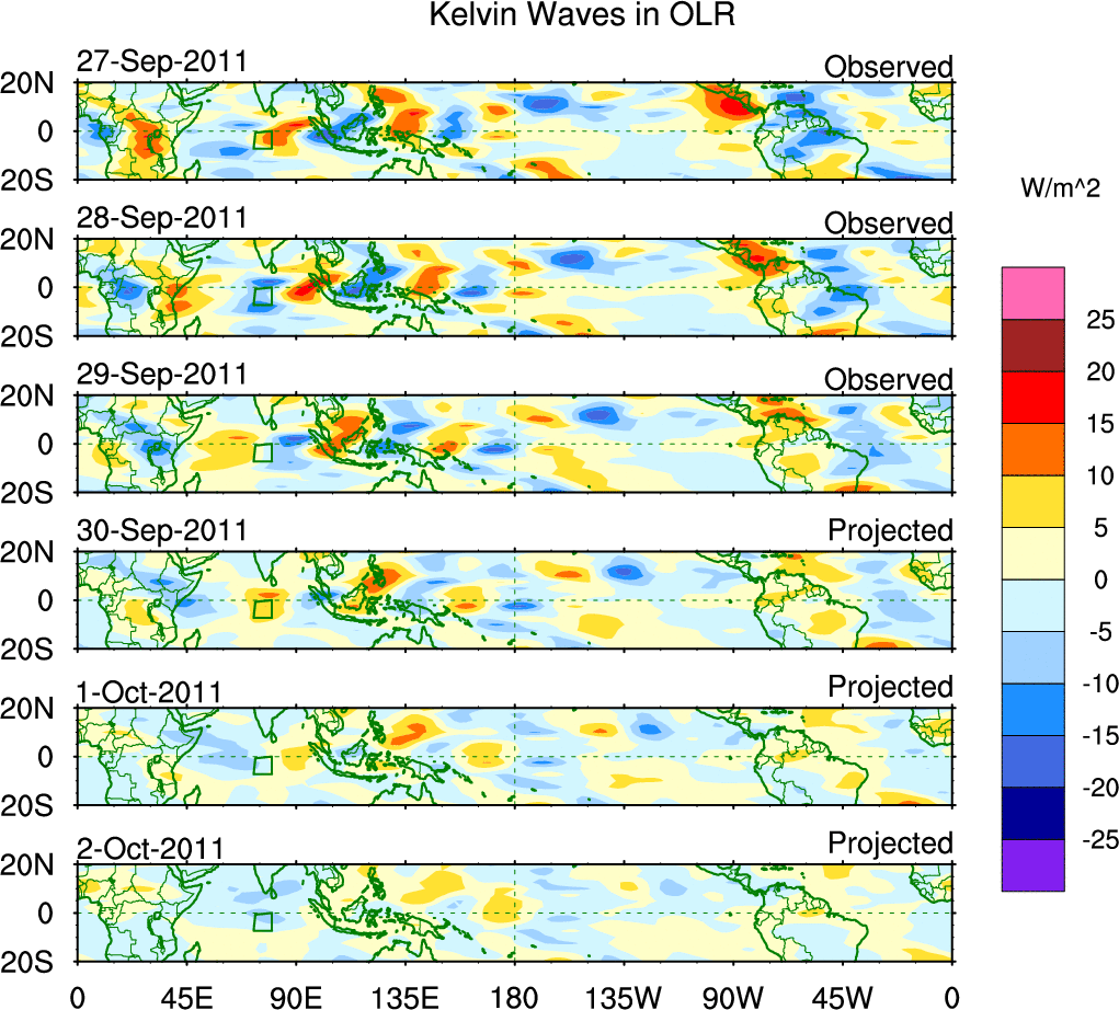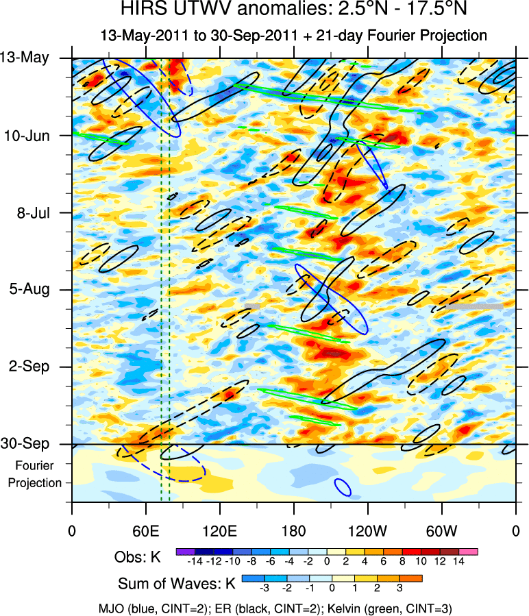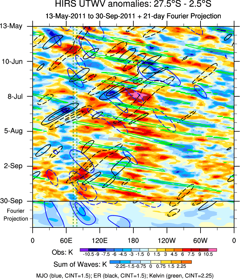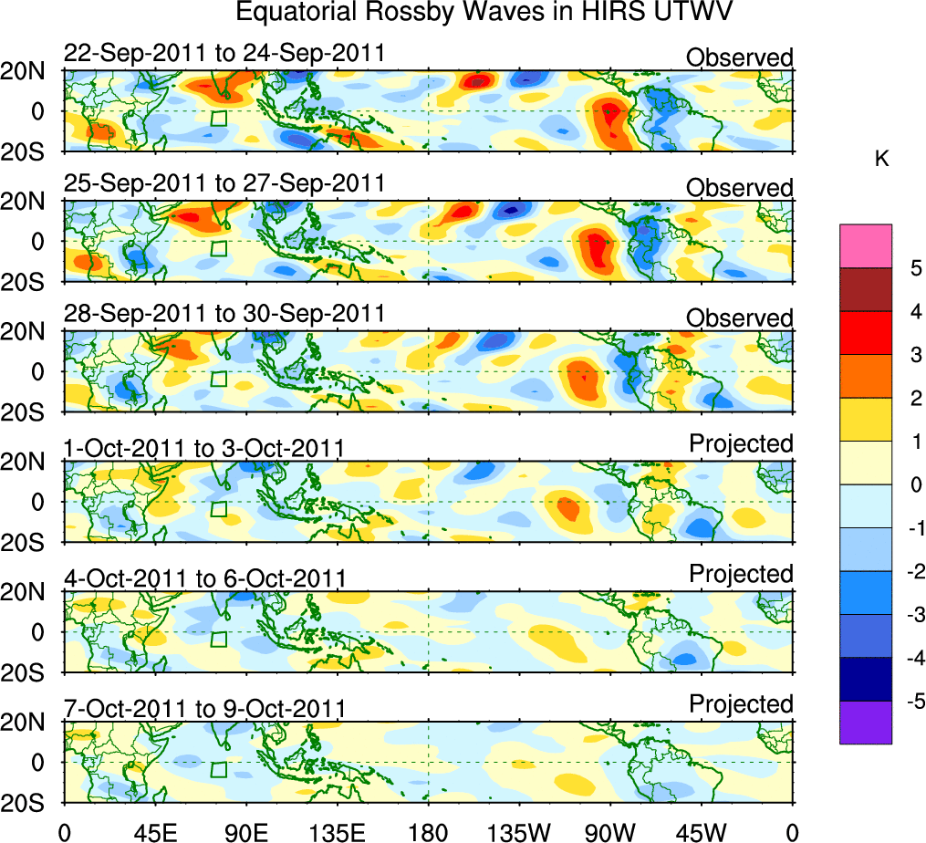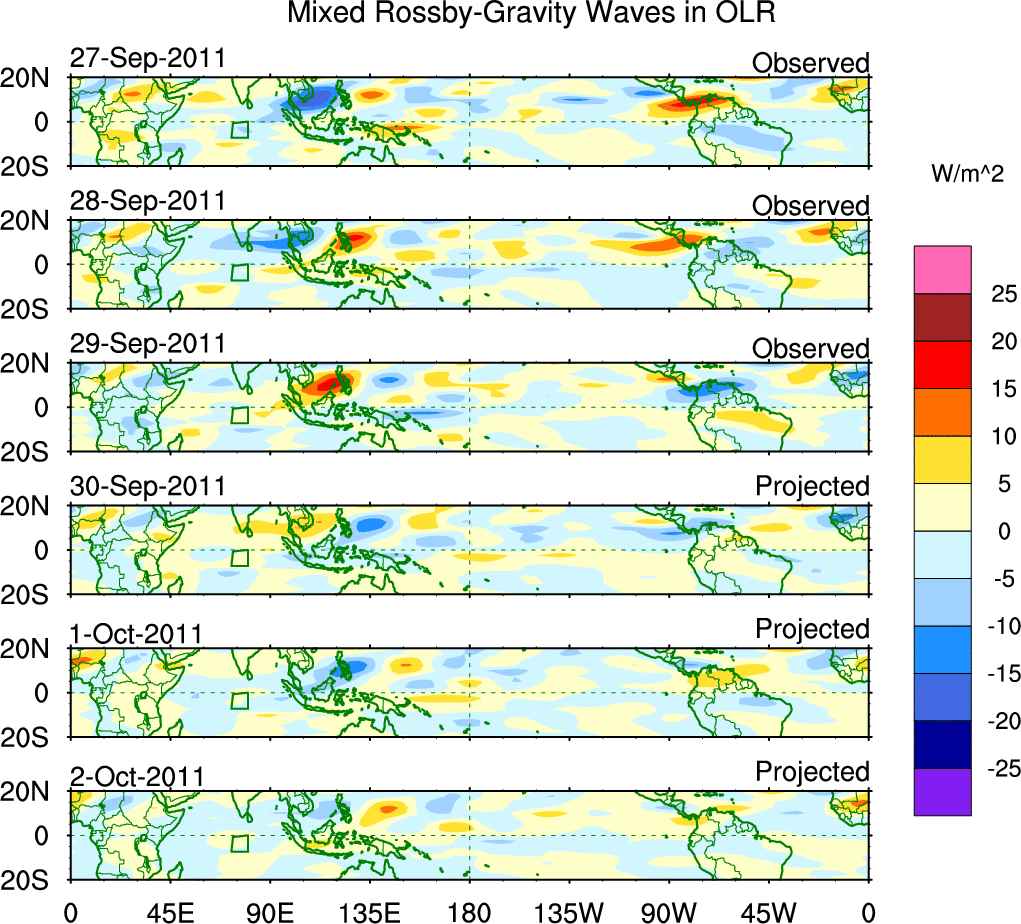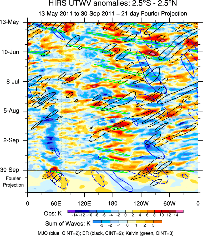 To identify tropical waves in near real-time, the OLR and UTWV data are filtered following Wheeler & Weickmann (2001 MWR). The daily anomalies are calculated using the first 3 harmonics of the seasonal cycle for 1979–2009. Missing values are then filled using linear interpolation in space and time. The most recent 365 days of anomalies are padded with 659 days of zeroes, and the result is filtered for each wave type.