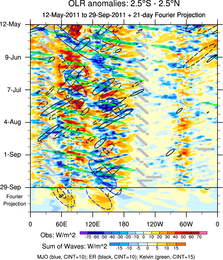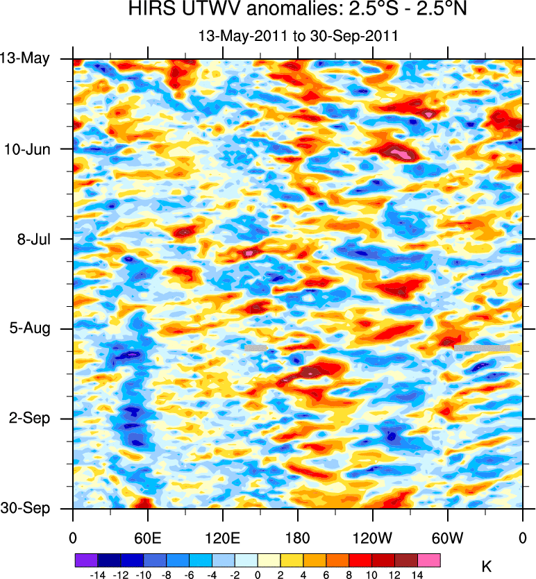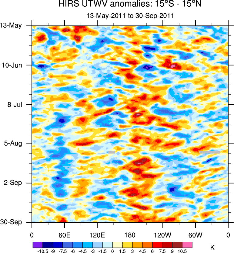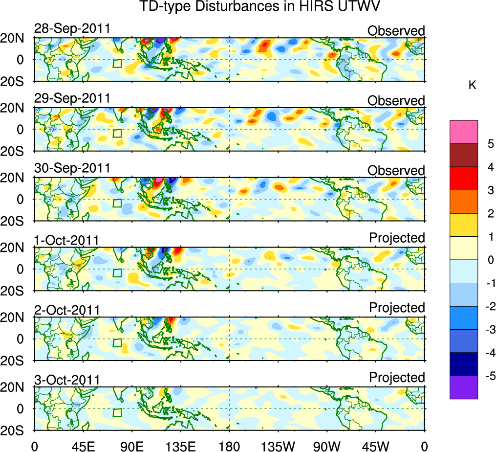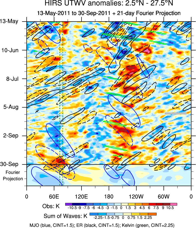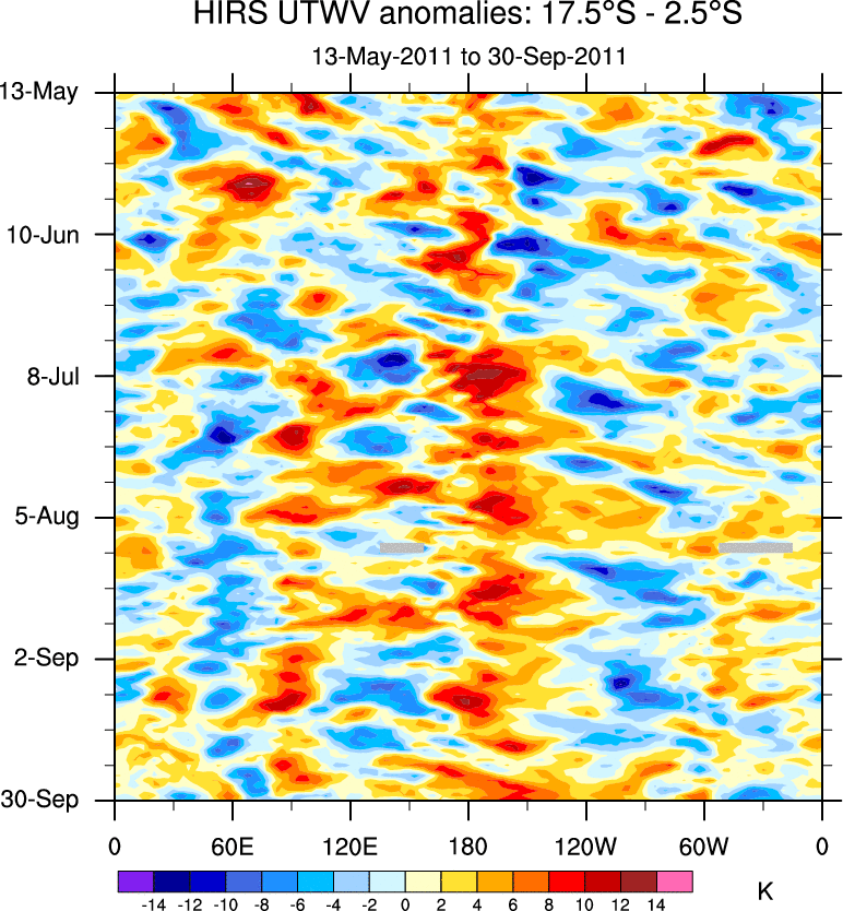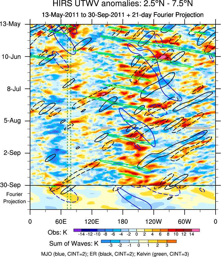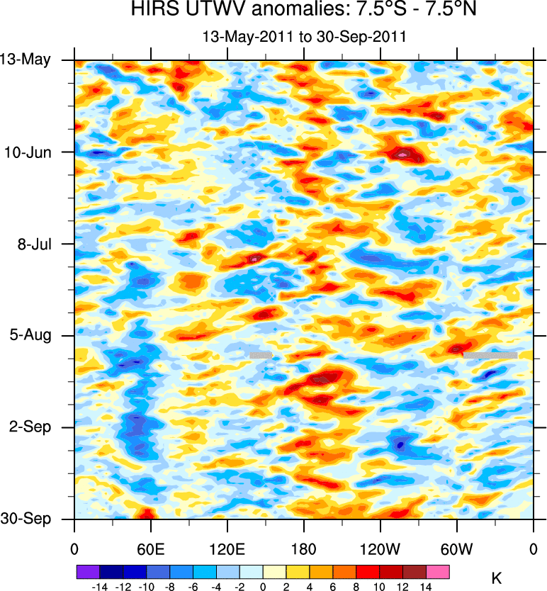 To identify tropical waves in near real-time, the OLR and UTWV data are filtered following Wheeler & Weickmann (2001 MWR). The daily anomalies are calculated using the first 3 harmonics of the seasonal cycle for 1979–2009. Missing values are then filled using linear interpolation in space and time. The most recent 365 days of anomalies are padded with 659 days of zeroes, and the result is filtered for each wave type.