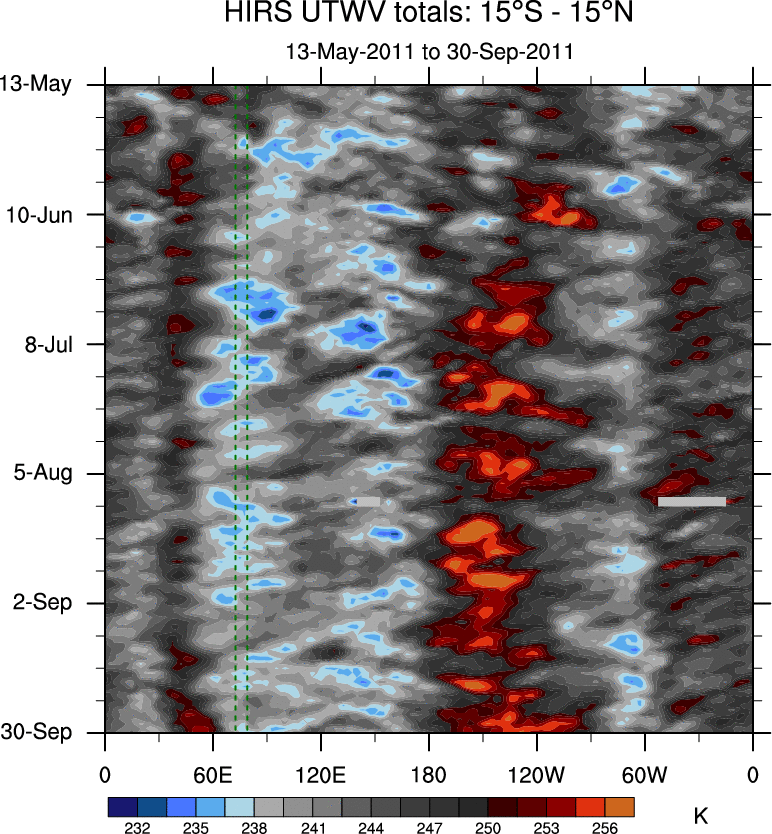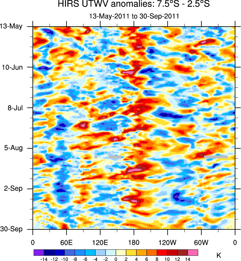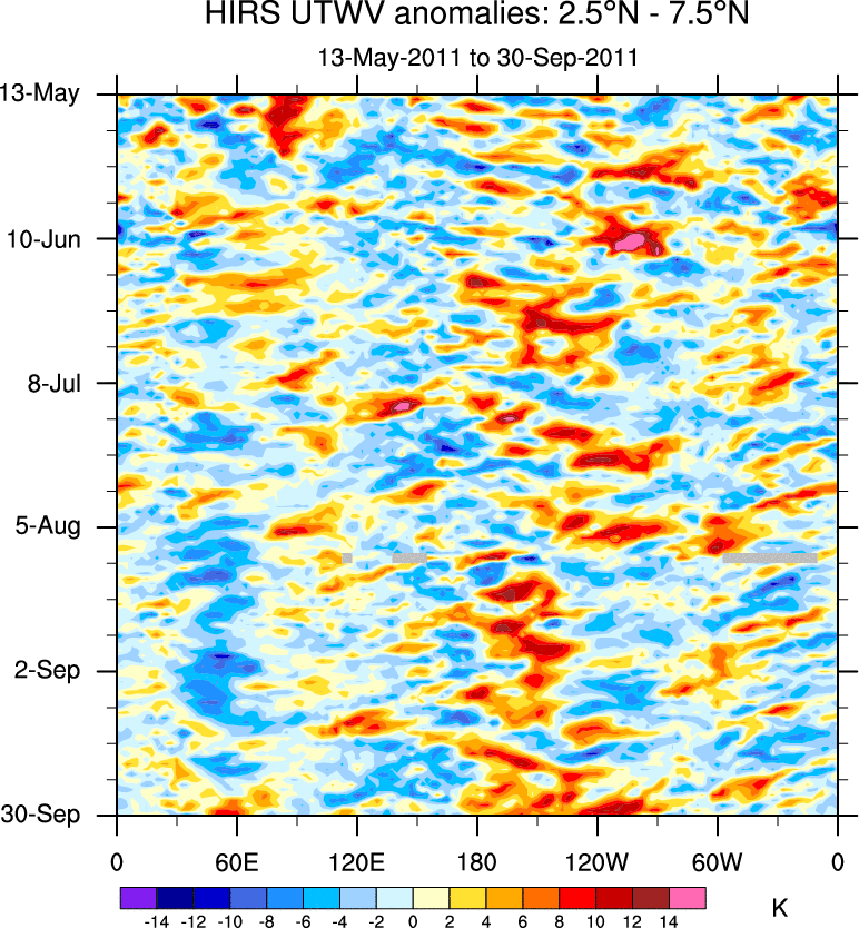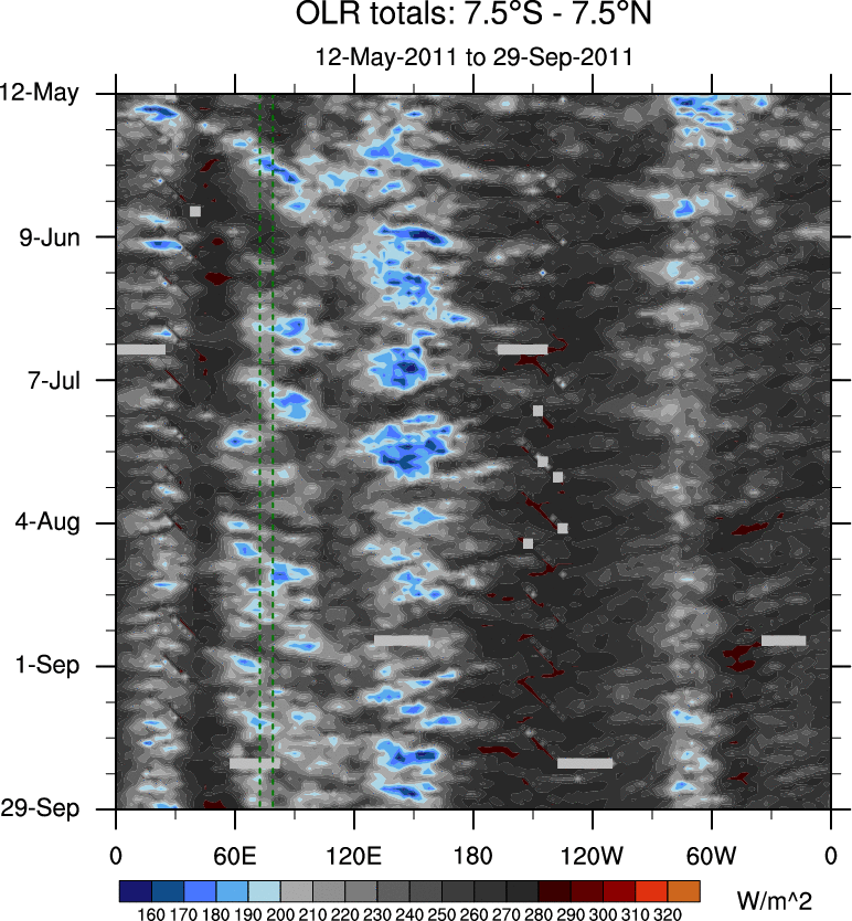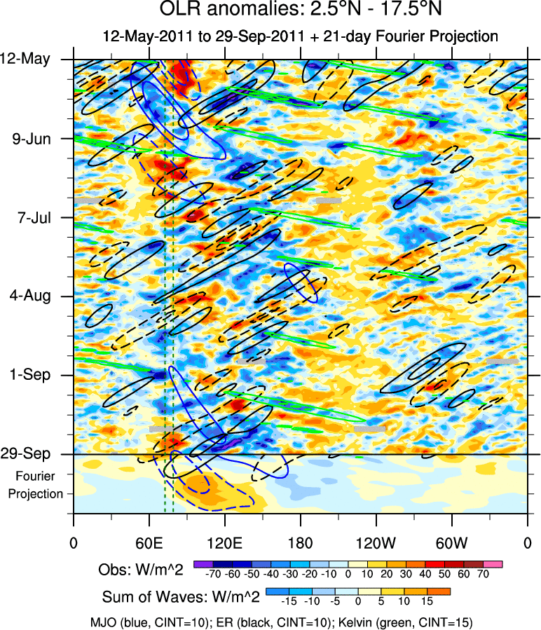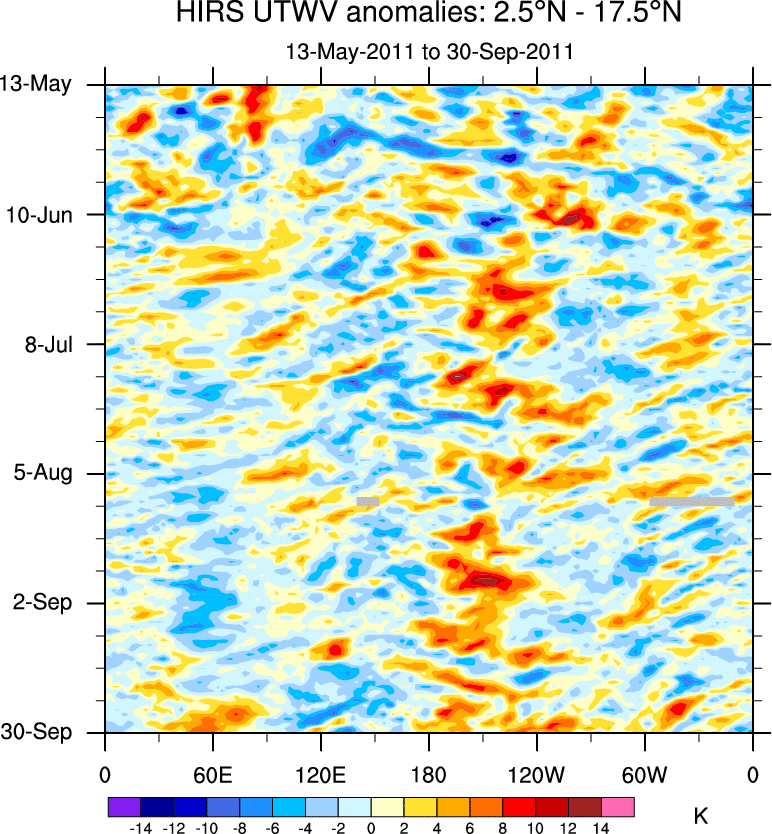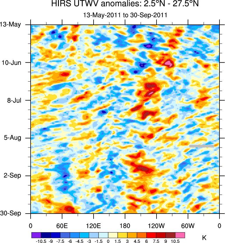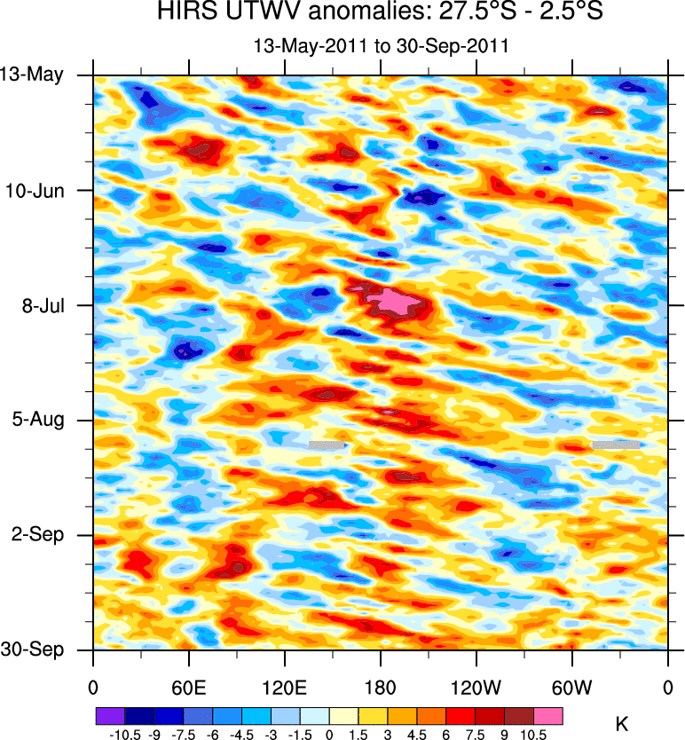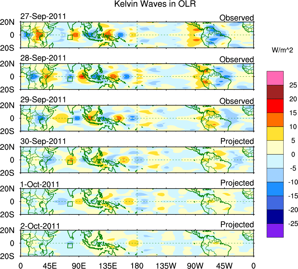 To identify tropical waves in near real-time, the OLR and UTWV data are filtered following Wheeler & Weickmann (2001 MWR). The daily anomalies are calculated using the first 3 harmonics of the seasonal cycle for 1979–2009. Missing values are then filled using linear interpolation in space and time. The most recent 365 days of anomalies are padded with 659 days of zeroes, and the result is filtered for each wave type.