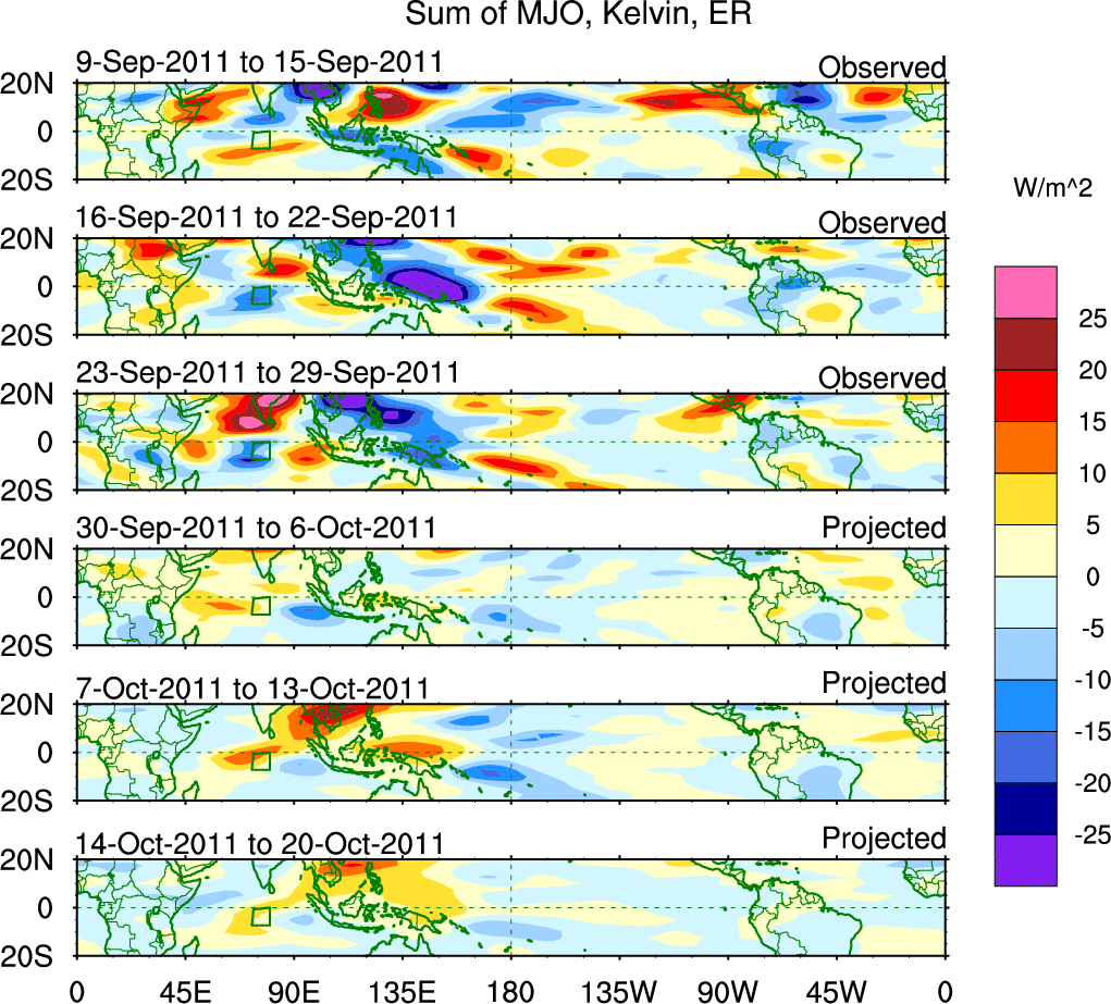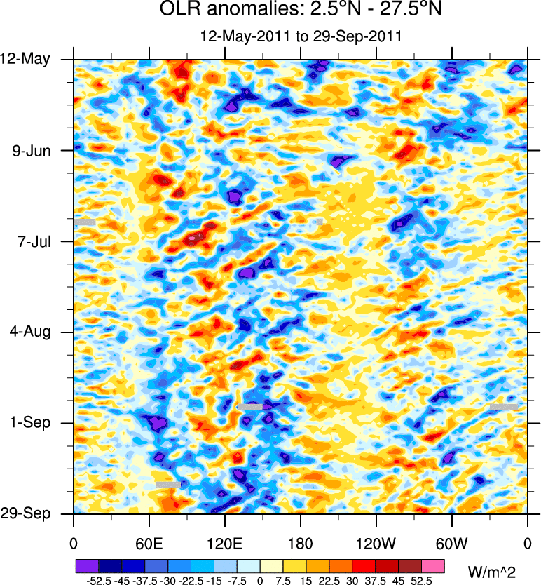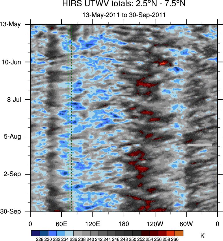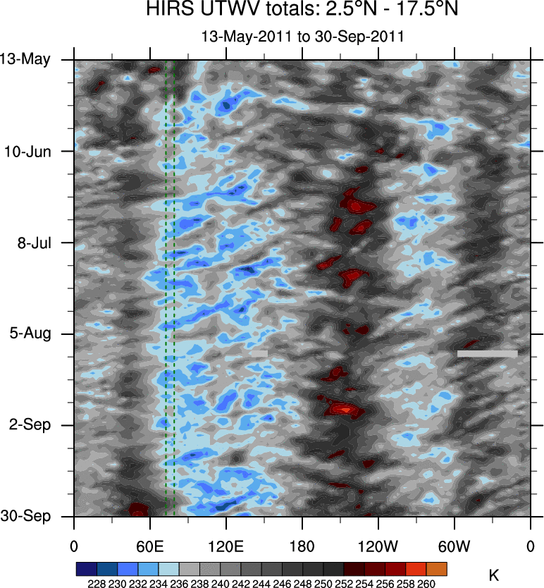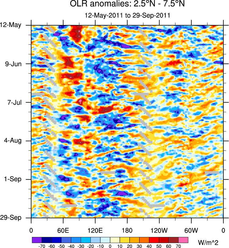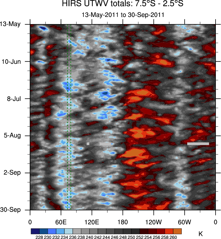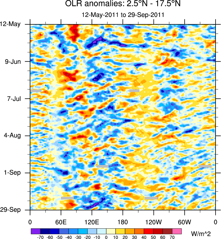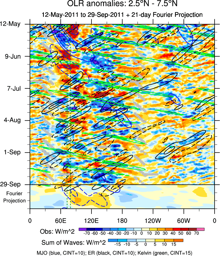 To identify tropical waves in near real-time, the OLR and UTWV data are filtered following Wheeler & Weickmann (2001 MWR). The daily anomalies are calculated using the first 3 harmonics of the seasonal cycle for 1979–2009. Missing values are then filled using linear interpolation in space and time. The most recent 365 days of anomalies are padded with 659 days of zeroes, and the result is filtered for each wave type.