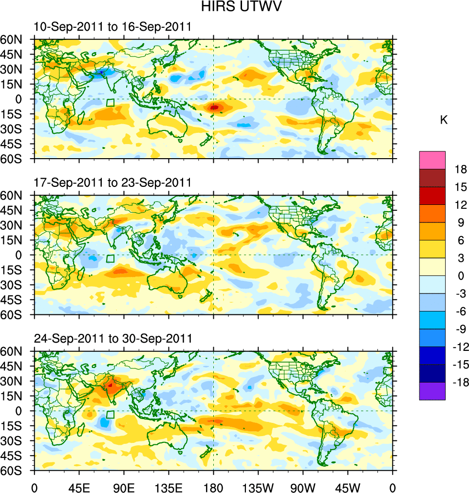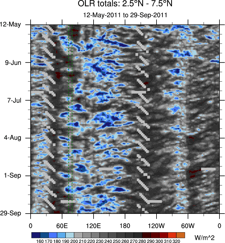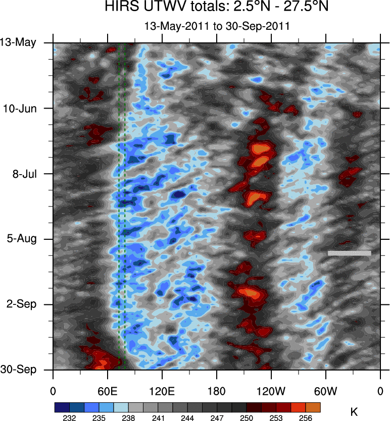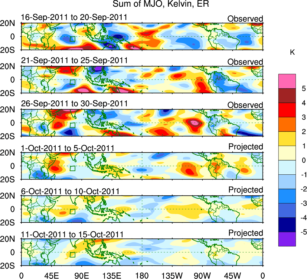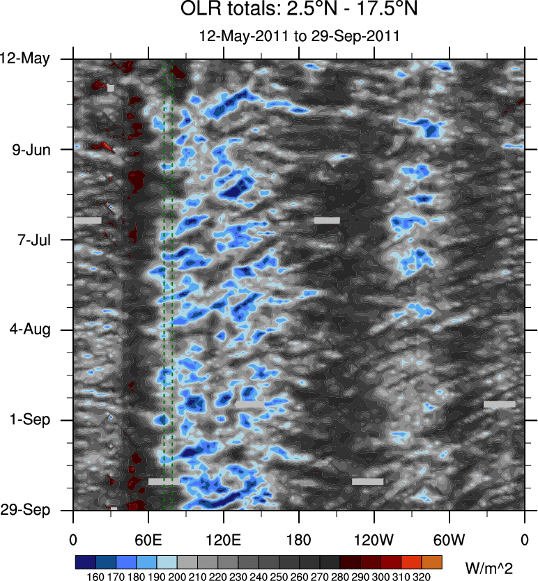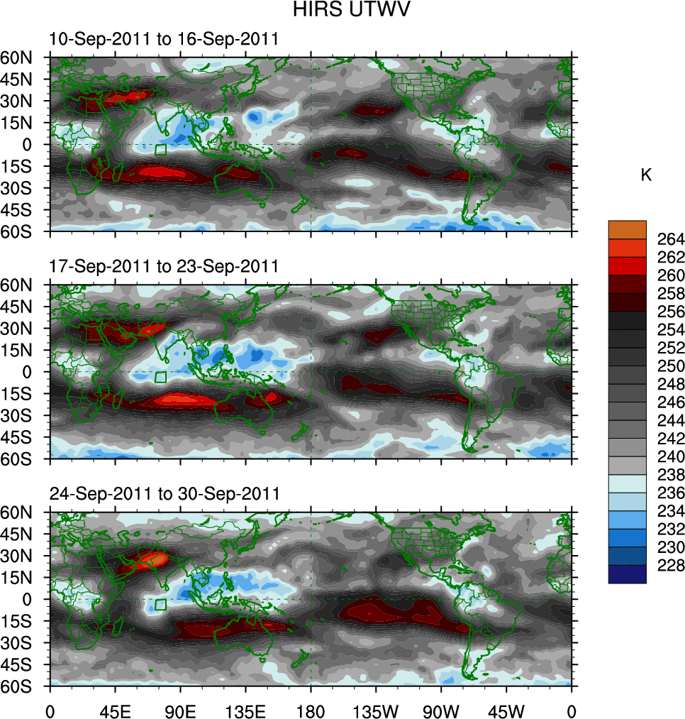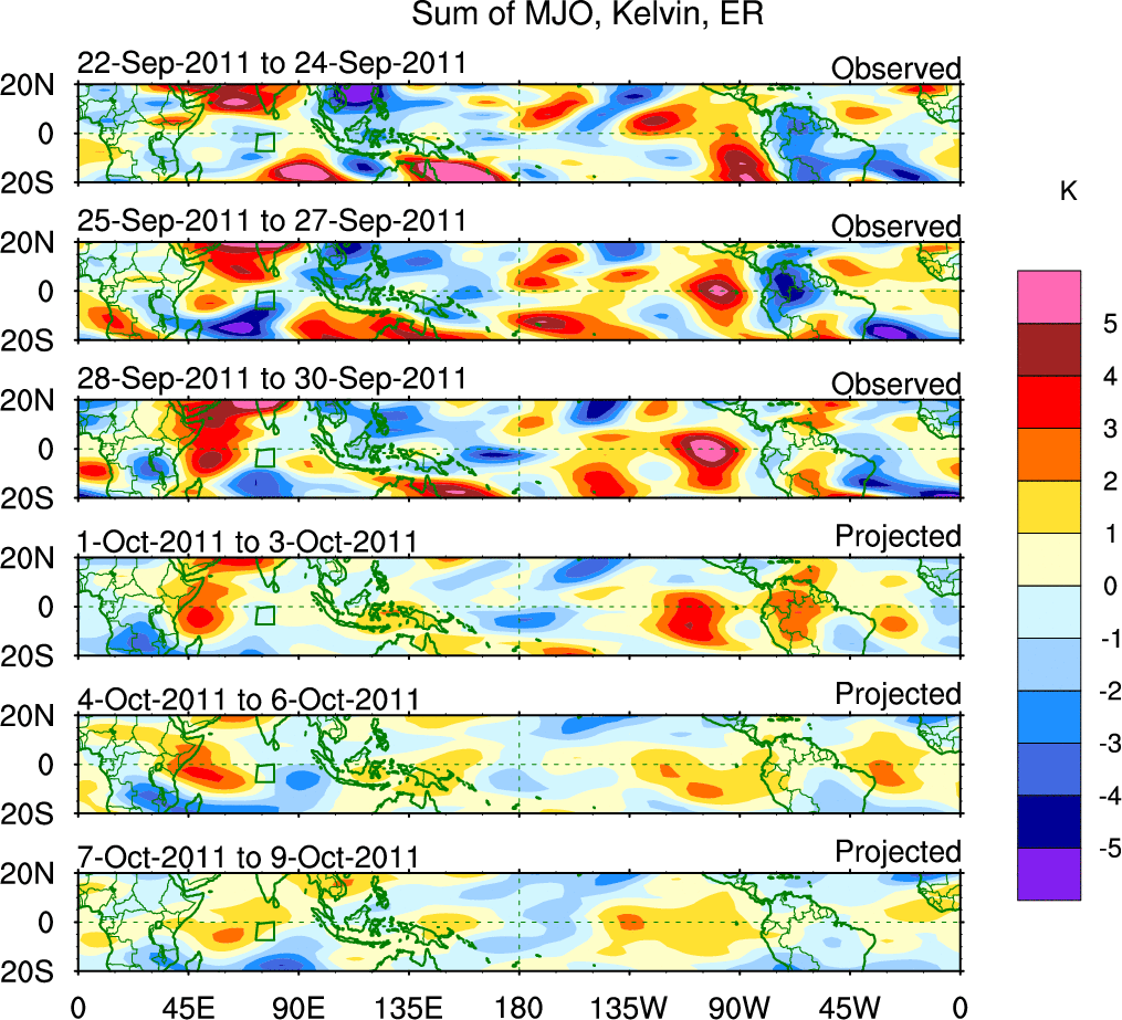 To identify tropical waves in near real-time, the OLR and UTWV data are filtered following Wheeler & Weickmann (2001 MWR). The daily anomalies are calculated using the first 3 harmonics of the seasonal cycle for 1979–2009. Missing values are then filled using linear interpolation in space and time. The most recent 365 days of anomalies are padded with 659 days of zeroes, and the result is filtered for each wave type.