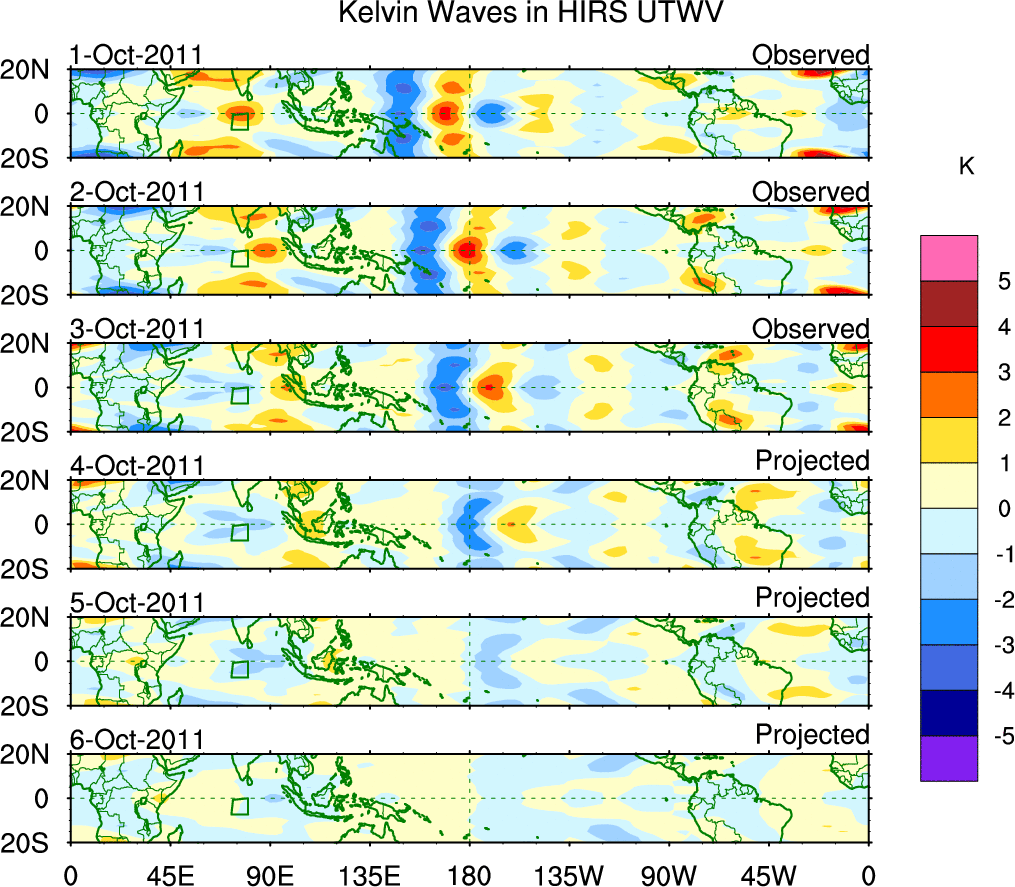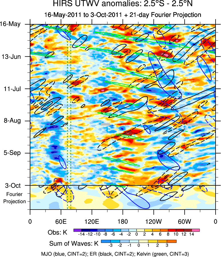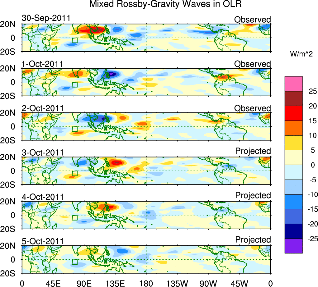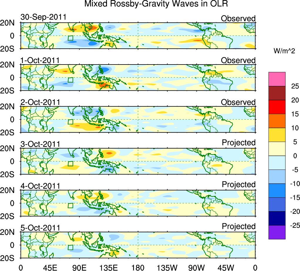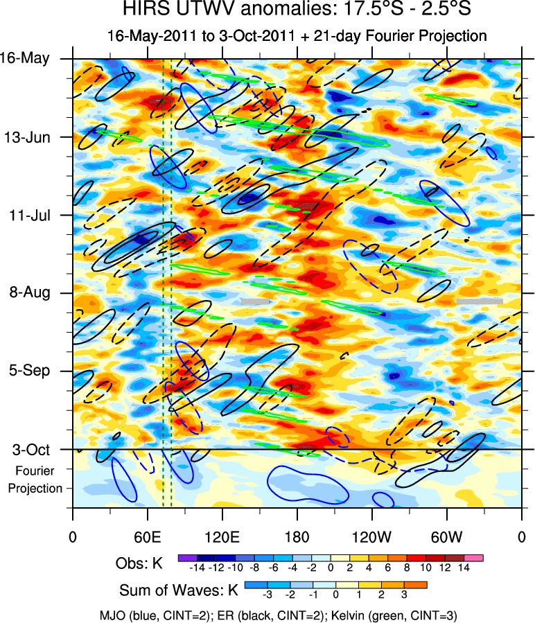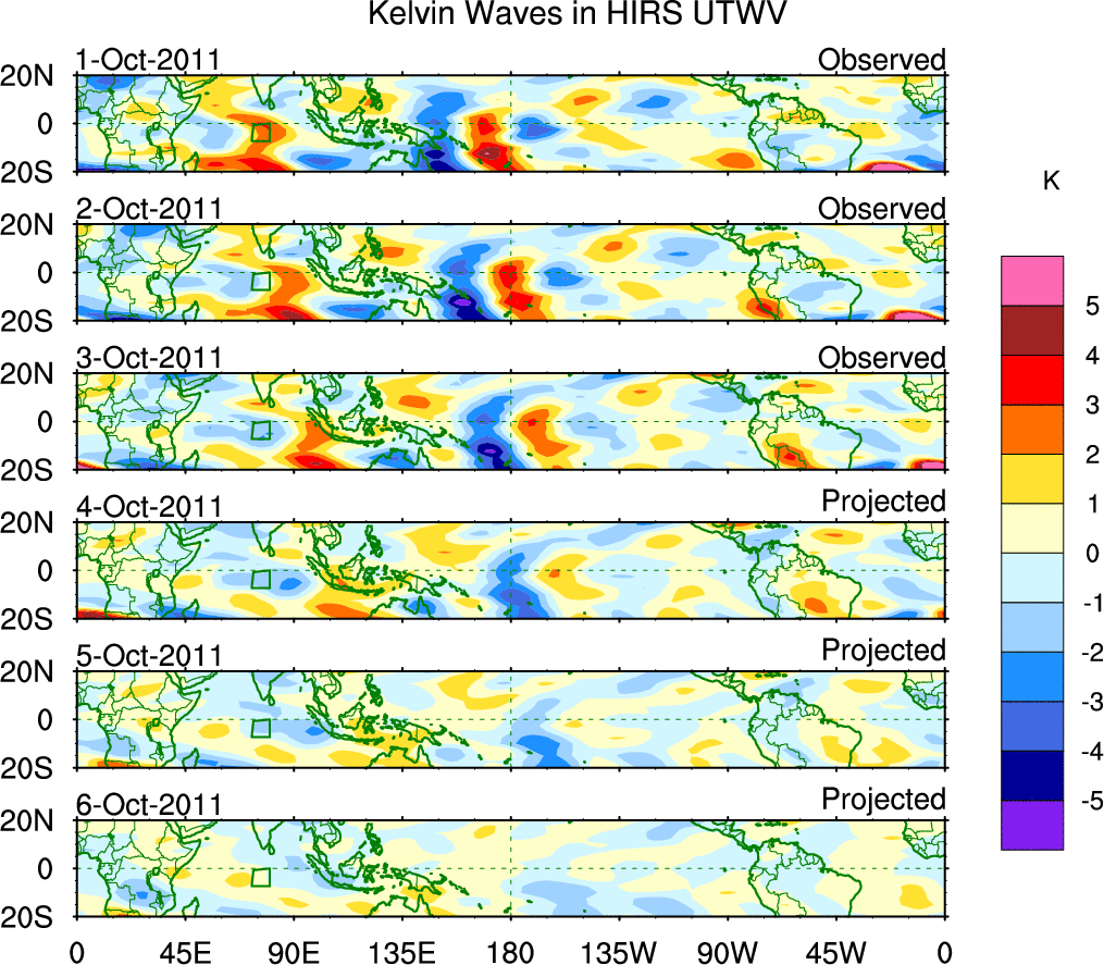 To identify tropical waves in near real-time, the OLR and UTWV data are filtered following Wheeler & Weickmann (2001 MWR). The daily anomalies are calculated using the first 3 harmonics of the seasonal cycle for 1979–2009. Missing values are then filled using linear interpolation in space and time. The most recent 365 days of anomalies are padded with 659 days of zeroes, and the result is filtered for each wave type.