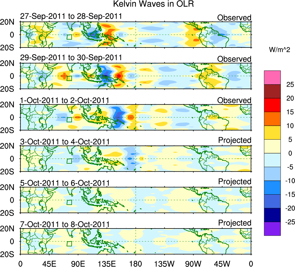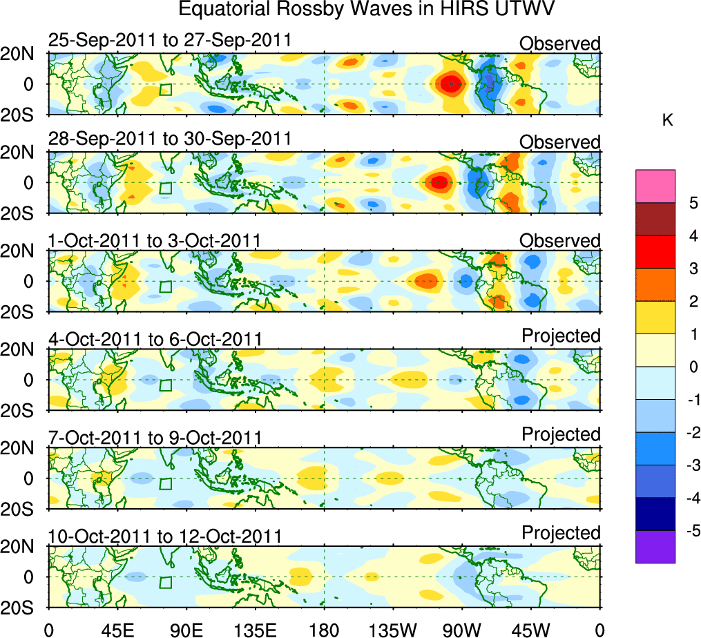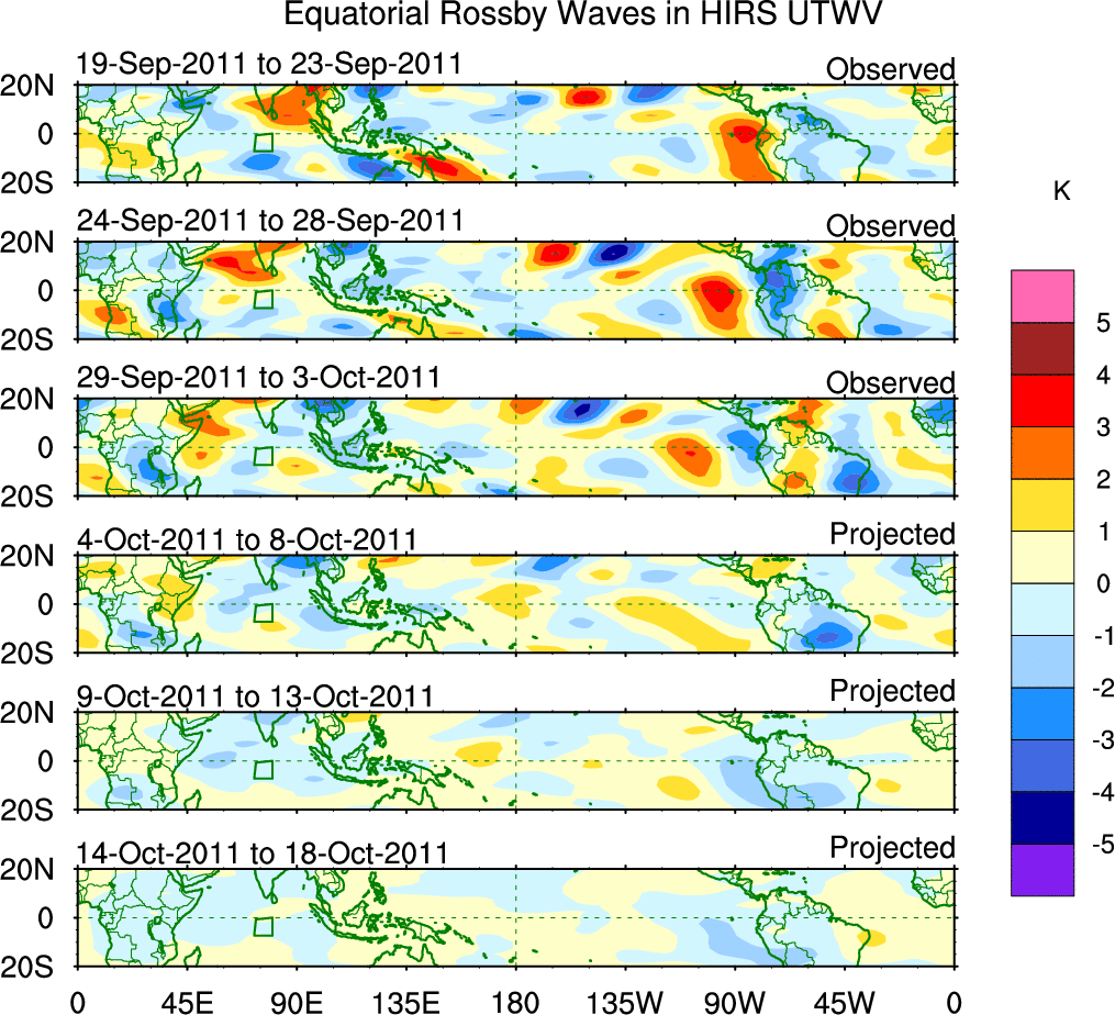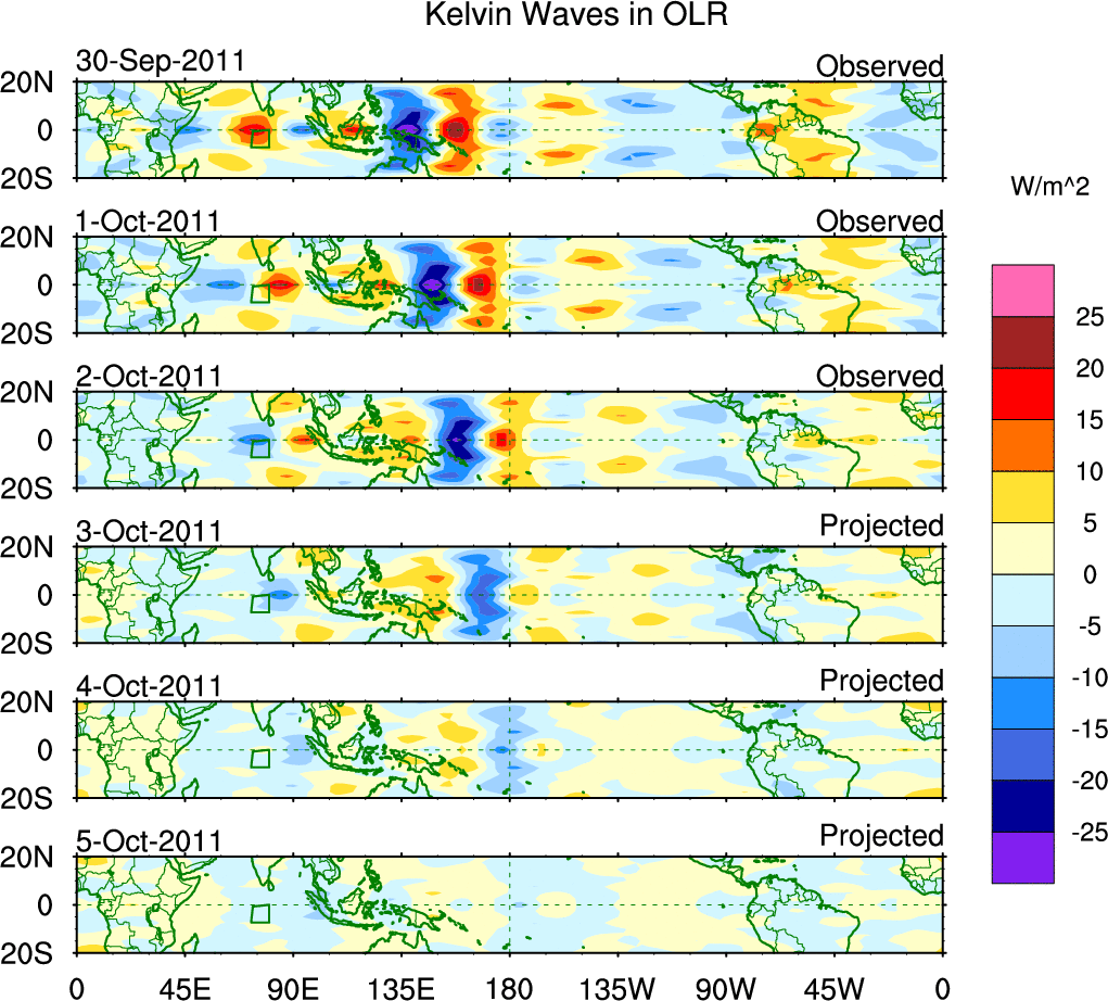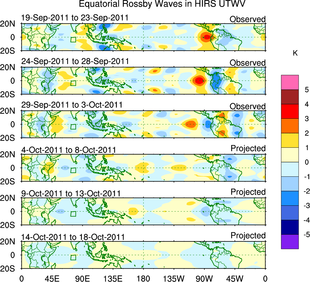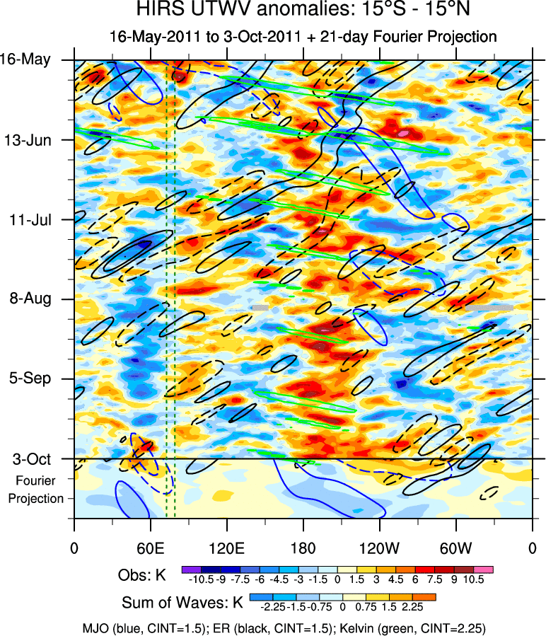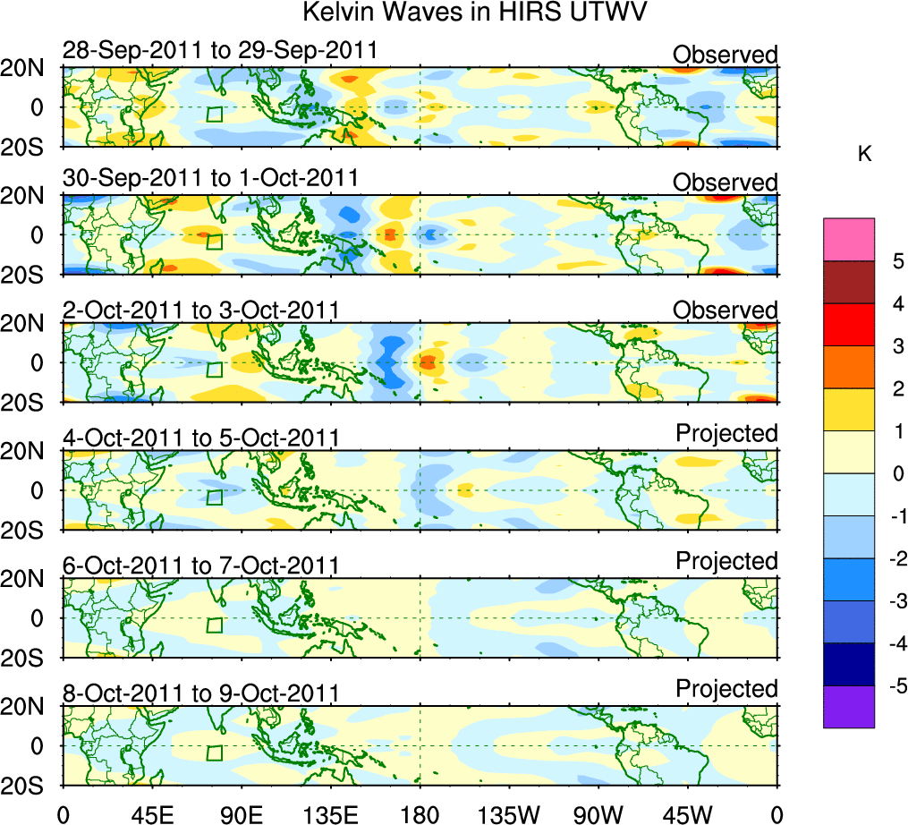To identify tropical waves in near real-time, the OLR and UTWV data are filtered following Wheeler & Weickmann (2001 MWR). The daily anomalies are calculated using the first 3 harmonics of the seasonal cycle for 1979–2009. Missing values are then filled using linear interpolation in space and time. The most recent 365 days of anomalies are padded with 659 days of zeroes, and the result is filtered for each wave type.