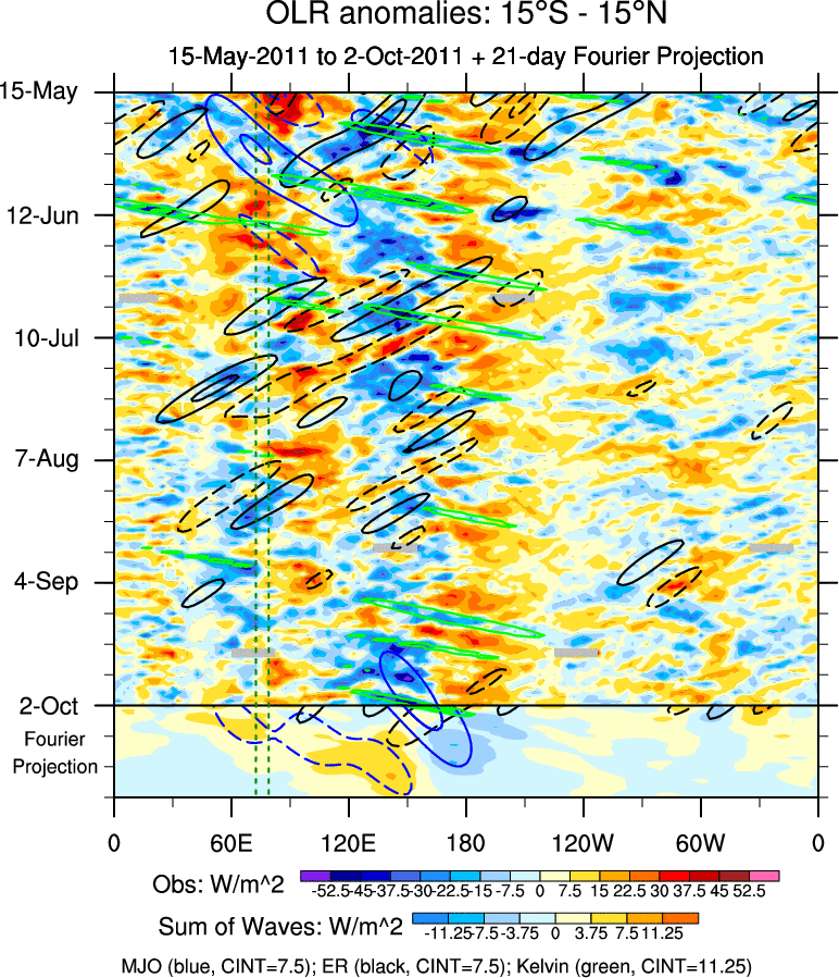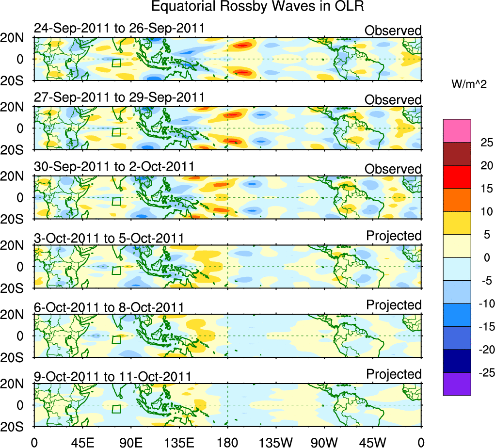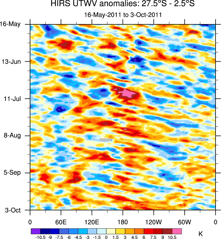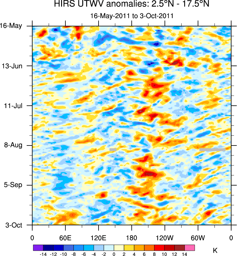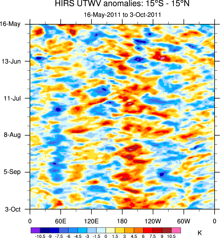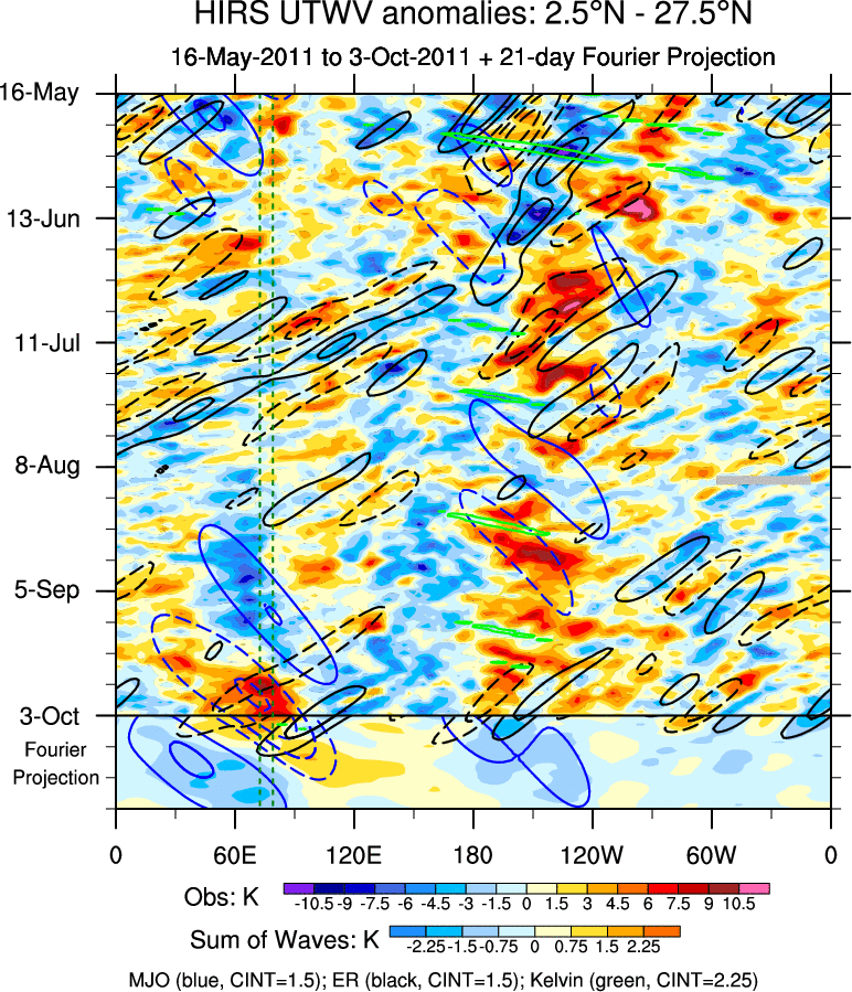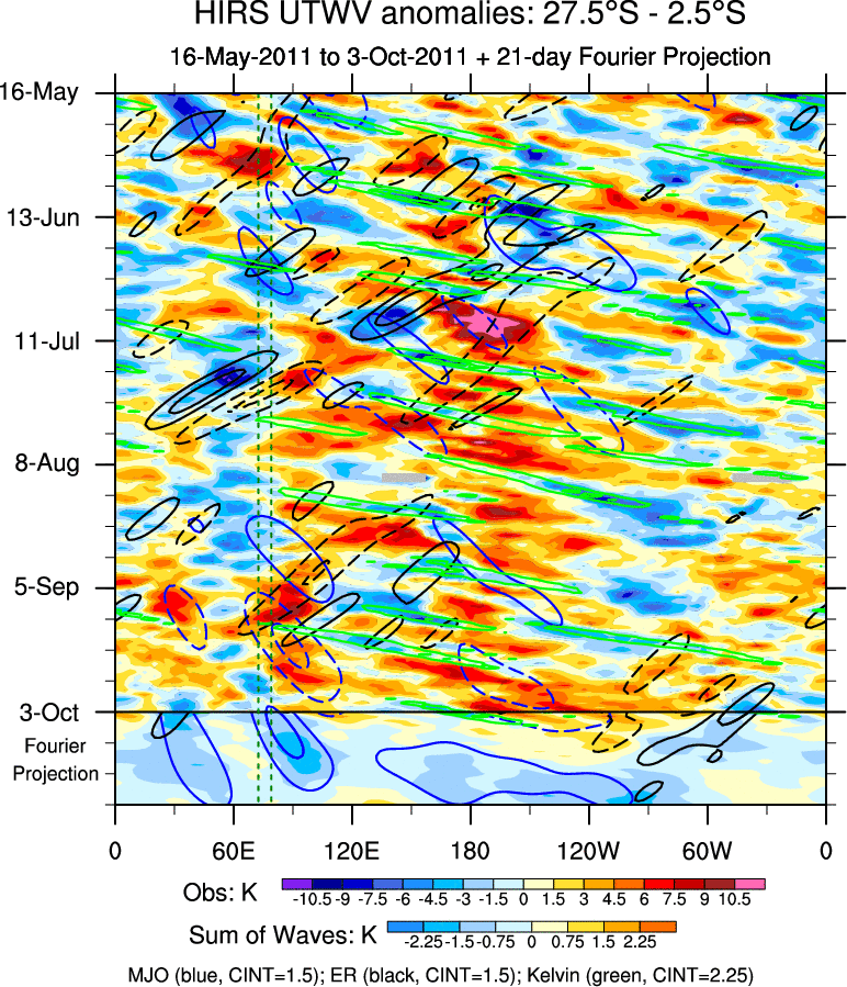 To identify tropical waves in near real-time, the OLR and UTWV data are filtered following Wheeler & Weickmann (2001 MWR). The daily anomalies are calculated using the first 3 harmonics of the seasonal cycle for 1979–2009. Missing values are then filled using linear interpolation in space and time. The most recent 365 days of anomalies are padded with 659 days of zeroes, and the result is filtered for each wave type.