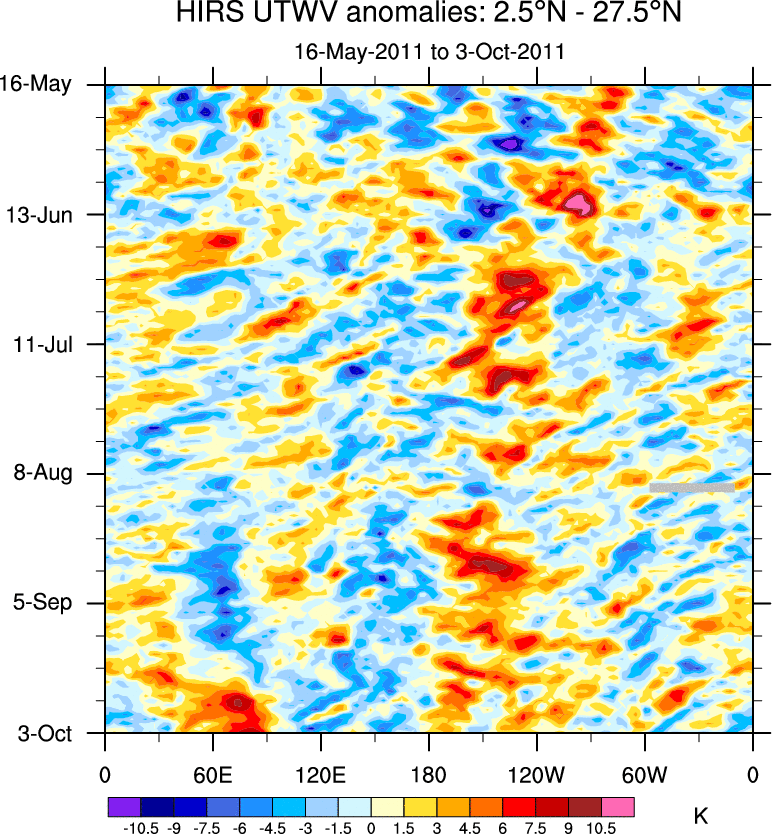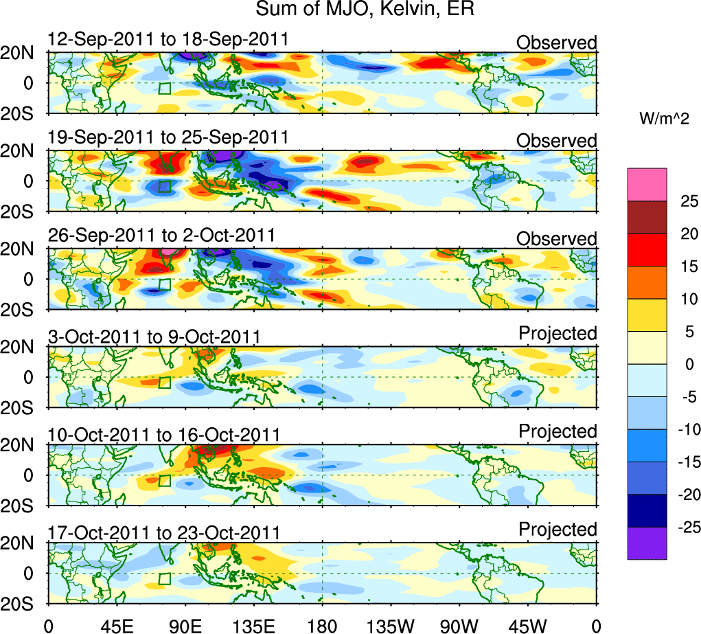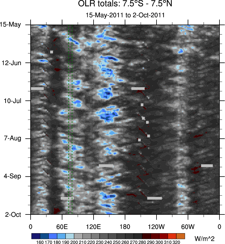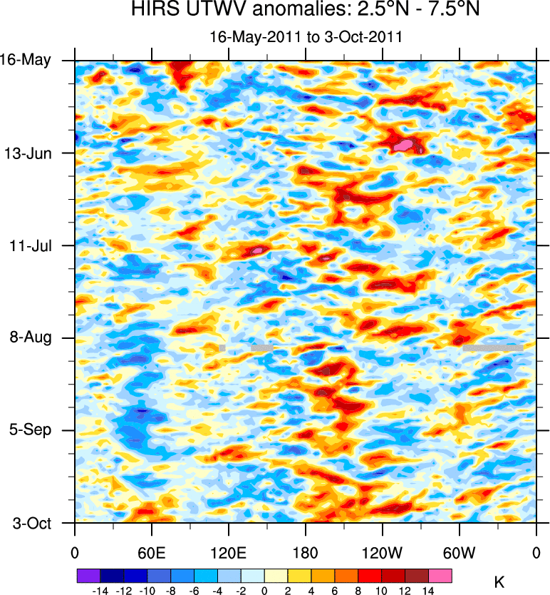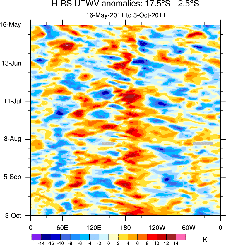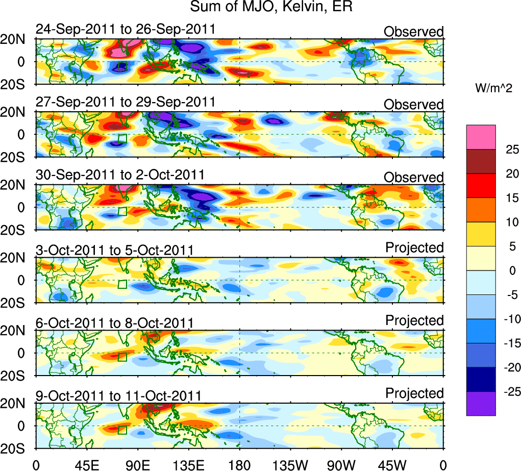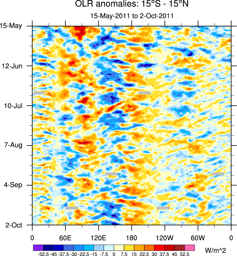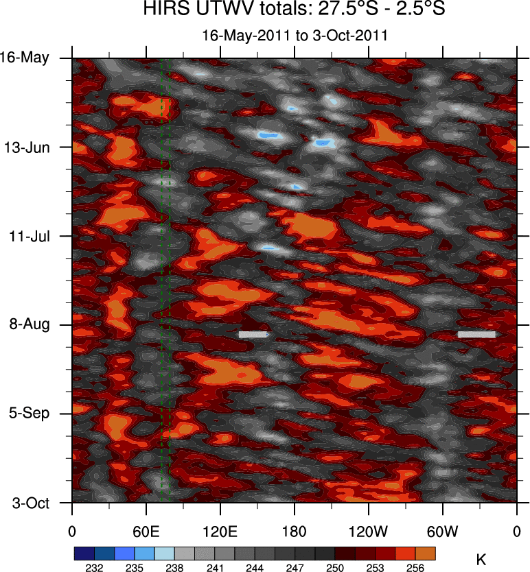 To identify tropical waves in near real-time, the OLR and UTWV data are filtered following Wheeler & Weickmann (2001 MWR). The daily anomalies are calculated using the first 3 harmonics of the seasonal cycle for 1979–2009. Missing values are then filled using linear interpolation in space and time. The most recent 365 days of anomalies are padded with 659 days of zeroes, and the result is filtered for each wave type.