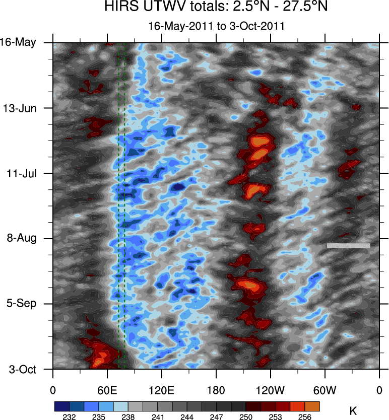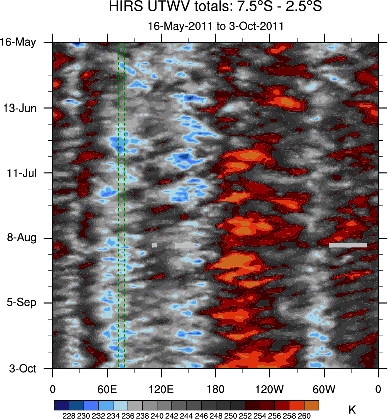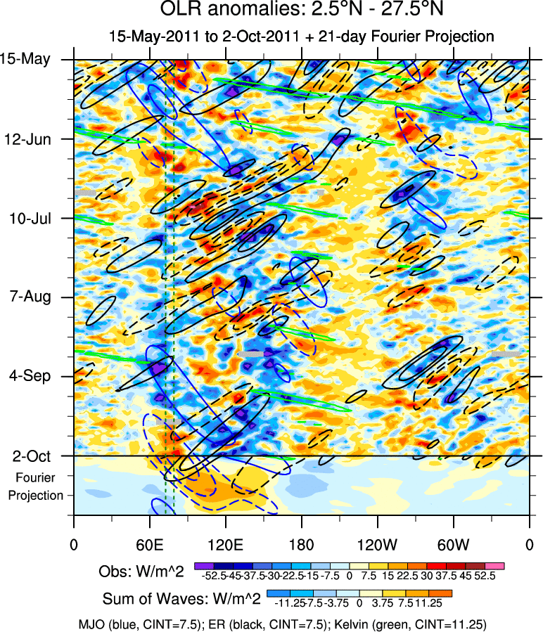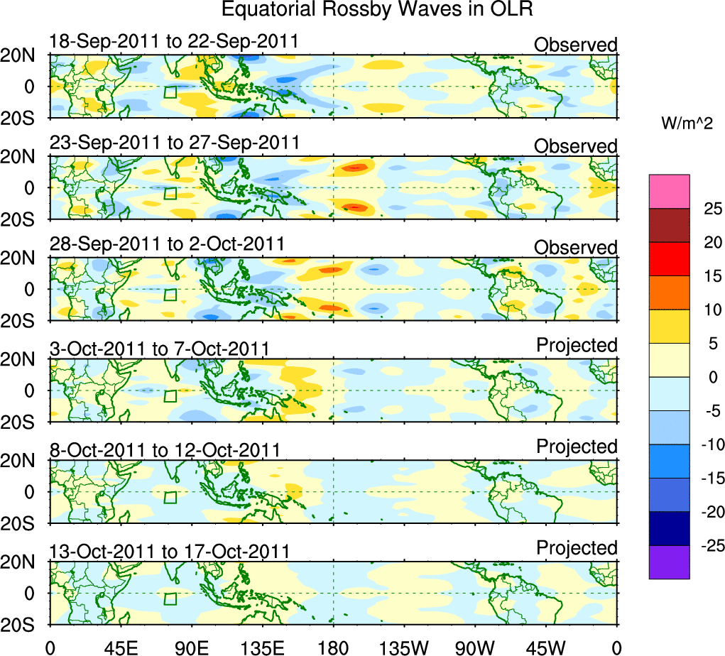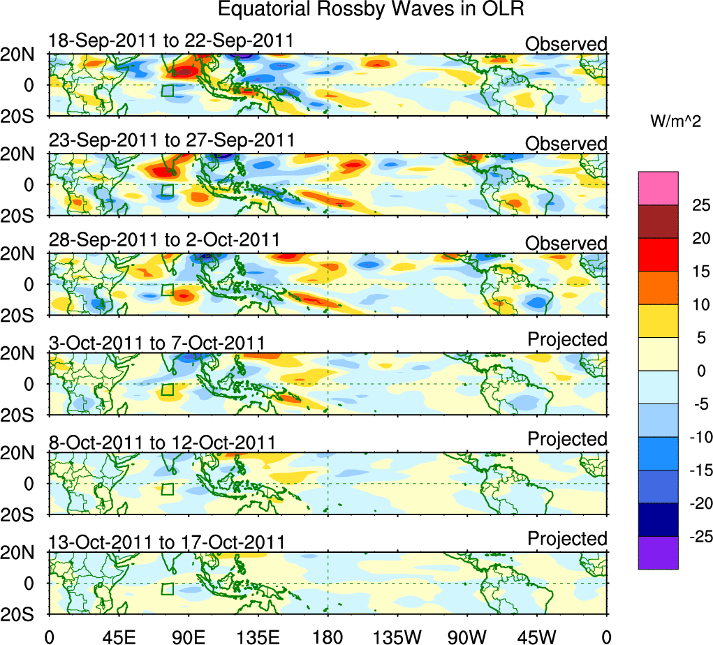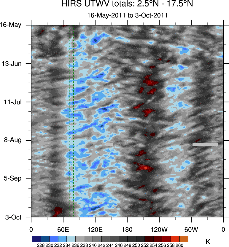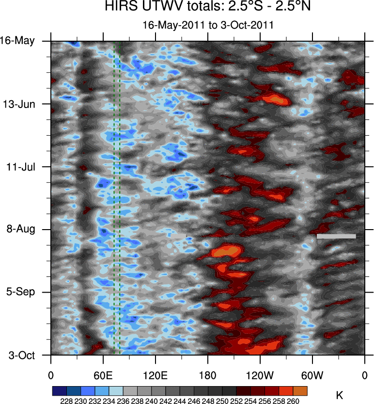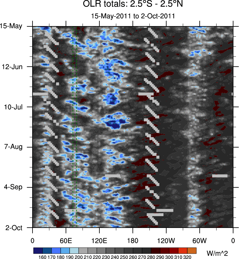 To identify tropical waves in near real-time, the OLR and UTWV data are filtered following Wheeler & Weickmann (2001 MWR). The daily anomalies are calculated using the first 3 harmonics of the seasonal cycle for 1979–2009. Missing values are then filled using linear interpolation in space and time. The most recent 365 days of anomalies are padded with 659 days of zeroes, and the result is filtered for each wave type.