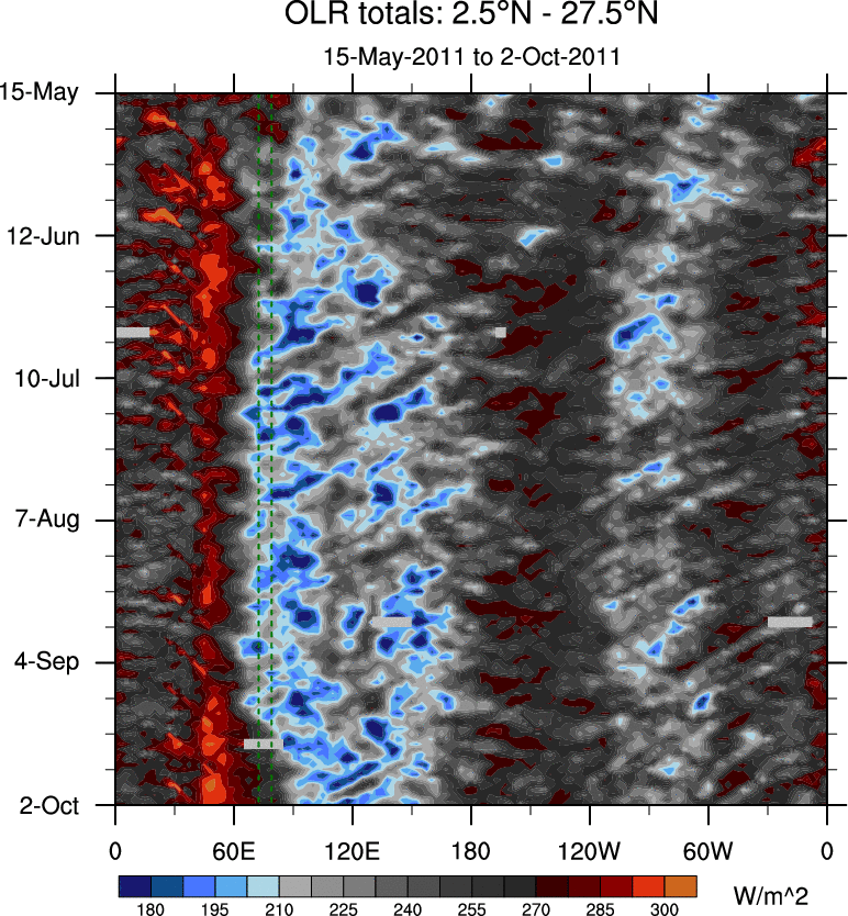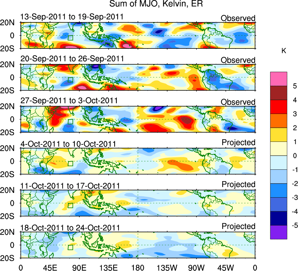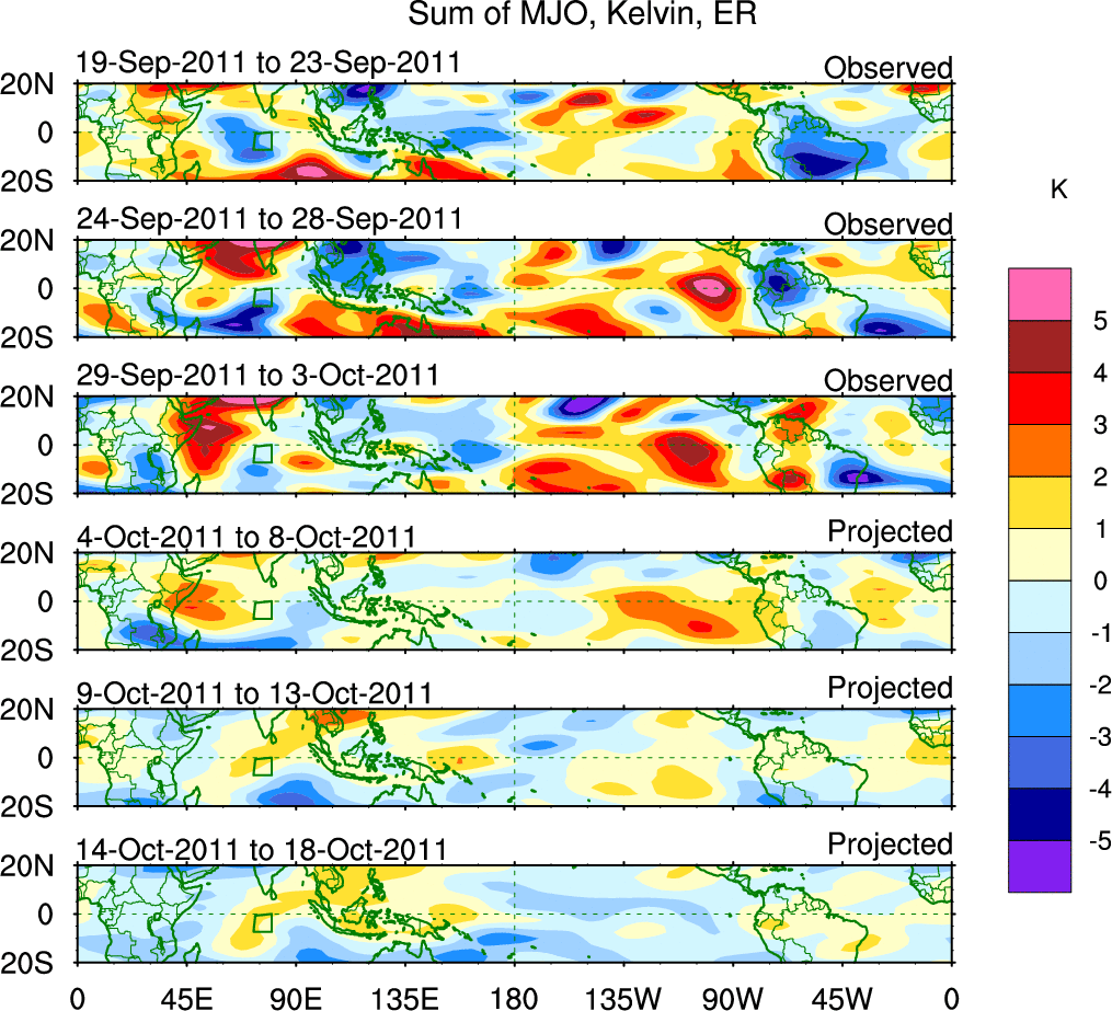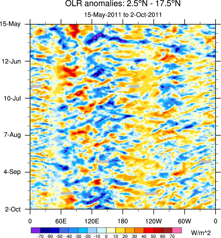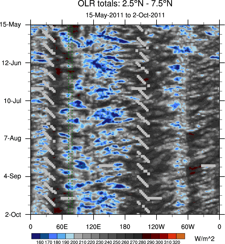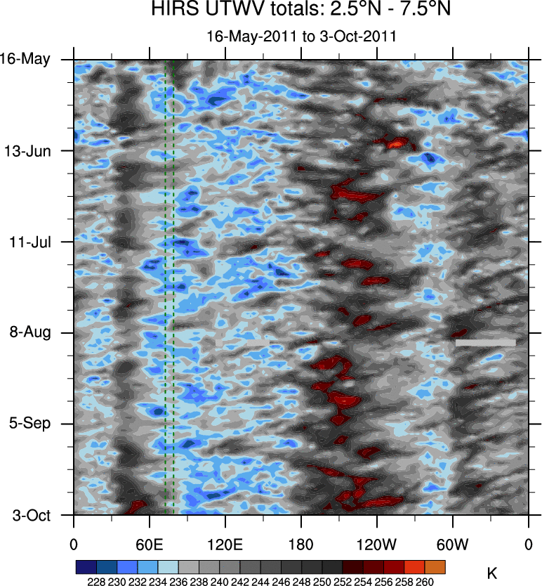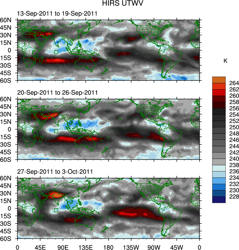 To identify tropical waves in near real-time, the OLR and UTWV data are filtered following Wheeler & Weickmann (2001 MWR). The daily anomalies are calculated using the first 3 harmonics of the seasonal cycle for 1979–2009. Missing values are then filled using linear interpolation in space and time. The most recent 365 days of anomalies are padded with 659 days of zeroes, and the result is filtered for each wave type.