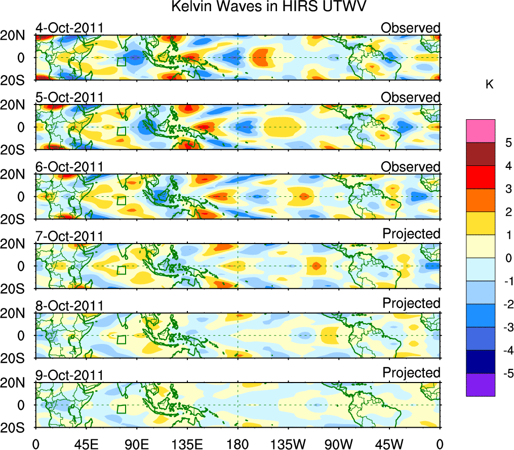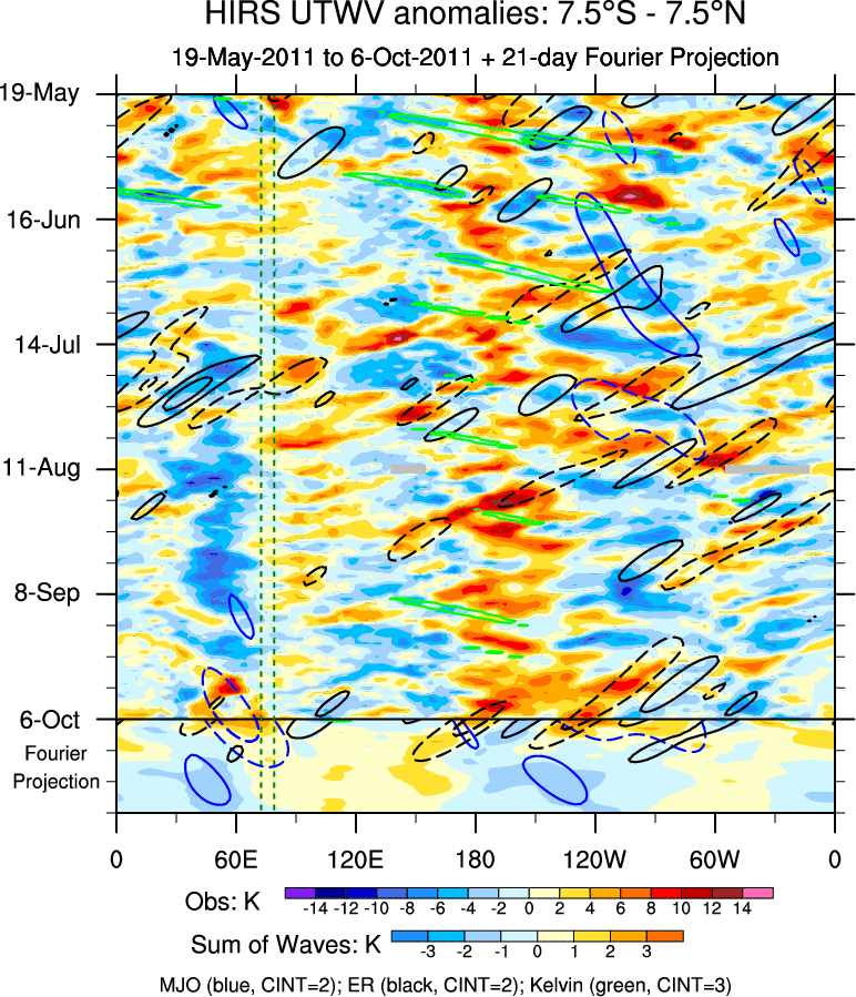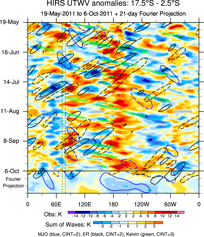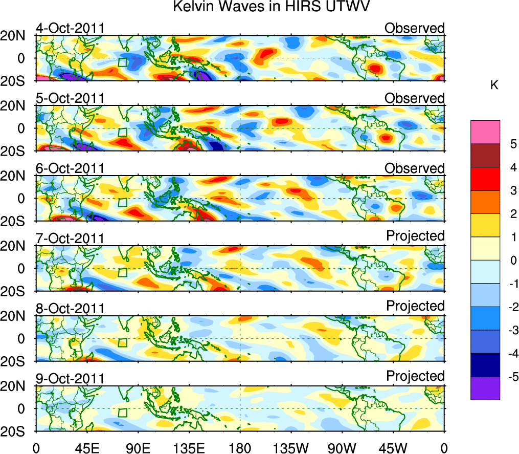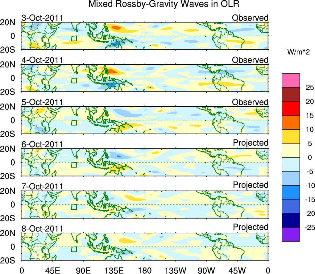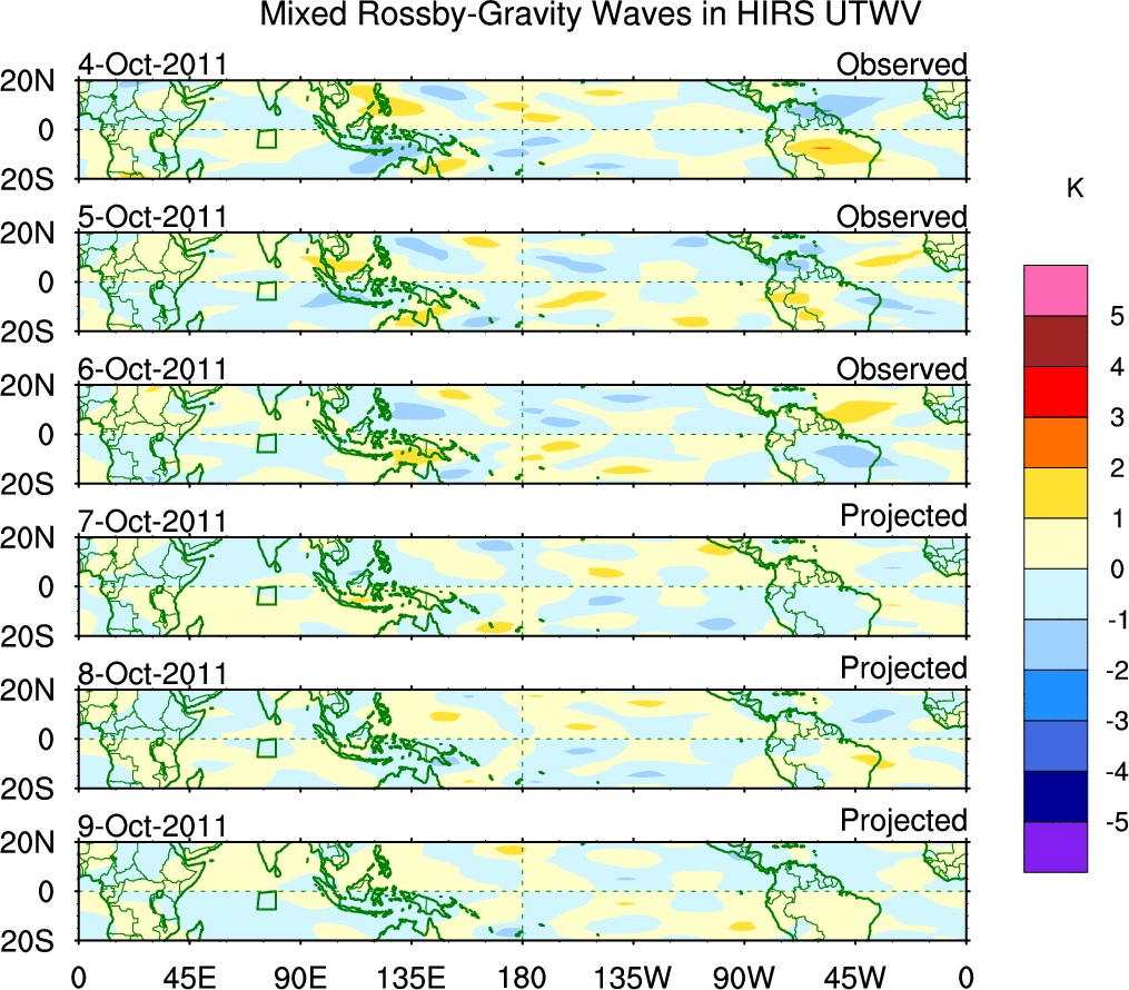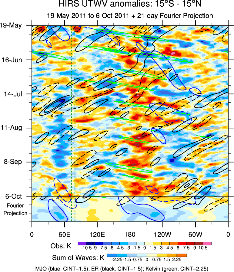 To identify tropical waves in near real-time, the OLR and UTWV data are filtered following Wheeler & Weickmann (2001 MWR). The daily anomalies are calculated using the first 3 harmonics of the seasonal cycle for 1979–2009. Missing values are then filled using linear interpolation in space and time. The most recent 365 days of anomalies are padded with 659 days of zeroes, and the result is filtered for each wave type.