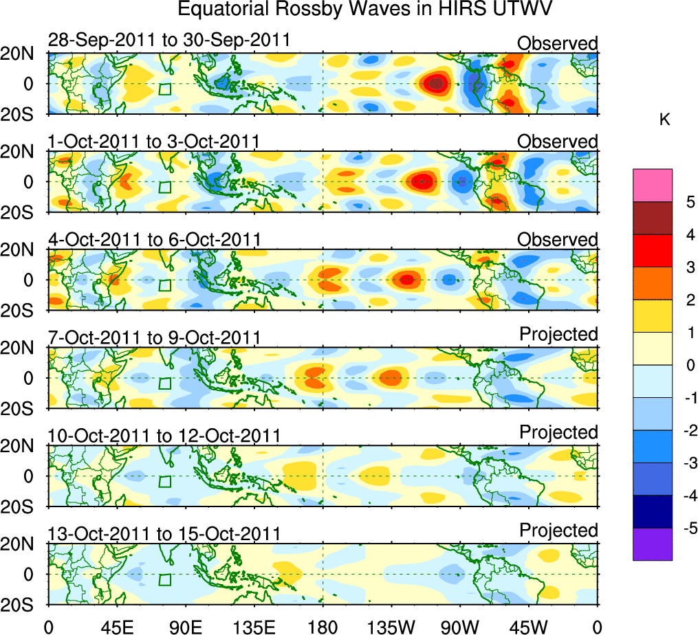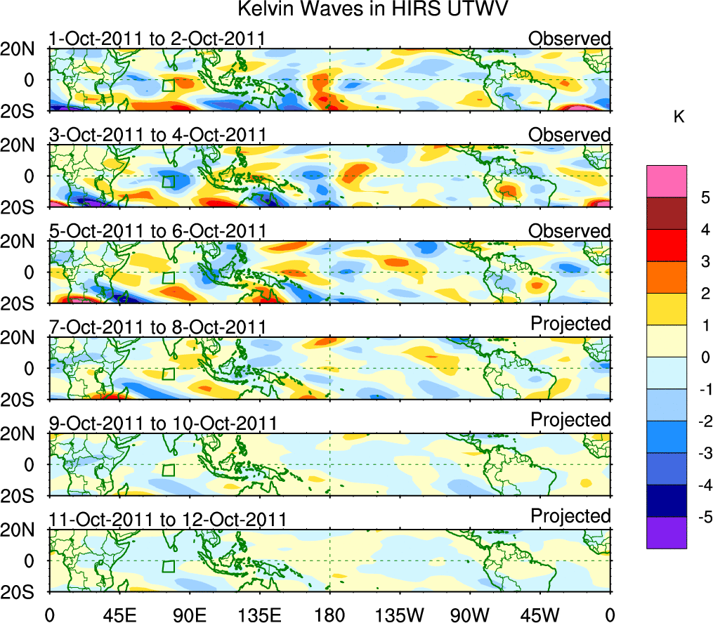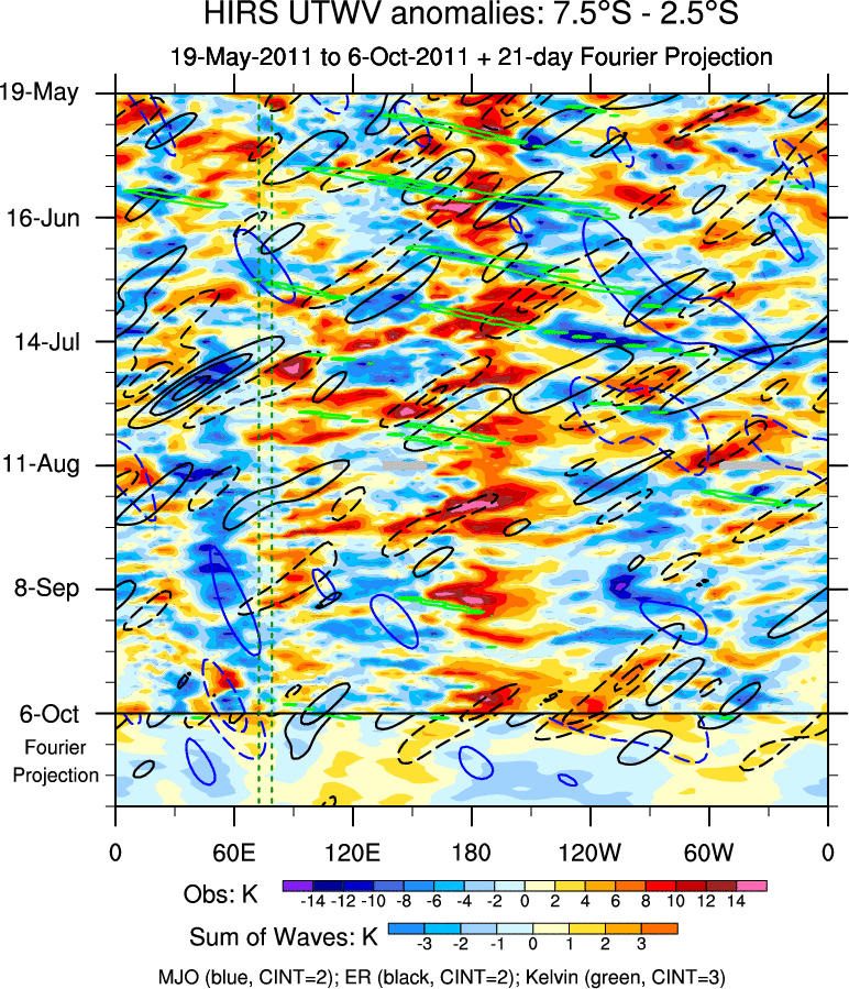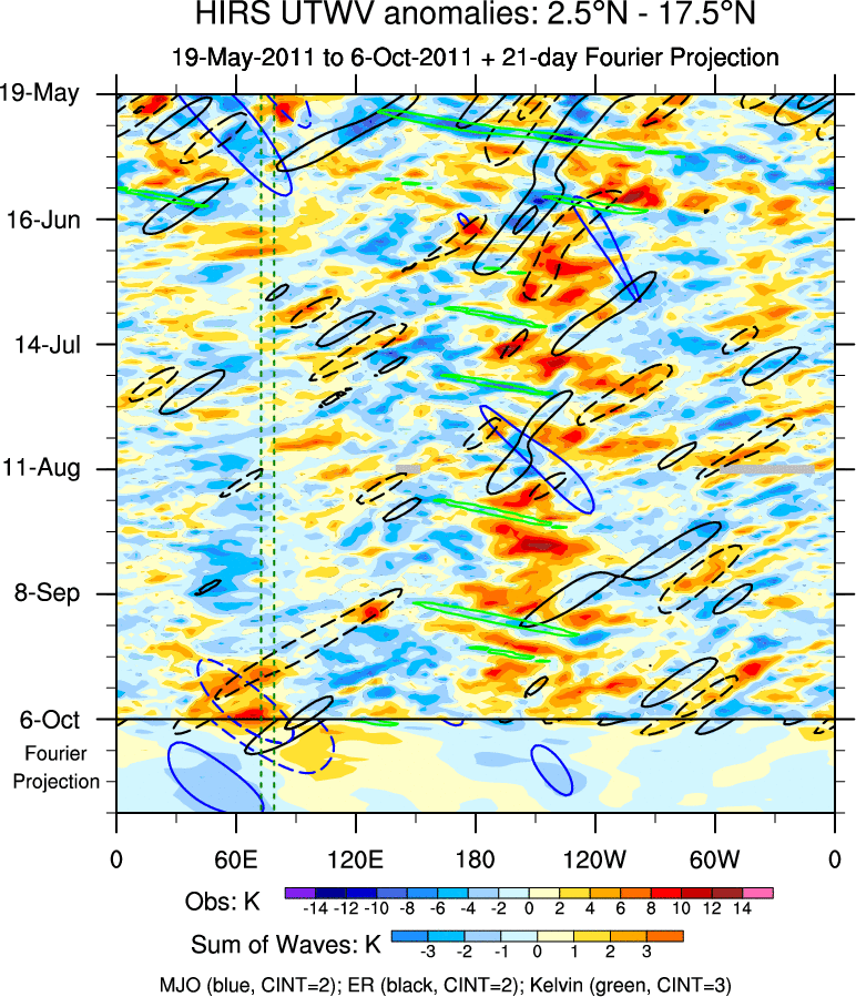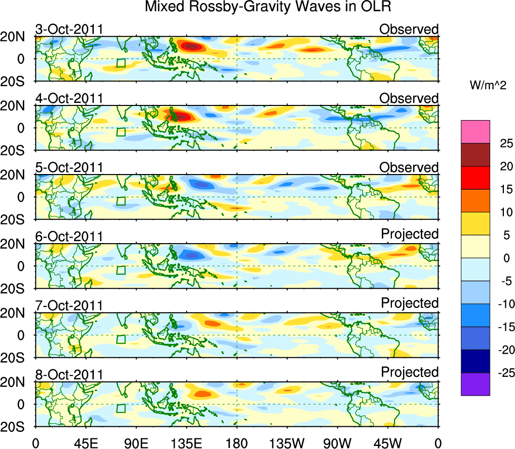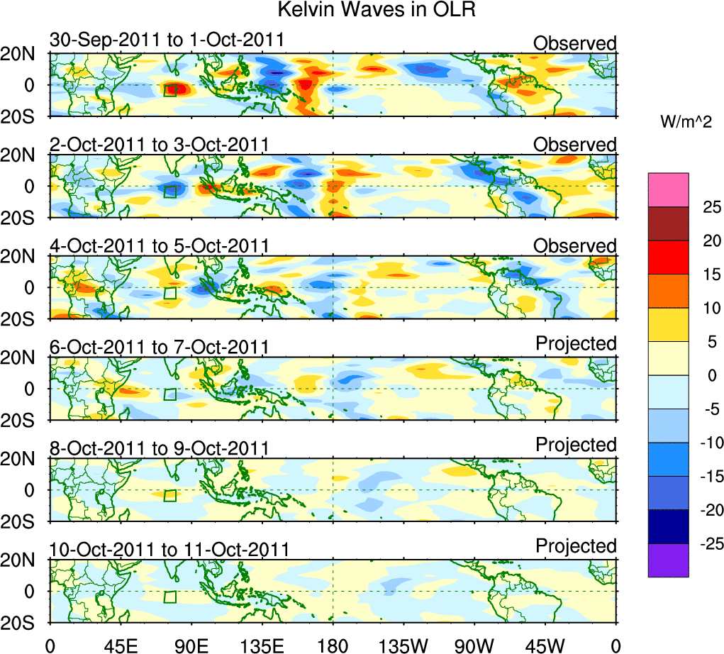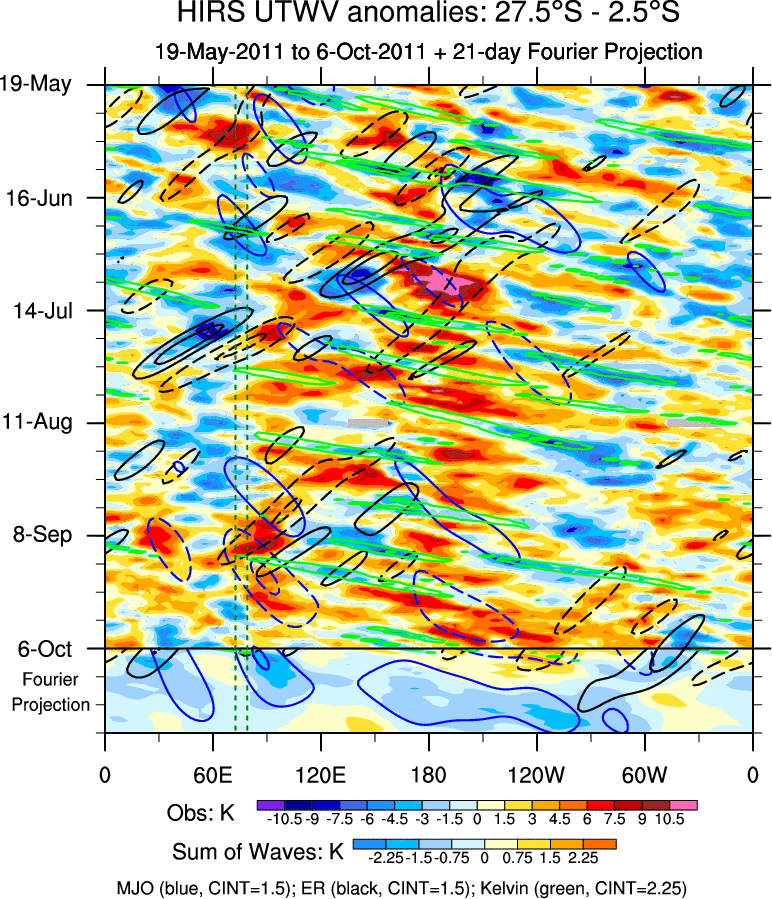 To identify tropical waves in near real-time, the OLR and UTWV data are filtered following Wheeler & Weickmann (2001 MWR). The daily anomalies are calculated using the first 3 harmonics of the seasonal cycle for 1979–2009. Missing values are then filled using linear interpolation in space and time. The most recent 365 days of anomalies are padded with 659 days of zeroes, and the result is filtered for each wave type.