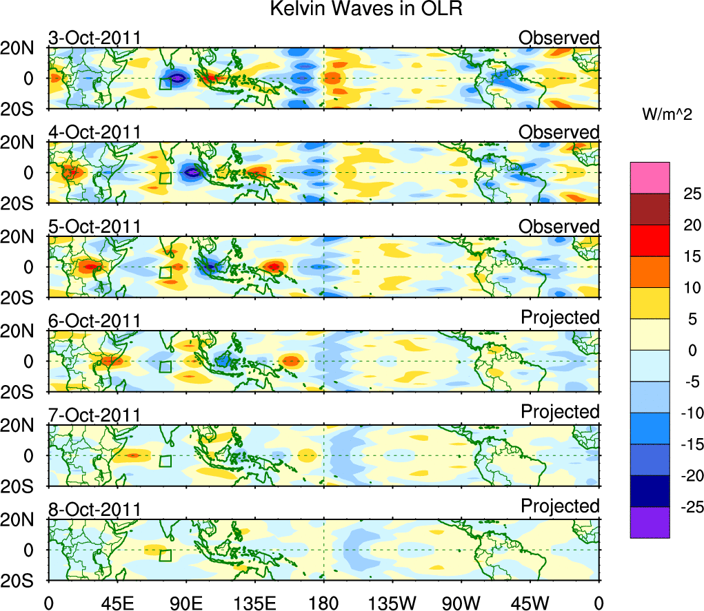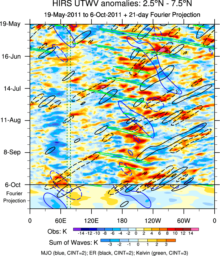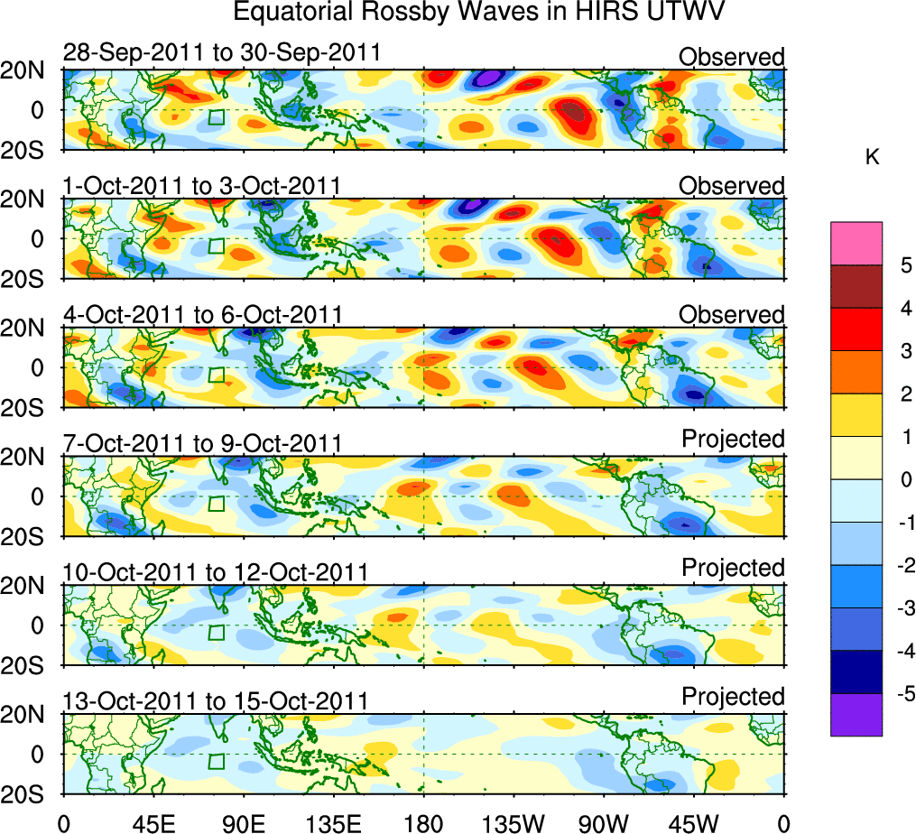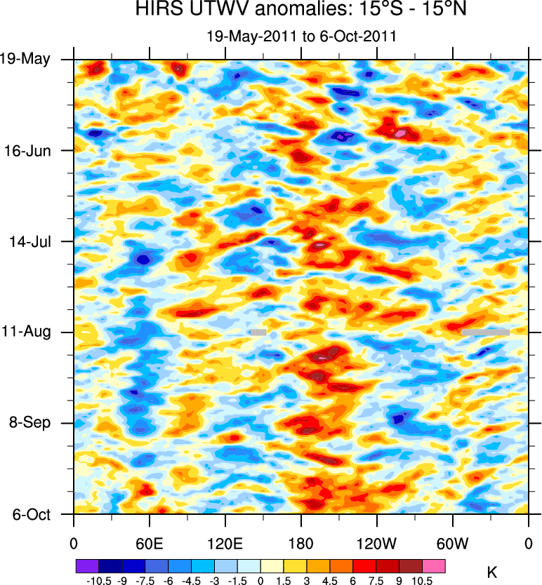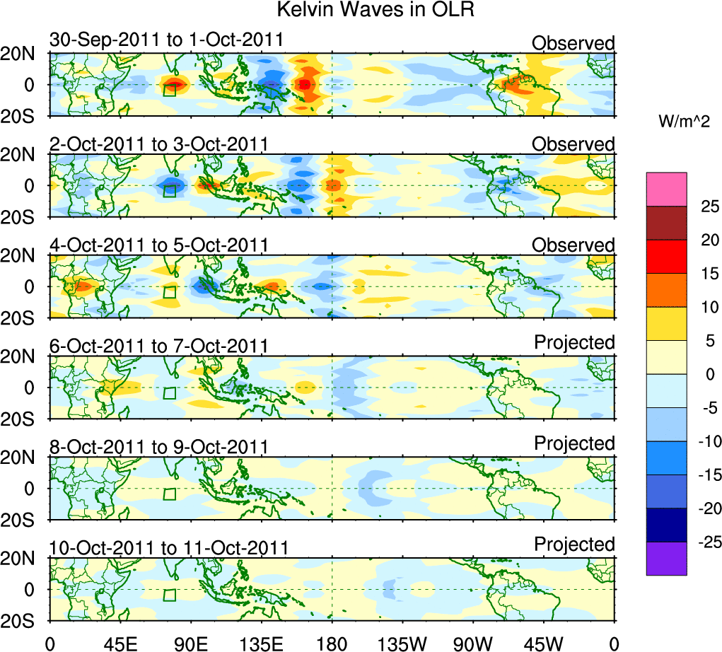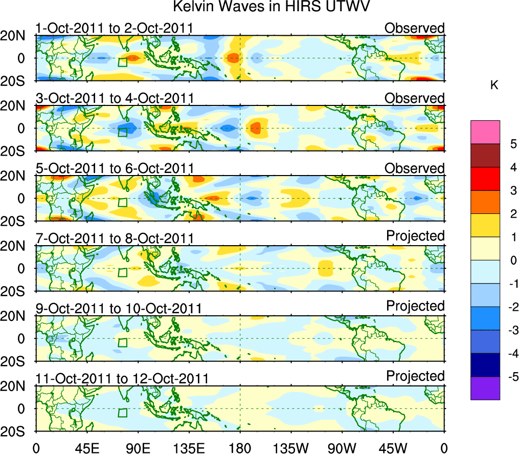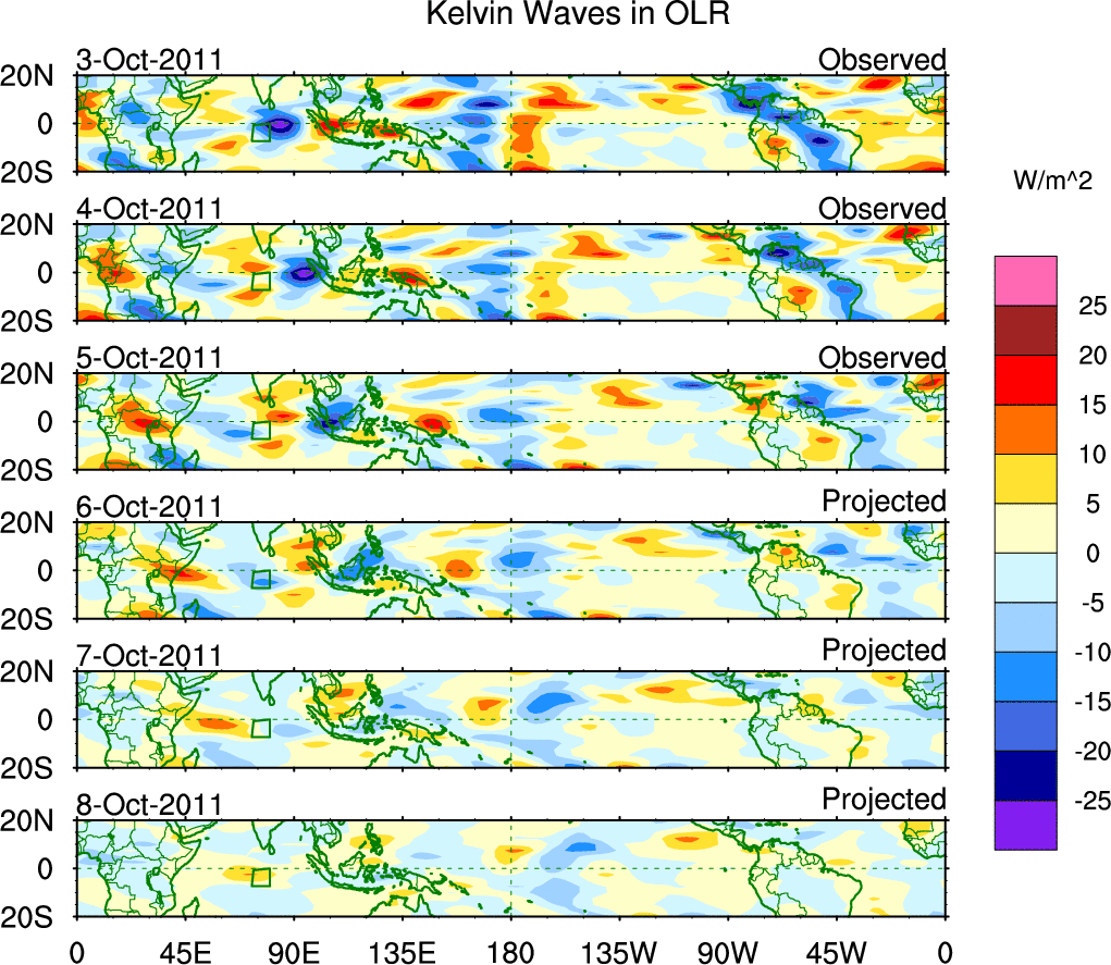 To identify tropical waves in near real-time, the OLR and UTWV data are filtered following Wheeler & Weickmann (2001 MWR). The daily anomalies are calculated using the first 3 harmonics of the seasonal cycle for 1979–2009. Missing values are then filled using linear interpolation in space and time. The most recent 365 days of anomalies are padded with 659 days of zeroes, and the result is filtered for each wave type.