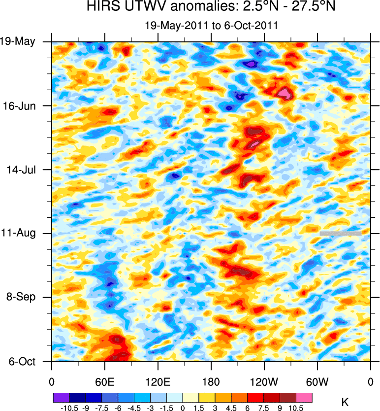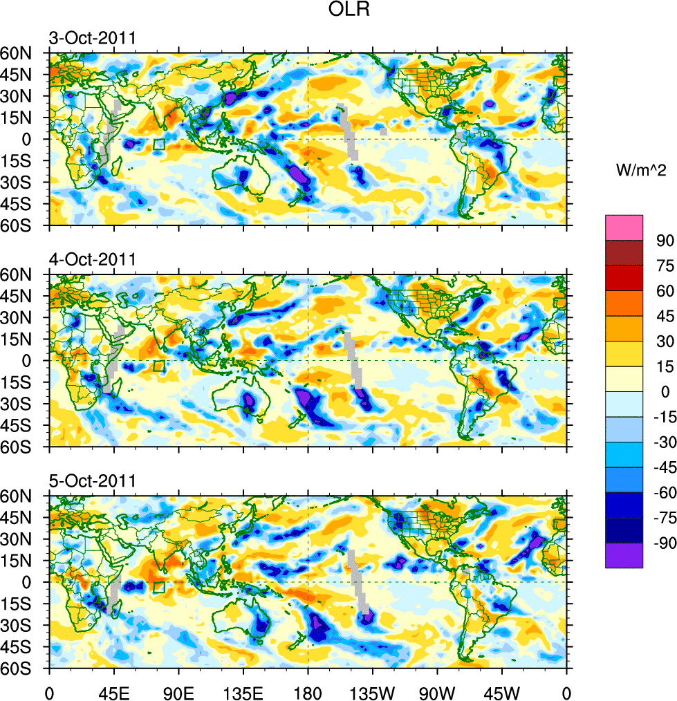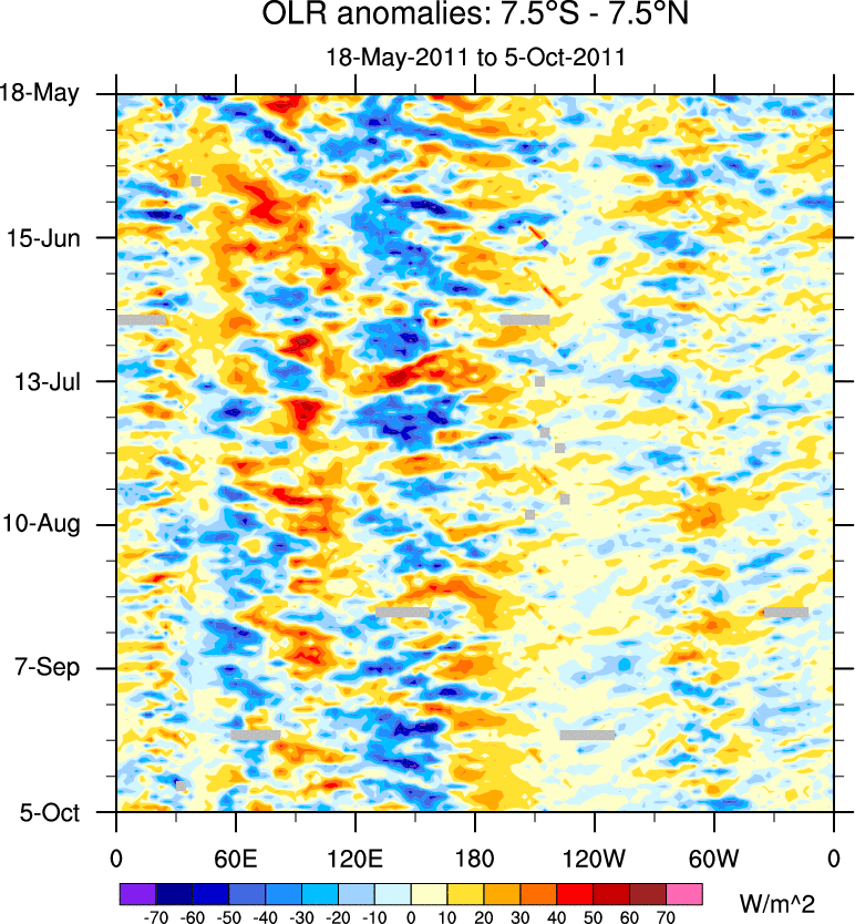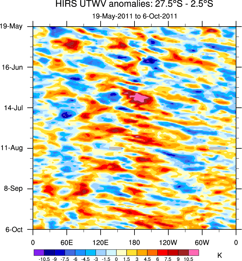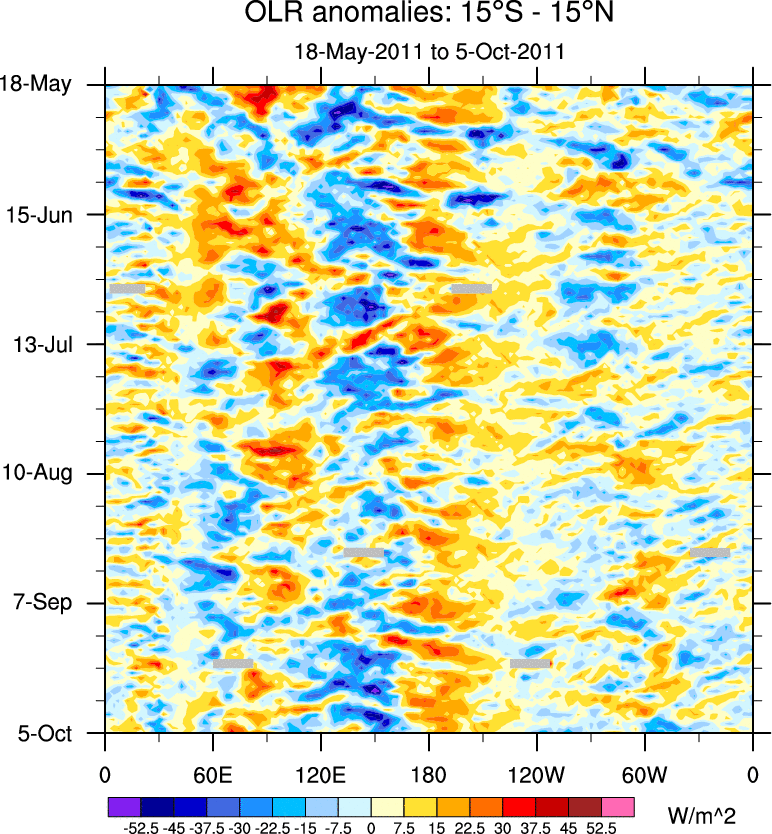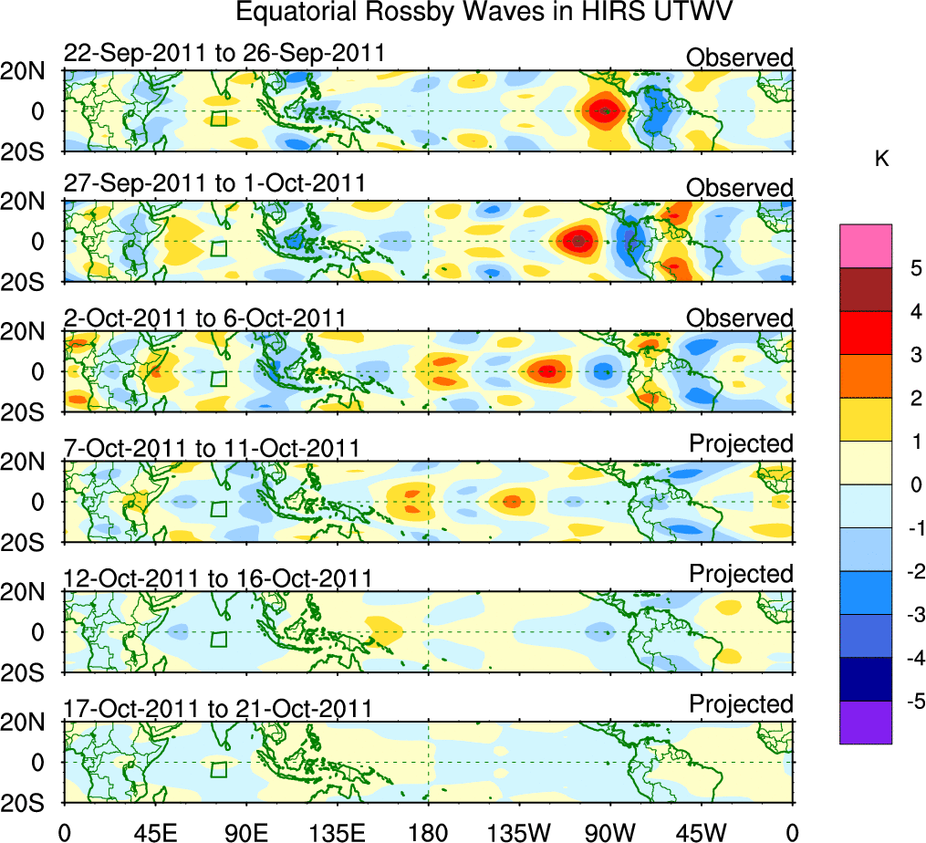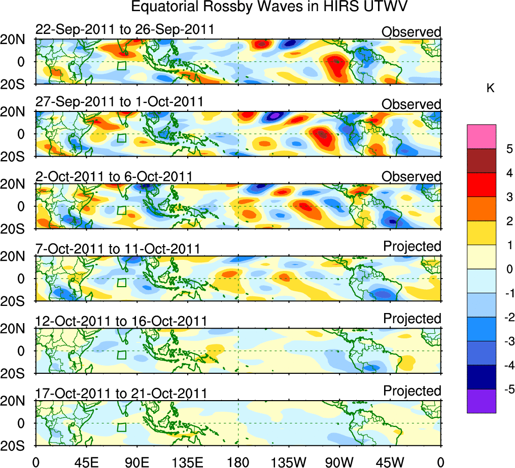 To identify tropical waves in near real-time, the OLR and UTWV data are filtered following Wheeler & Weickmann (2001 MWR). The daily anomalies are calculated using the first 3 harmonics of the seasonal cycle for 1979–2009. Missing values are then filled using linear interpolation in space and time. The most recent 365 days of anomalies are padded with 659 days of zeroes, and the result is filtered for each wave type.