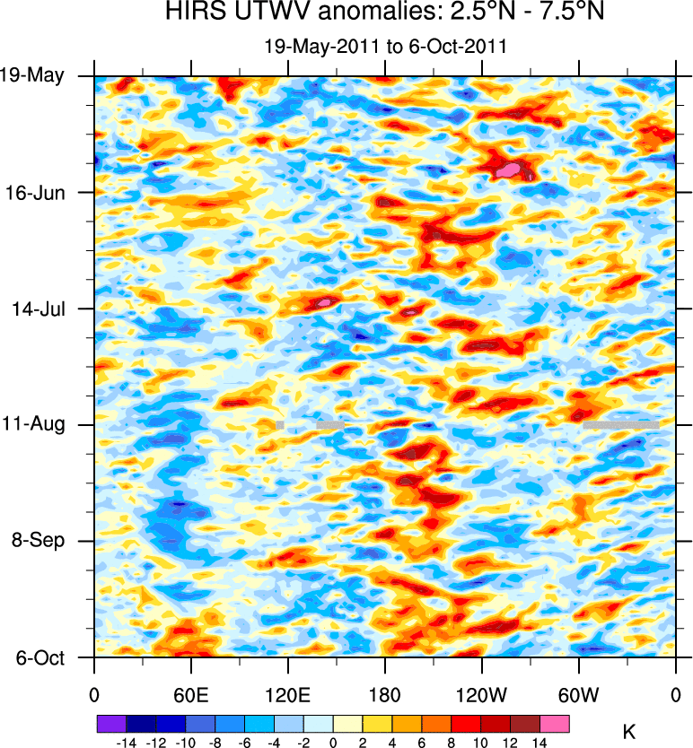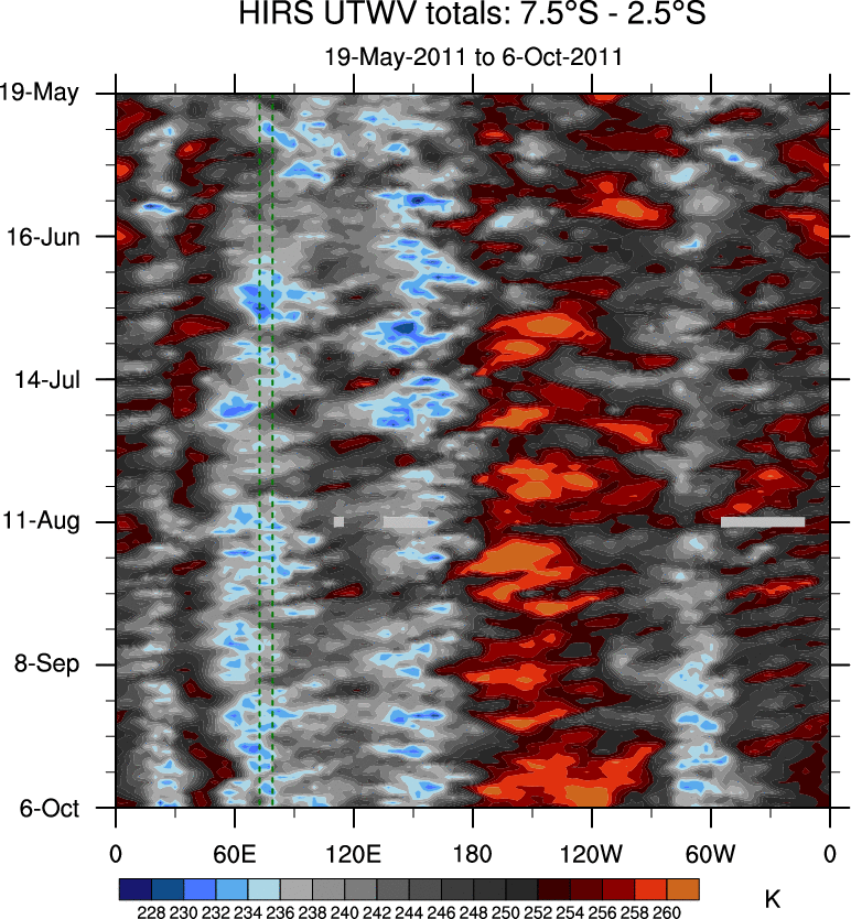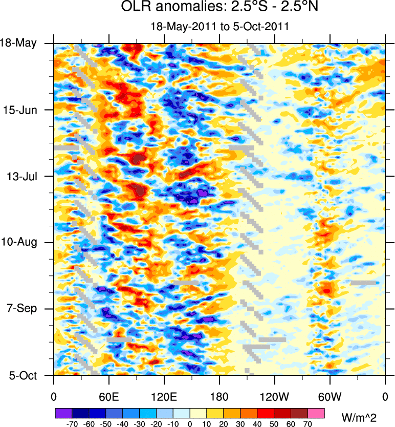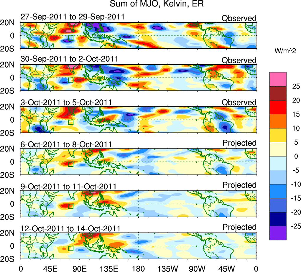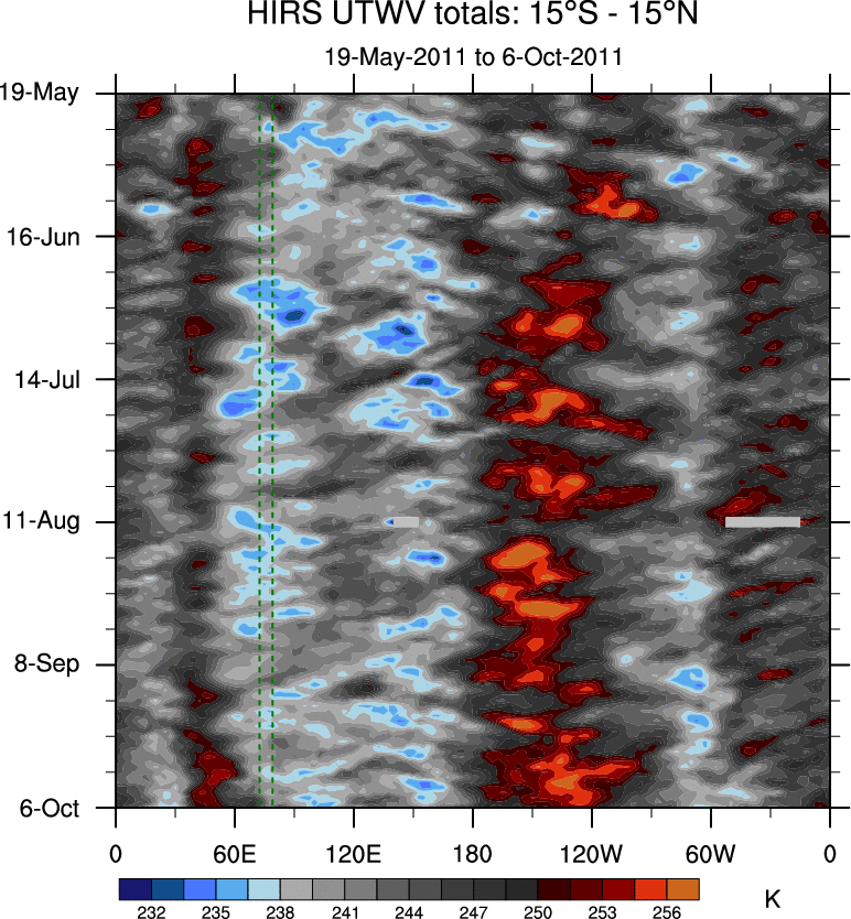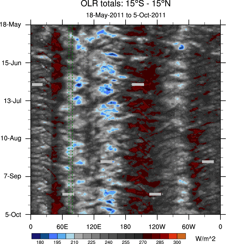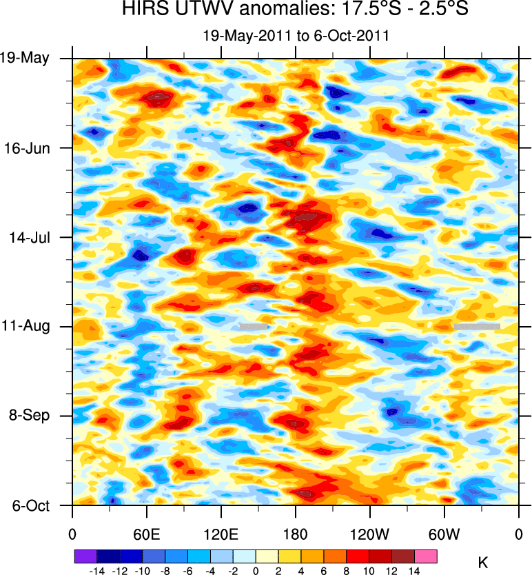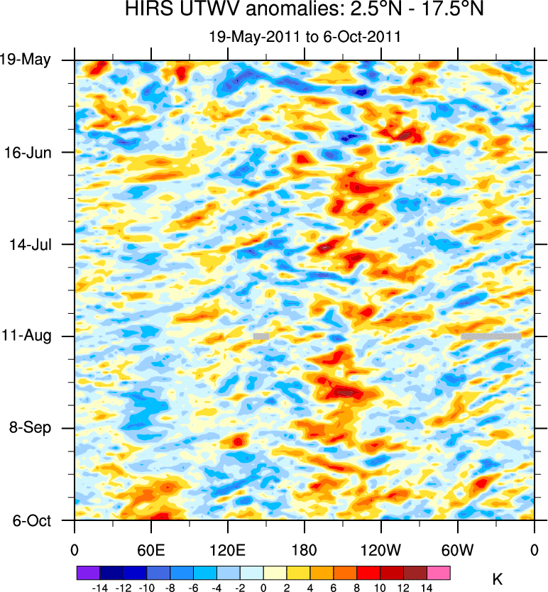 To identify tropical waves in near real-time, the OLR and UTWV data are filtered following Wheeler & Weickmann (2001 MWR). The daily anomalies are calculated using the first 3 harmonics of the seasonal cycle for 1979–2009. Missing values are then filled using linear interpolation in space and time. The most recent 365 days of anomalies are padded with 659 days of zeroes, and the result is filtered for each wave type.