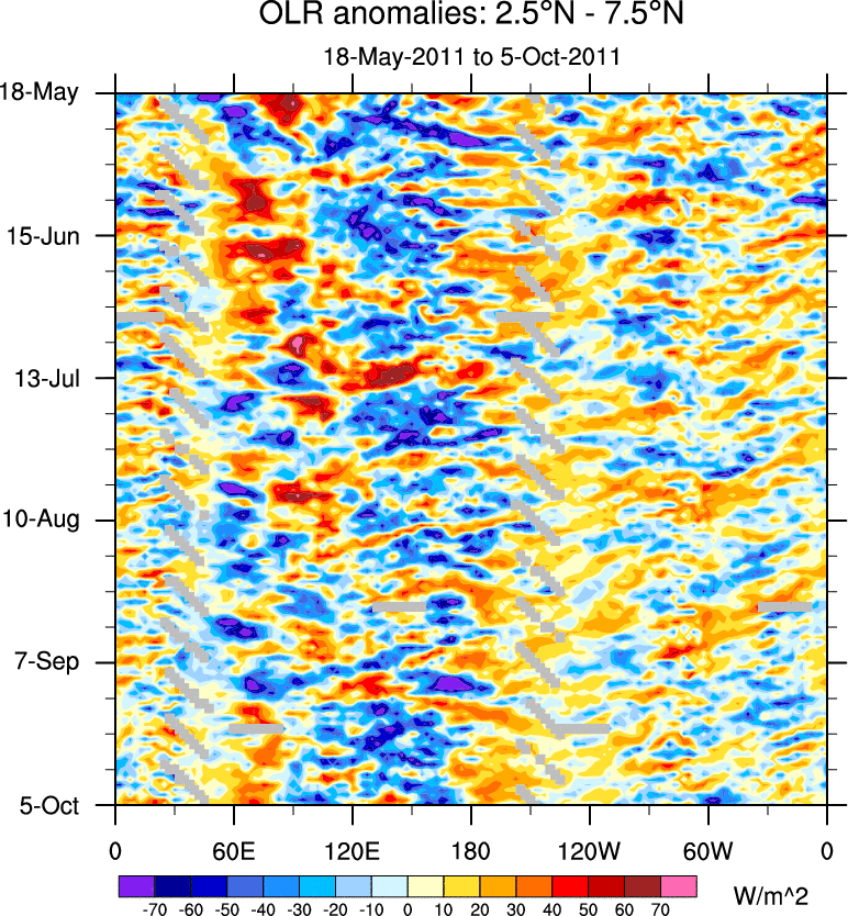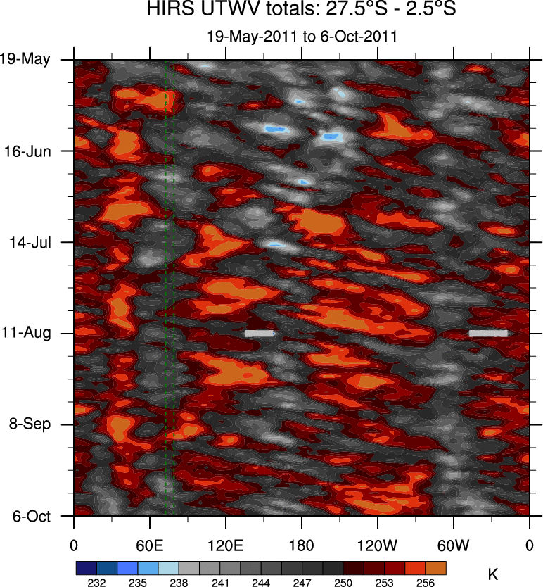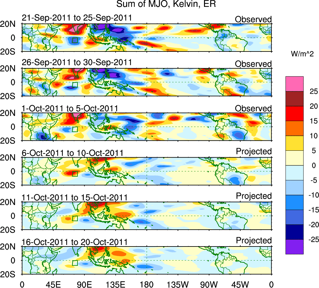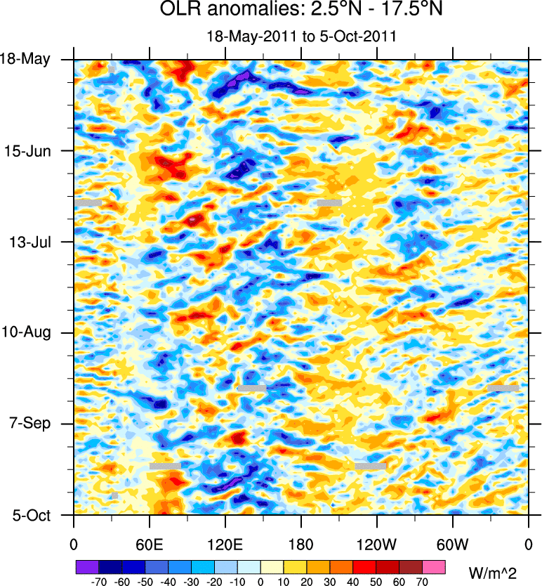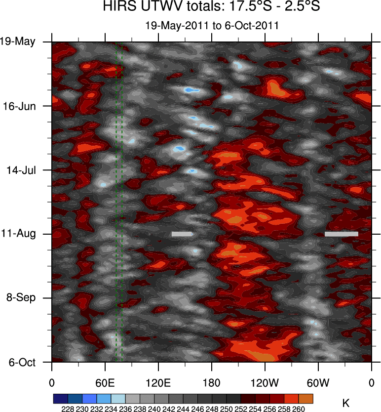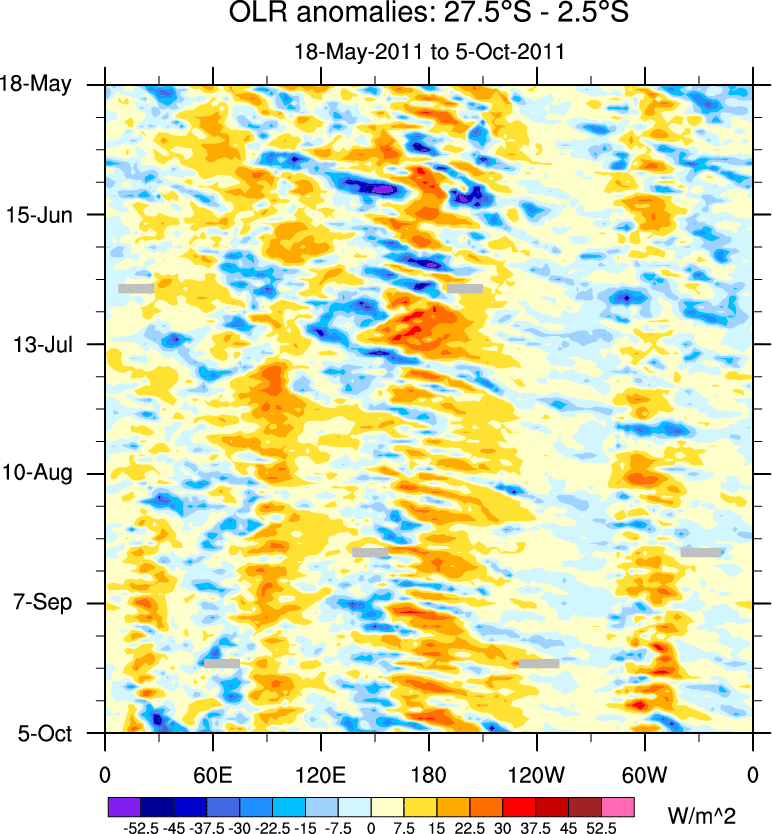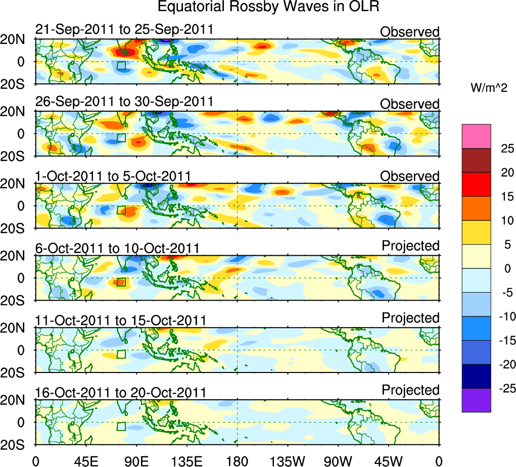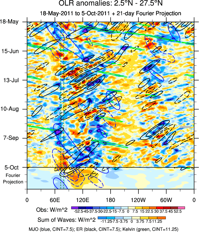 To identify tropical waves in near real-time, the OLR and UTWV data are filtered following Wheeler & Weickmann (2001 MWR). The daily anomalies are calculated using the first 3 harmonics of the seasonal cycle for 1979–2009. Missing values are then filled using linear interpolation in space and time. The most recent 365 days of anomalies are padded with 659 days of zeroes, and the result is filtered for each wave type.