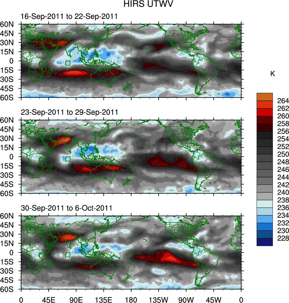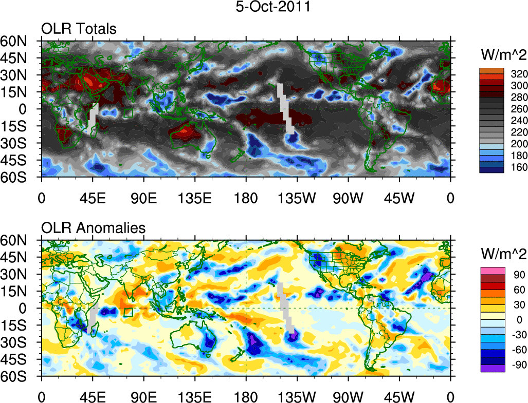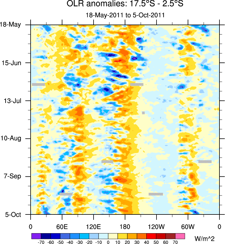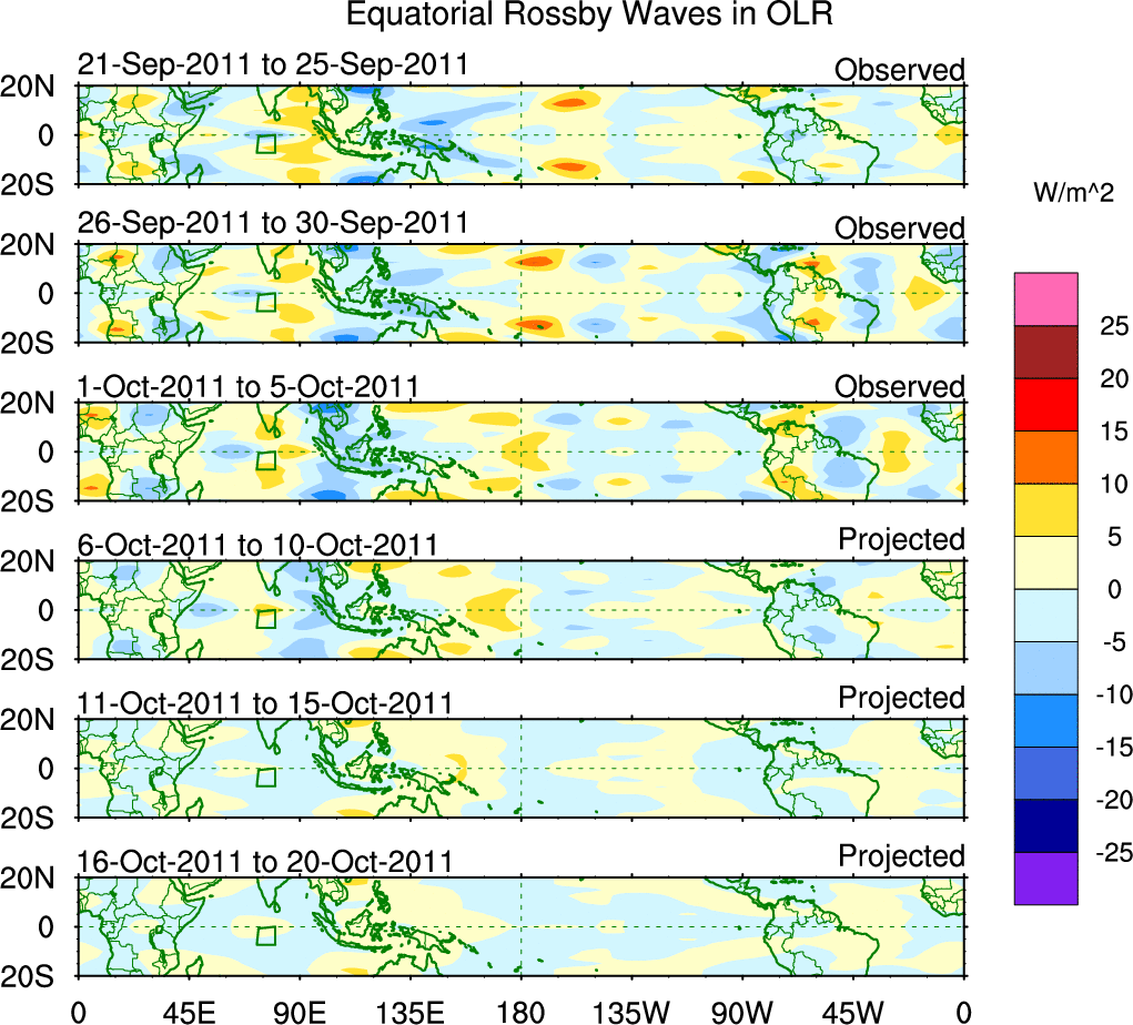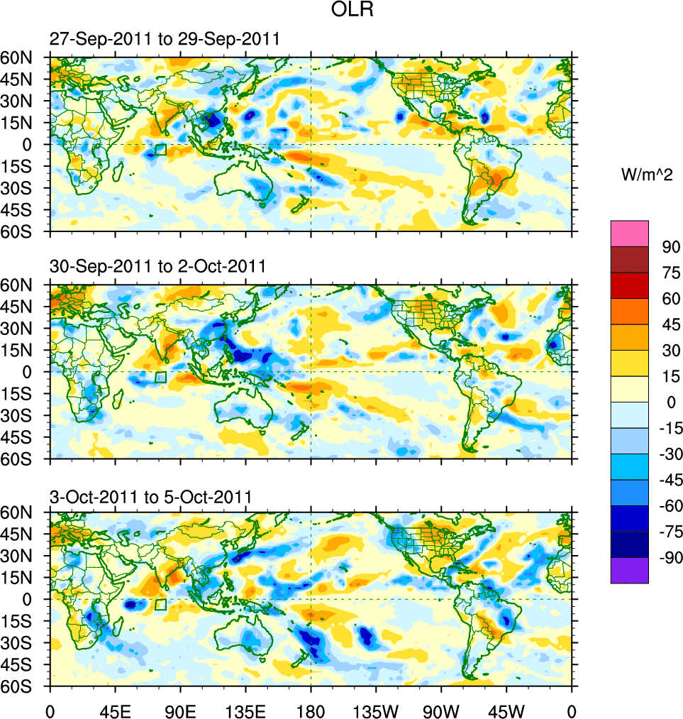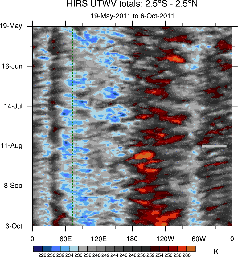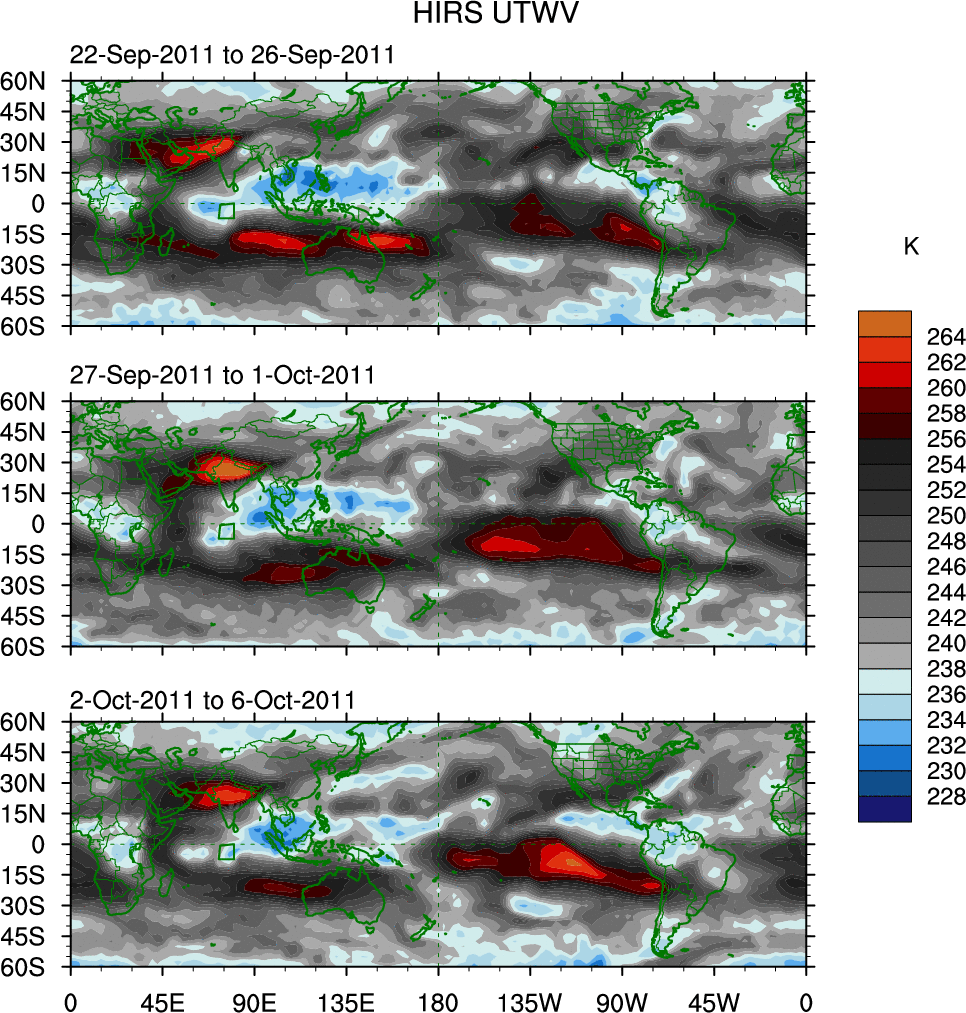 To identify tropical waves in near real-time, the OLR and UTWV data are filtered following Wheeler & Weickmann (2001 MWR). The daily anomalies are calculated using the first 3 harmonics of the seasonal cycle for 1979–2009. Missing values are then filled using linear interpolation in space and time. The most recent 365 days of anomalies are padded with 659 days of zeroes, and the result is filtered for each wave type.