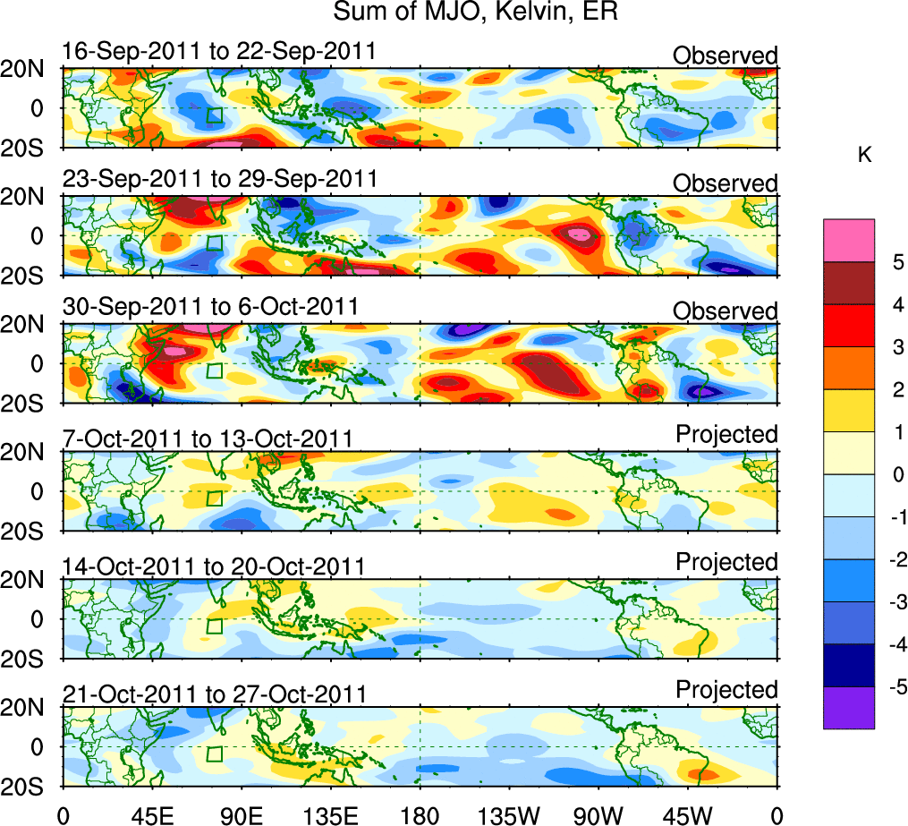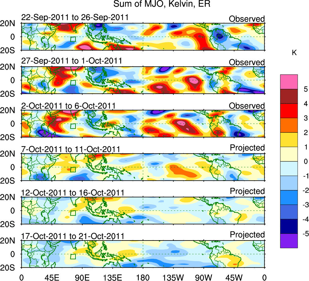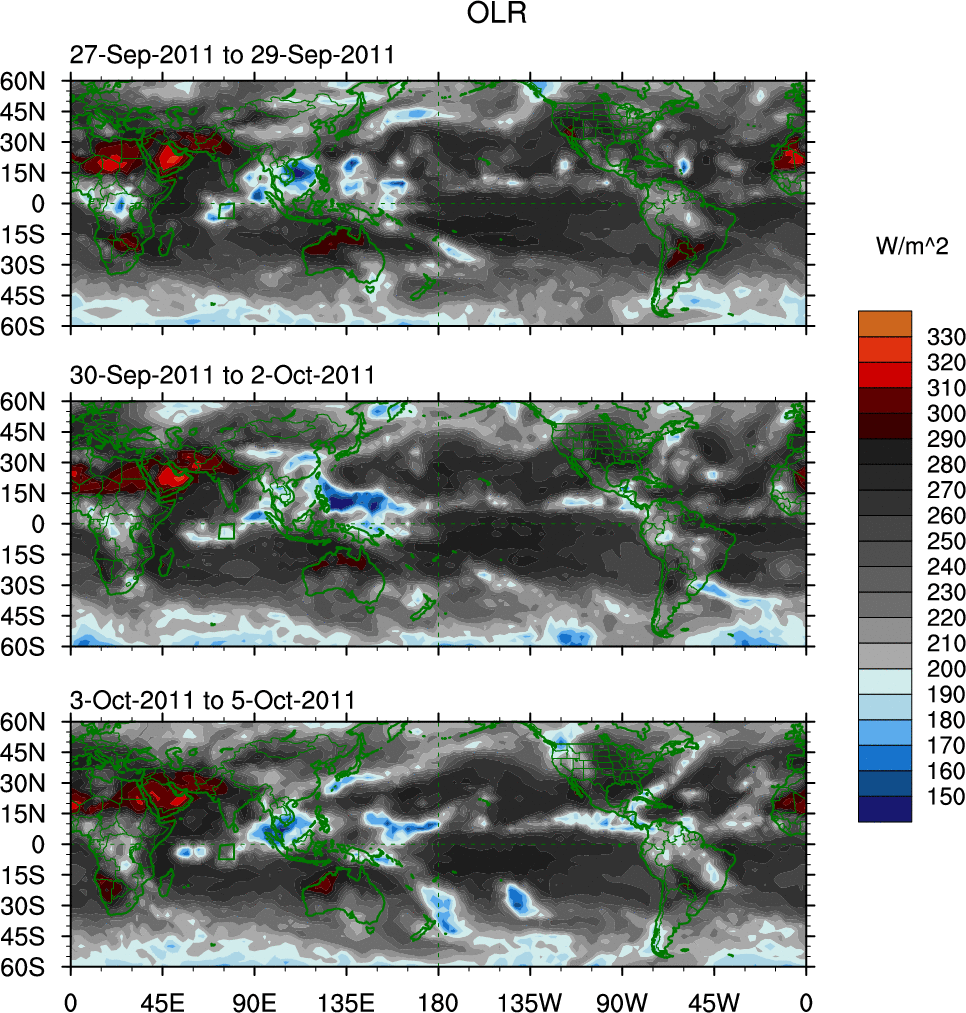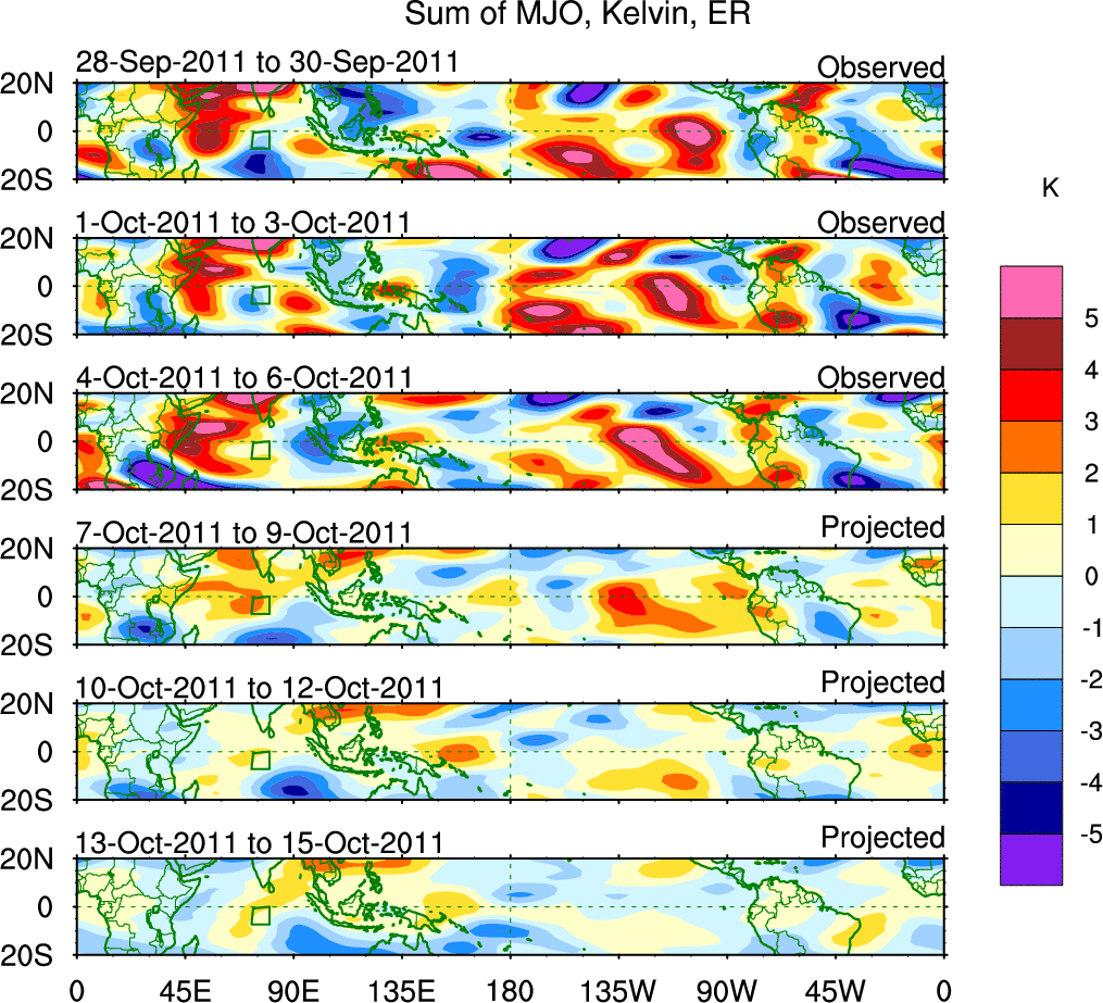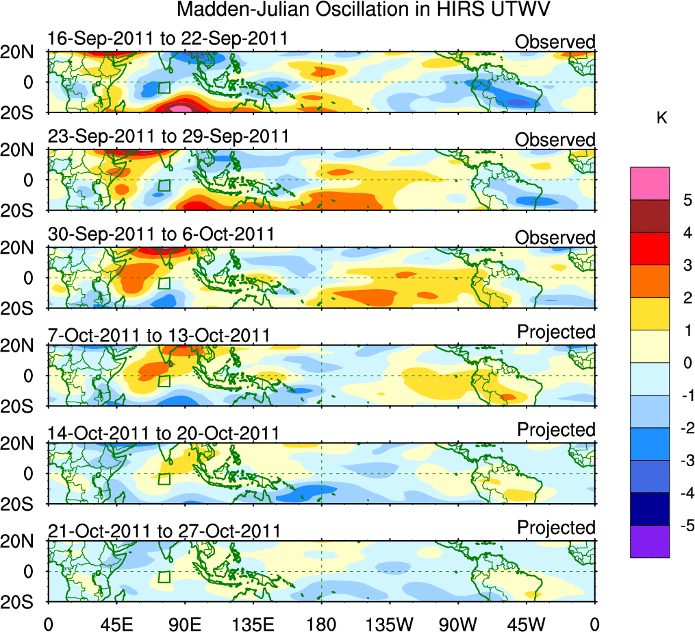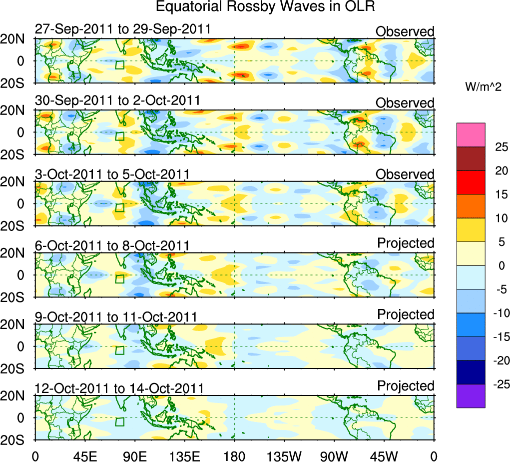 To identify tropical waves in near real-time, the OLR and UTWV data are filtered following Wheeler & Weickmann (2001 MWR). The daily anomalies are calculated using the first 3 harmonics of the seasonal cycle for 1979–2009. Missing values are then filled using linear interpolation in space and time. The most recent 365 days of anomalies are padded with 659 days of zeroes, and the result is filtered for each wave type.