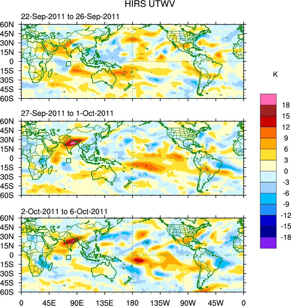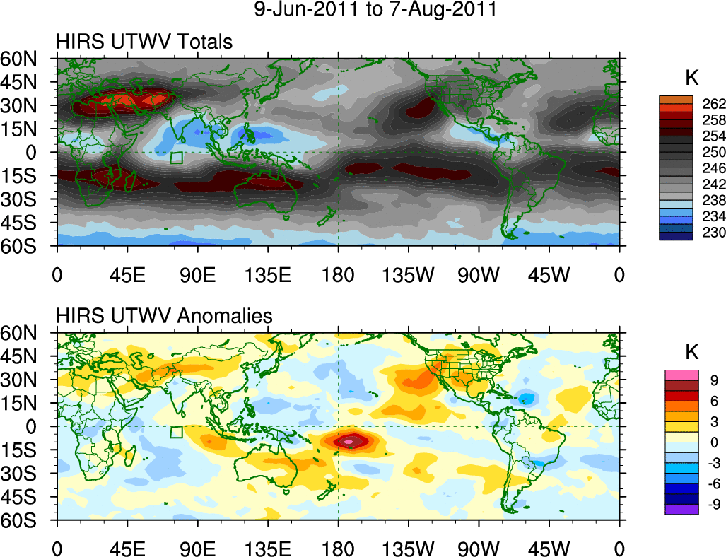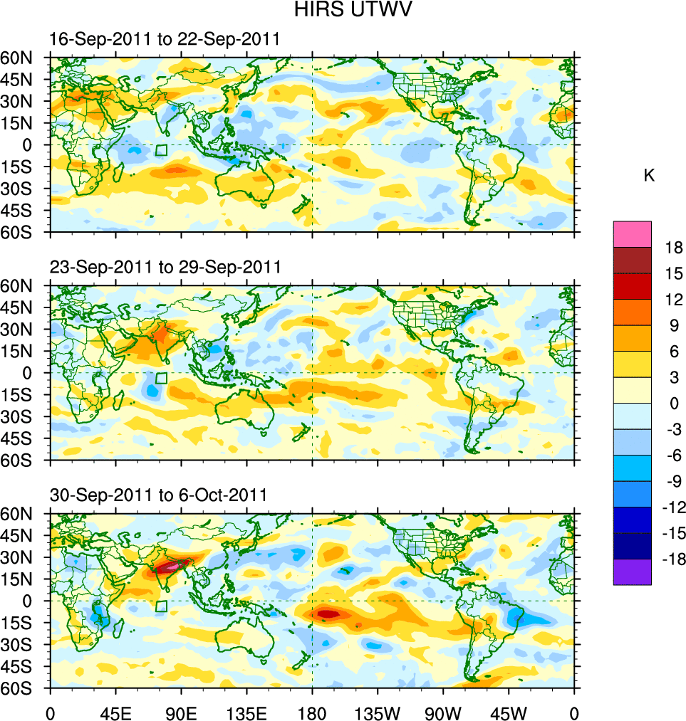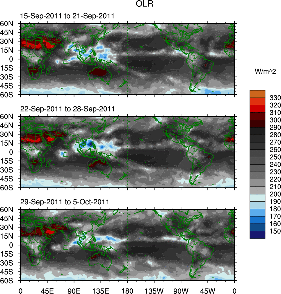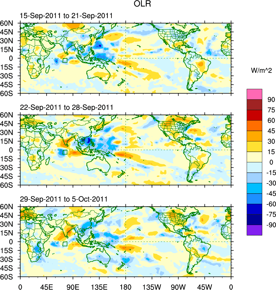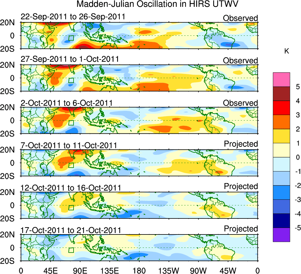 To identify tropical waves in near real-time, the OLR and UTWV data are filtered following Wheeler & Weickmann (2001 MWR). The daily anomalies are calculated using the first 3 harmonics of the seasonal cycle for 1979–2009. Missing values are then filled using linear interpolation in space and time. The most recent 365 days of anomalies are padded with 659 days of zeroes, and the result is filtered for each wave type.