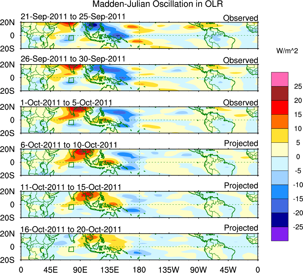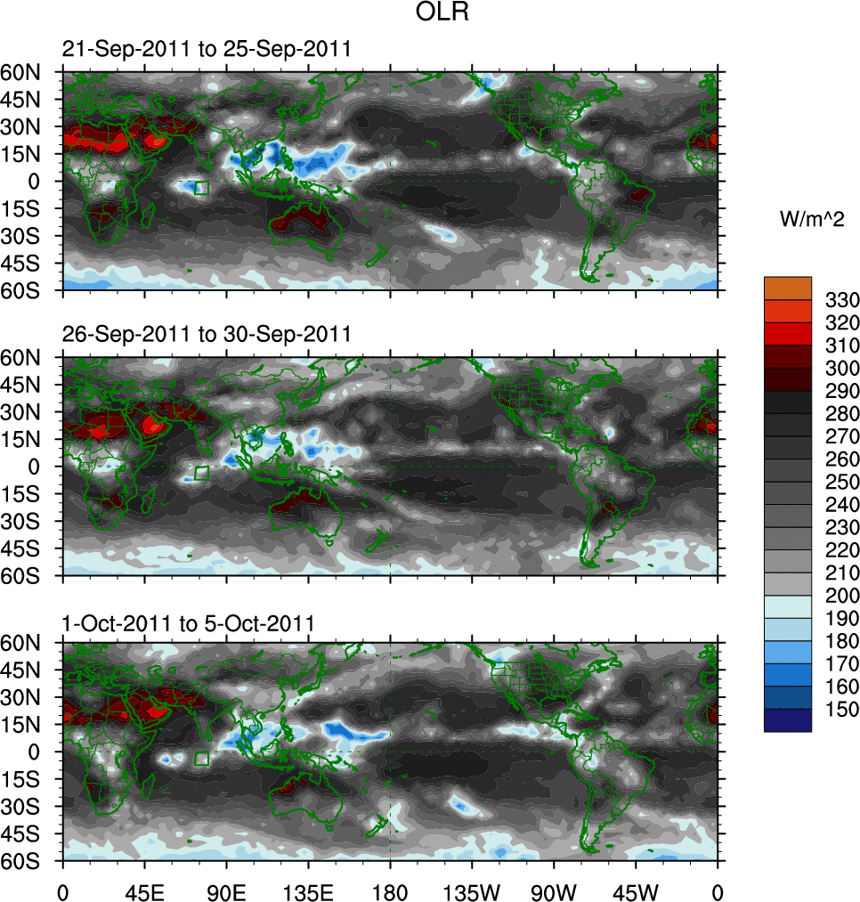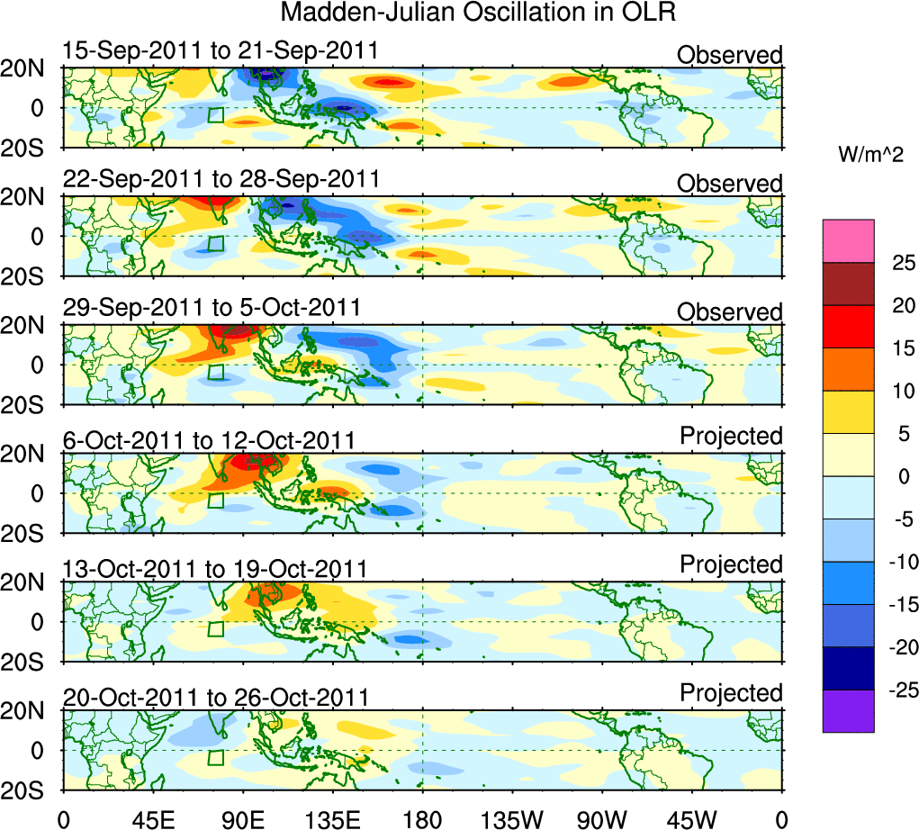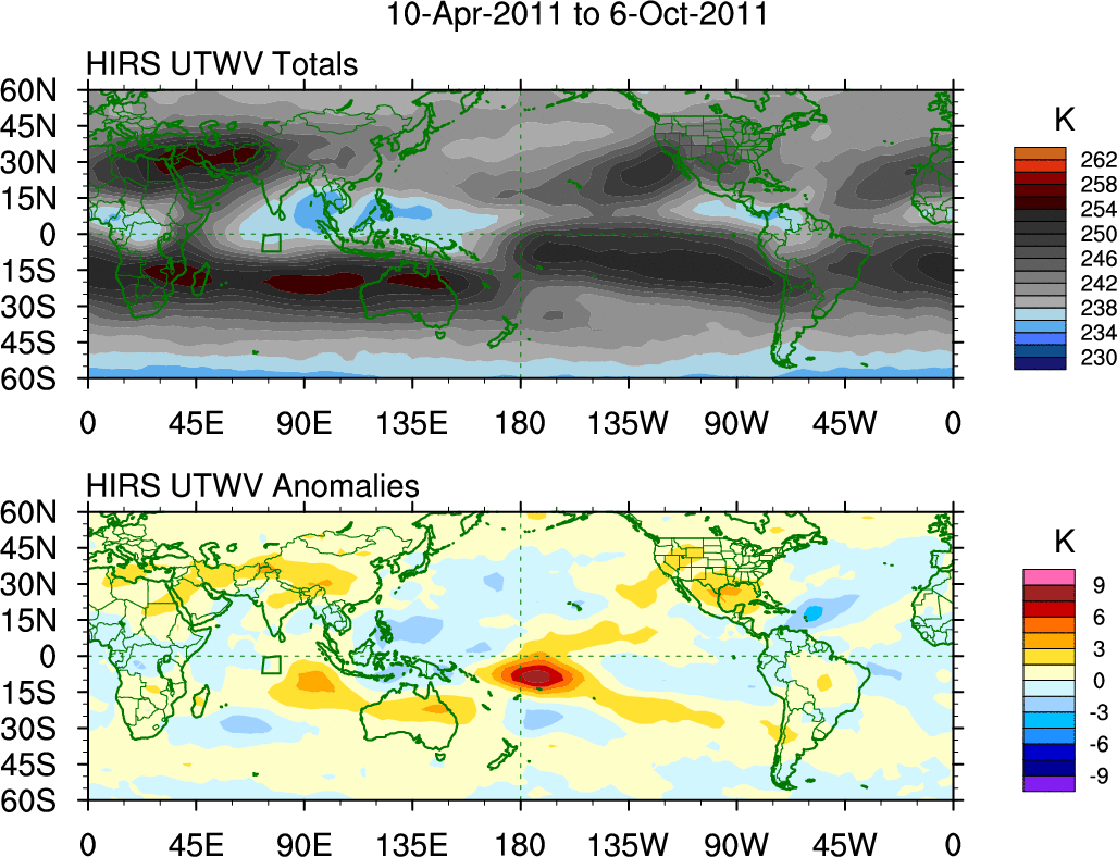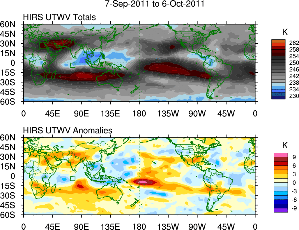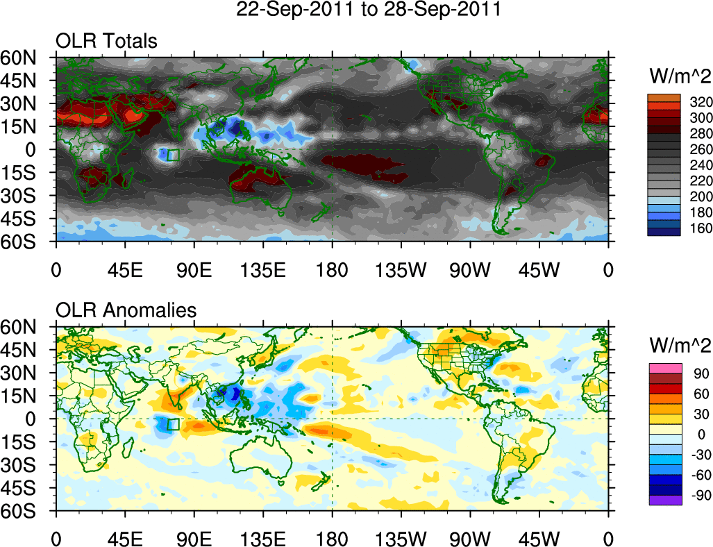 To identify tropical waves in near real-time, the OLR and UTWV data are filtered following Wheeler & Weickmann (2001 MWR). The daily anomalies are calculated using the first 3 harmonics of the seasonal cycle for 1979–2009. Missing values are then filled using linear interpolation in space and time. The most recent 365 days of anomalies are padded with 659 days of zeroes, and the result is filtered for each wave type.
