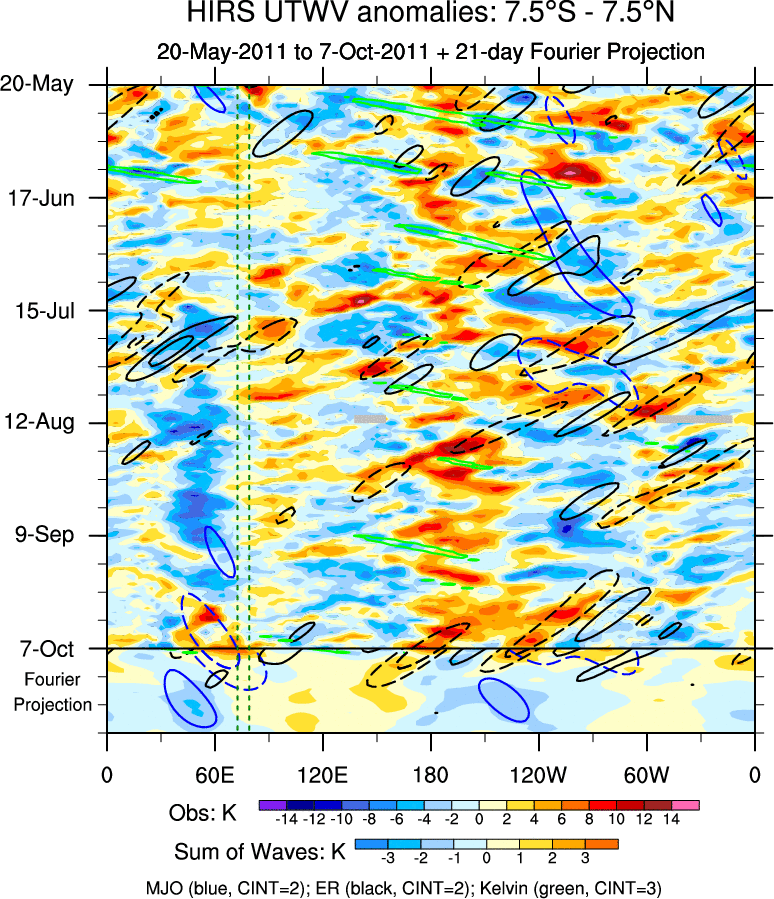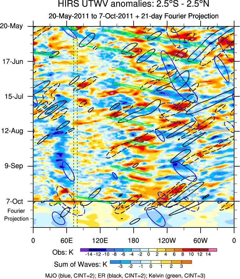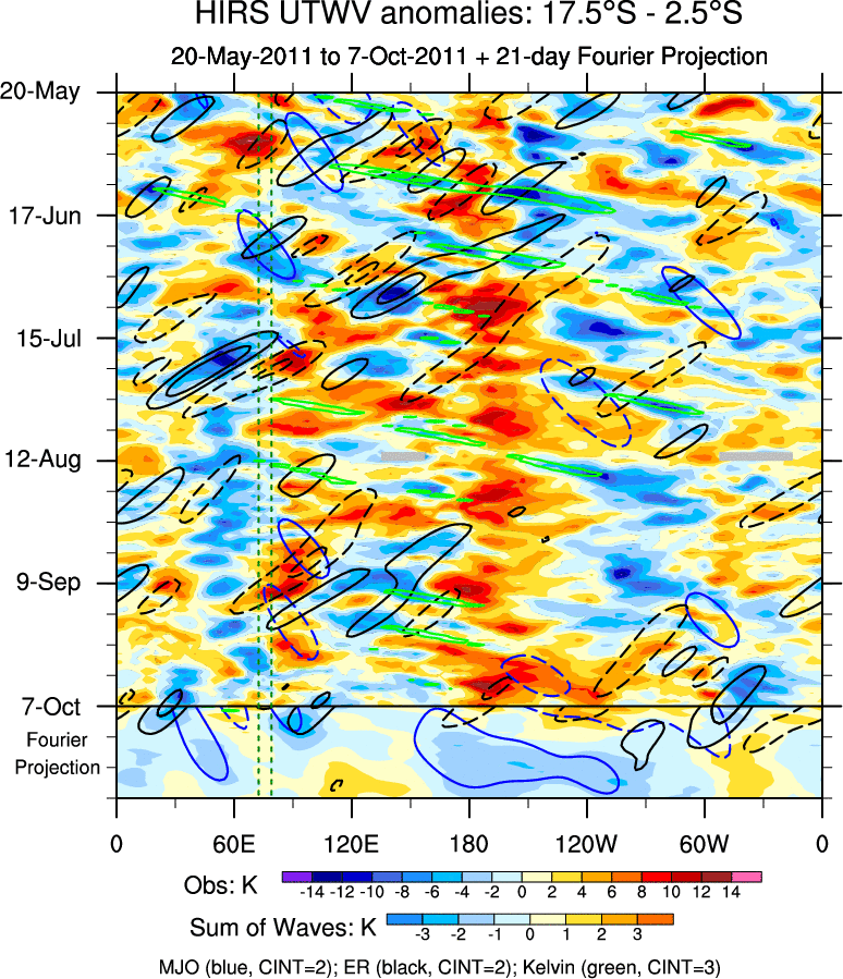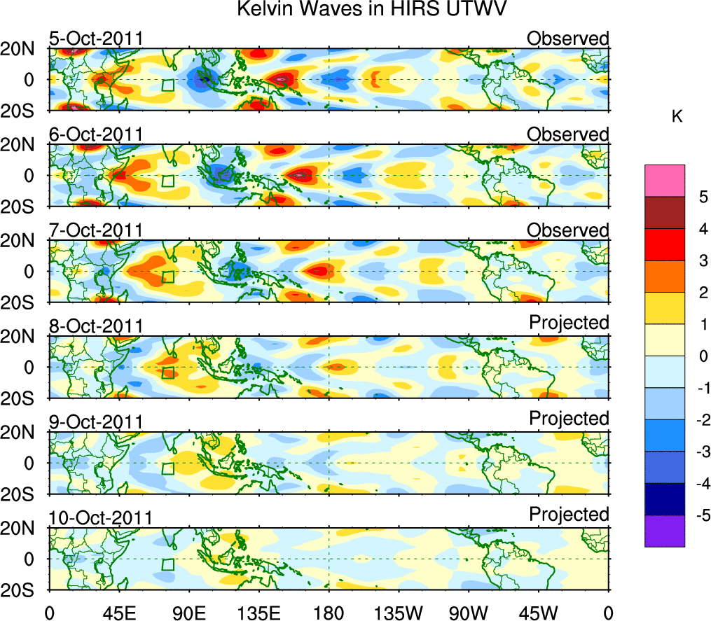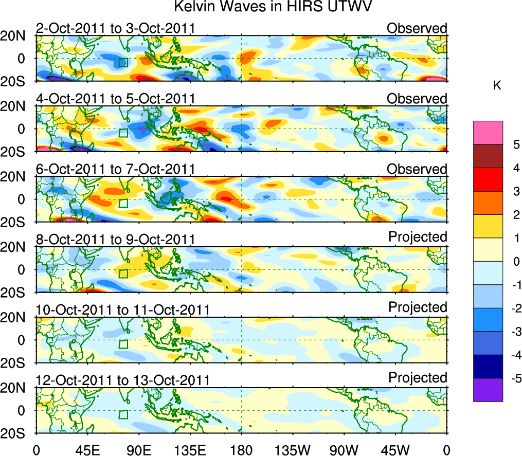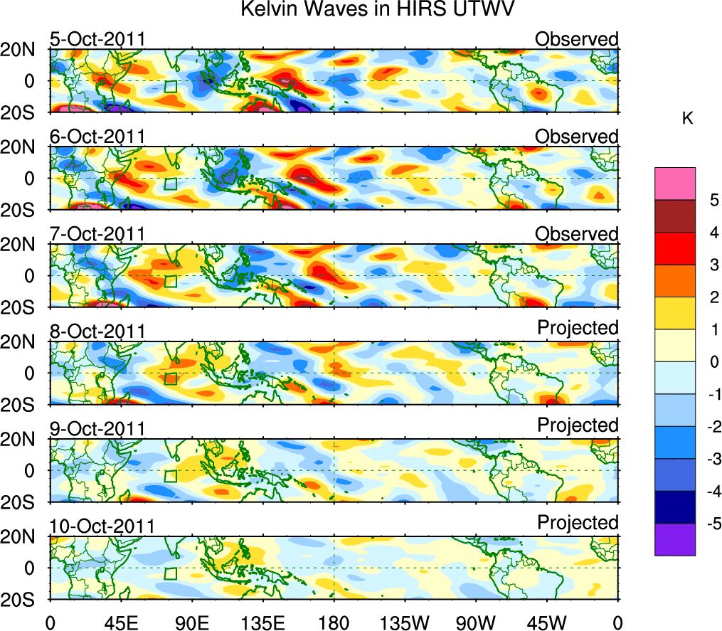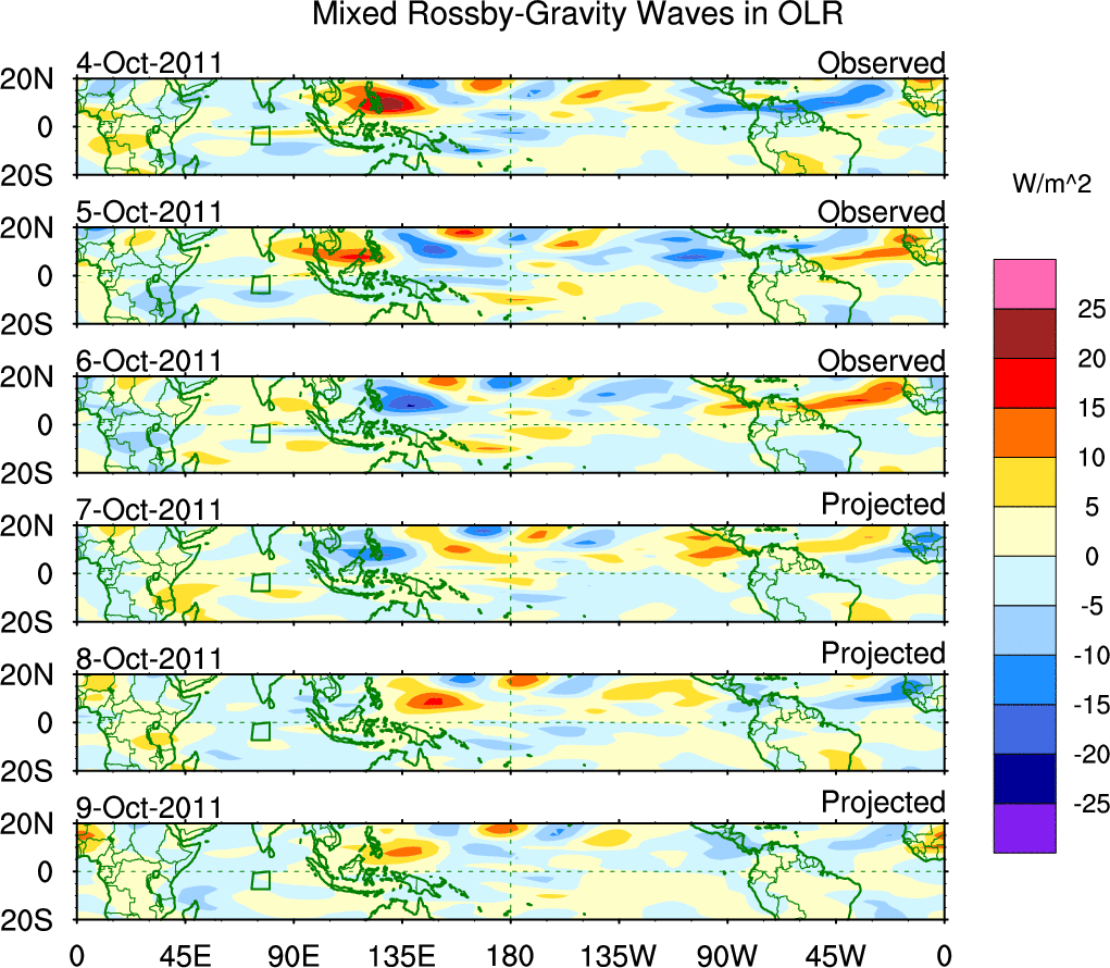 To identify tropical waves in near real-time, the OLR and UTWV data are filtered following Wheeler & Weickmann (2001 MWR). The daily anomalies are calculated using the first 3 harmonics of the seasonal cycle for 1979–2009. Missing values are then filled using linear interpolation in space and time. The most recent 365 days of anomalies are padded with 659 days of zeroes, and the result is filtered for each wave type.