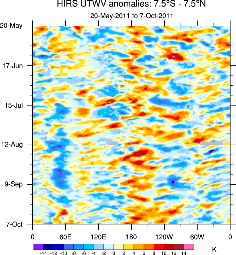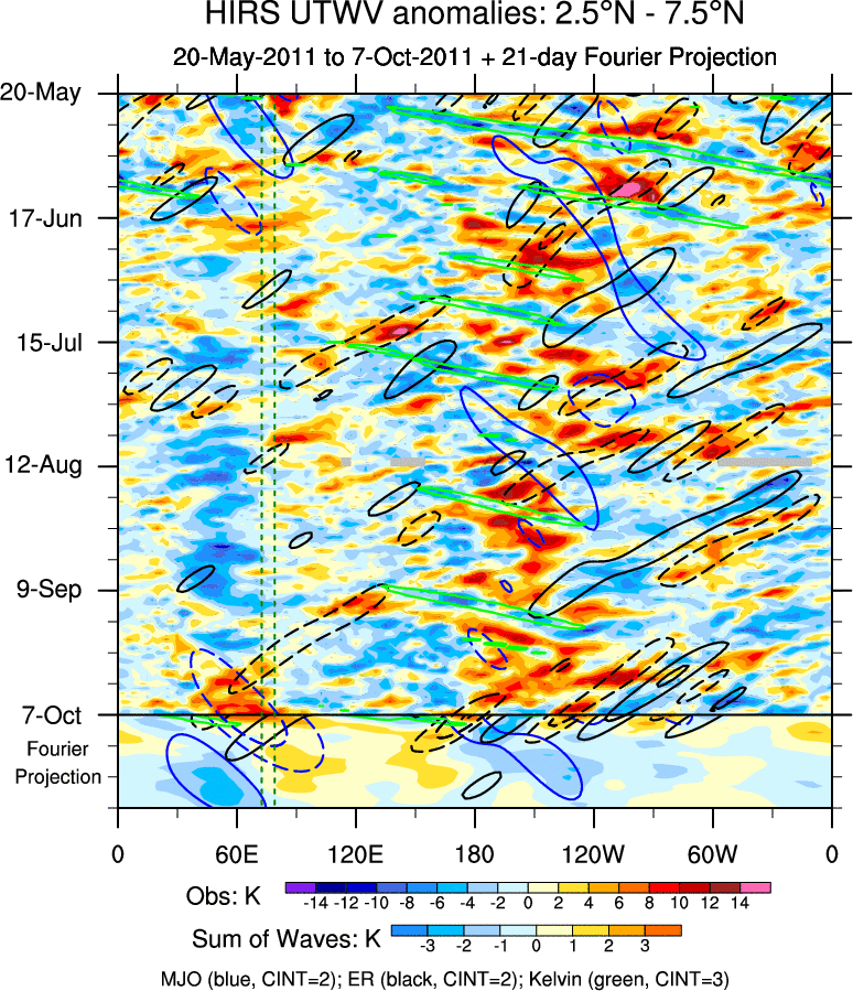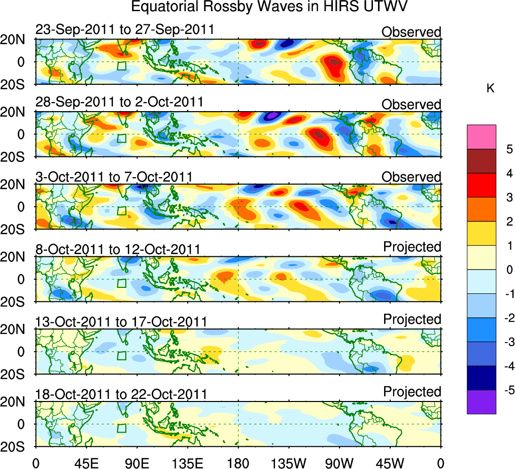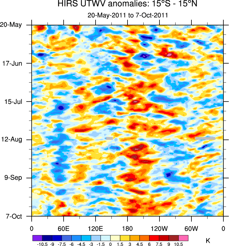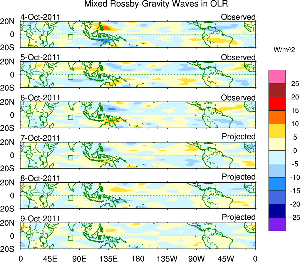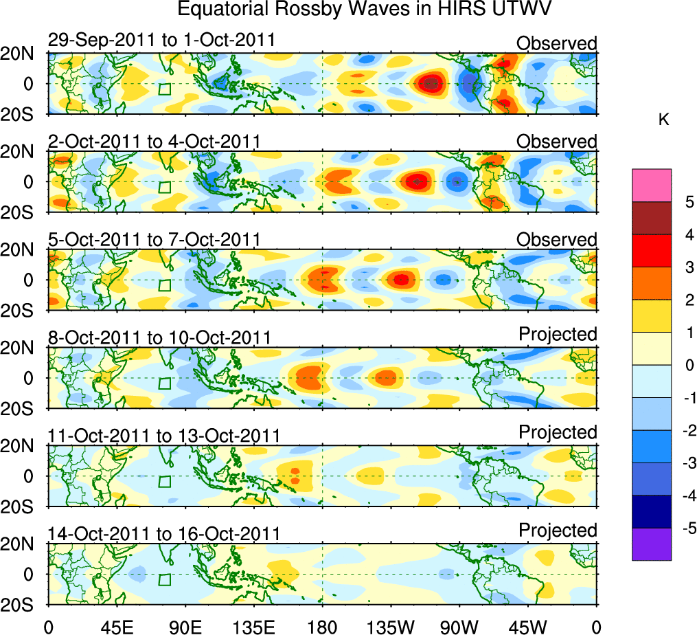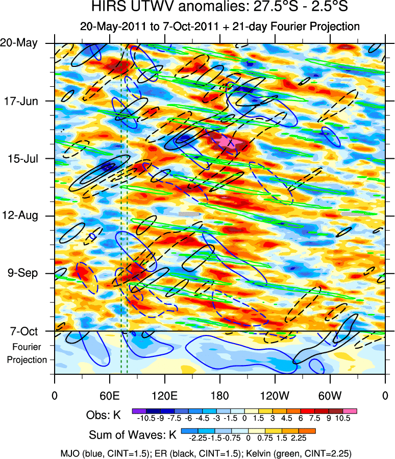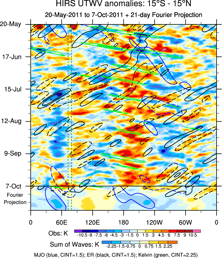 To identify tropical waves in near real-time, the OLR and UTWV data are filtered following Wheeler & Weickmann (2001 MWR). The daily anomalies are calculated using the first 3 harmonics of the seasonal cycle for 1979–2009. Missing values are then filled using linear interpolation in space and time. The most recent 365 days of anomalies are padded with 659 days of zeroes, and the result is filtered for each wave type.