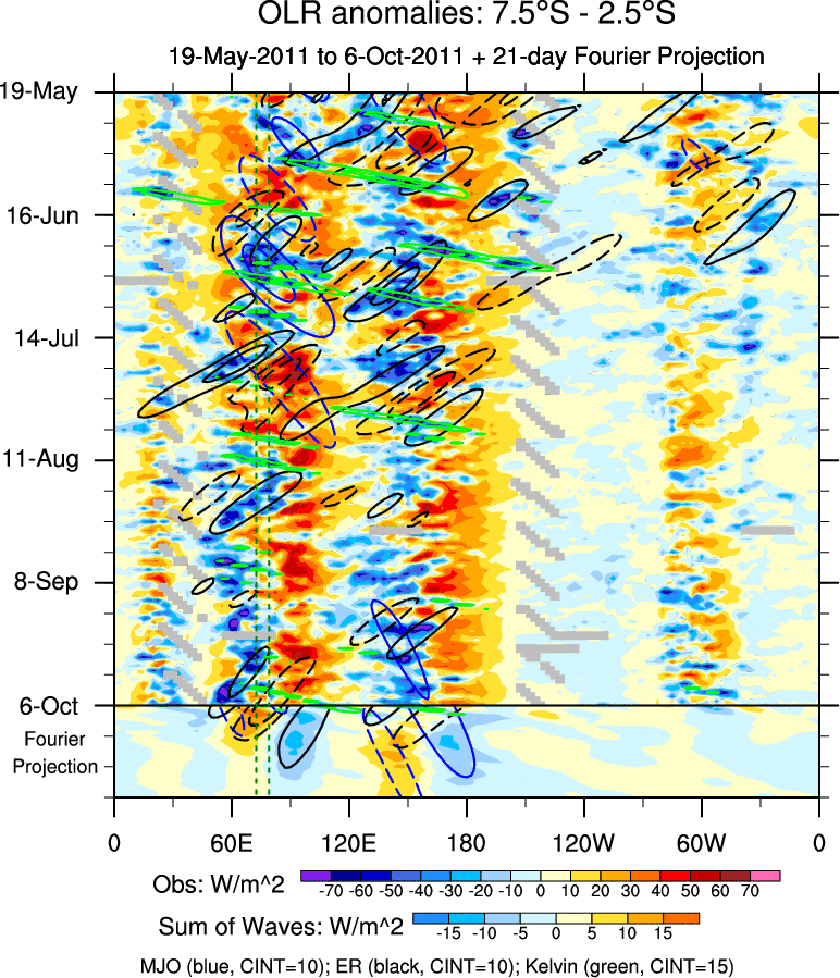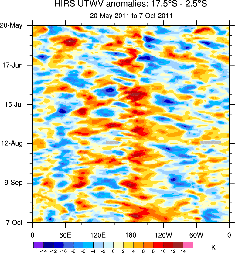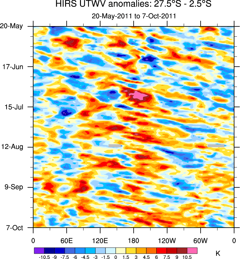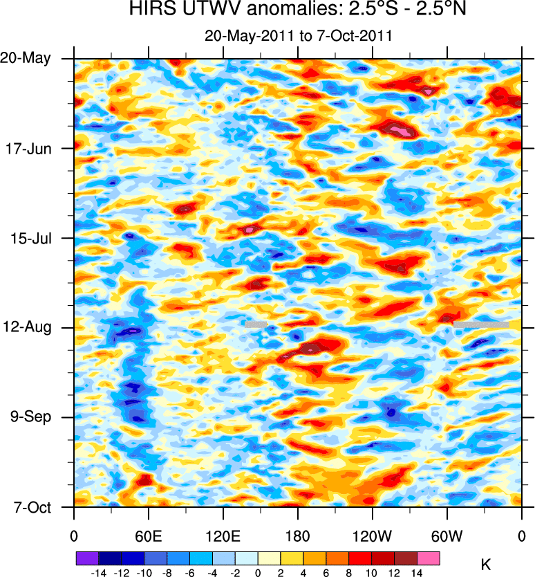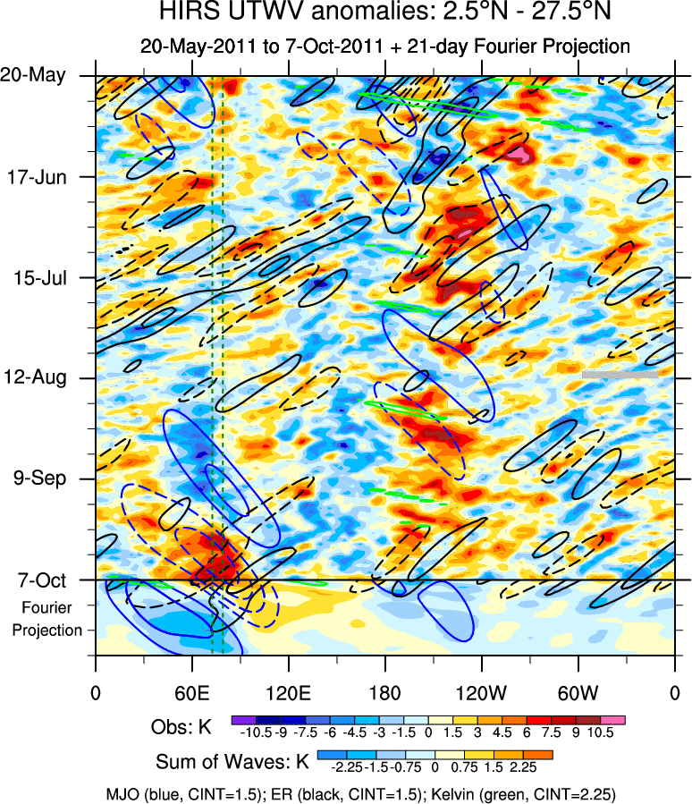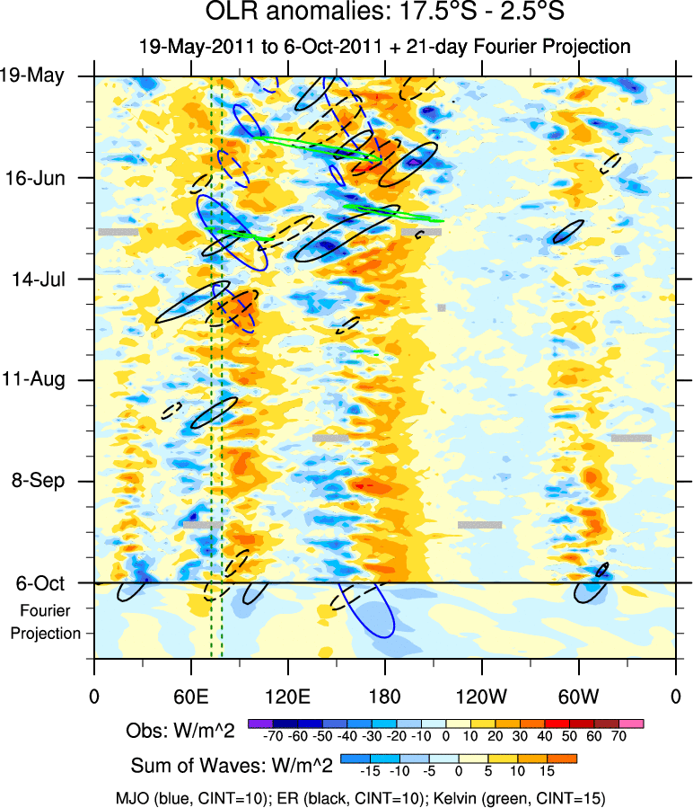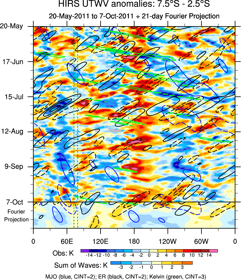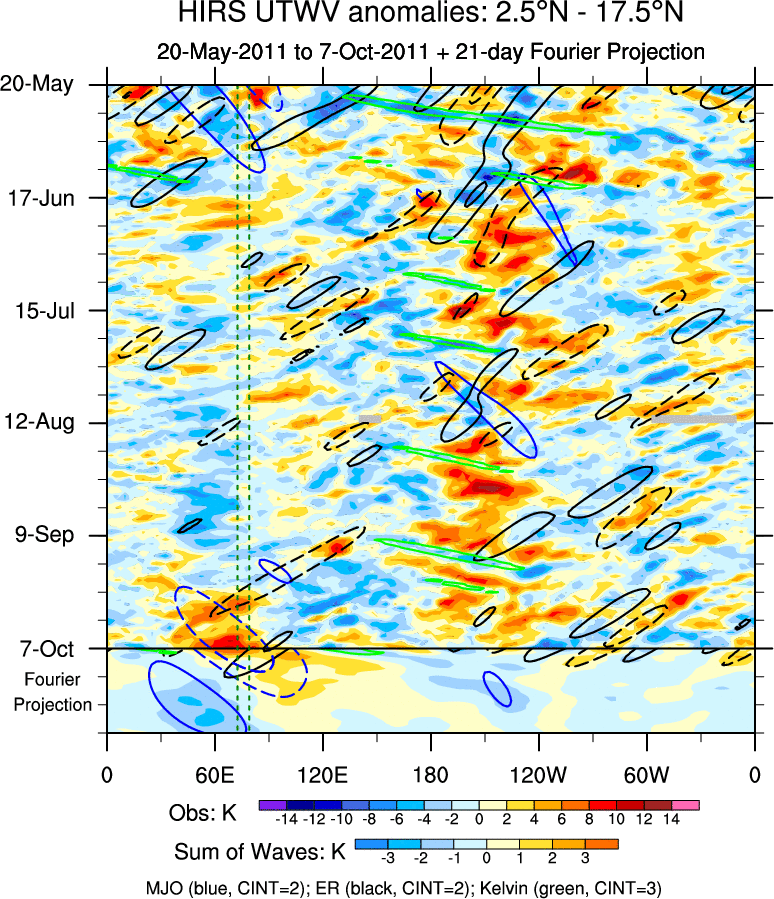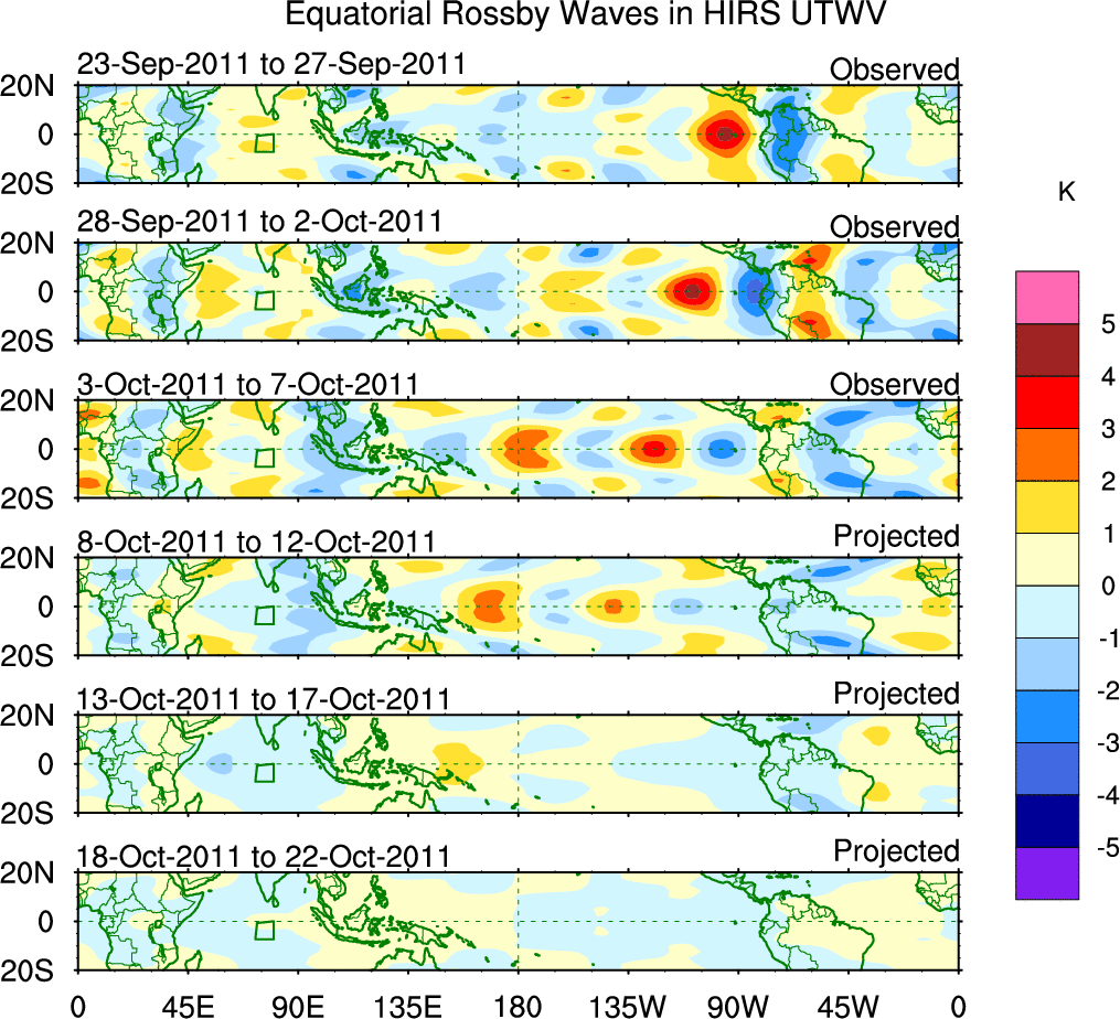 To identify tropical waves in near real-time, the OLR and UTWV data are filtered following Wheeler & Weickmann (2001 MWR). The daily anomalies are calculated using the first 3 harmonics of the seasonal cycle for 1979–2009. Missing values are then filled using linear interpolation in space and time. The most recent 365 days of anomalies are padded with 659 days of zeroes, and the result is filtered for each wave type.