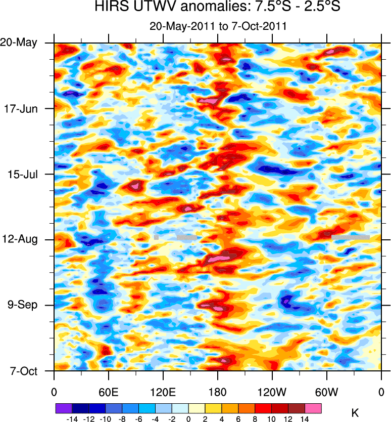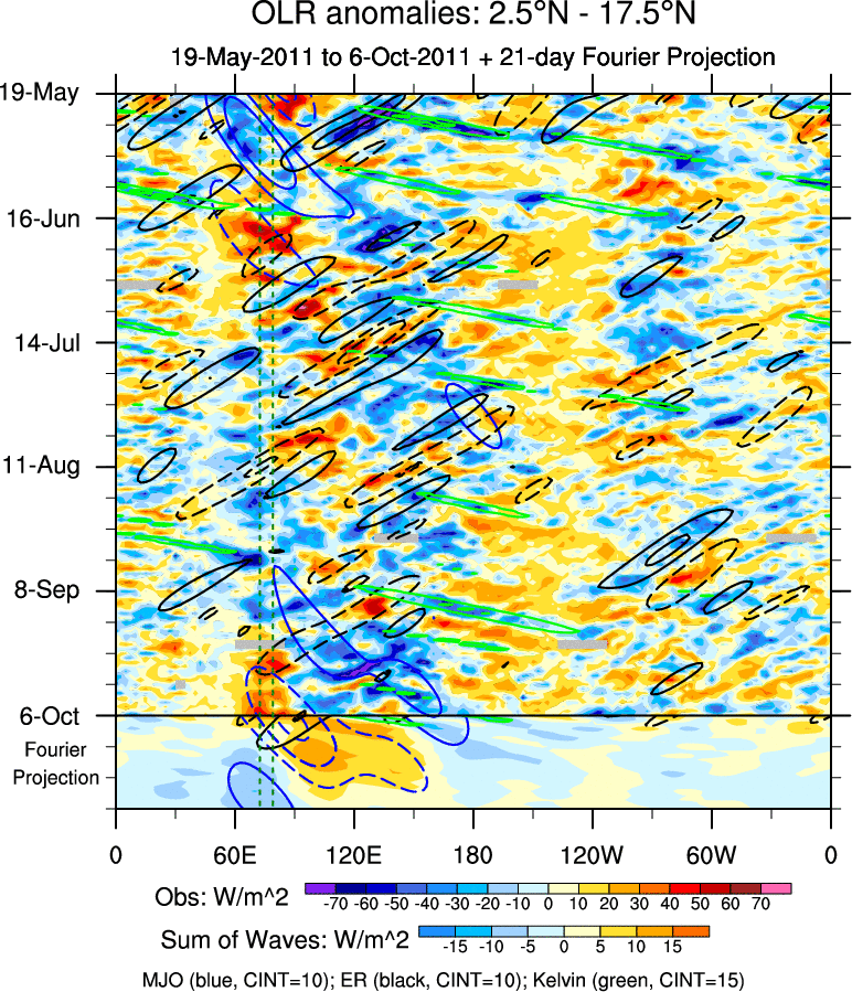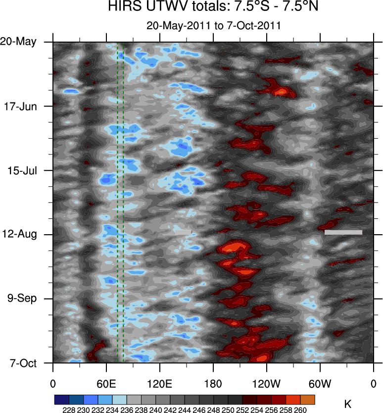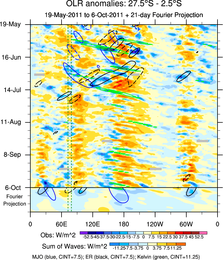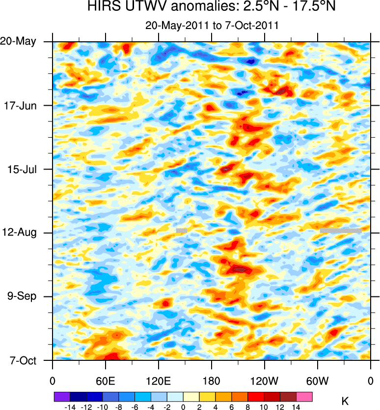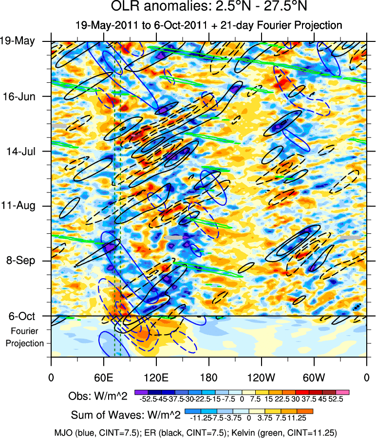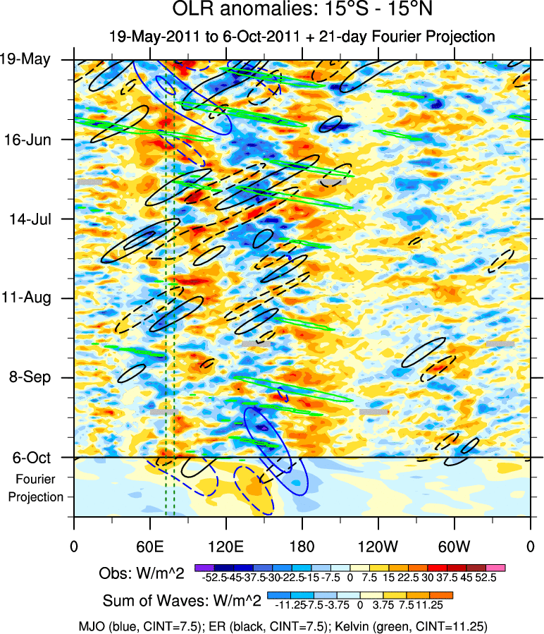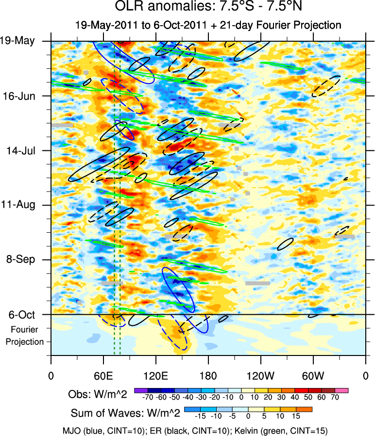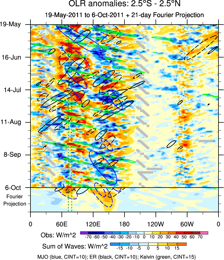 To identify tropical waves in near real-time, the OLR and UTWV data are filtered following Wheeler & Weickmann (2001 MWR). The daily anomalies are calculated using the first 3 harmonics of the seasonal cycle for 1979–2009. Missing values are then filled using linear interpolation in space and time. The most recent 365 days of anomalies are padded with 659 days of zeroes, and the result is filtered for each wave type.
