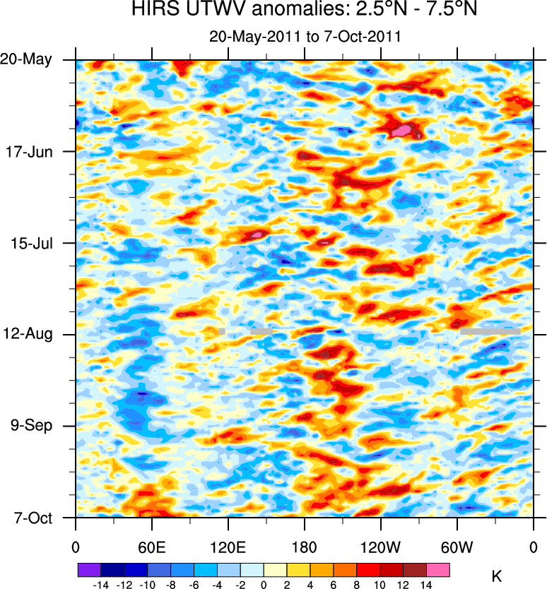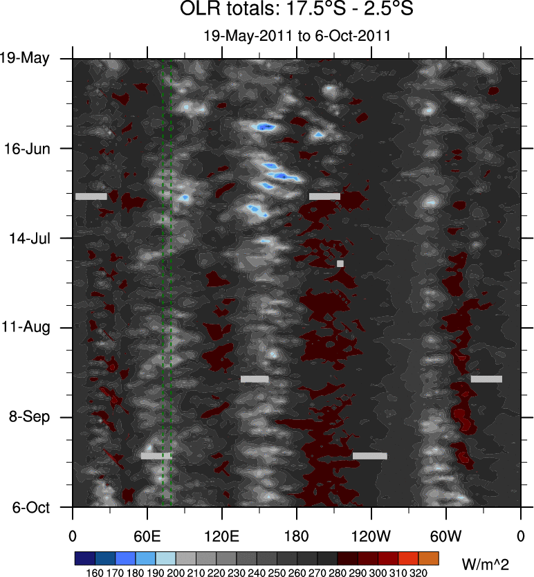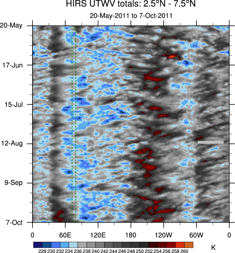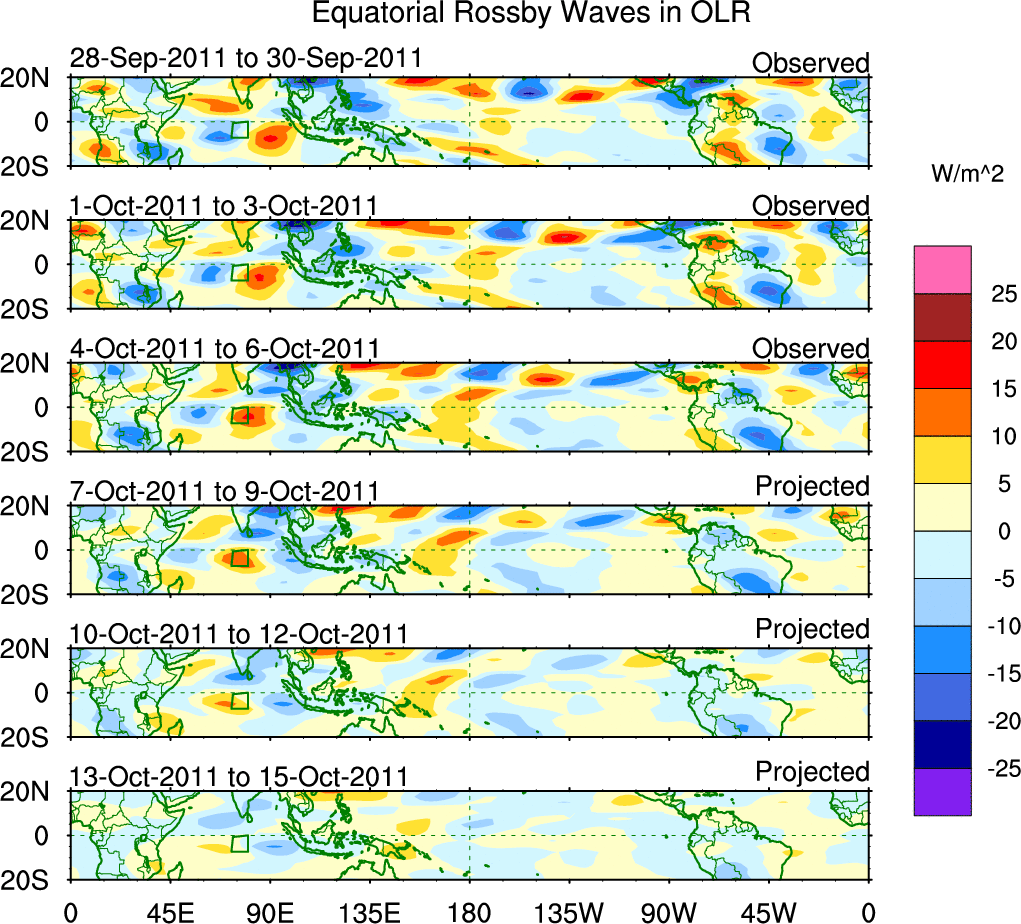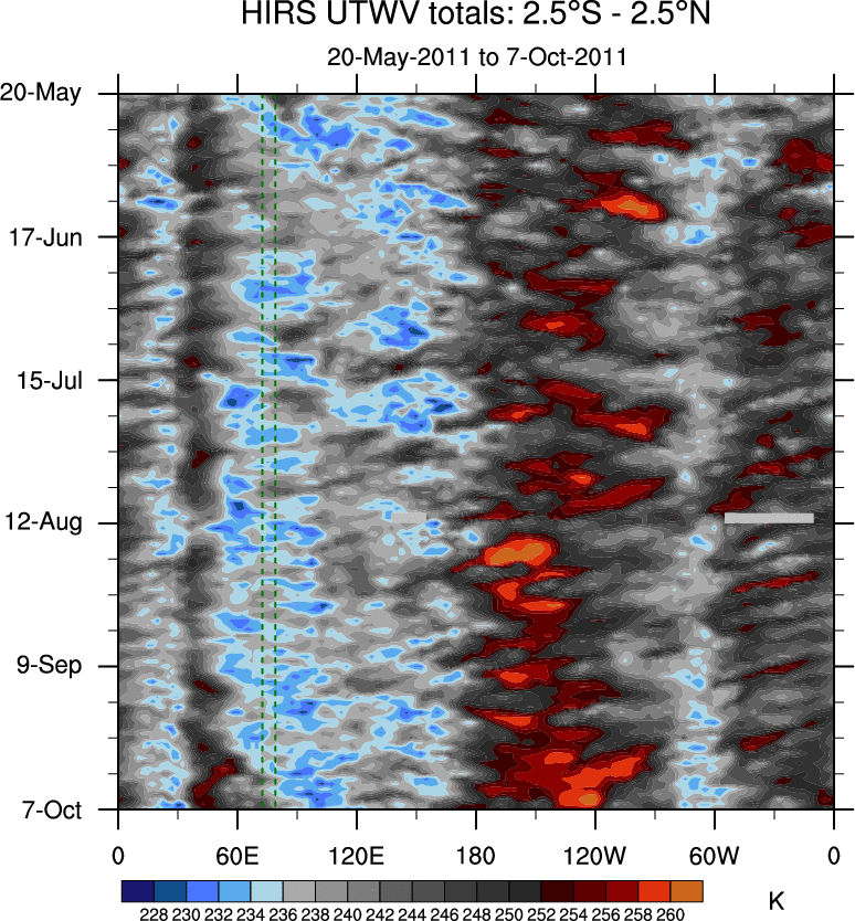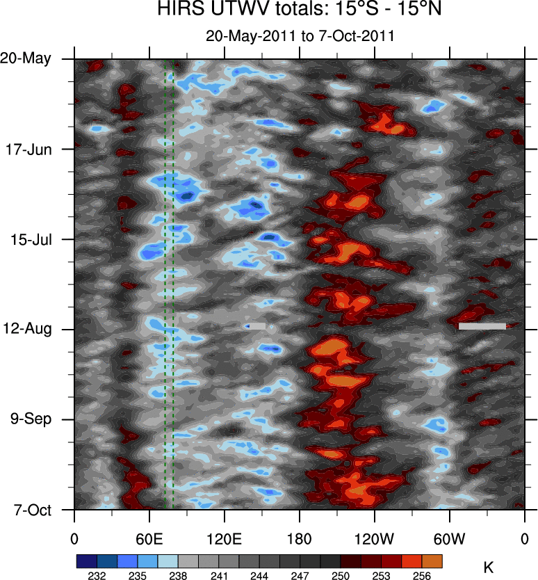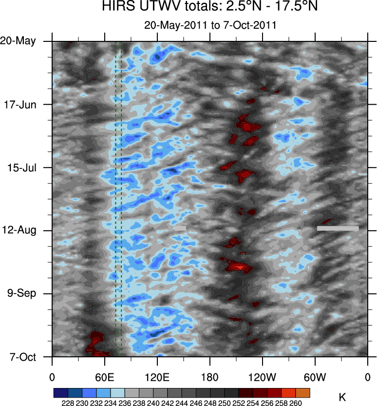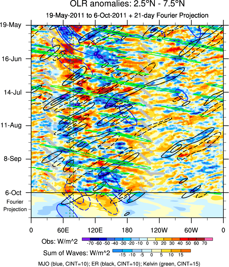 To identify tropical waves in near real-time, the OLR and UTWV data are filtered following Wheeler & Weickmann (2001 MWR). The daily anomalies are calculated using the first 3 harmonics of the seasonal cycle for 1979–2009. Missing values are then filled using linear interpolation in space and time. The most recent 365 days of anomalies are padded with 659 days of zeroes, and the result is filtered for each wave type.