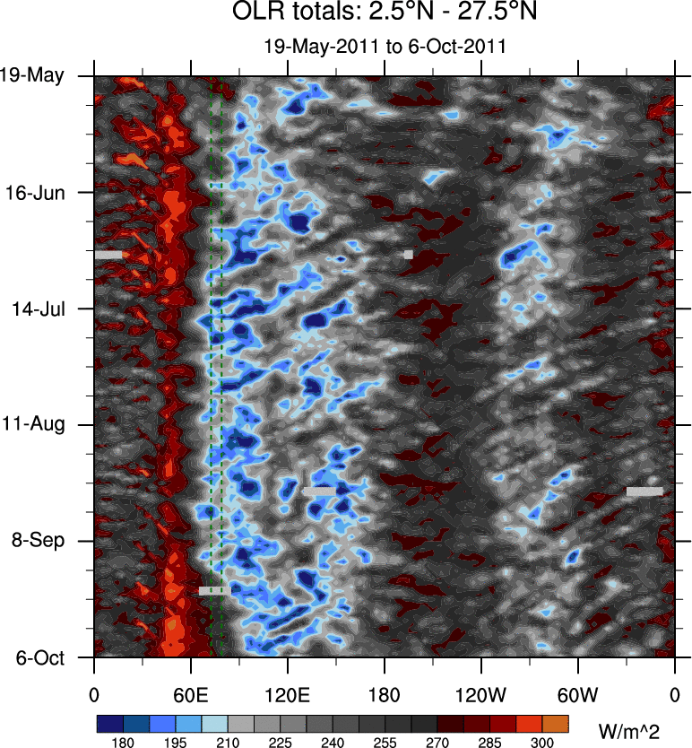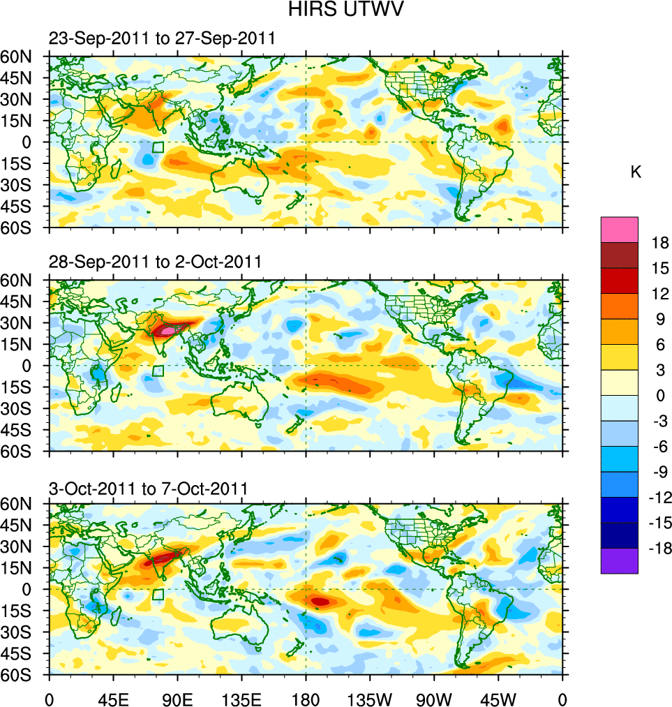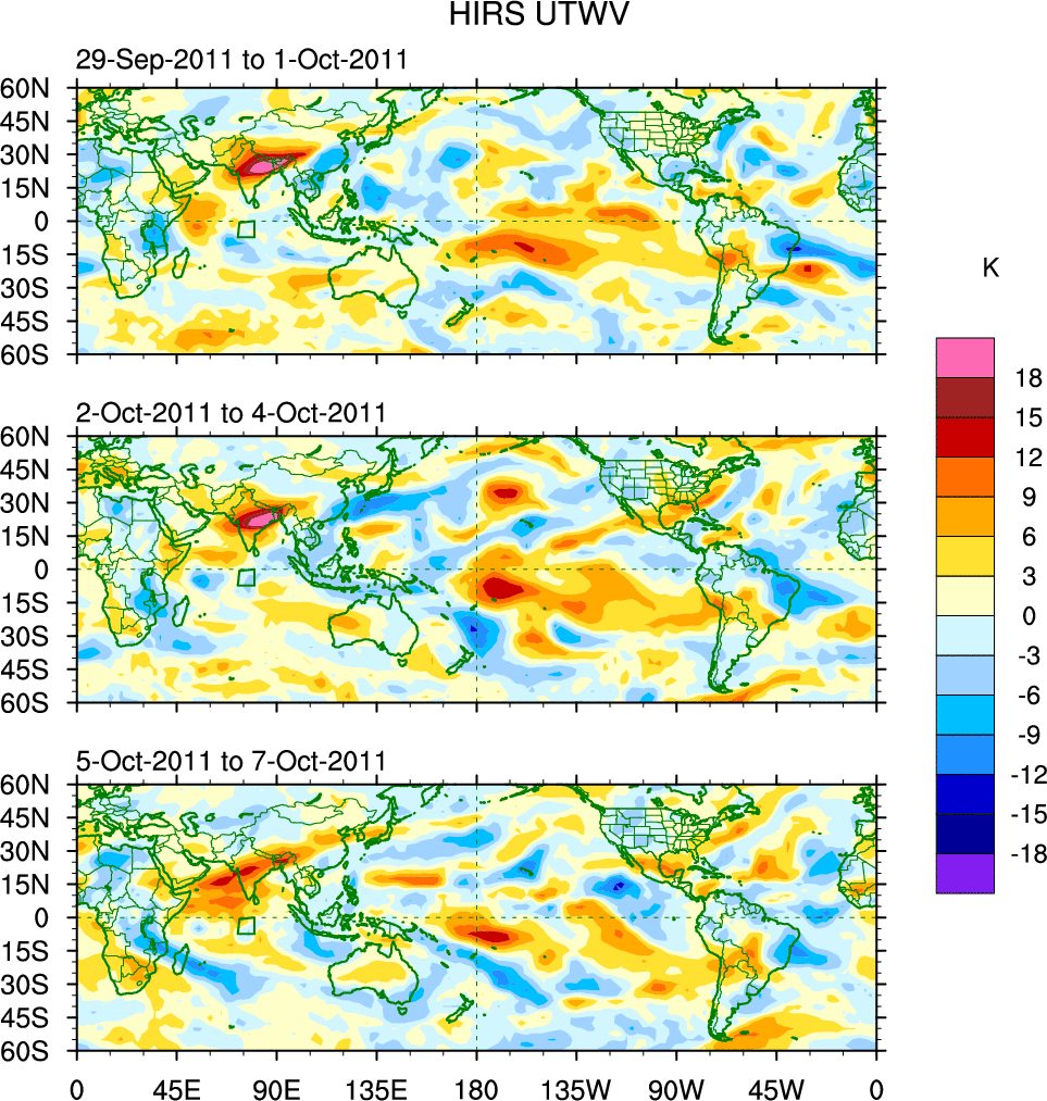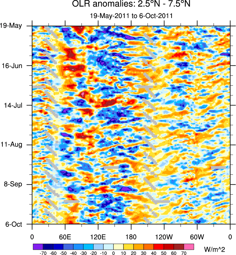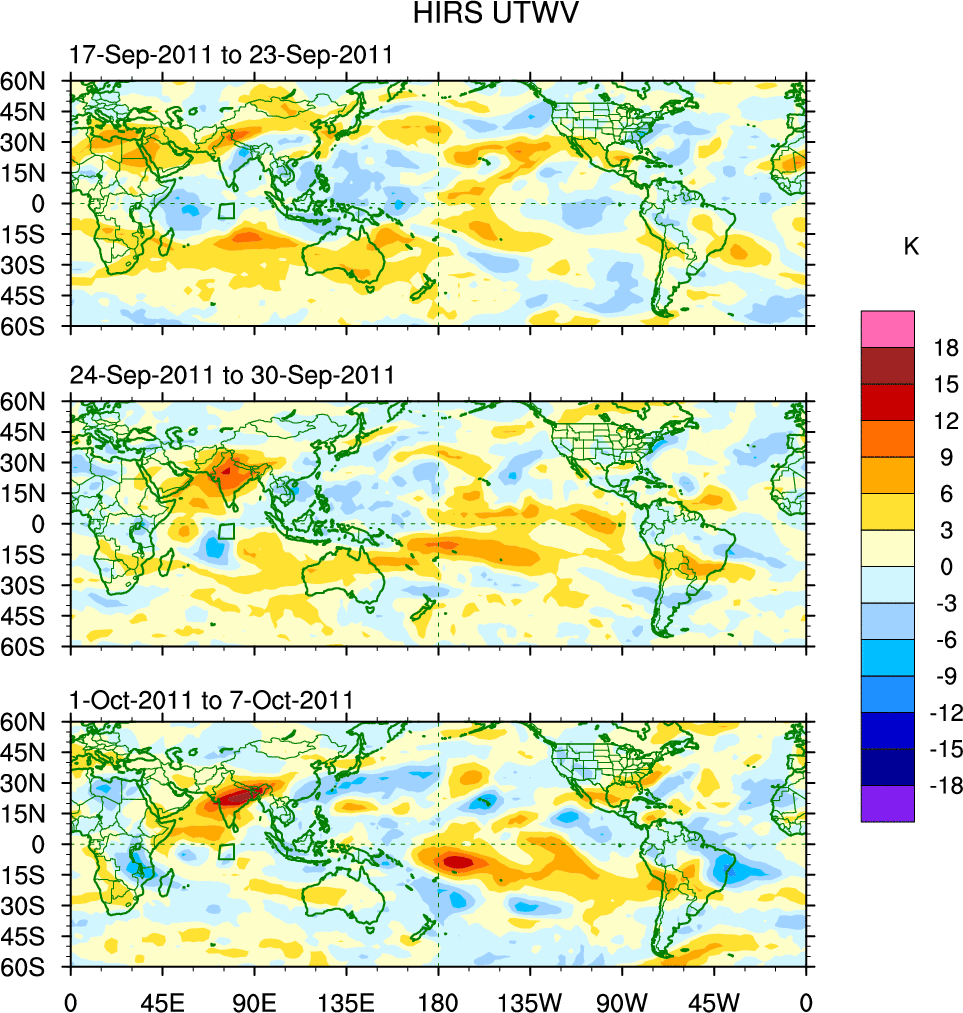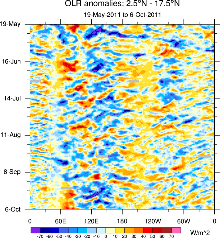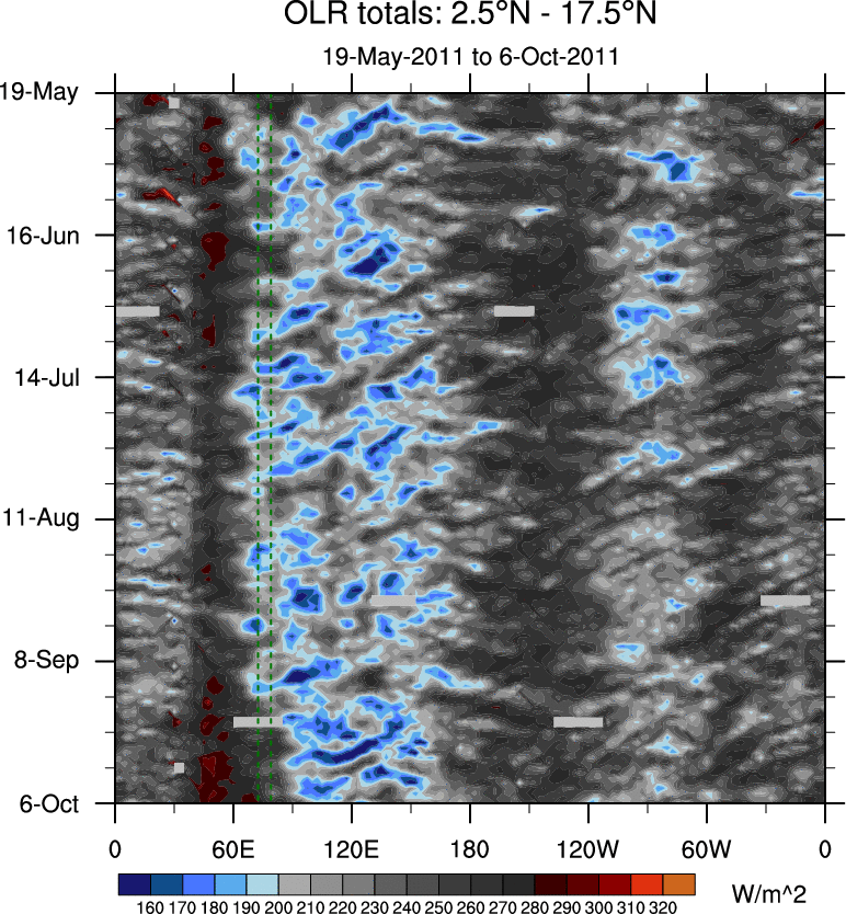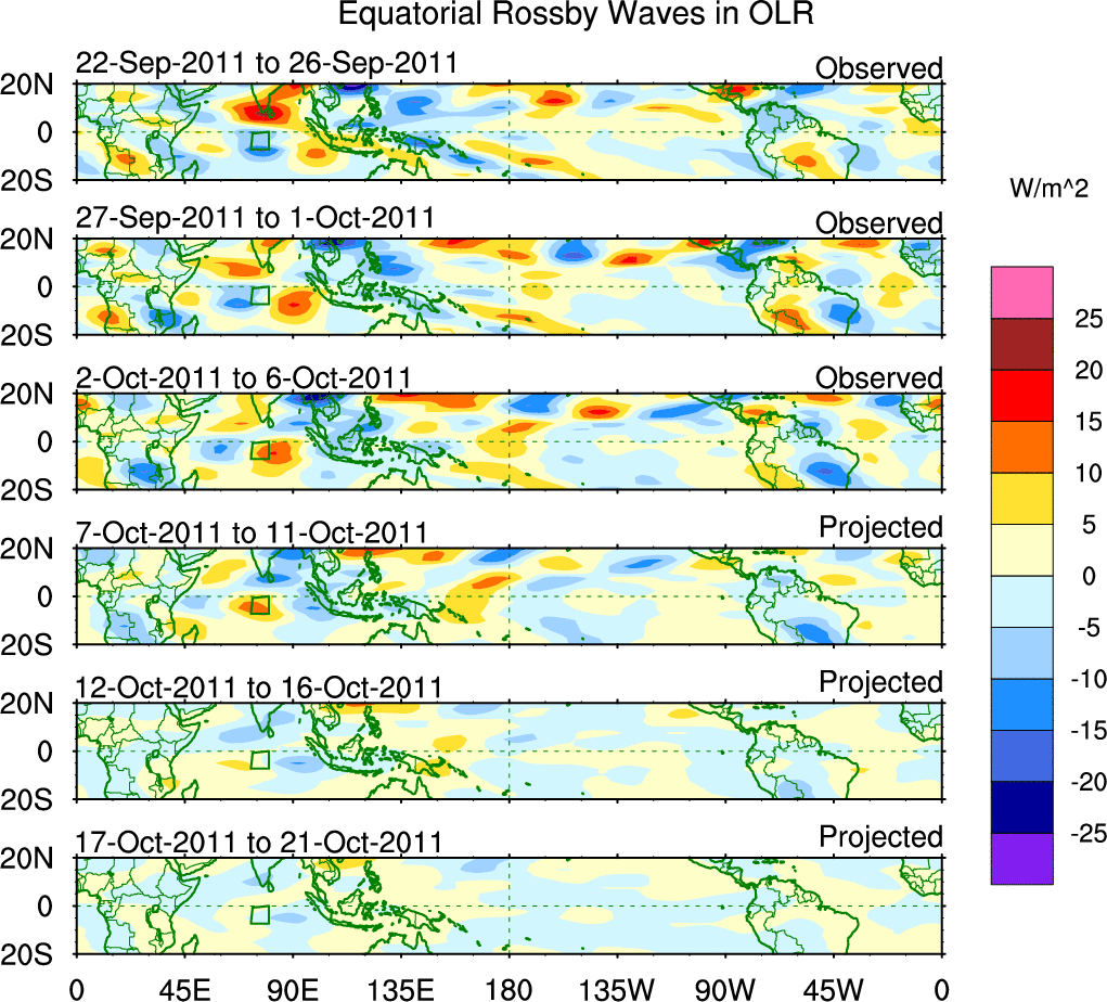 To identify tropical waves in near real-time, the OLR and UTWV data are filtered following Wheeler & Weickmann (2001 MWR). The daily anomalies are calculated using the first 3 harmonics of the seasonal cycle for 1979–2009. Missing values are then filled using linear interpolation in space and time. The most recent 365 days of anomalies are padded with 659 days of zeroes, and the result is filtered for each wave type.