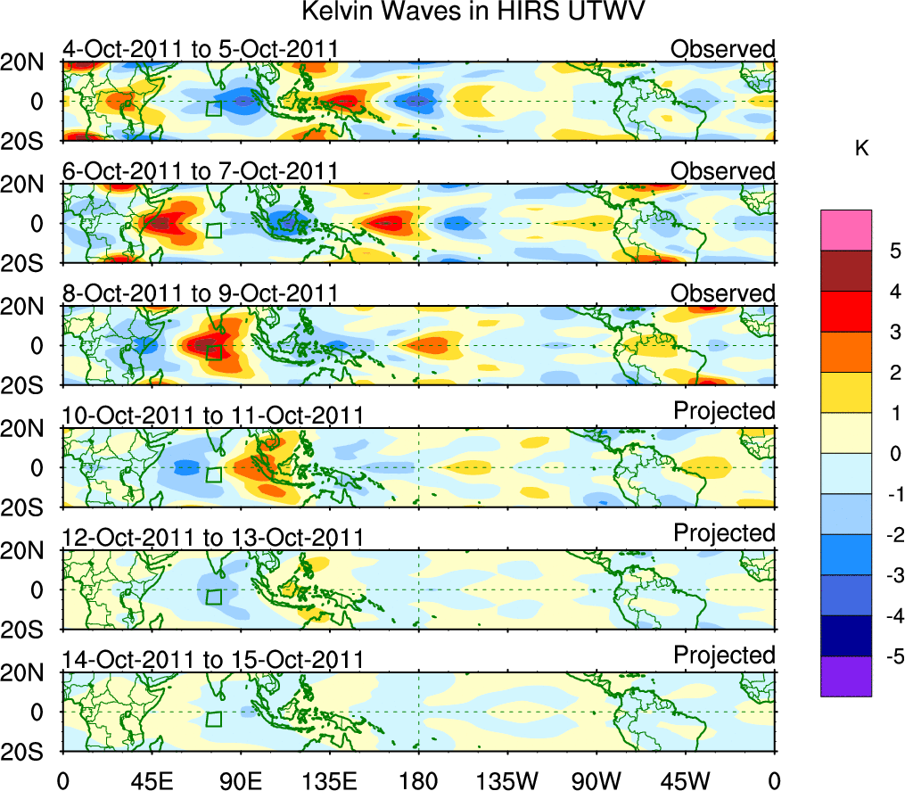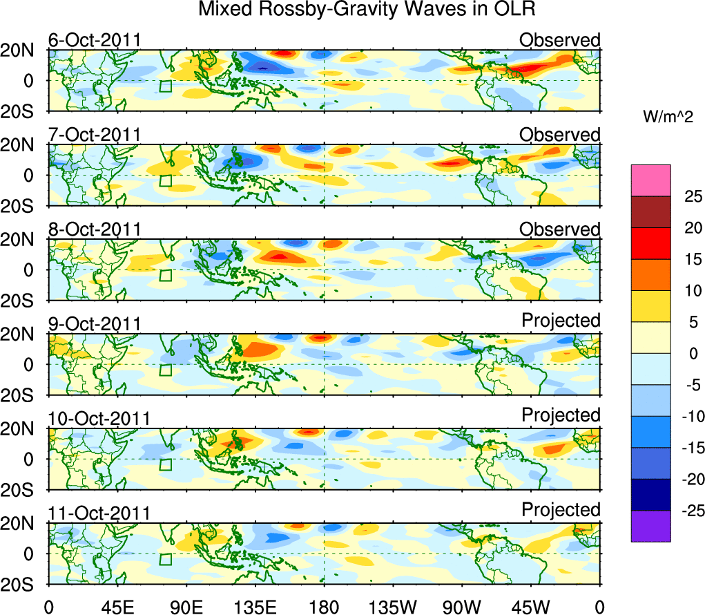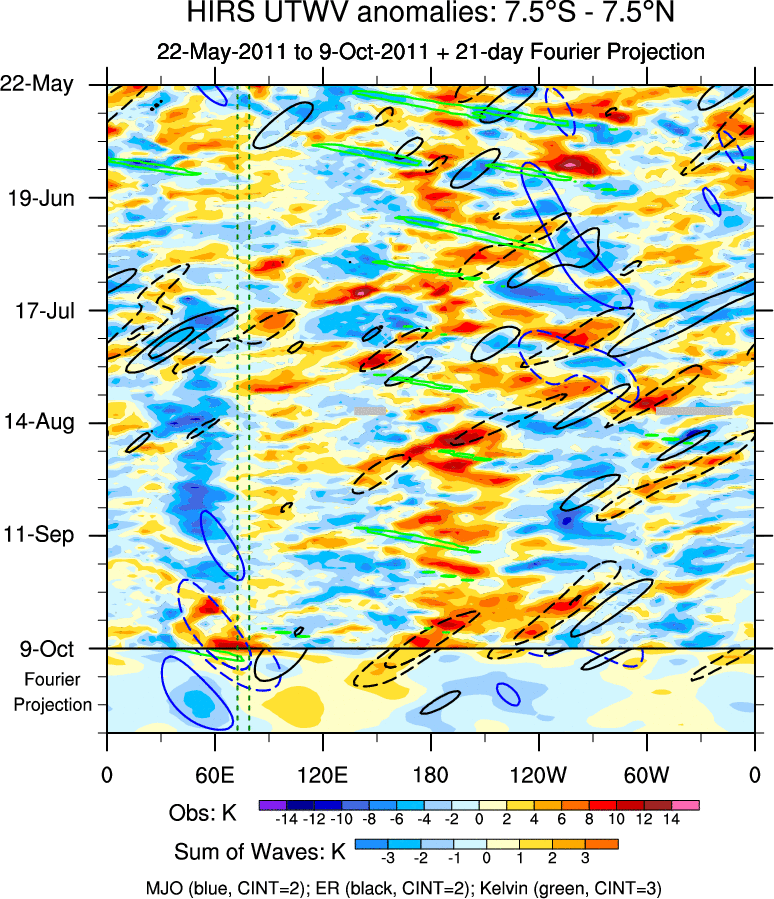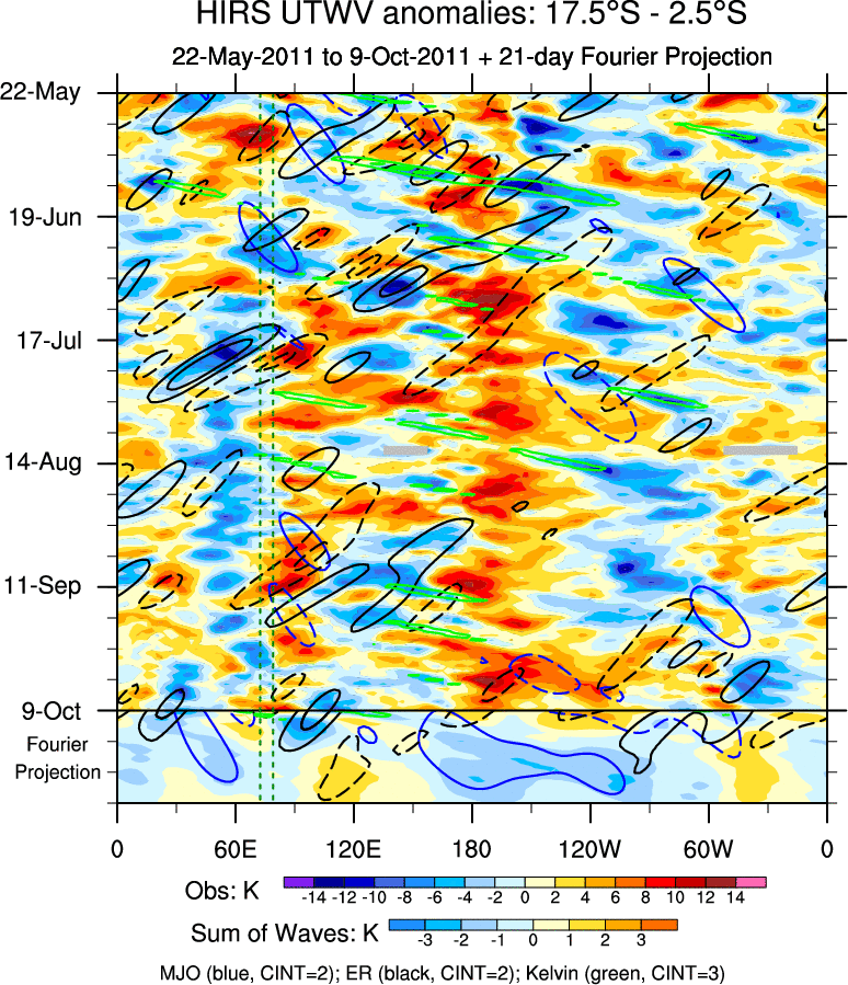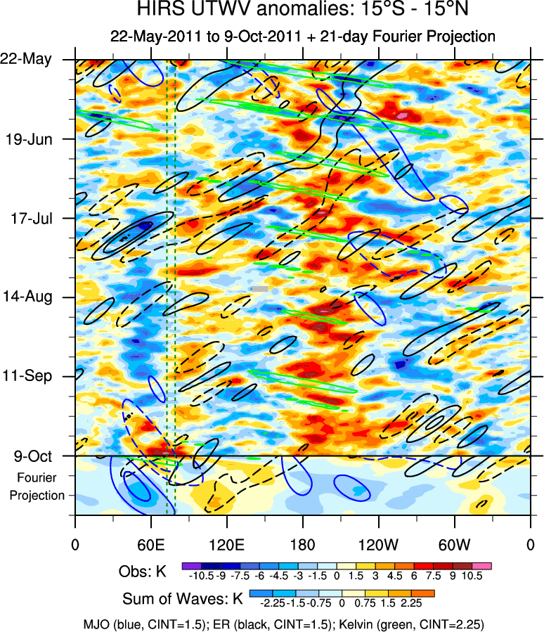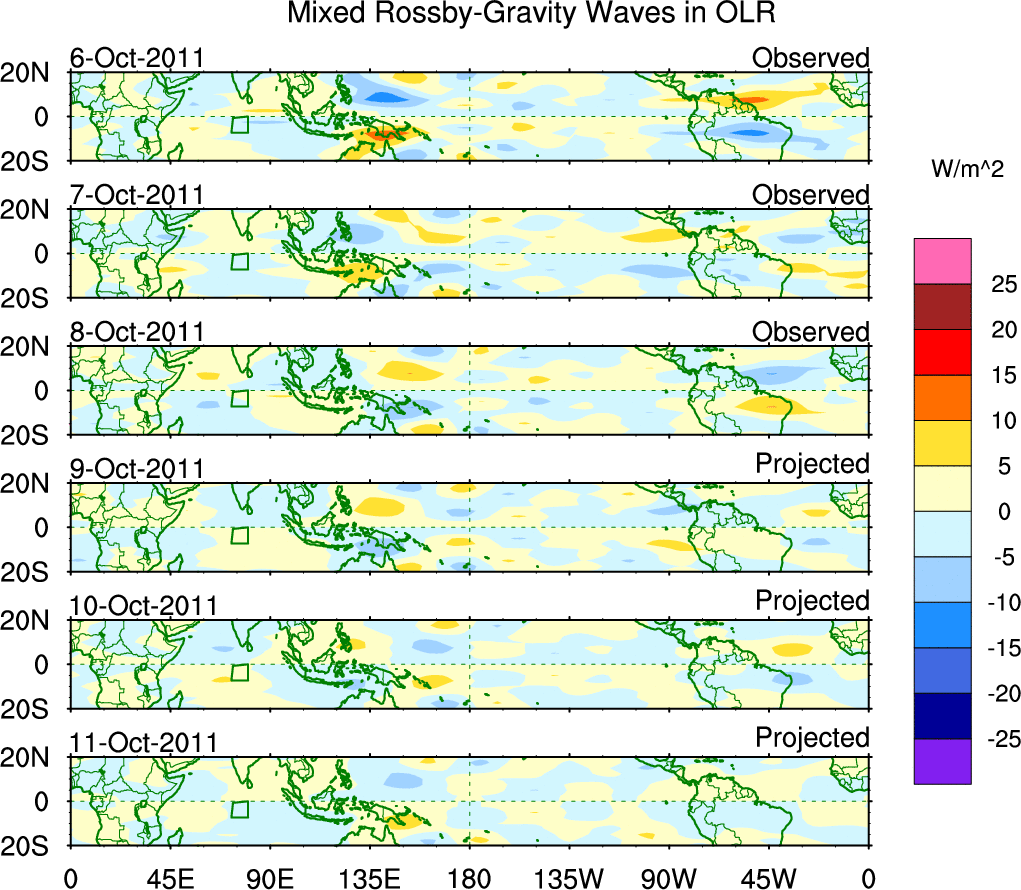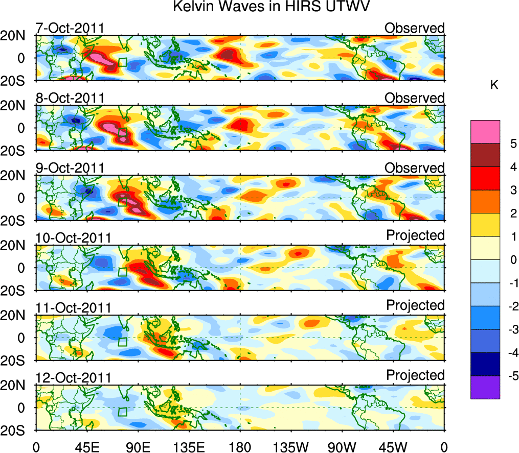 To identify tropical waves in near real-time, the OLR and UTWV data are filtered following Wheeler & Weickmann (2001 MWR). The daily anomalies are calculated using the first 3 harmonics of the seasonal cycle for 1979–2009. Missing values are then filled using linear interpolation in space and time. The most recent 365 days of anomalies are padded with 659 days of zeroes, and the result is filtered for each wave type.