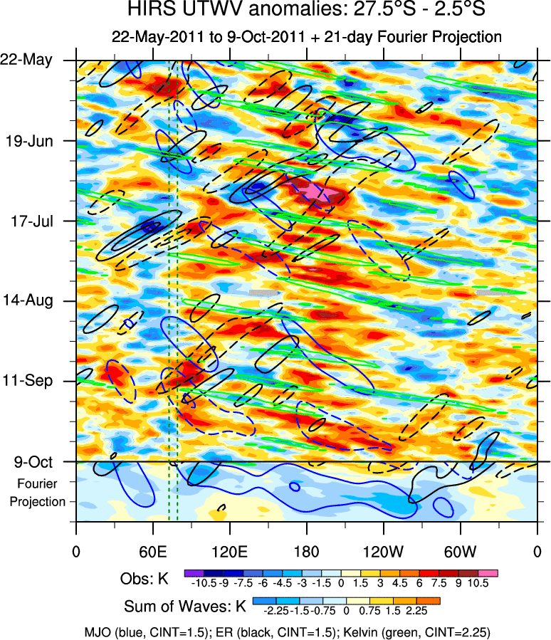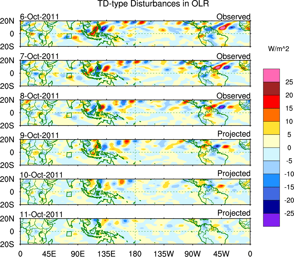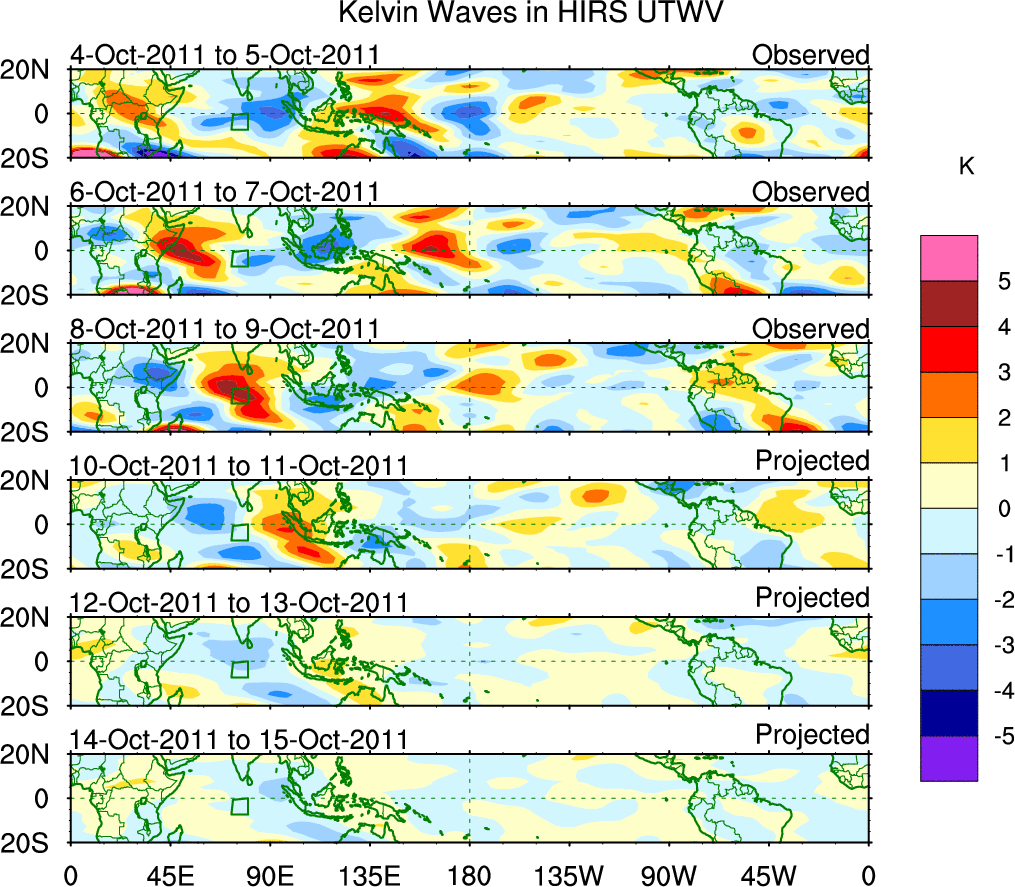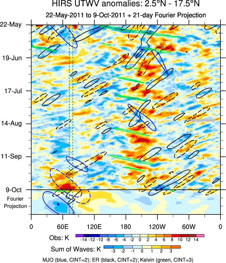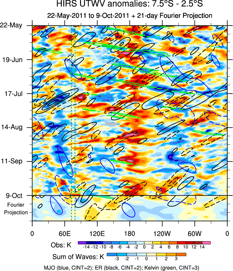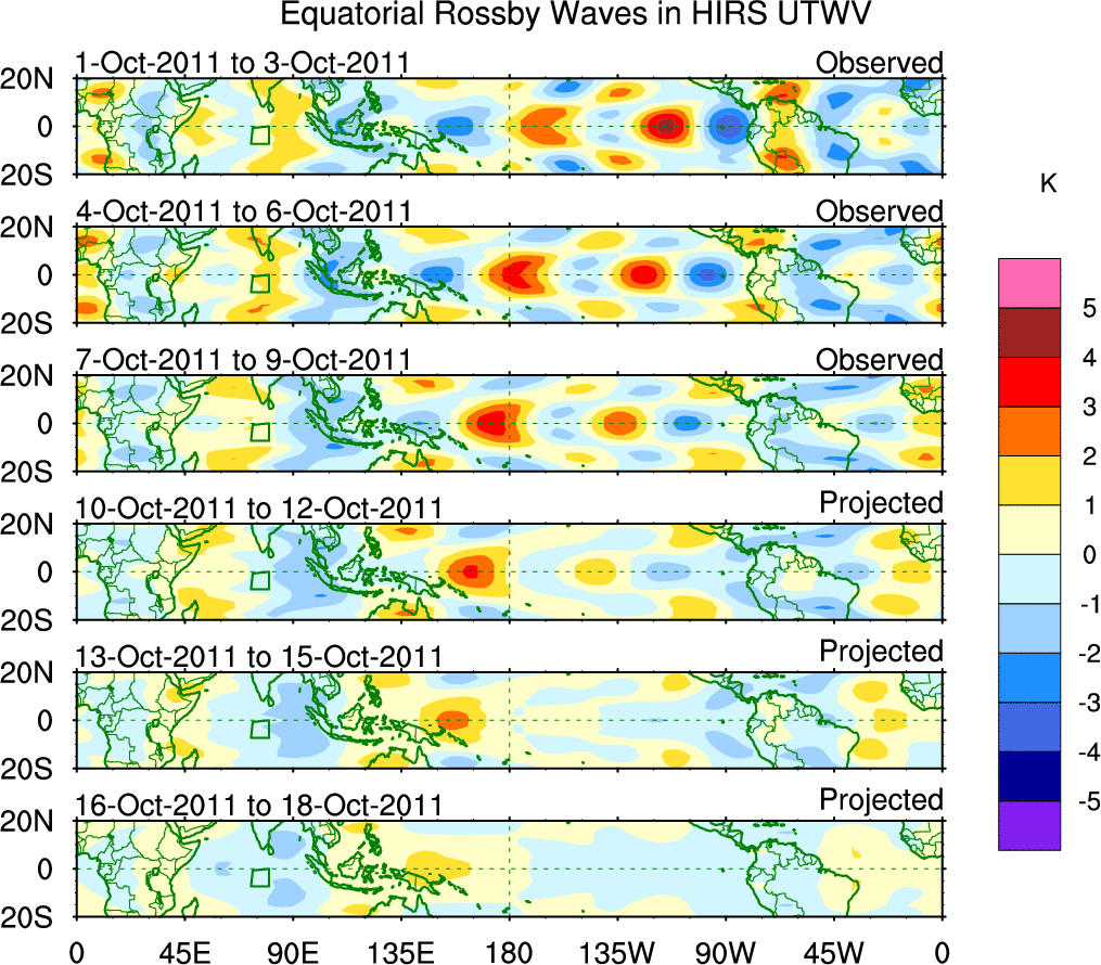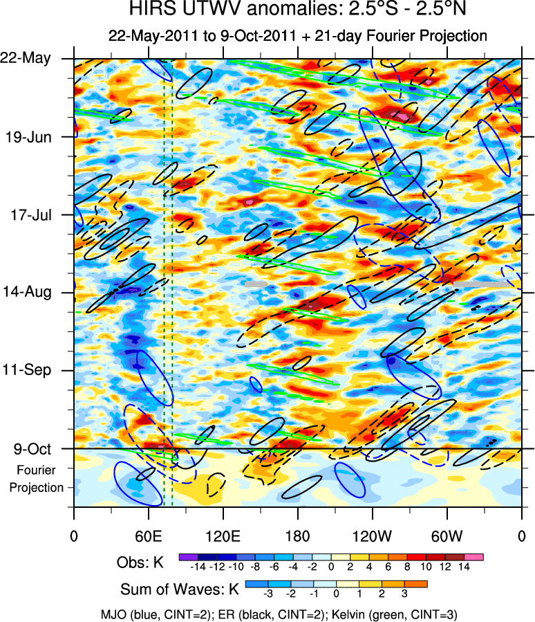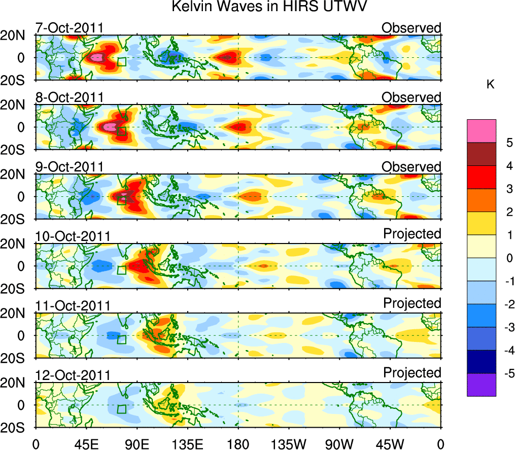 To identify tropical waves in near real-time, the OLR and UTWV data are filtered following Wheeler & Weickmann (2001 MWR). The daily anomalies are calculated using the first 3 harmonics of the seasonal cycle for 1979–2009. Missing values are then filled using linear interpolation in space and time. The most recent 365 days of anomalies are padded with 659 days of zeroes, and the result is filtered for each wave type.
