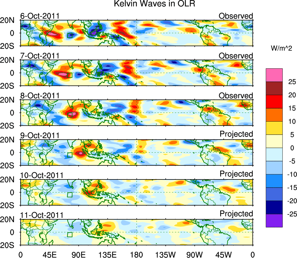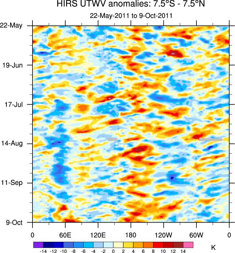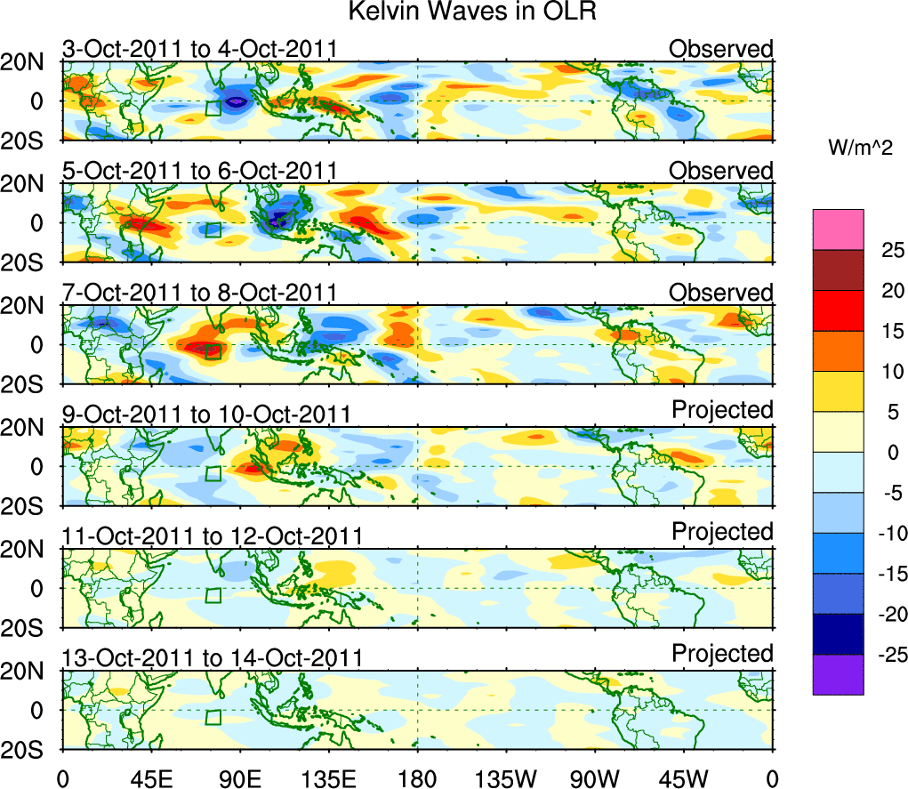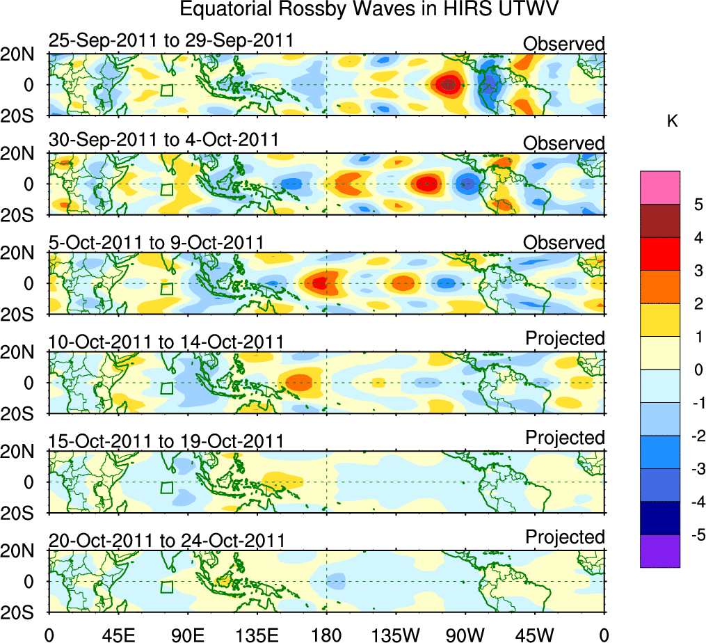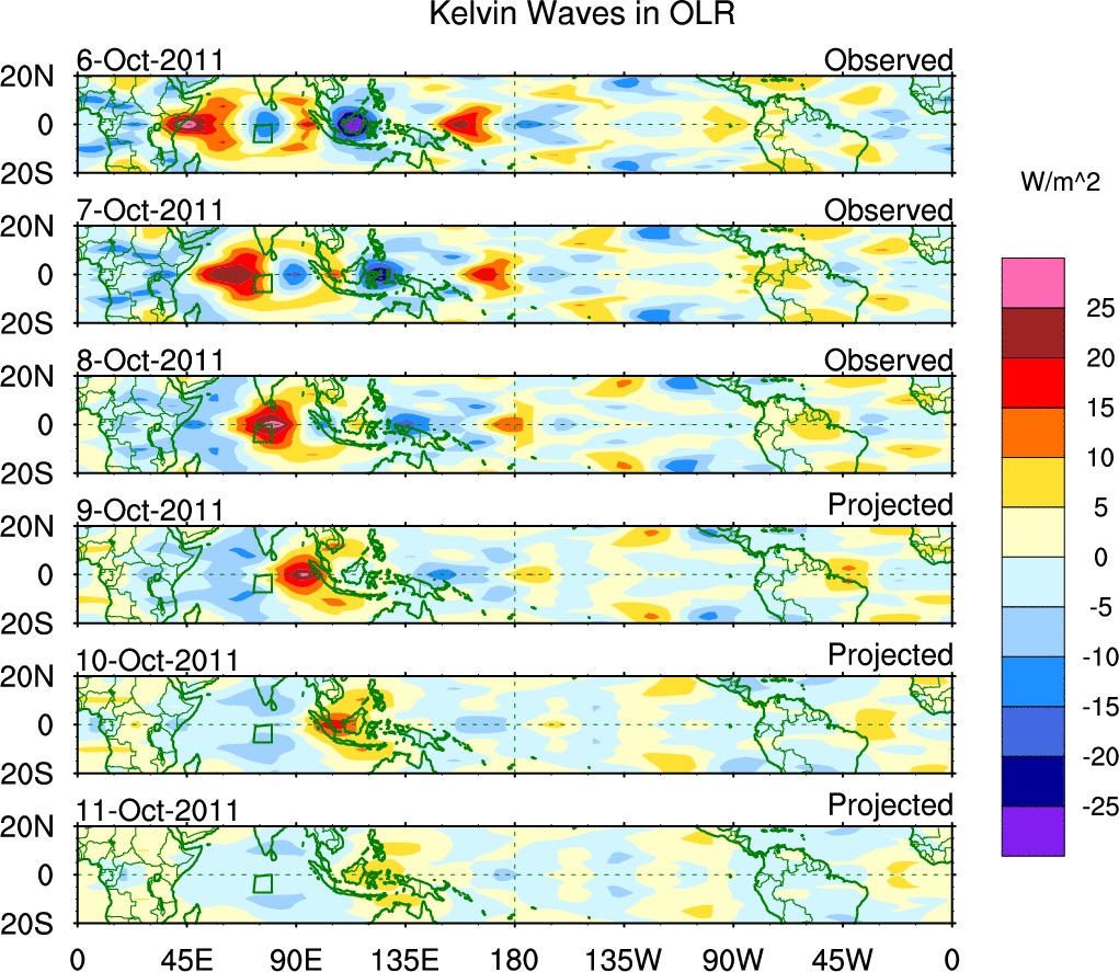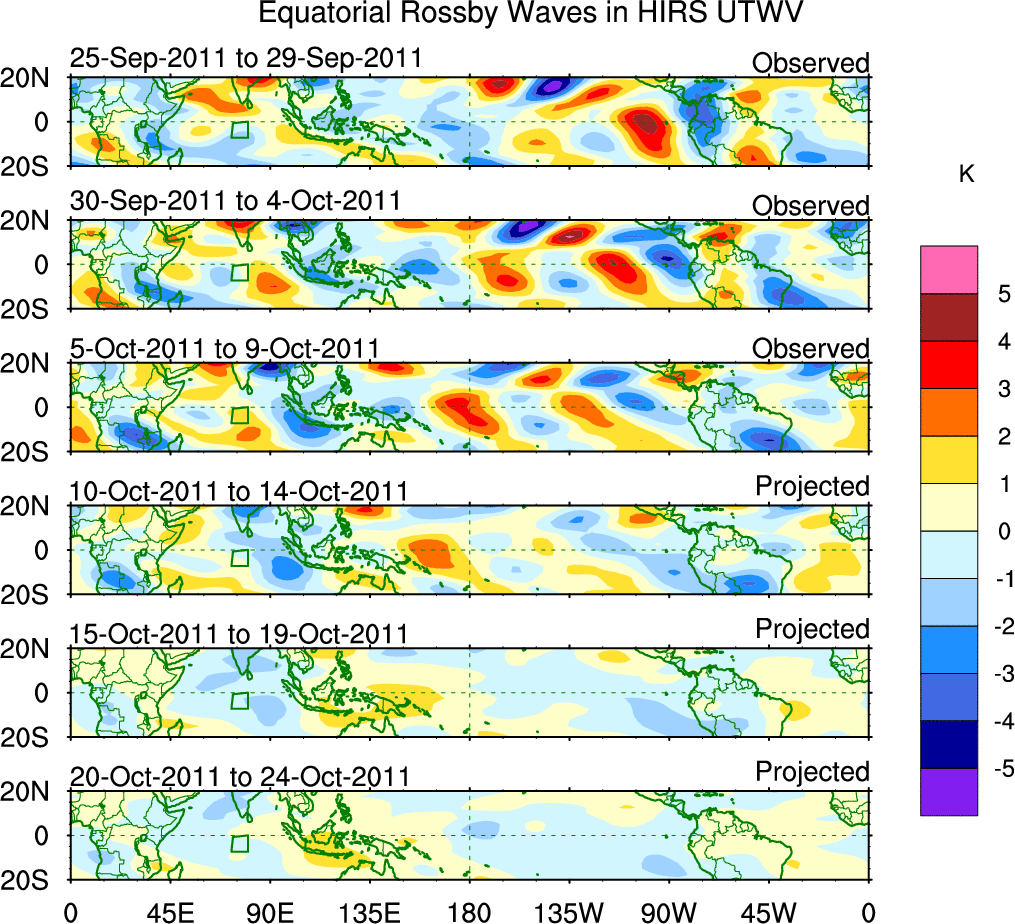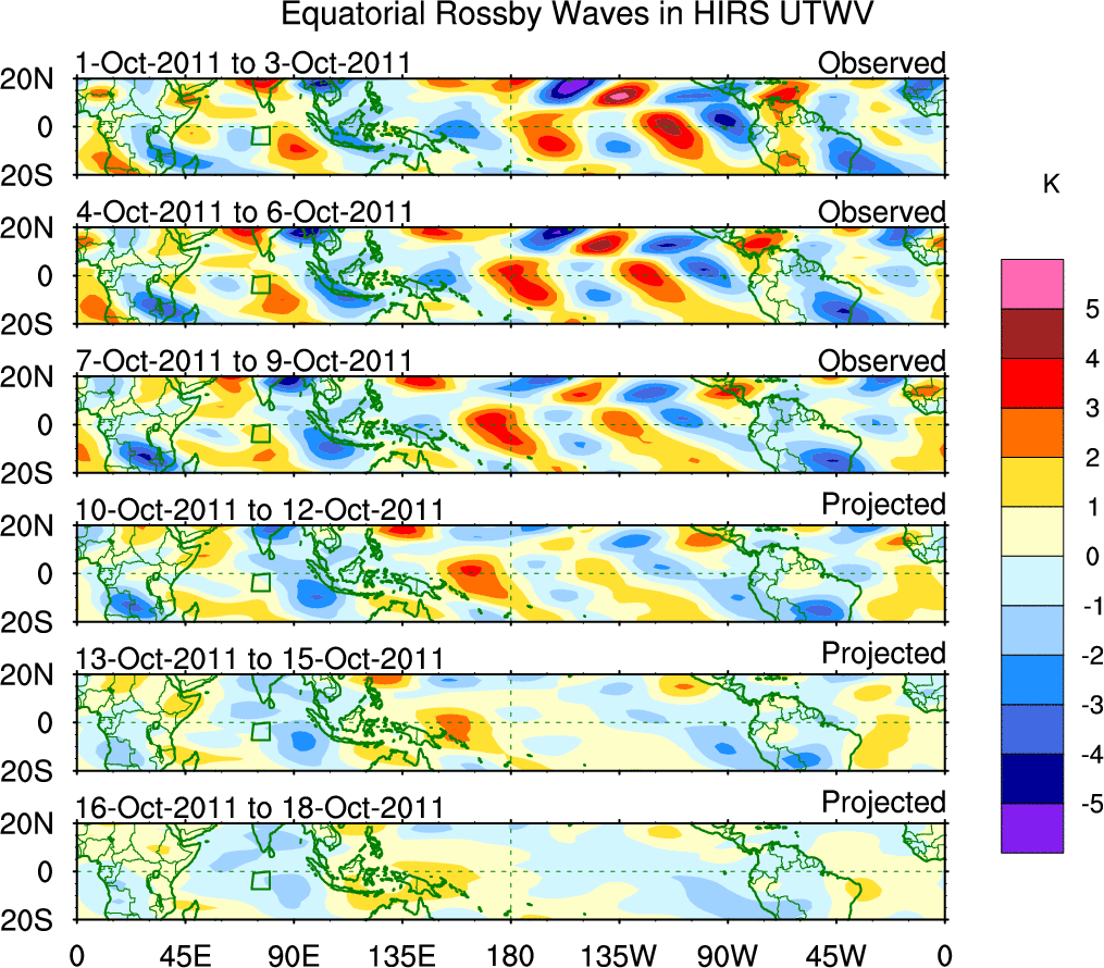 To identify tropical waves in near real-time, the OLR and UTWV data are filtered following Wheeler & Weickmann (2001 MWR). The daily anomalies are calculated using the first 3 harmonics of the seasonal cycle for 1979–2009. Missing values are then filled using linear interpolation in space and time. The most recent 365 days of anomalies are padded with 659 days of zeroes, and the result is filtered for each wave type.
