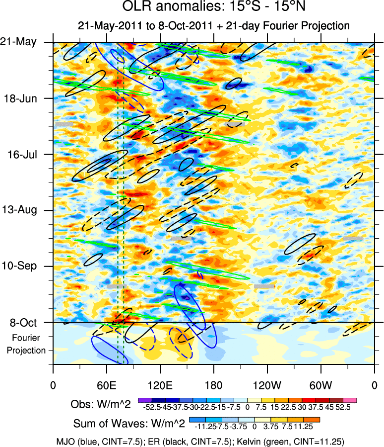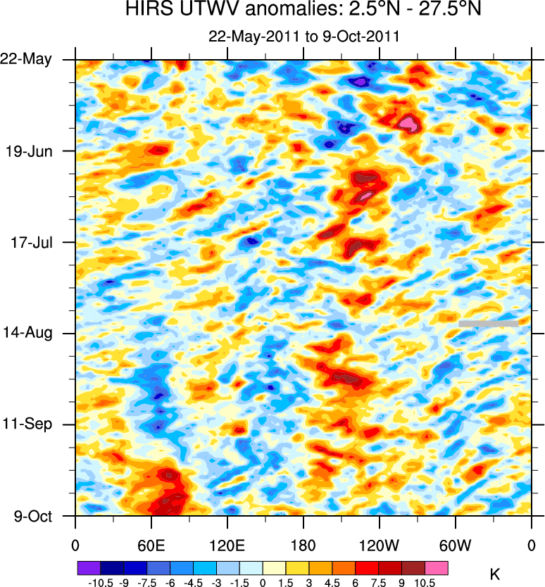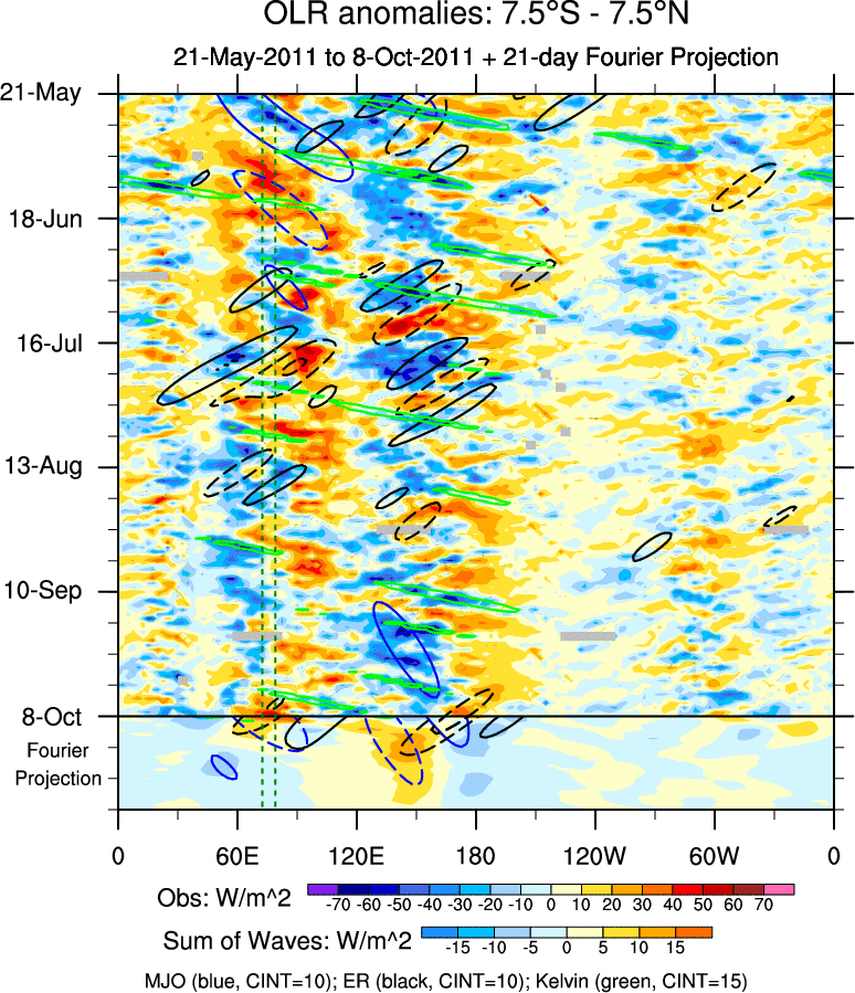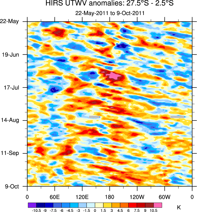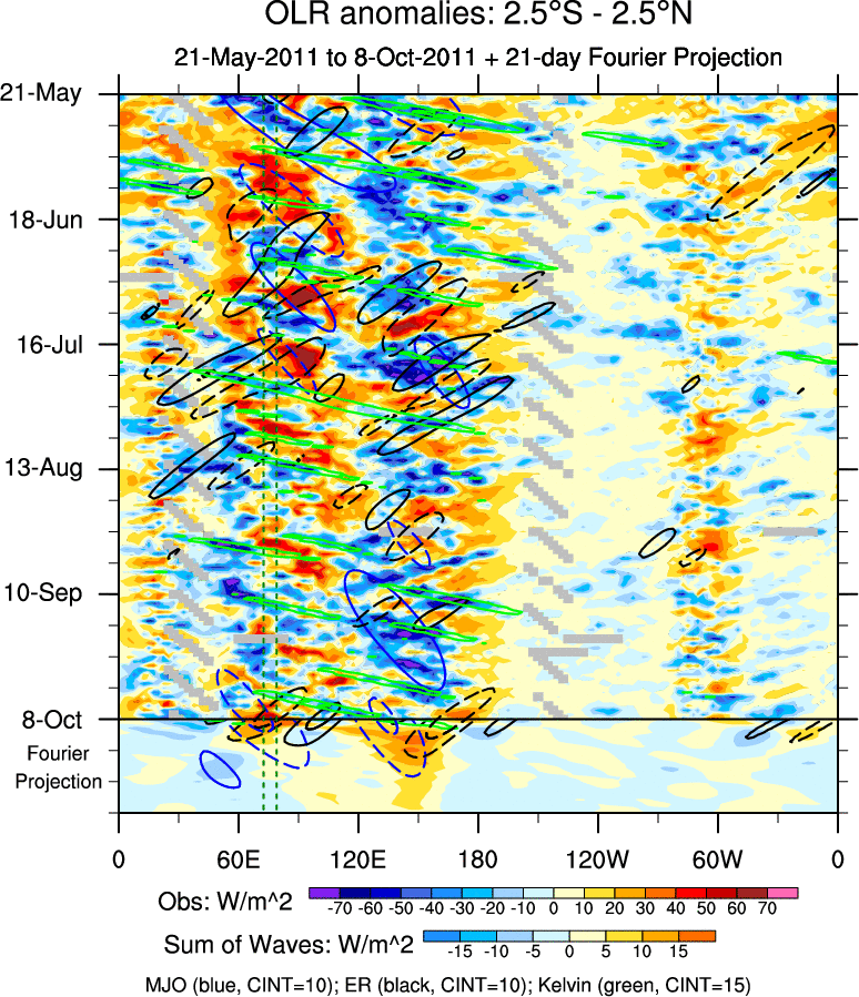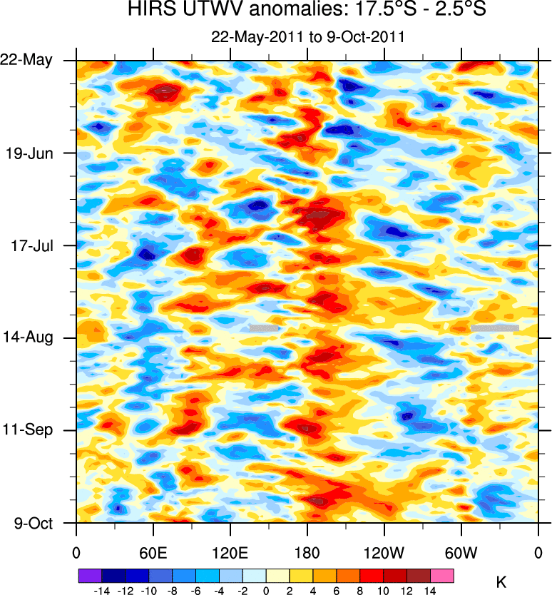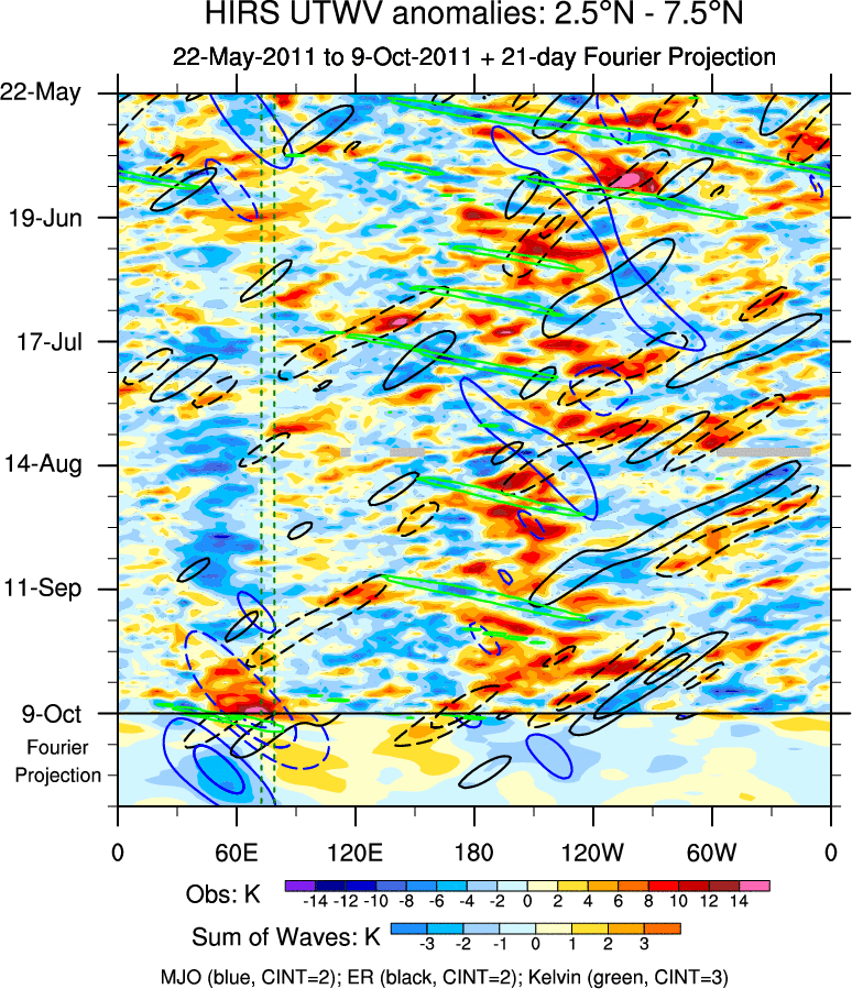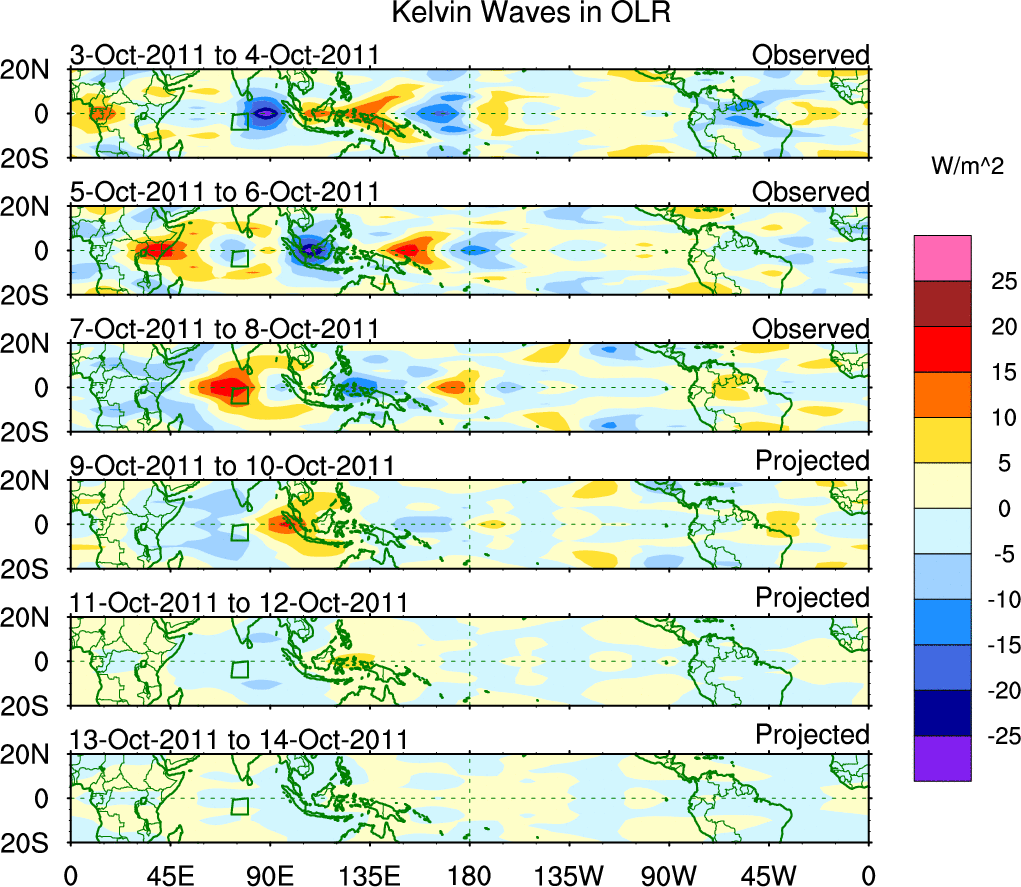 To identify tropical waves in near real-time, the OLR and UTWV data are filtered following Wheeler & Weickmann (2001 MWR). The daily anomalies are calculated using the first 3 harmonics of the seasonal cycle for 1979–2009. Missing values are then filled using linear interpolation in space and time. The most recent 365 days of anomalies are padded with 659 days of zeroes, and the result is filtered for each wave type.
