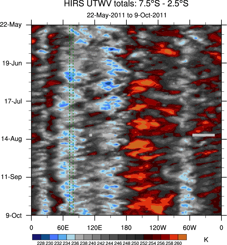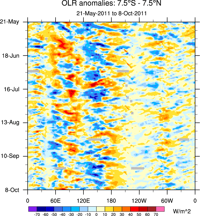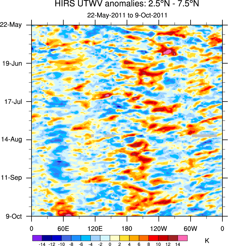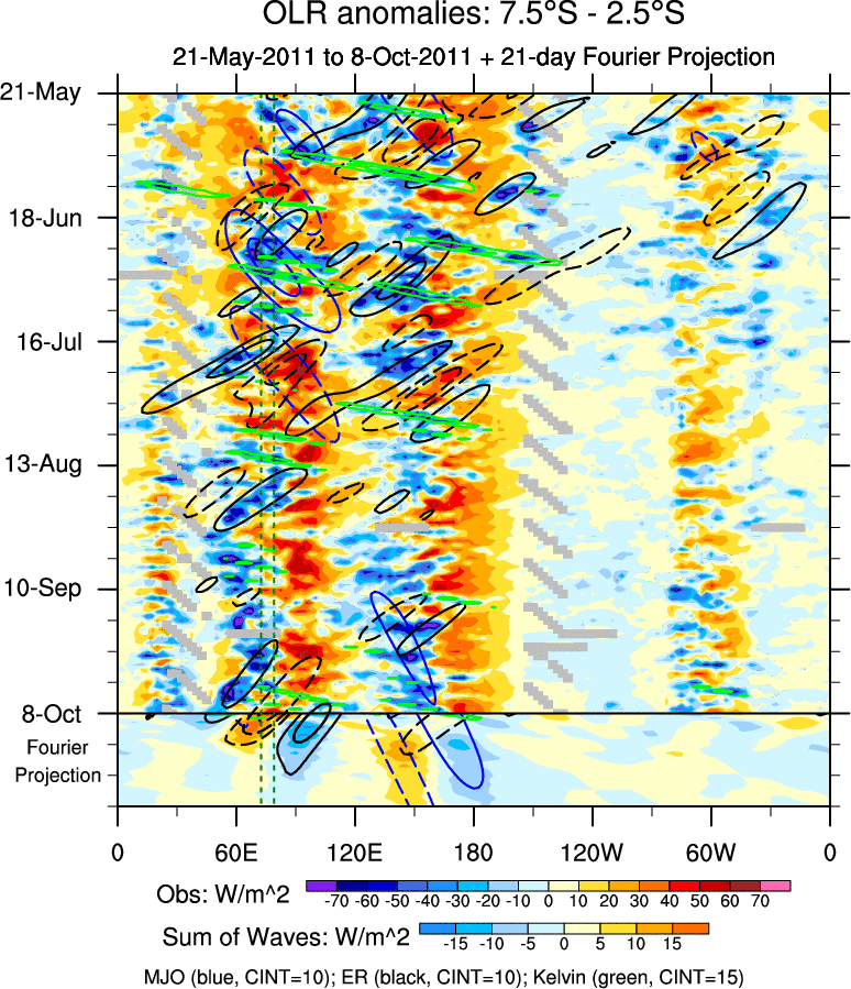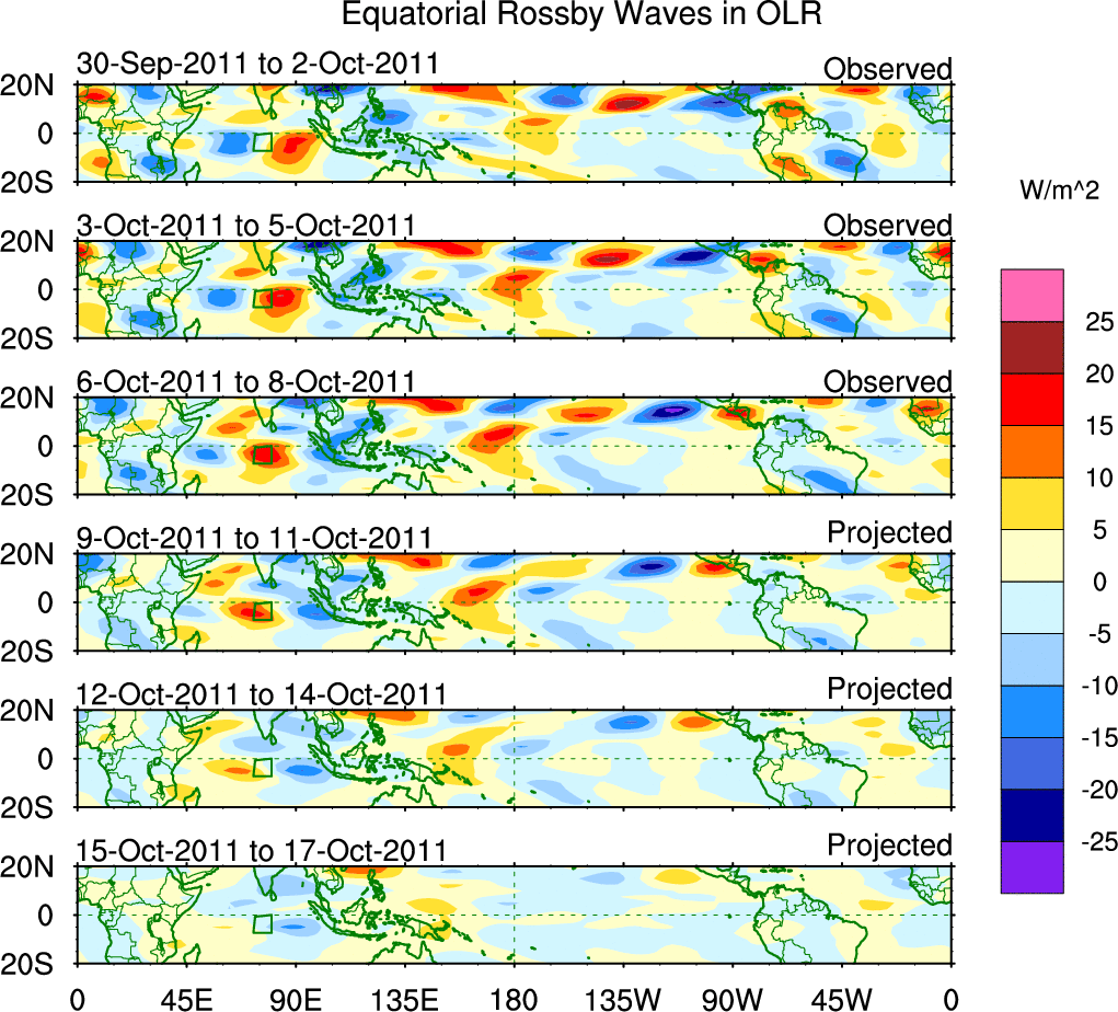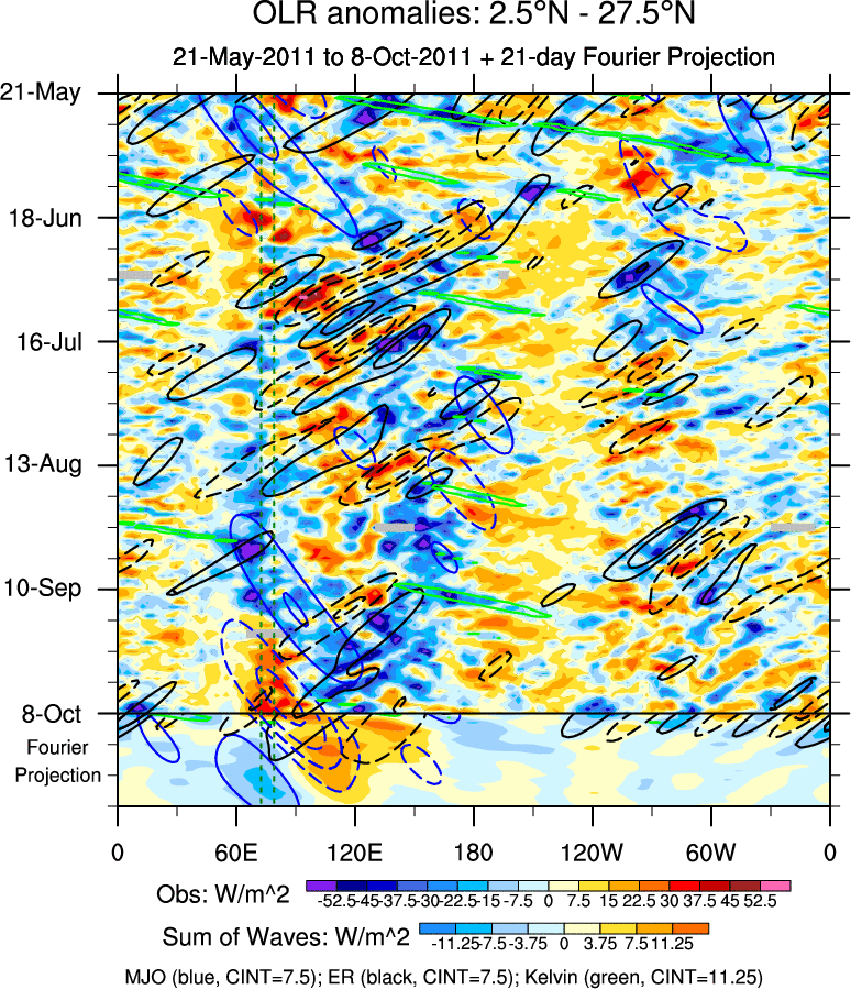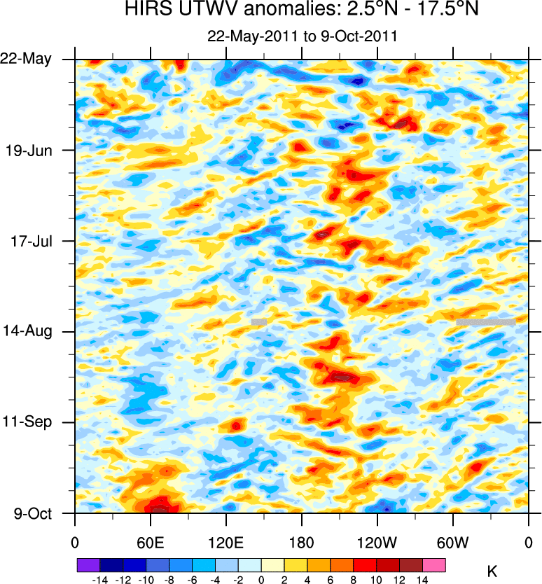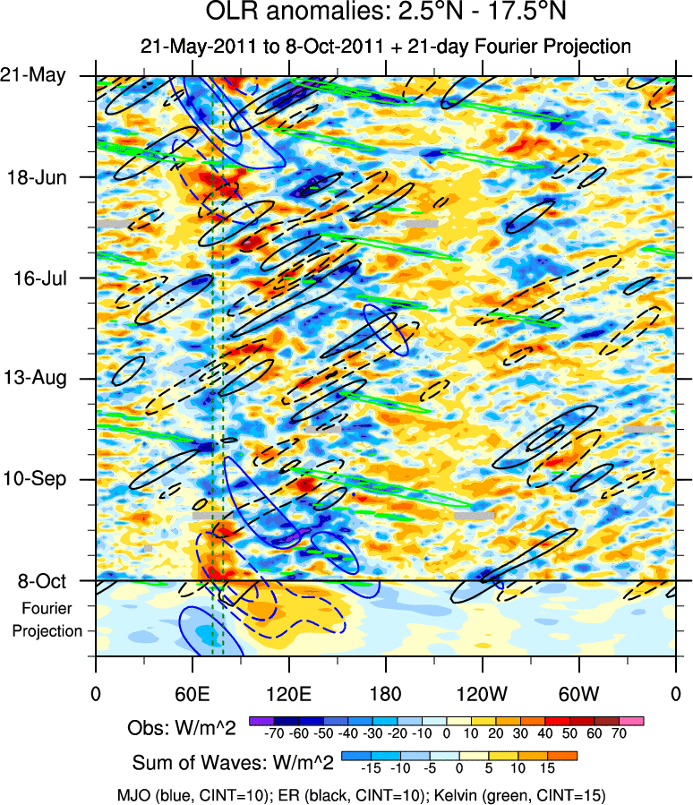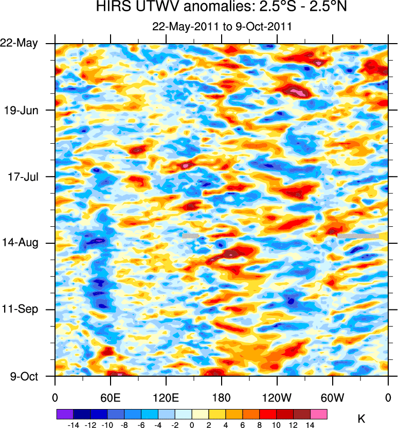To identify tropical waves in near real-time, the OLR and UTWV data are filtered following Wheeler & Weickmann (2001 MWR). The daily anomalies are calculated using the first 3 harmonics of the seasonal cycle for 1979–2009. Missing values are then filled using linear interpolation in space and time. The most recent 365 days of anomalies are padded with 659 days of zeroes, and the result is filtered for each wave type.