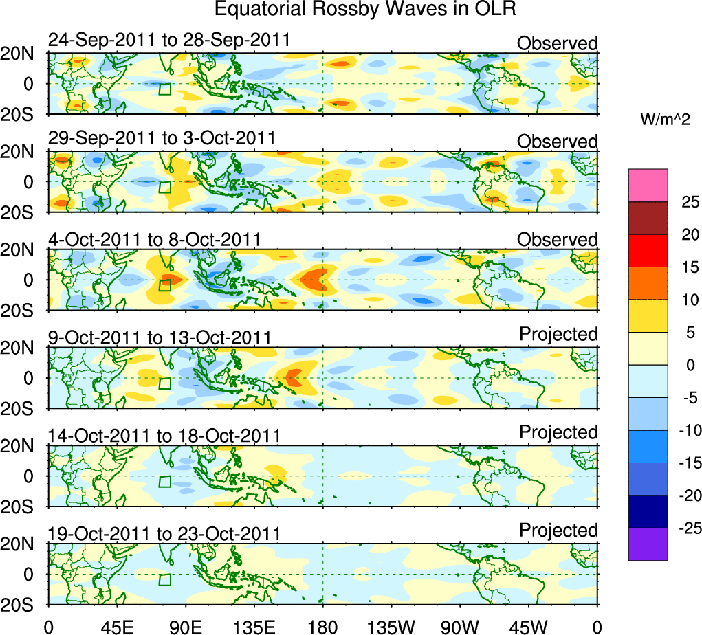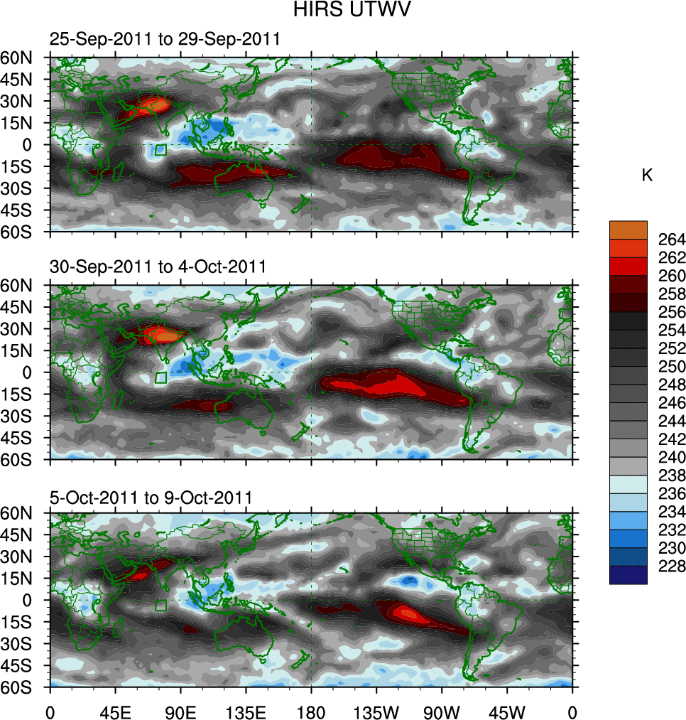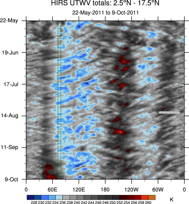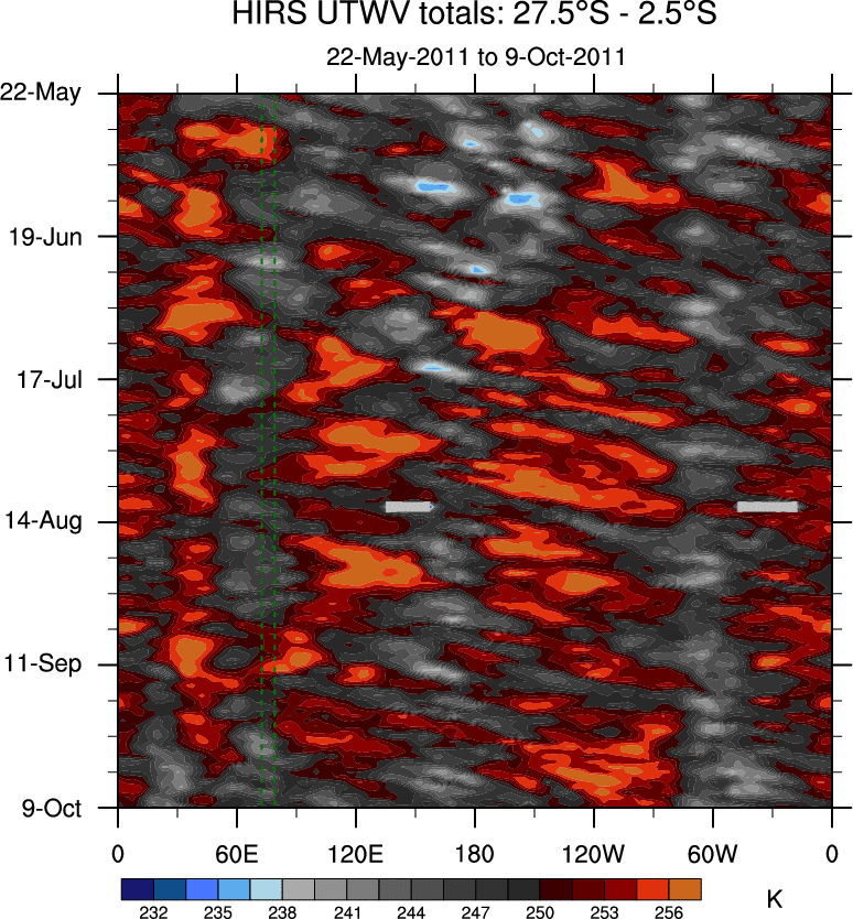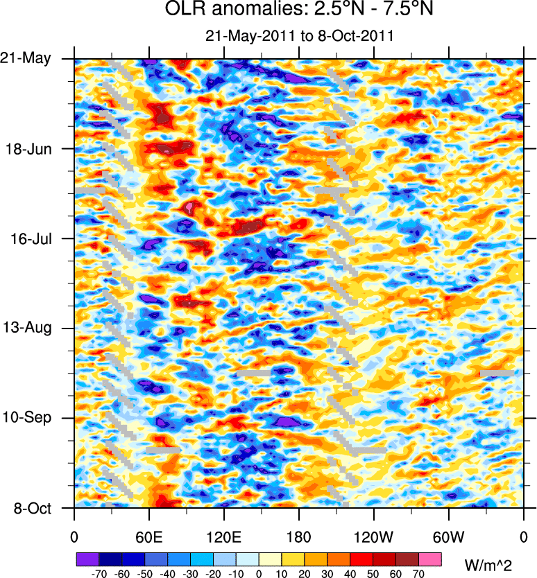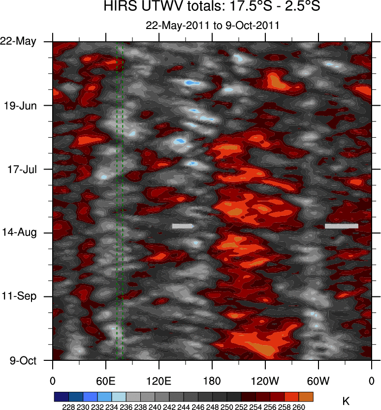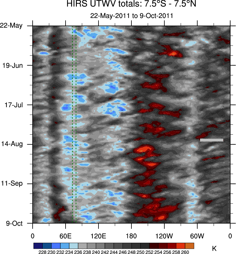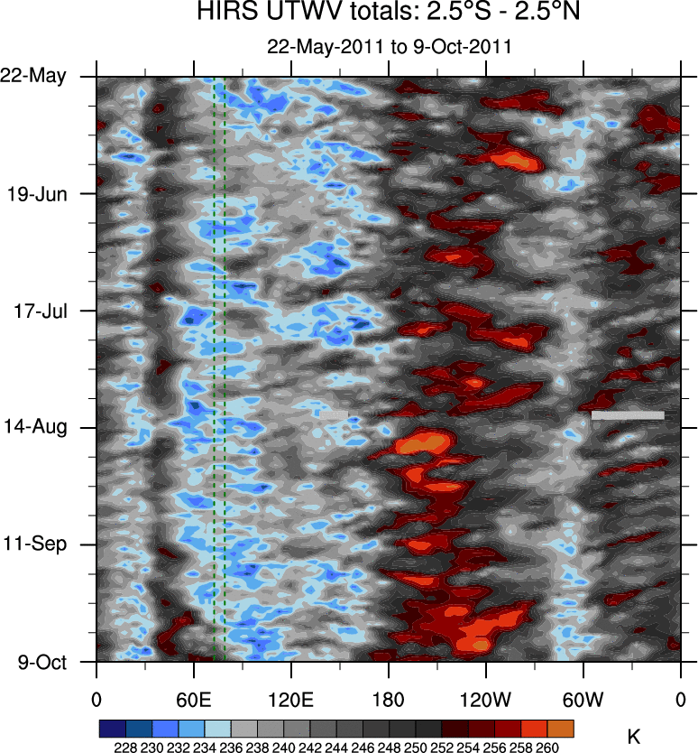 To identify tropical waves in near real-time, the OLR and UTWV data are filtered following Wheeler & Weickmann (2001 MWR). The daily anomalies are calculated using the first 3 harmonics of the seasonal cycle for 1979–2009. Missing values are then filled using linear interpolation in space and time. The most recent 365 days of anomalies are padded with 659 days of zeroes, and the result is filtered for each wave type.