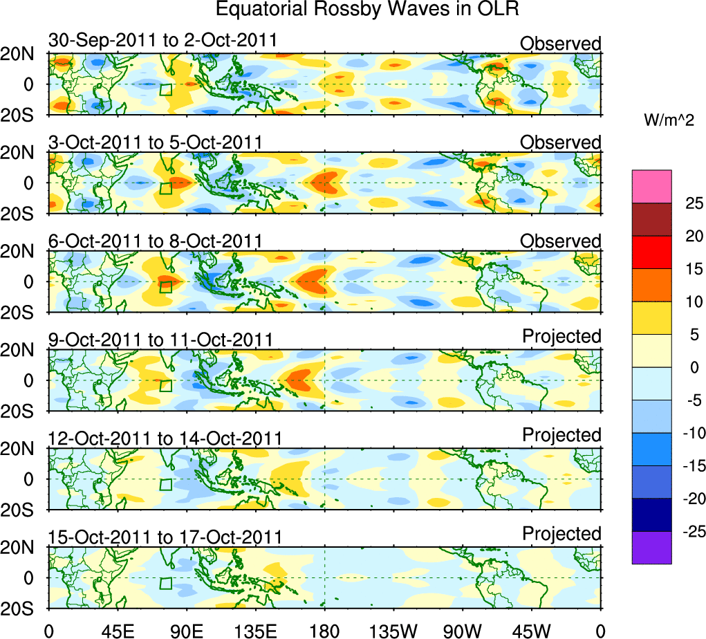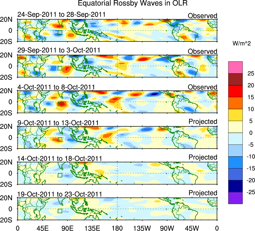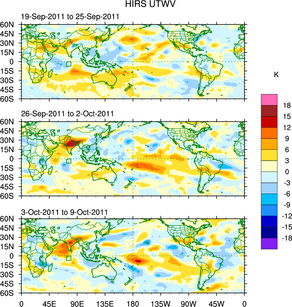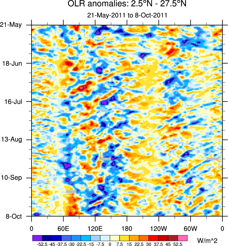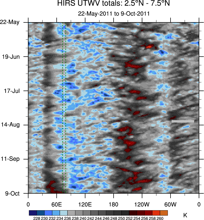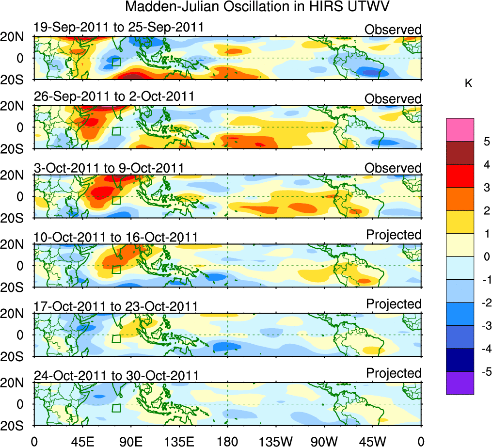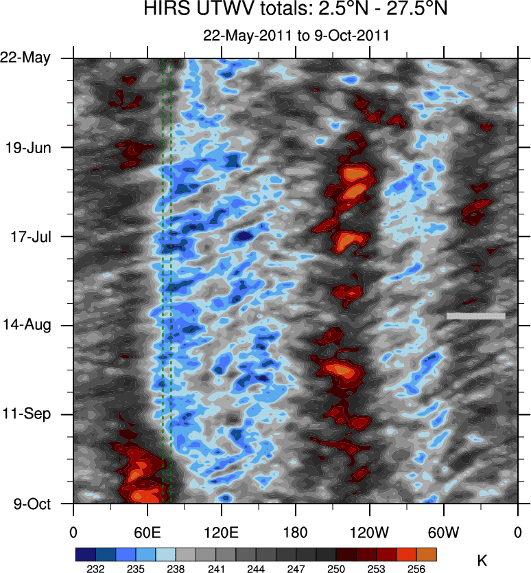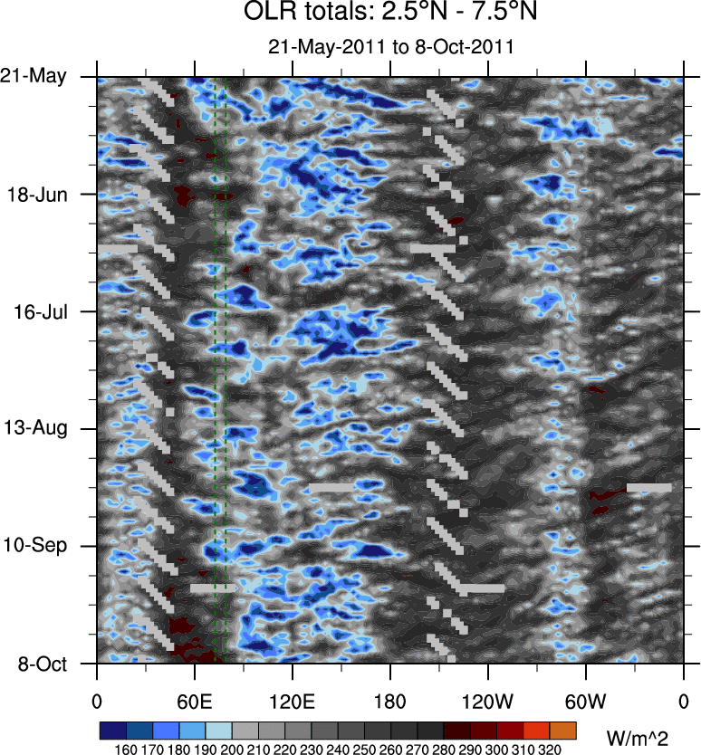 To identify tropical waves in near real-time, the OLR and UTWV data are filtered following Wheeler & Weickmann (2001 MWR). The daily anomalies are calculated using the first 3 harmonics of the seasonal cycle for 1979–2009. Missing values are then filled using linear interpolation in space and time. The most recent 365 days of anomalies are padded with 659 days of zeroes, and the result is filtered for each wave type.