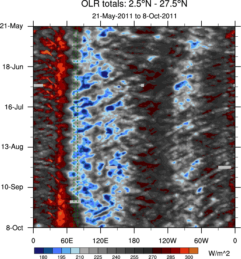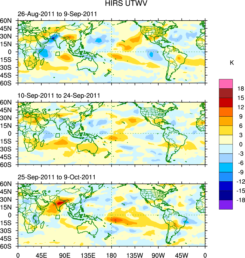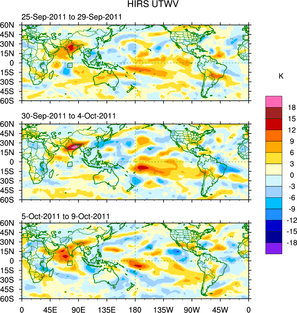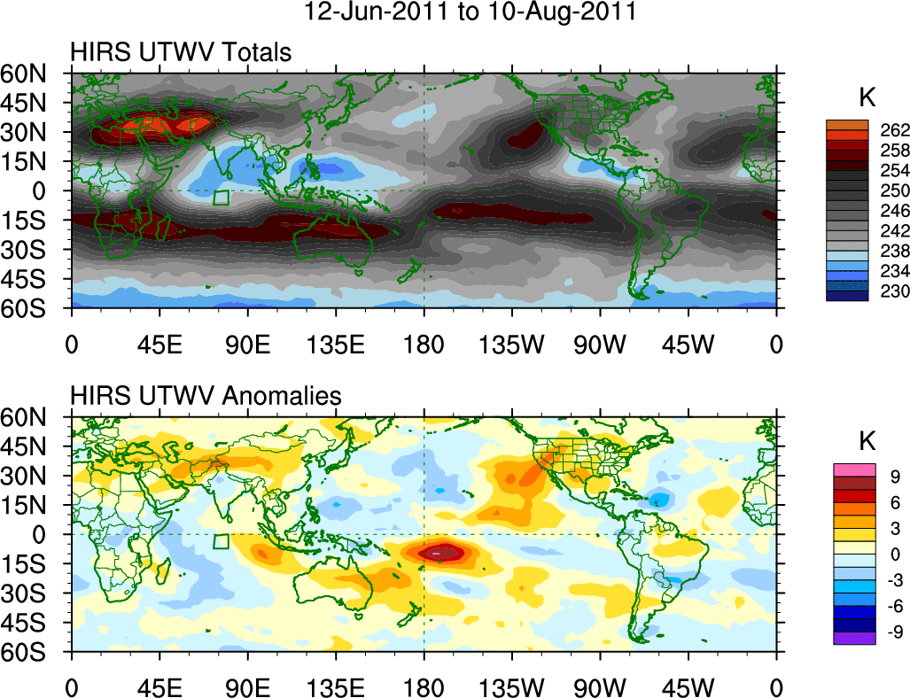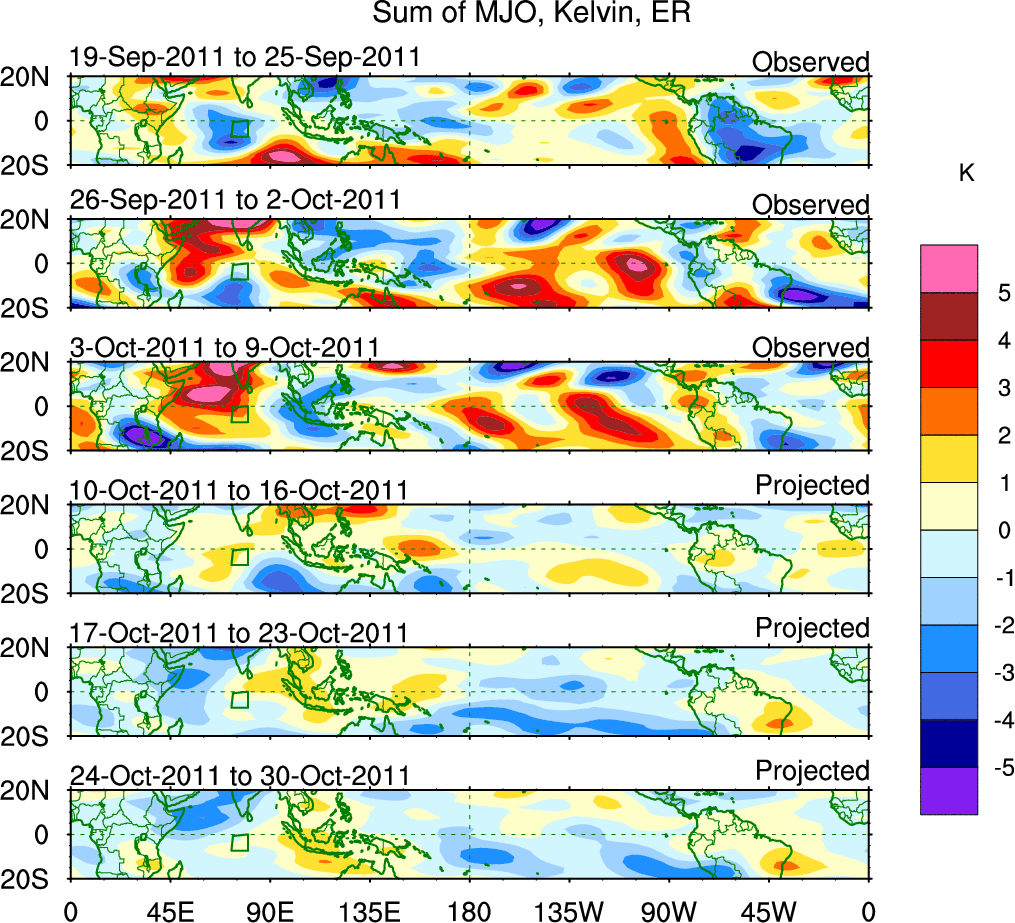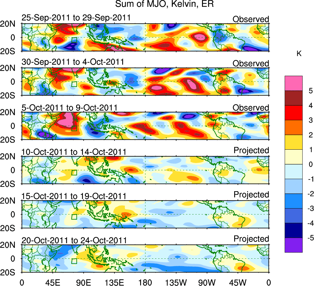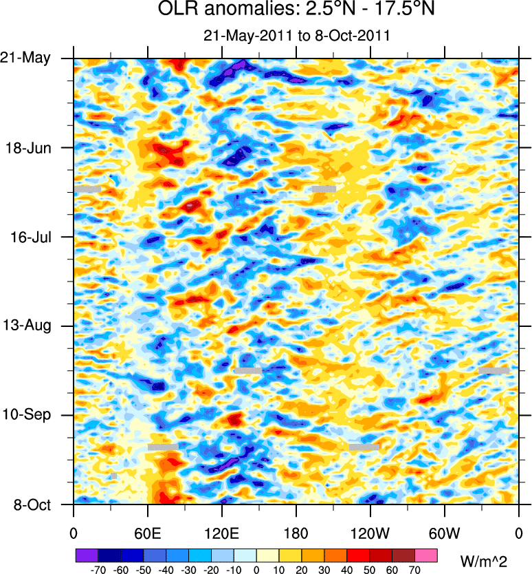 To identify tropical waves in near real-time, the OLR and UTWV data are filtered following Wheeler & Weickmann (2001 MWR). The daily anomalies are calculated using the first 3 harmonics of the seasonal cycle for 1979–2009. Missing values are then filled using linear interpolation in space and time. The most recent 365 days of anomalies are padded with 659 days of zeroes, and the result is filtered for each wave type.
