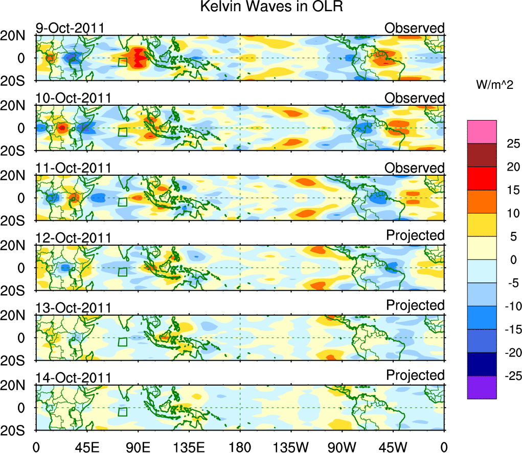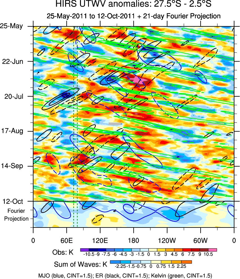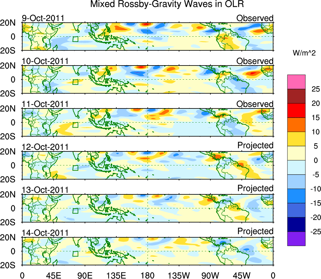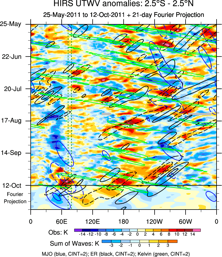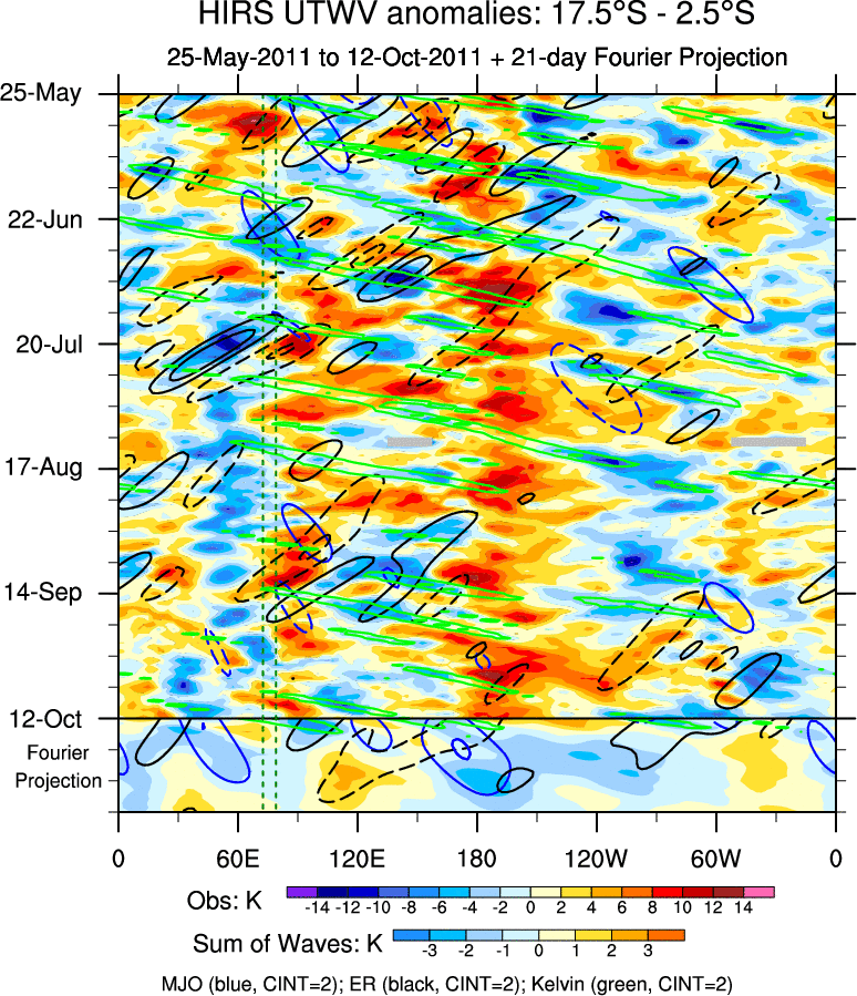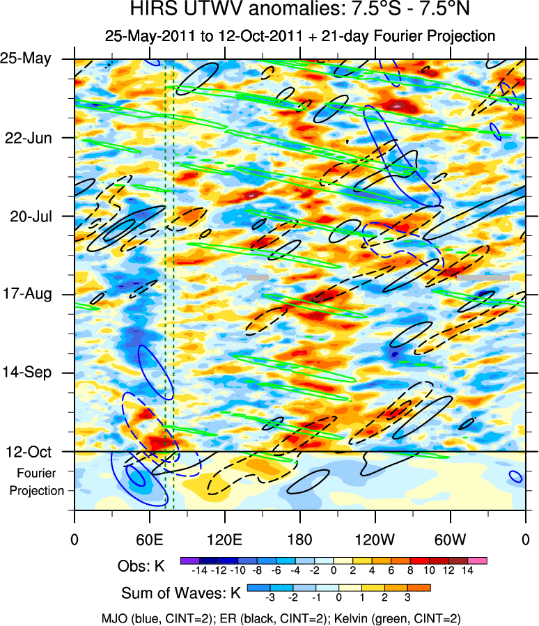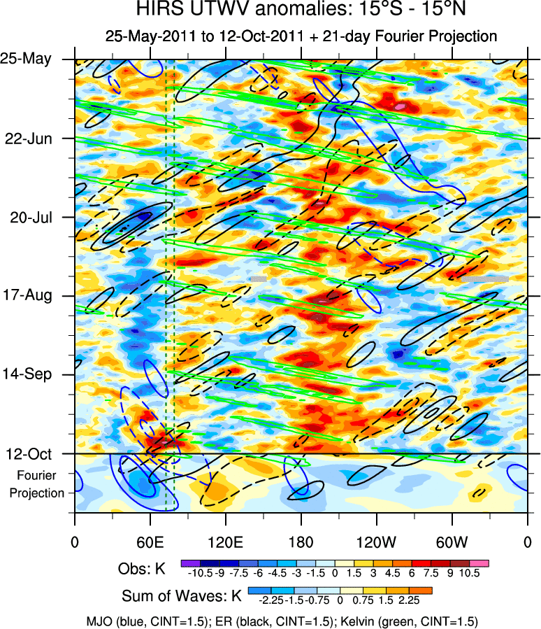 To identify tropical waves in near real-time, the OLR and UTWV data are filtered following Wheeler & Weickmann (2001 MWR). The daily anomalies are calculated using the first 3 harmonics of the seasonal cycle for 1979–2009. Missing values are then filled using linear interpolation in space and time. The most recent 365 days of anomalies are padded with 659 days of zeroes, and the result is filtered for each wave type.
