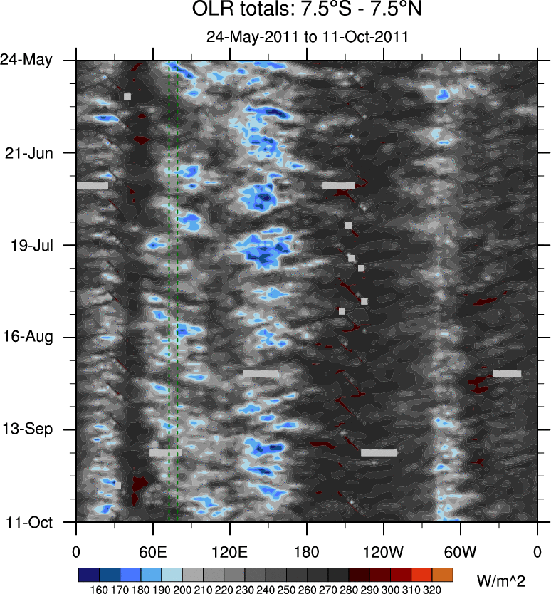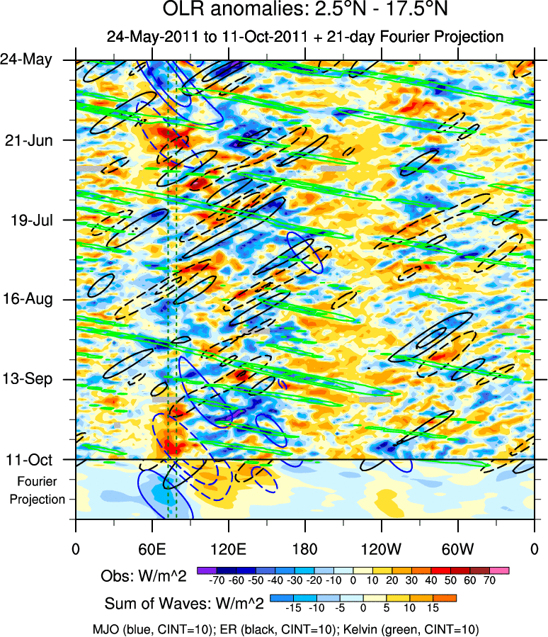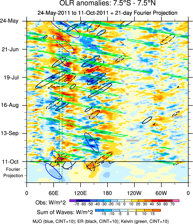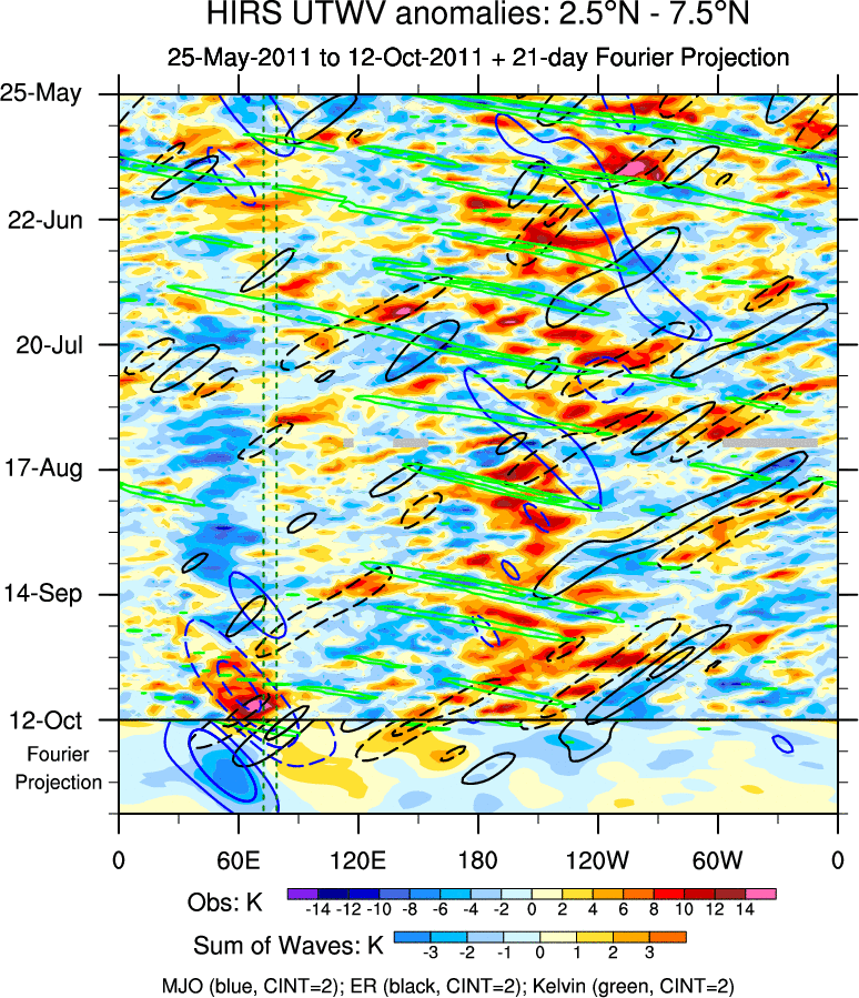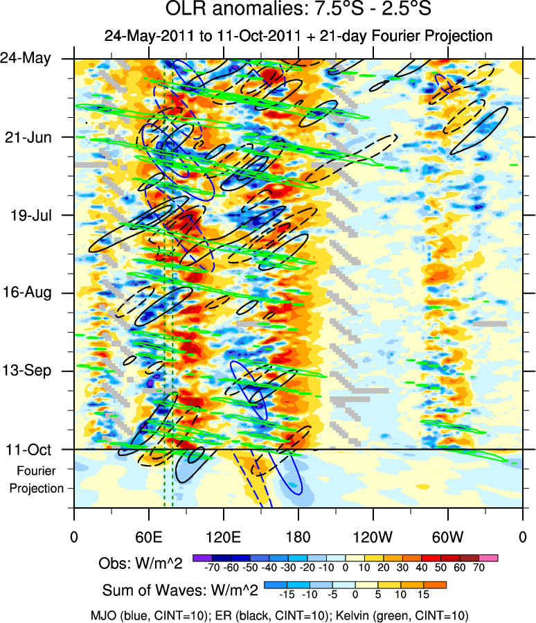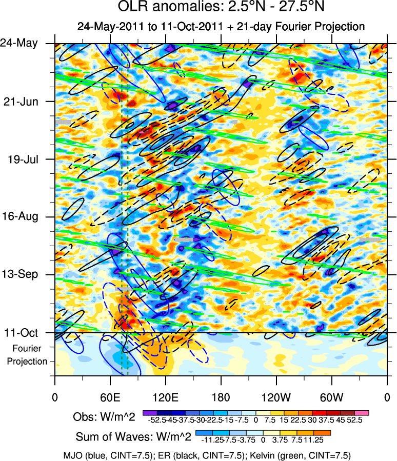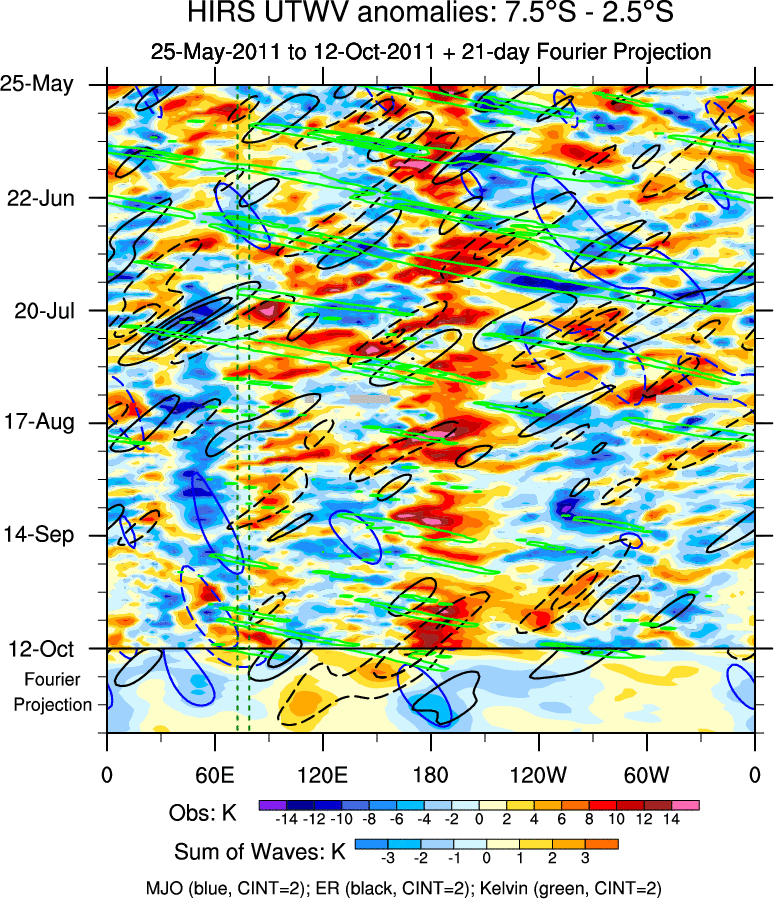 To identify tropical waves in near real-time, the OLR and UTWV data are filtered following Wheeler & Weickmann (2001 MWR). The daily anomalies are calculated using the first 3 harmonics of the seasonal cycle for 1979–2009. Missing values are then filled using linear interpolation in space and time. The most recent 365 days of anomalies are padded with 659 days of zeroes, and the result is filtered for each wave type.